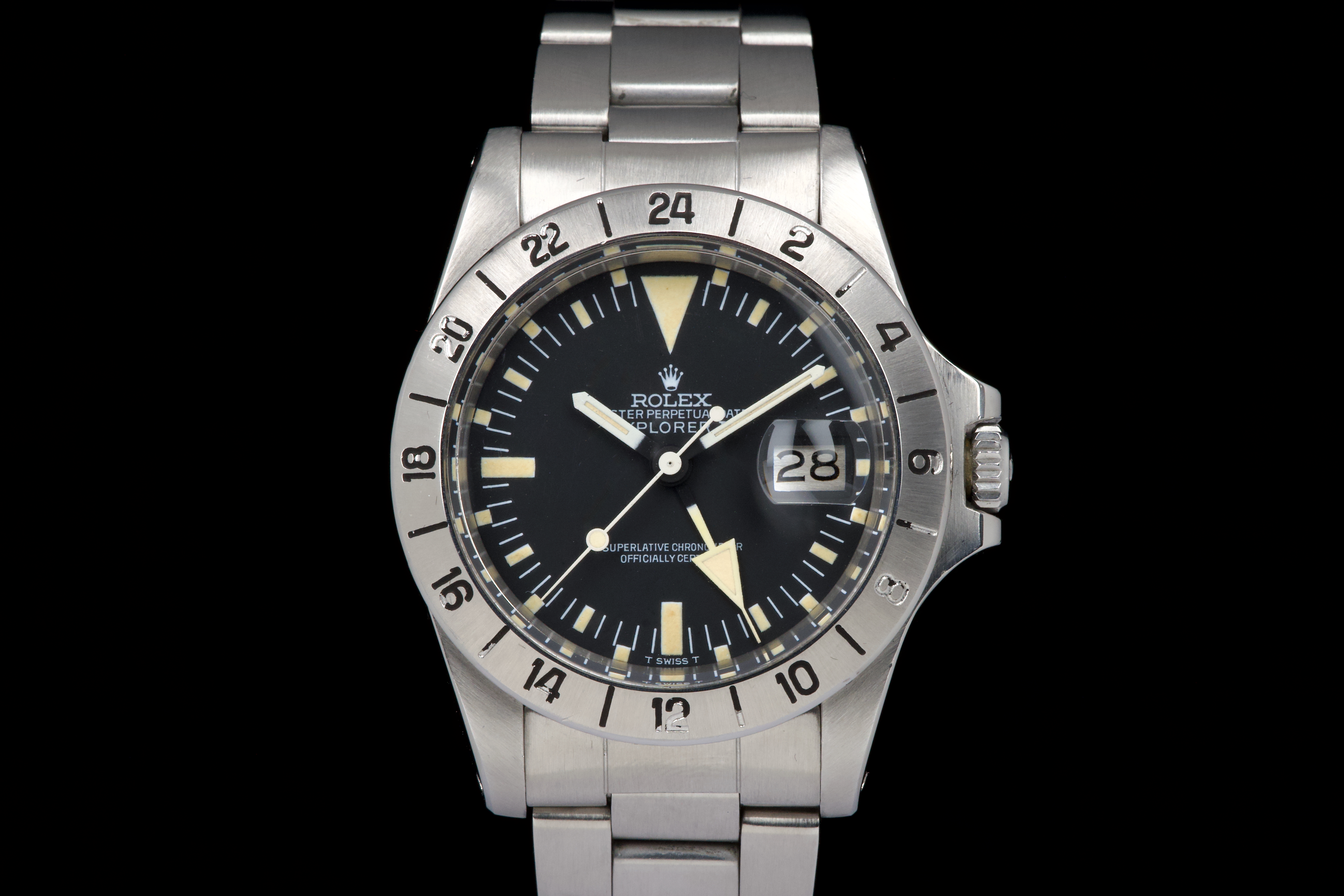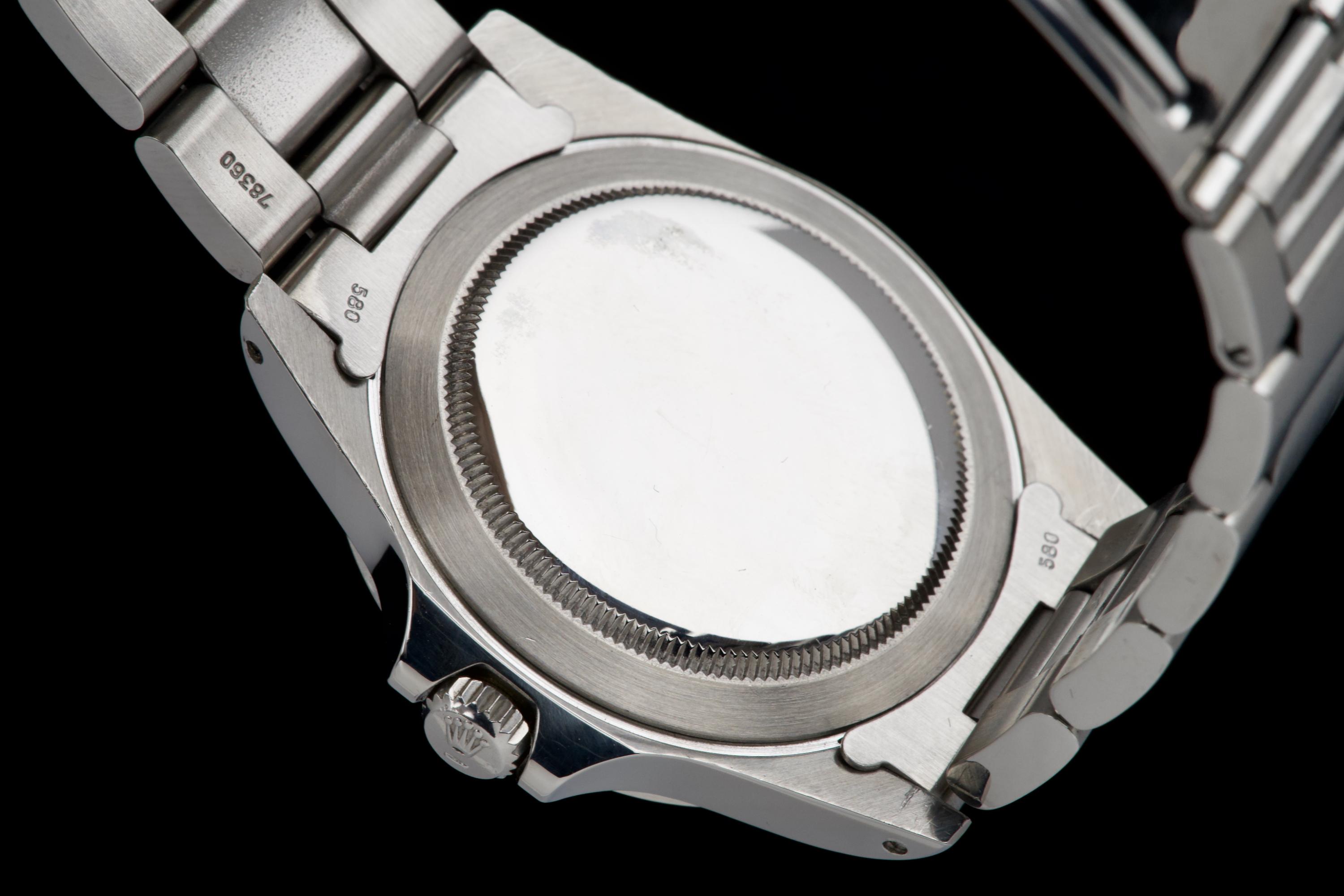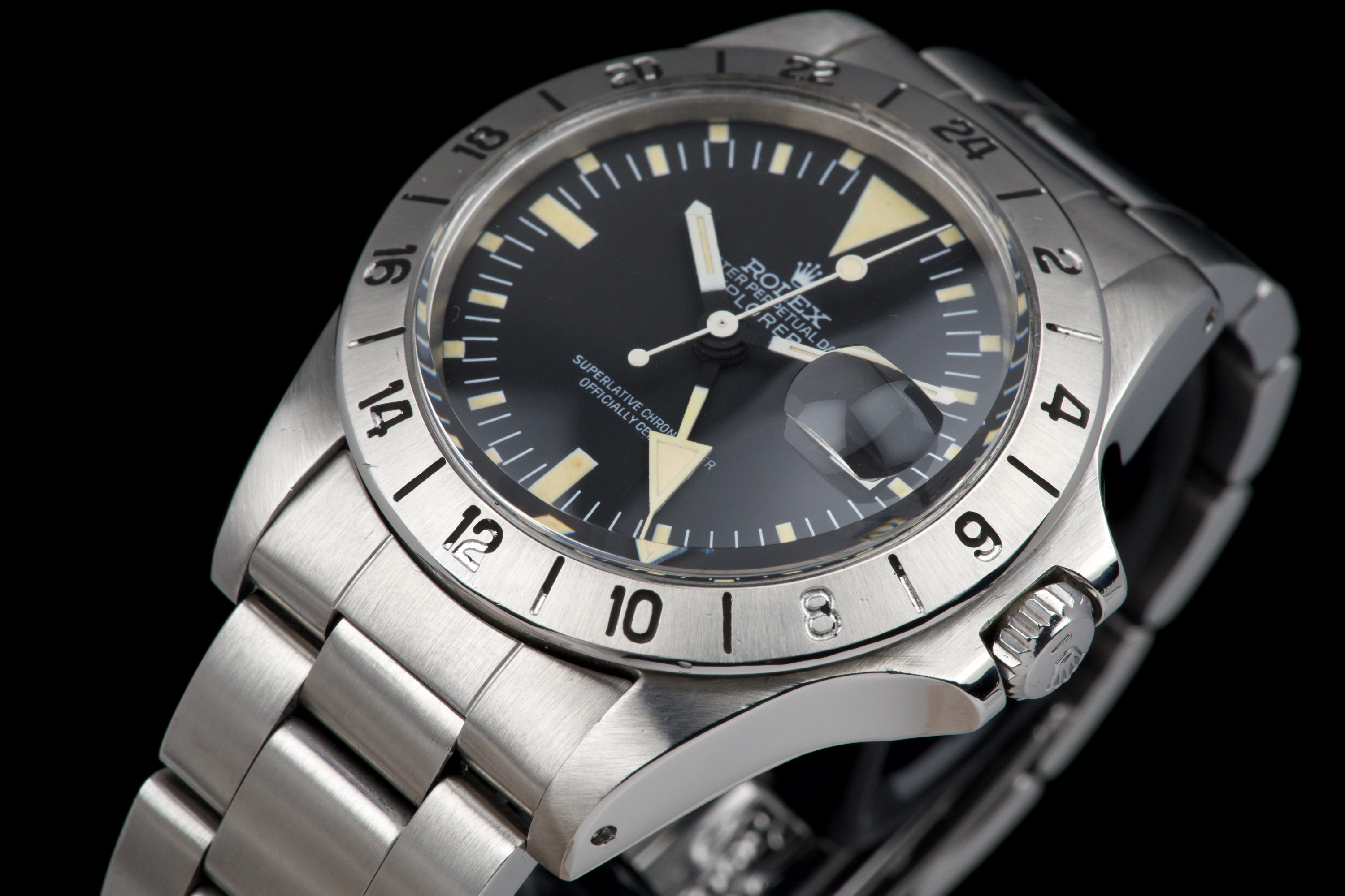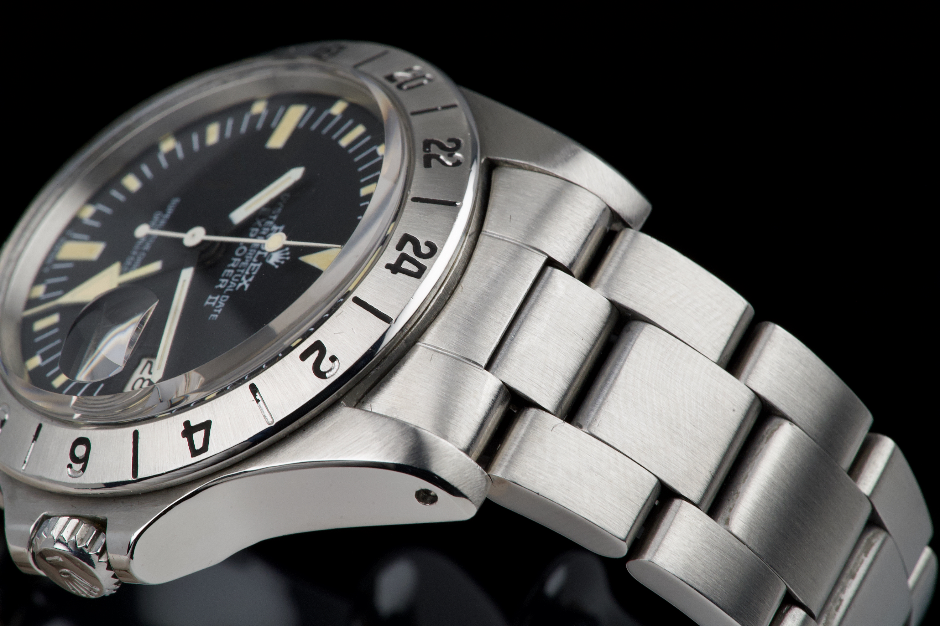 The present Rolex Explorer II reference 1655 “Albino” Mk II is an exceptionally attractive and well-preserved example of one of Rolex’s most charismatic tool watches. Produced in 1974 and sold in 1981, this watch is offered here as a complete full set, an increasingly rare level of completeness for this reference. The stainless-steel case has just returned from polishing and presents in excellent overall condition, retaining strong proportions and a crisp profile. The watch is fitted with its original Mk II matte dial, preserved in outstanding condition and displaying a beautiful, even patina, perfectly matched by the hands. The defining feature of this example is the original white “Albino” Explorer hand, a highly distinctive and sought-after characteristic of early Explorer II references. The original Mk II fixed steel bezel remains in excellent condition overall, with the black engraved numerals showing light wear and minor fading in places, entirely consistent with age and careful use. The watch is fitted with its original Oyster bracelet reference 78360 with 580 endlinks. The bracelet remains in excellent condition and shows only light stretch from use, consistent with careful wear. The clasp bears the code “VB.” Mechanically, the watch is in perfect working condition at the time of cataloguing, although no service history accompanies the watch. Delivered with a highly complete and desirable set of accessories, the watch includes its original box, outer packaging, original leather document holder, period booklets, and original punched warranty papers issued in Venezuela. Combining early production, a correct and attractive Mk II configuration, the sought-after “Albino” Explorer hand, excellent overall condition, and outstanding completeness, this Explorer II 1655 represents a compelling opportunity to acquire a landmark Rolex tool watch with exceptional character and provenance.