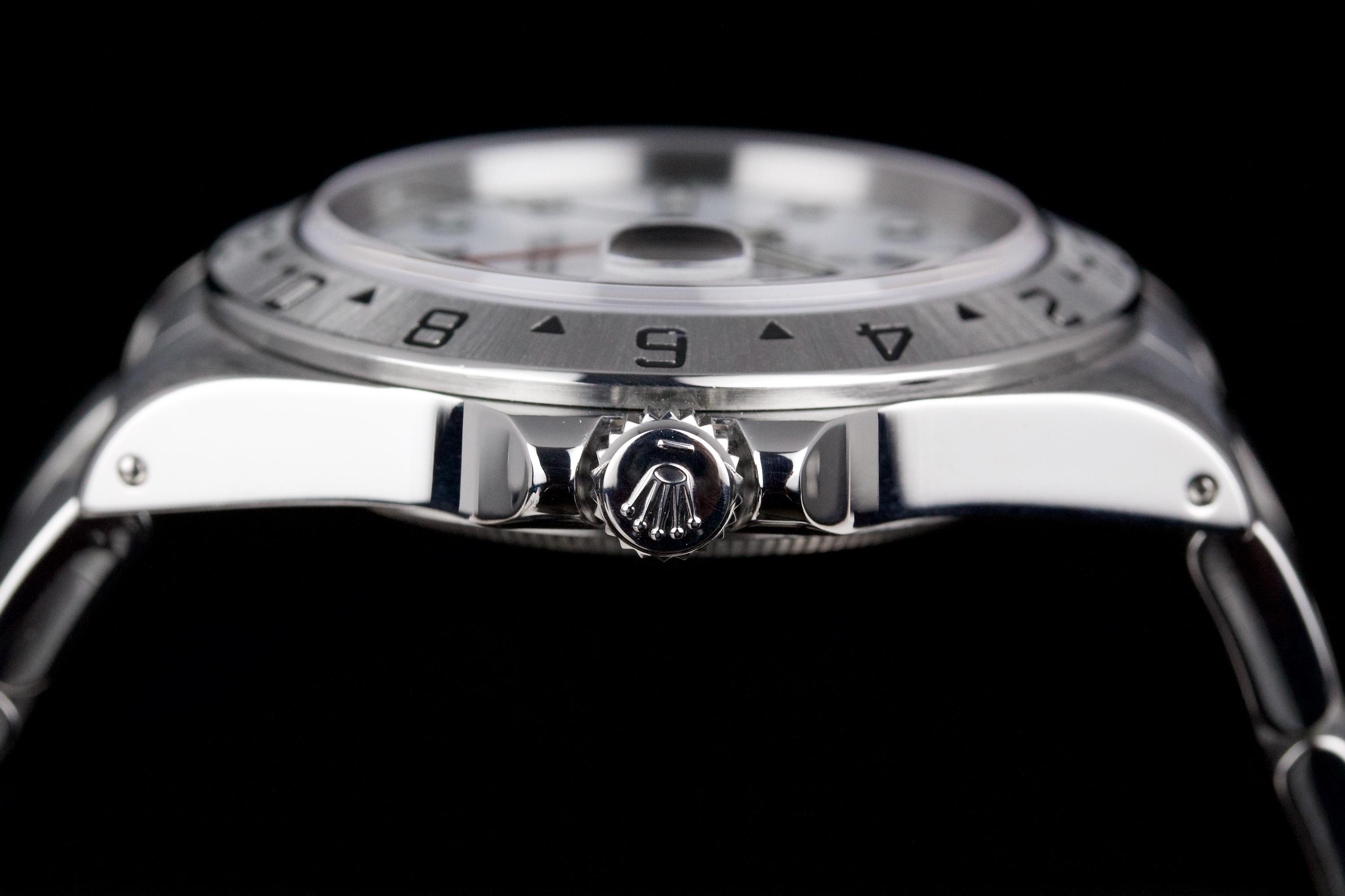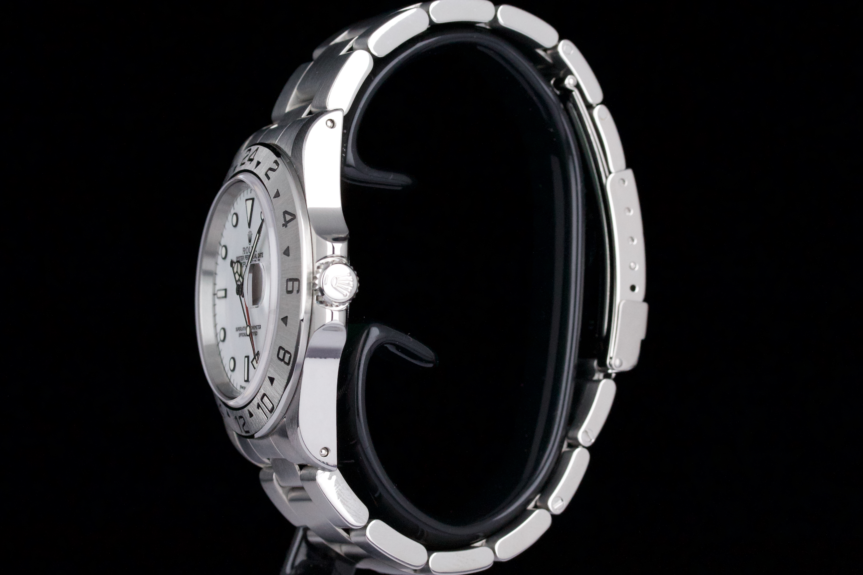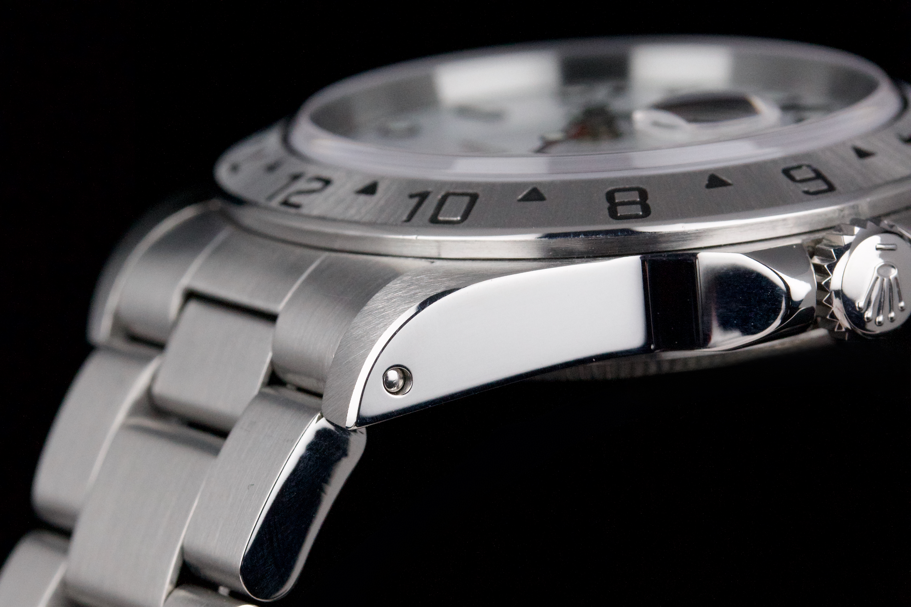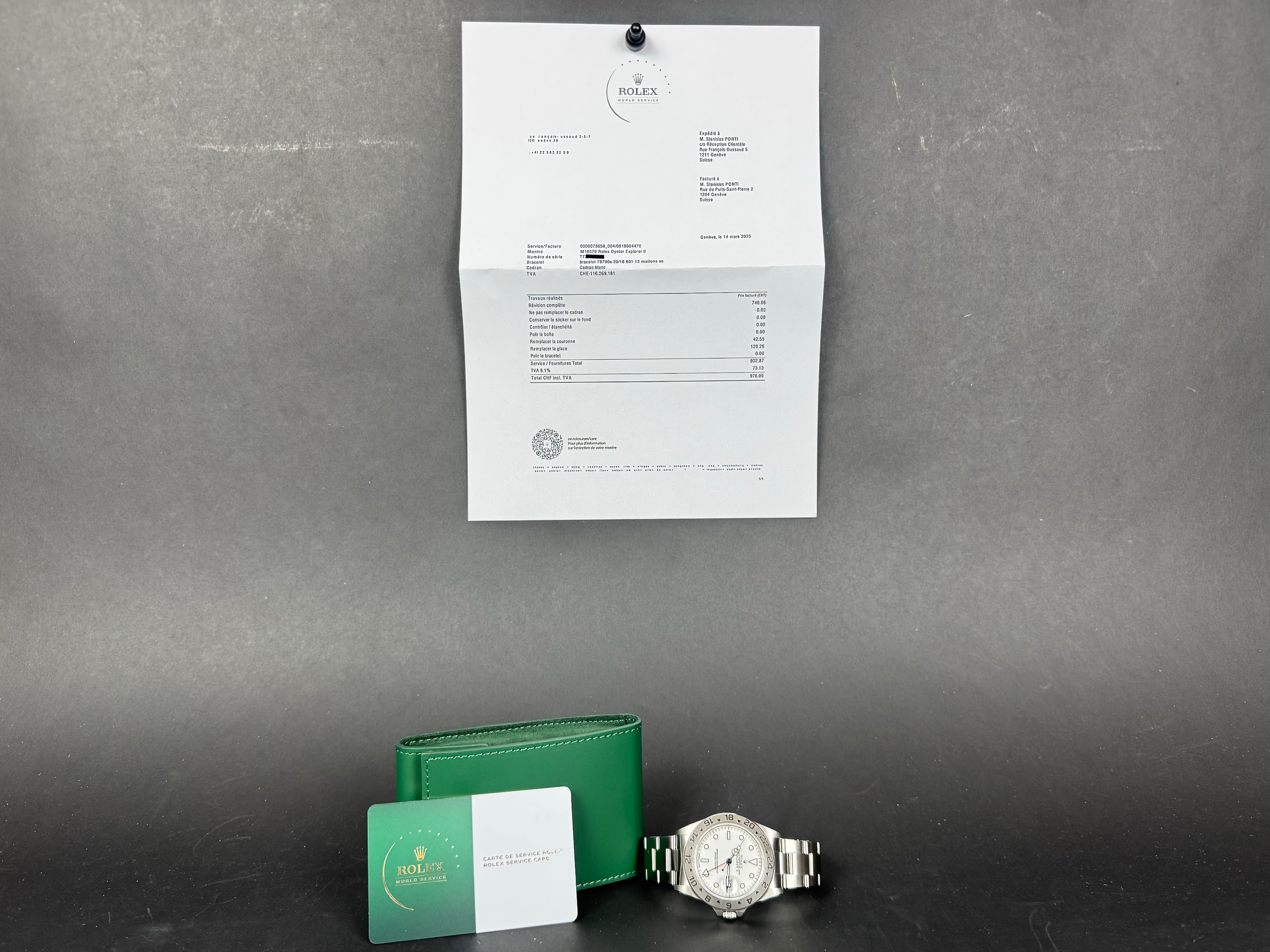 A classic among modern Rolex sports watches, the Explorer II 16570 in its “Polar” configuration has become increasingly collectible—especially early tritium-dial examples with warm patina. This 1997 example features an excellent case that has been polished in the past and remains strong. The original white tritium dial has developed an attractive eggshell patina, with matching hands that enhance its vintage charm. The fixed steel bezel is also in very good condition, with clear engravings and minimal wear. It is fitted with its original 78790 Oyster bracelet with 501B endlinks and a Z3 clasp code. The bracelet shows very light stretch from use and remains tight and wearable. Most importantly, the watch comes with 2025 Rolex service papers, confirming its authenticity and mechanical integrity. An honest and well-balanced Polar Explorer II with appealing patina, complete with recent Rolex service documentation—ready to wear or collect.