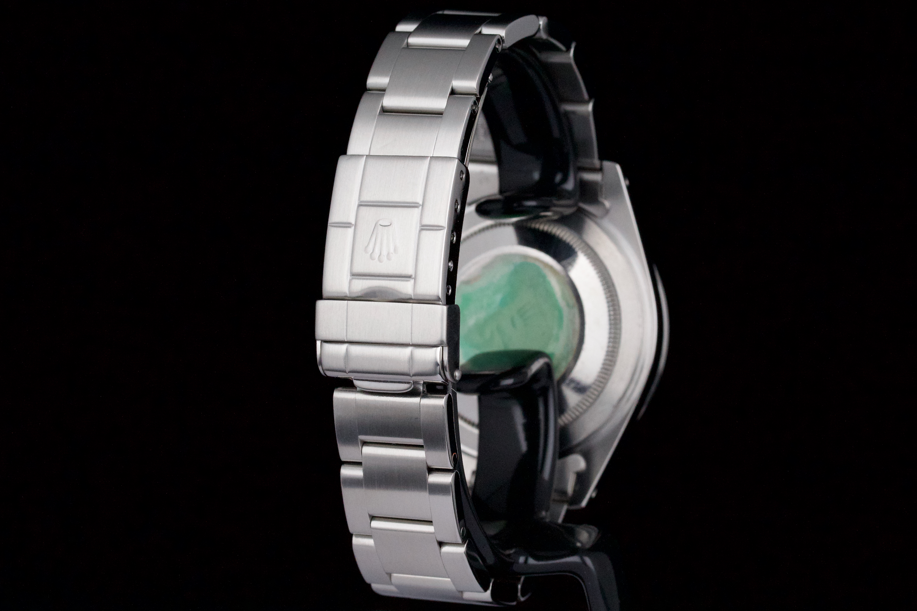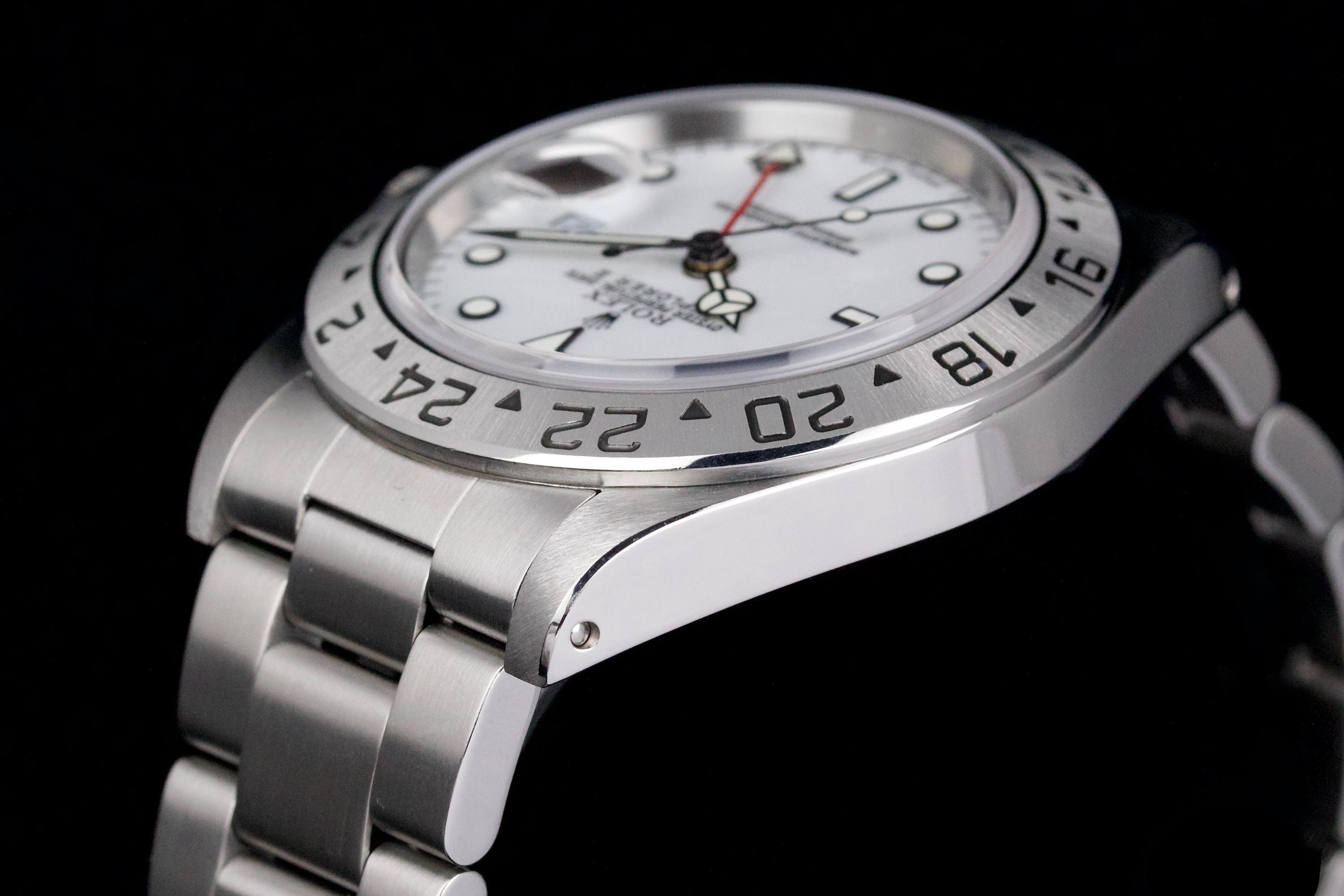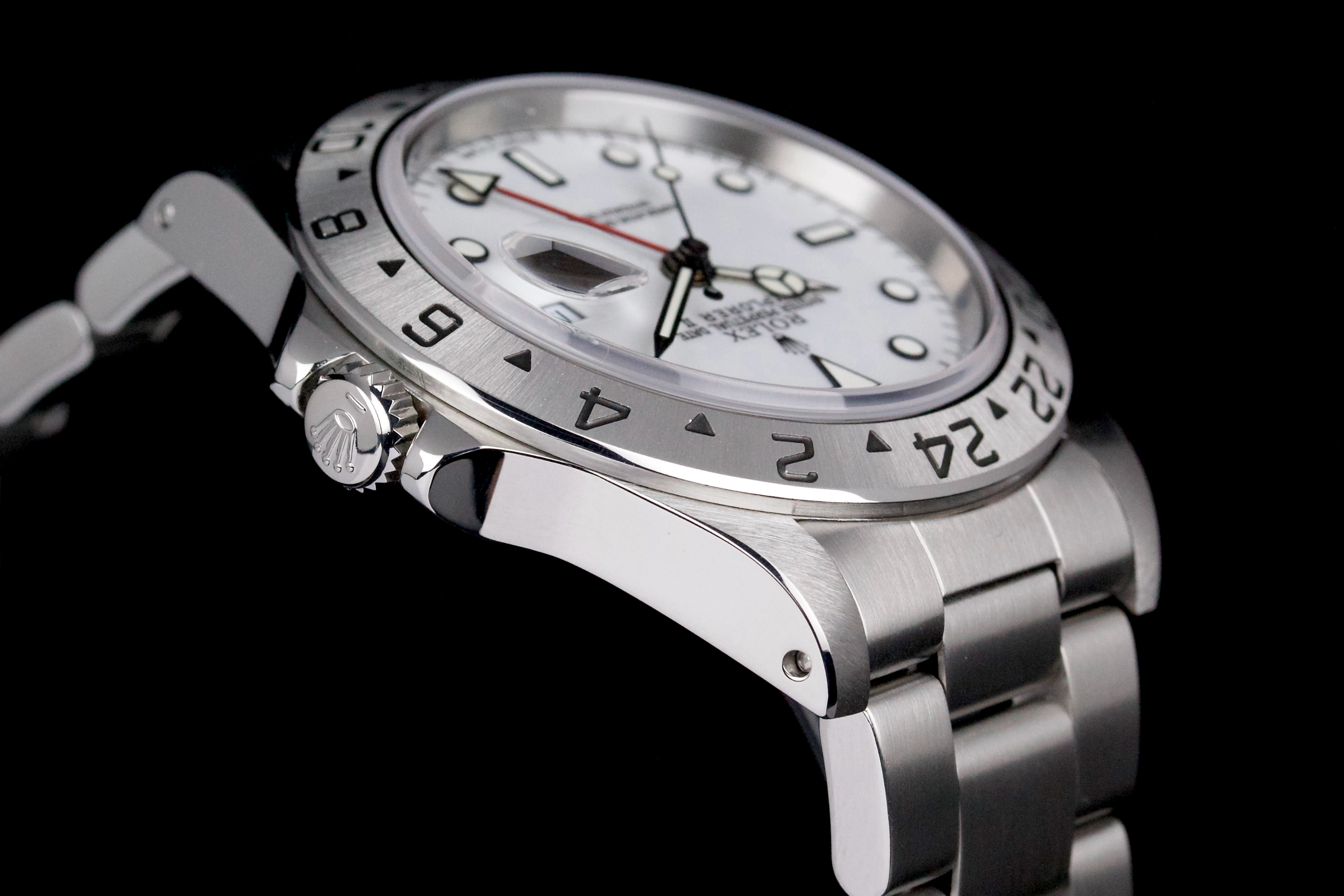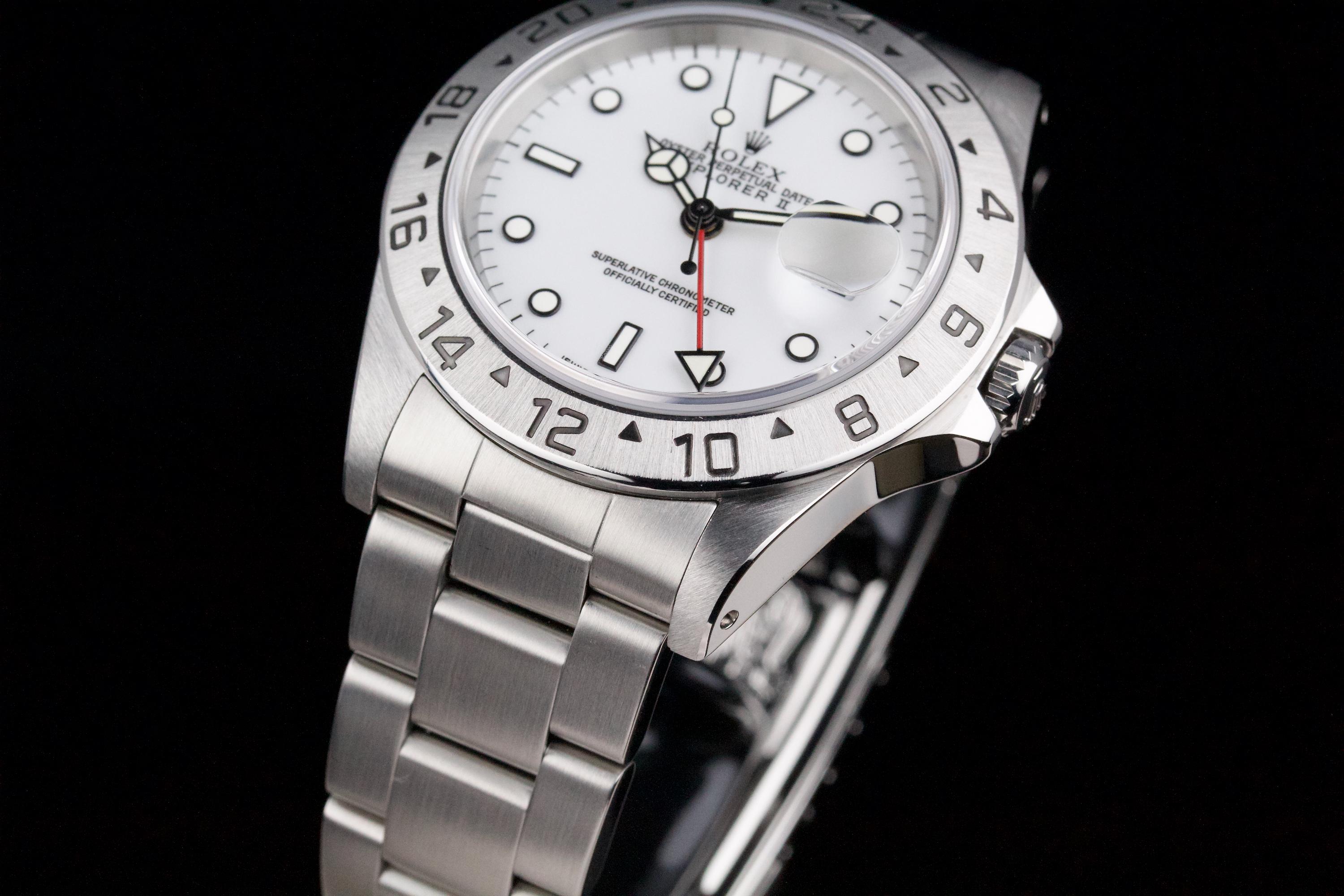 A classic among modern Rolex sports watches, the Explorer II 16570 in its “Polar” configuration has become increasingly collectible—especially early tritium-dial examples with warm patina. This 1997 example features an excellent case that has been polished in the past and remains strong. The original white tritium dial has developed an attractive eggshell patina, with matching hands that enhance its vintage charm. The fixed steel bezel is also in very good condition, with clear engravings and minimal wear. It is fitted with its original 78790 Oyster bracelet with 501B endlinks and a Z3 clasp code. The bracelet shows very light stretch from use and remains tight and wearable. Most importantly, the watch comes with 2025 Rolex service papers, confirming its authenticity and mechanical integrity. An honest and well-balanced Polar Explorer II with appealing patina, complete with recent Rolex service documentation—ready to wear or collect.