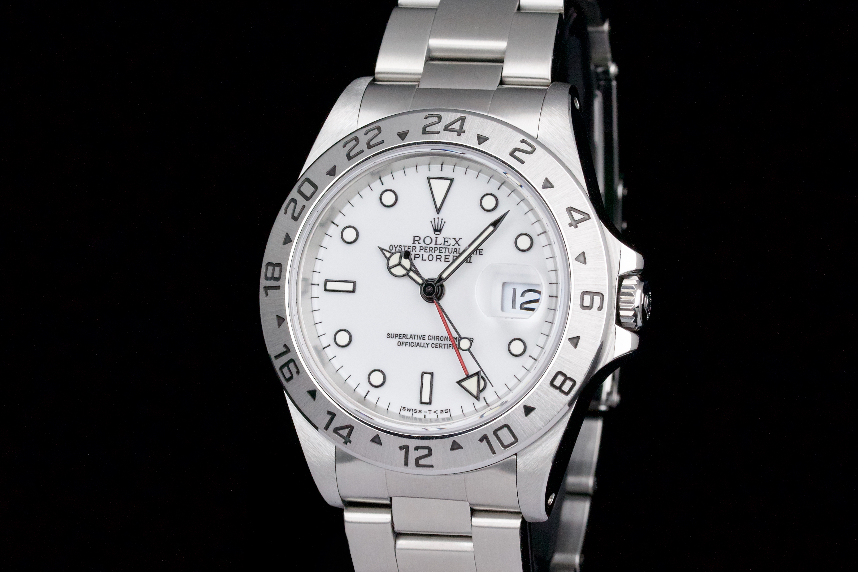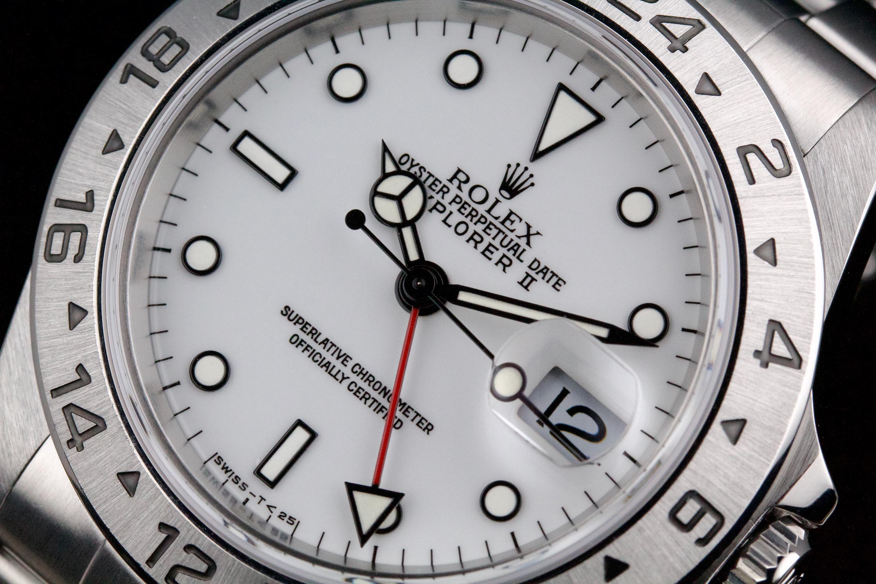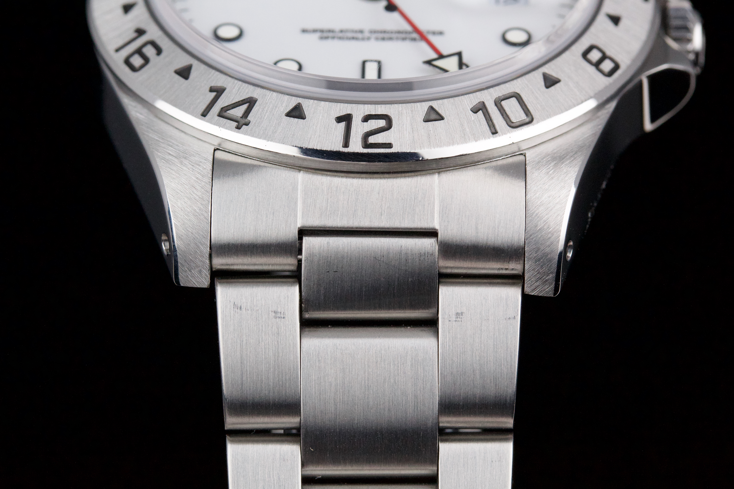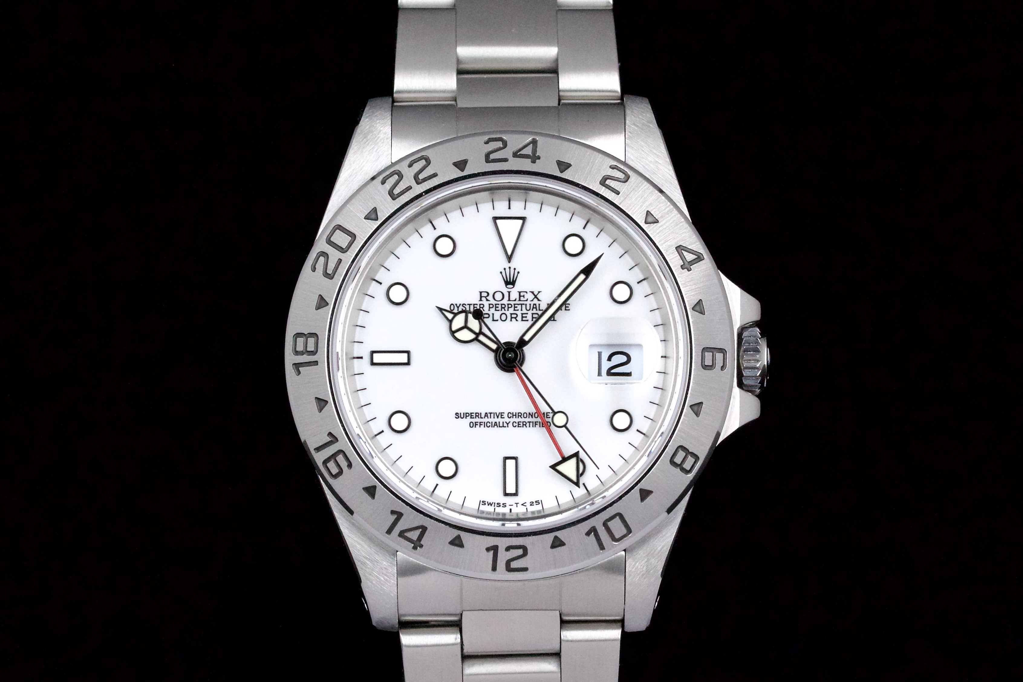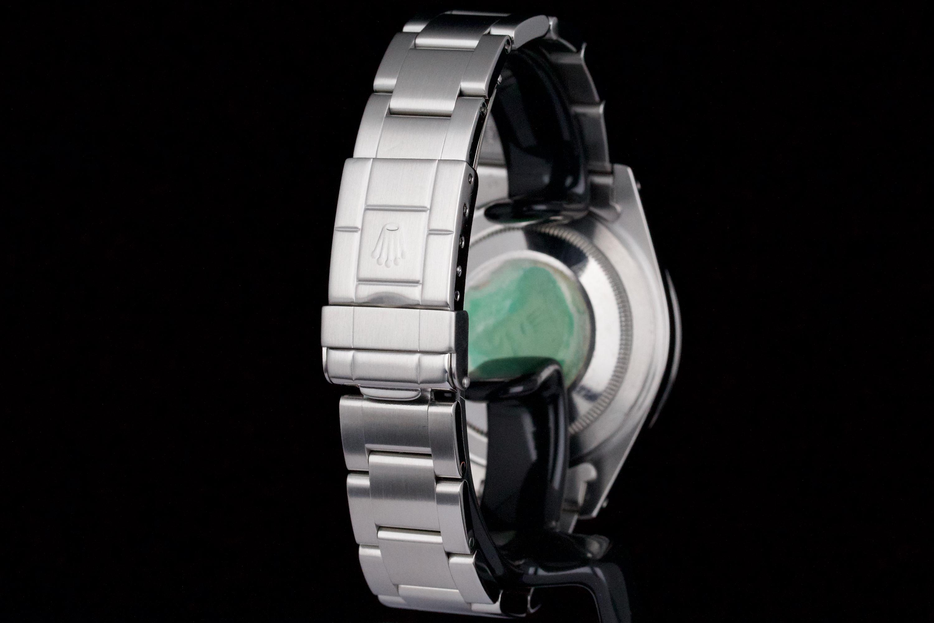 A classic among modern Rolex sports watches, the Explorer II 16570 in its “Polar” configuration has become increasingly collectible—especially early tritium-dial examples with warm patina. This 1997 example features an excellent case that has been polished in the past and remains strong. The original white tritium dial has developed an attractive eggshell patina, with matching hands that enhance its vintage charm. The fixed steel bezel is also in very good condition, with clear engravings and minimal wear. It is fitted with its original 78790 Oyster bracelet with 501B endlinks and a Z3 clasp code. The bracelet shows very light stretch from use and remains tight and wearable. Most importantly, the watch comes with 2025 Rolex service papers, confirming its authenticity and mechanical integrity. An honest and well-balanced Polar Explorer II with appealing patina, complete with recent Rolex service documentation—ready to wear or collect.