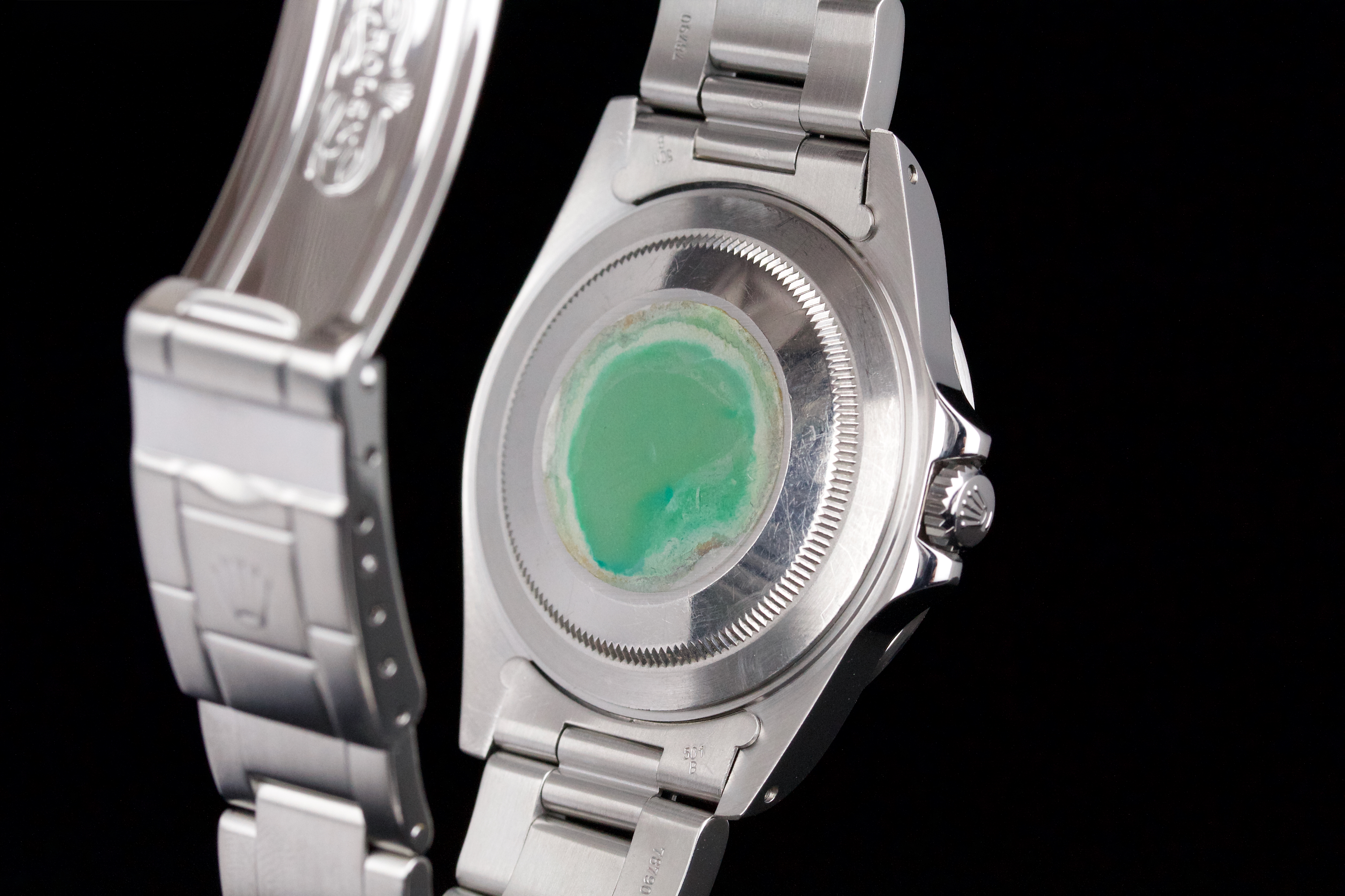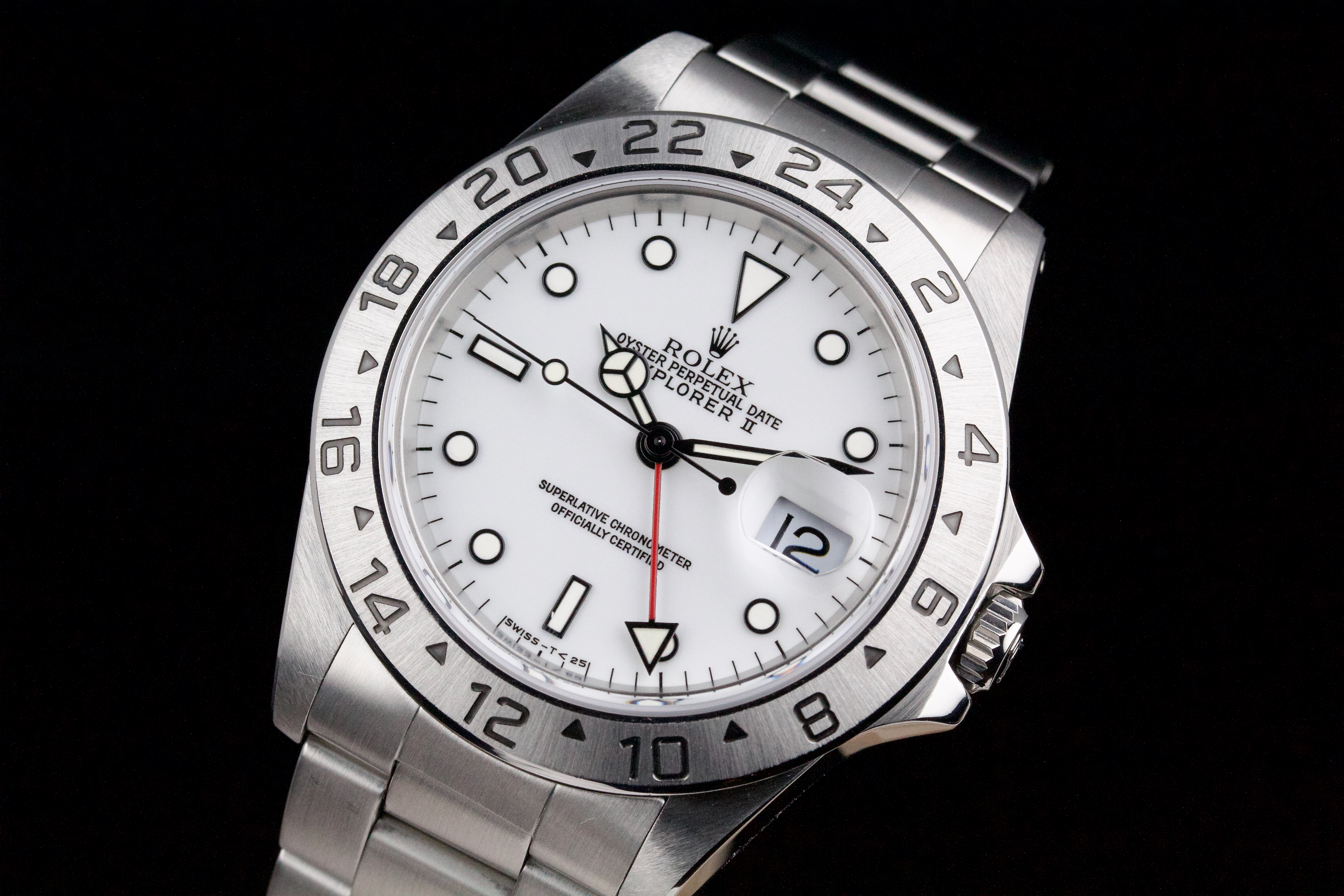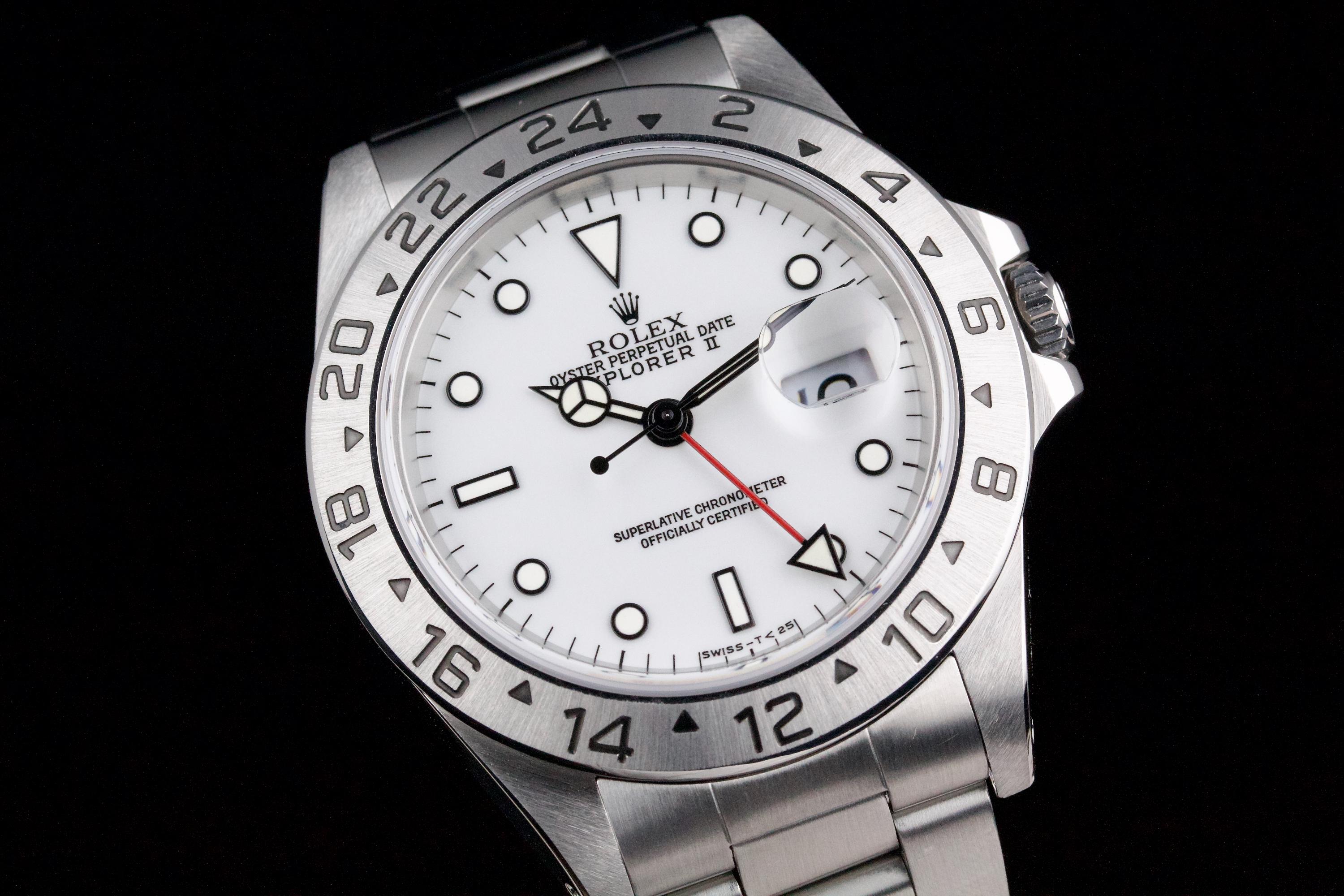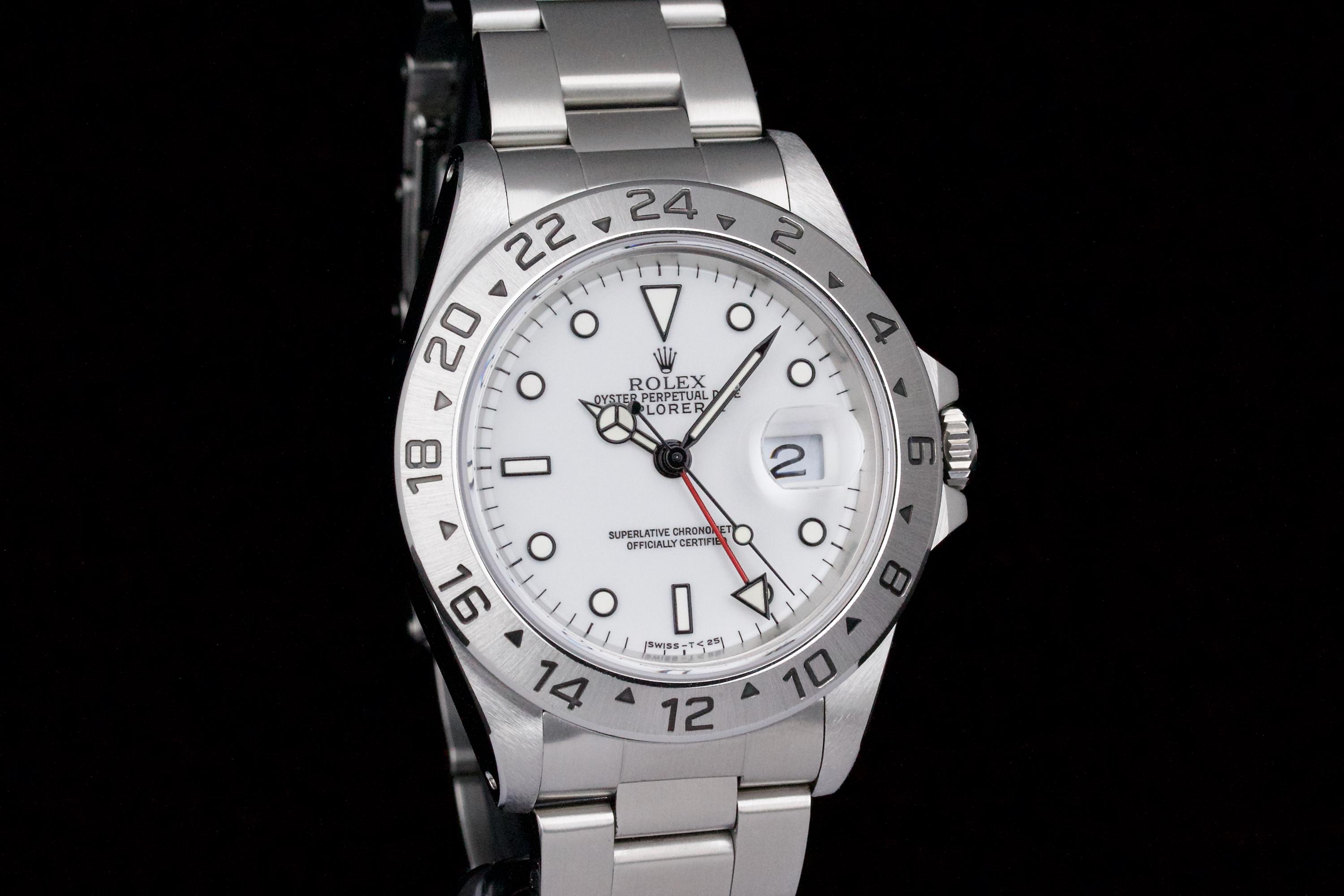 A classic among modern Rolex sports watches, the Explorer II 16570 in its “Polar” configuration has become increasingly collectible—especially early tritium-dial examples with warm patina. This 1997 example features an excellent case that has been polished in the past and remains strong. The original white tritium dial has developed an attractive eggshell patina, with matching hands that enhance its vintage charm. The fixed steel bezel is also in very good condition, with clear engravings and minimal wear. It is fitted with its original 78790 Oyster bracelet with 501B endlinks and a Z3 clasp code. The bracelet shows very light stretch from use and remains tight and wearable. Most importantly, the watch comes with 2025 Rolex service papers, confirming its authenticity and mechanical integrity. An honest and well-balanced Polar Explorer II with appealing patina, complete with recent Rolex service documentation—ready to wear or collect.