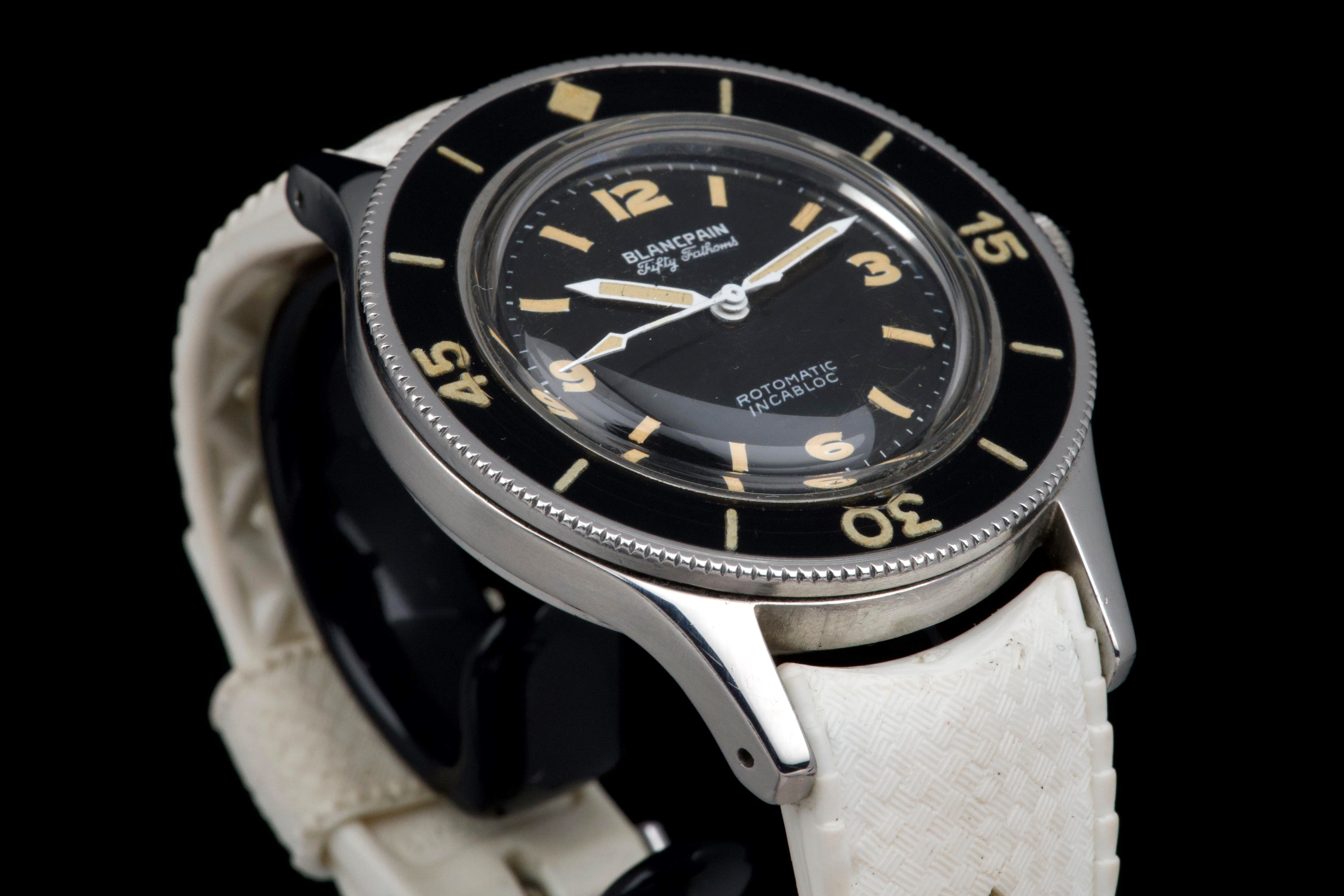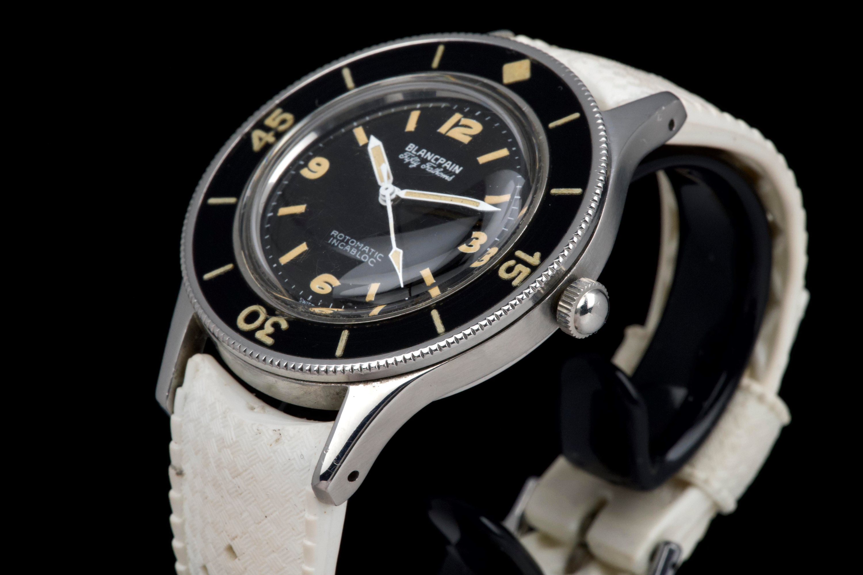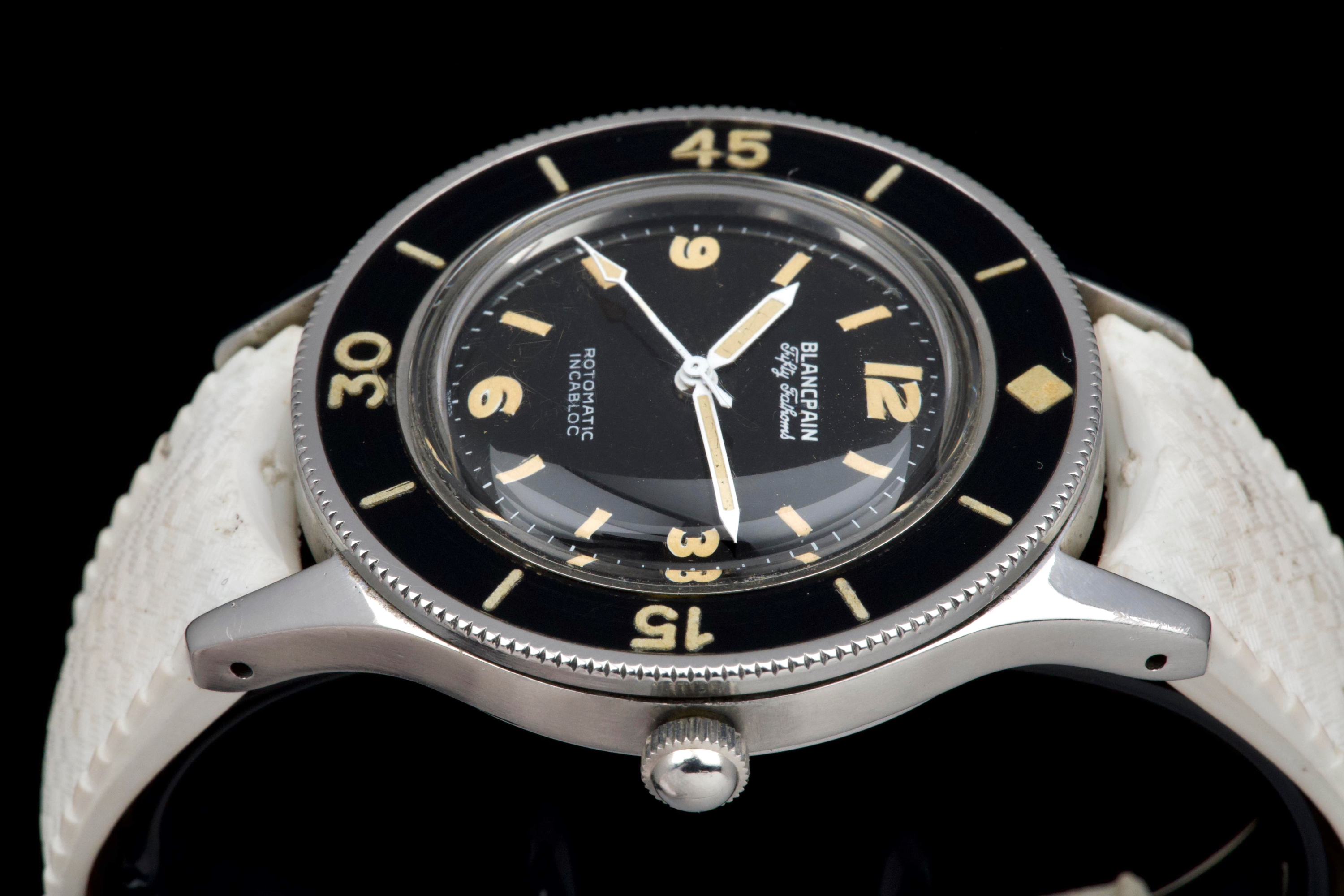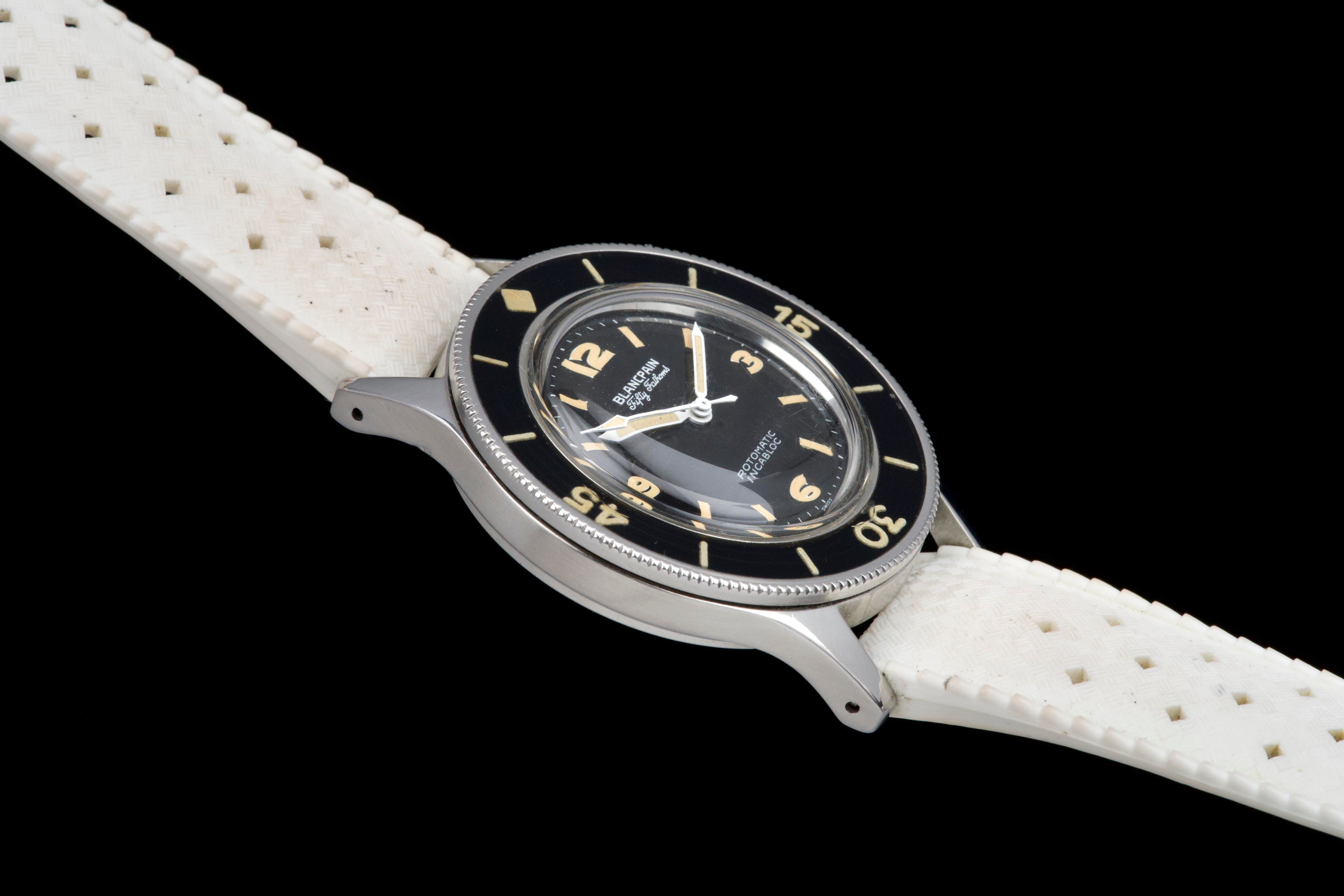 A very rare and early Blancpain Fifty Fathoms, dating to circa 1957, representing one of the foundational models in the history of dive watches. Originally developed in collaboration with the French Navy’s combat diver unit, the Fifty Fathoms set the standard for modern tool watches. This example features a desirable 41 mm stainless steel case, in strong overall condition, preserving the robust proportions of this early diver. The watch is fitted with its original glossy black dial, with white printing and bold Arabic radium hour markers, all preserved in beautiful and highly collectible condition. Finding such well-preserved original dials is increasingly difficult. The original hands retain their radium lume, well matched with the hour markers, though showing minor cracking consistent with age. The watch is also fitted with its original bakelite bezel, which remains in excellent condition. Powering the watch is the automatic Blancpain calibre 1361N, which has been checked by our watchmaker and is running well. The watch will be delivered with a Blancpain Heritage report, confirming its authenticity and correct configuration. An important and highly collectible early Fifty Fathoms, combining military history, originality, and strong overall condition—an essential piece for any serious vintage diver collection.