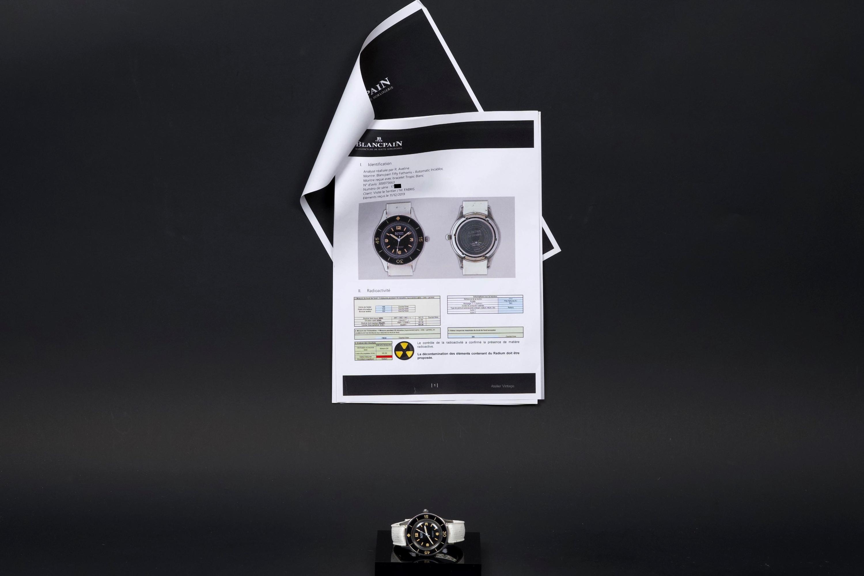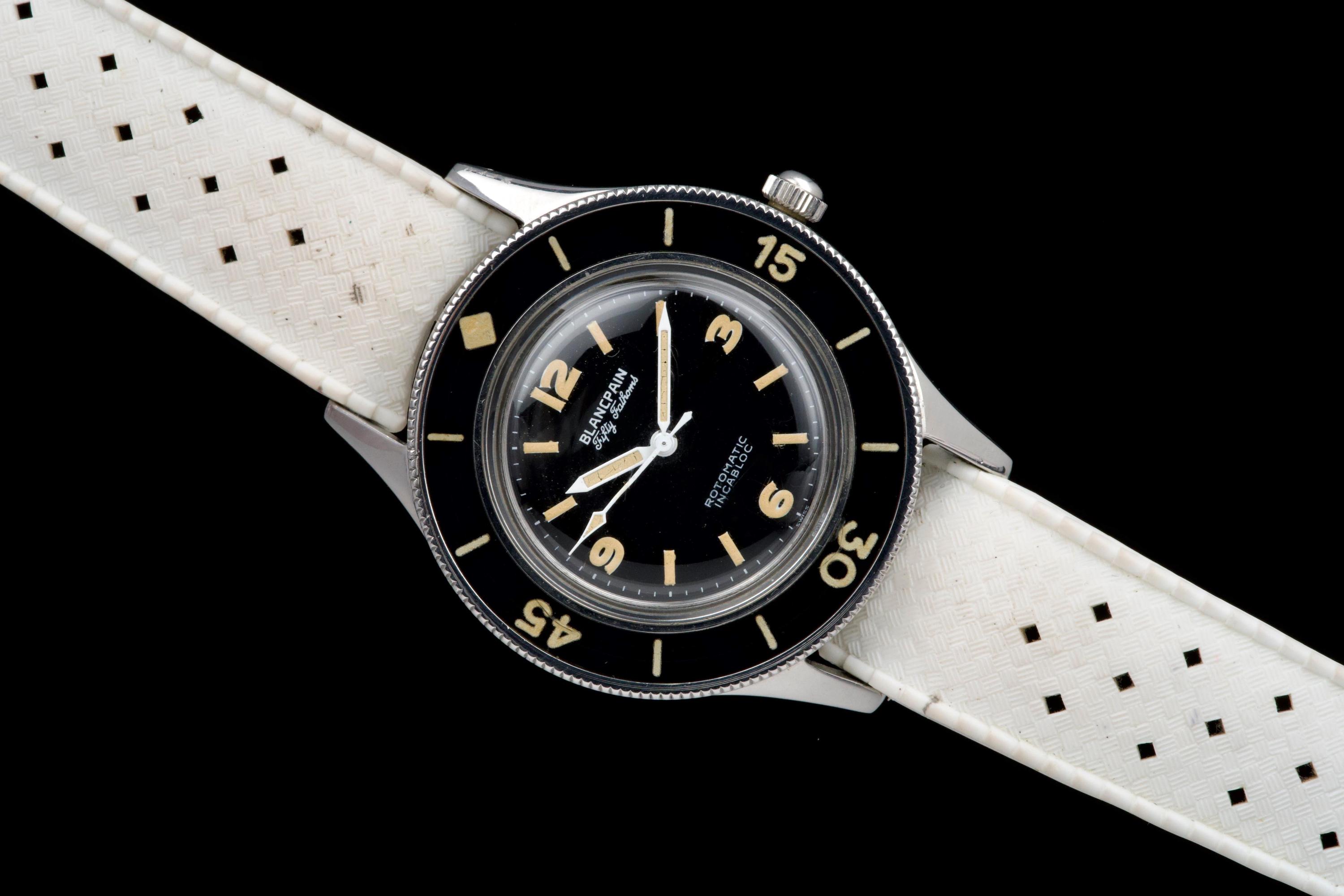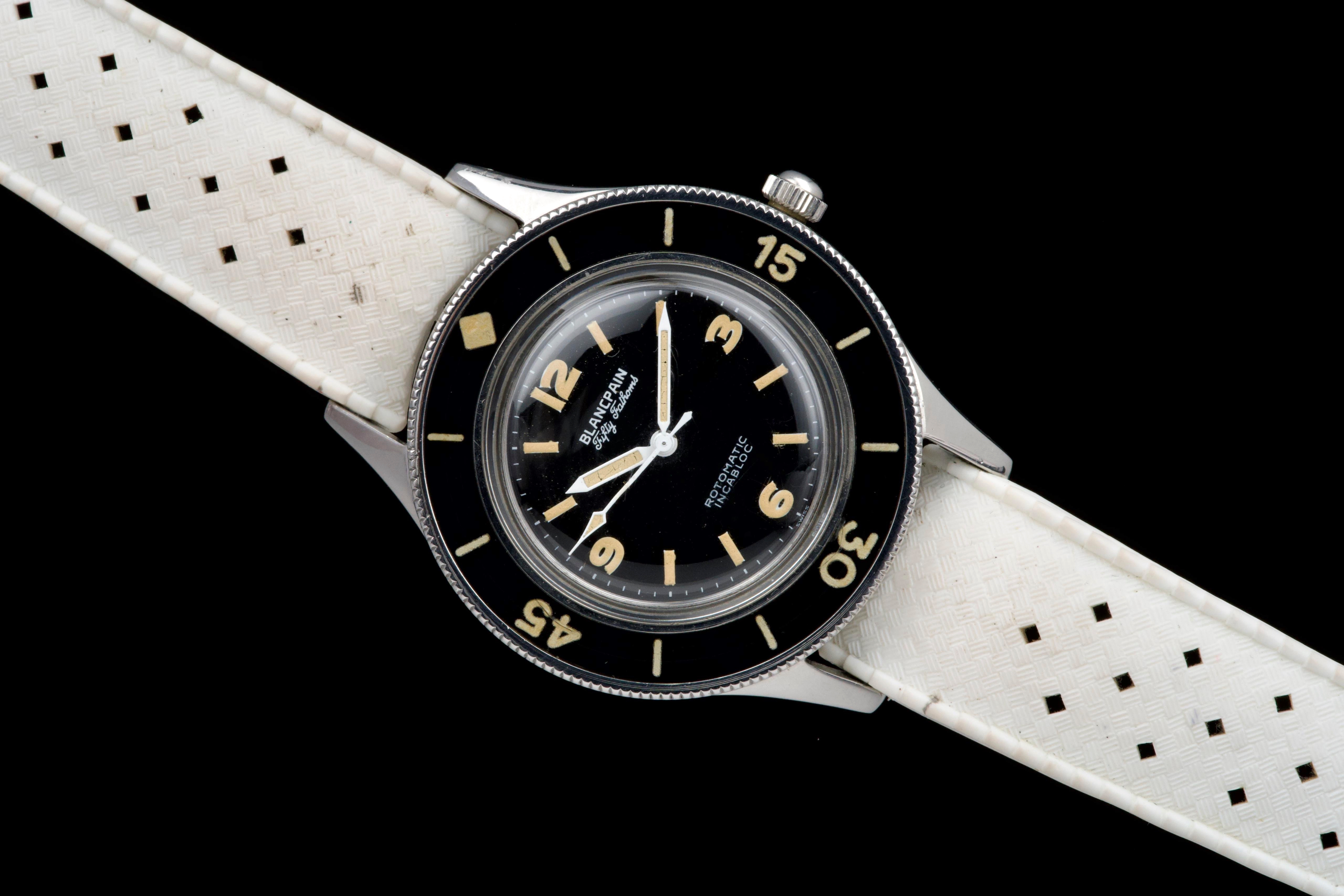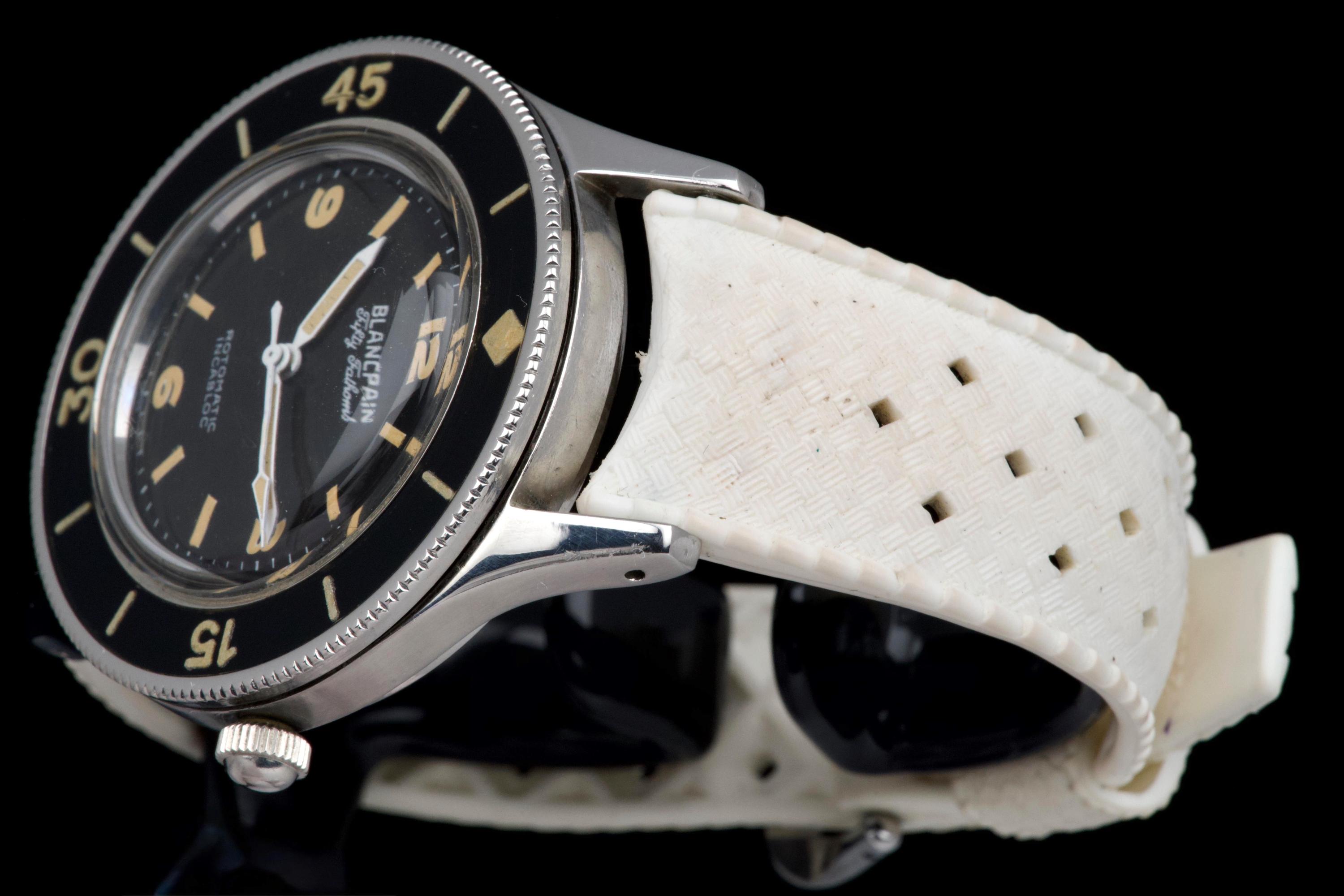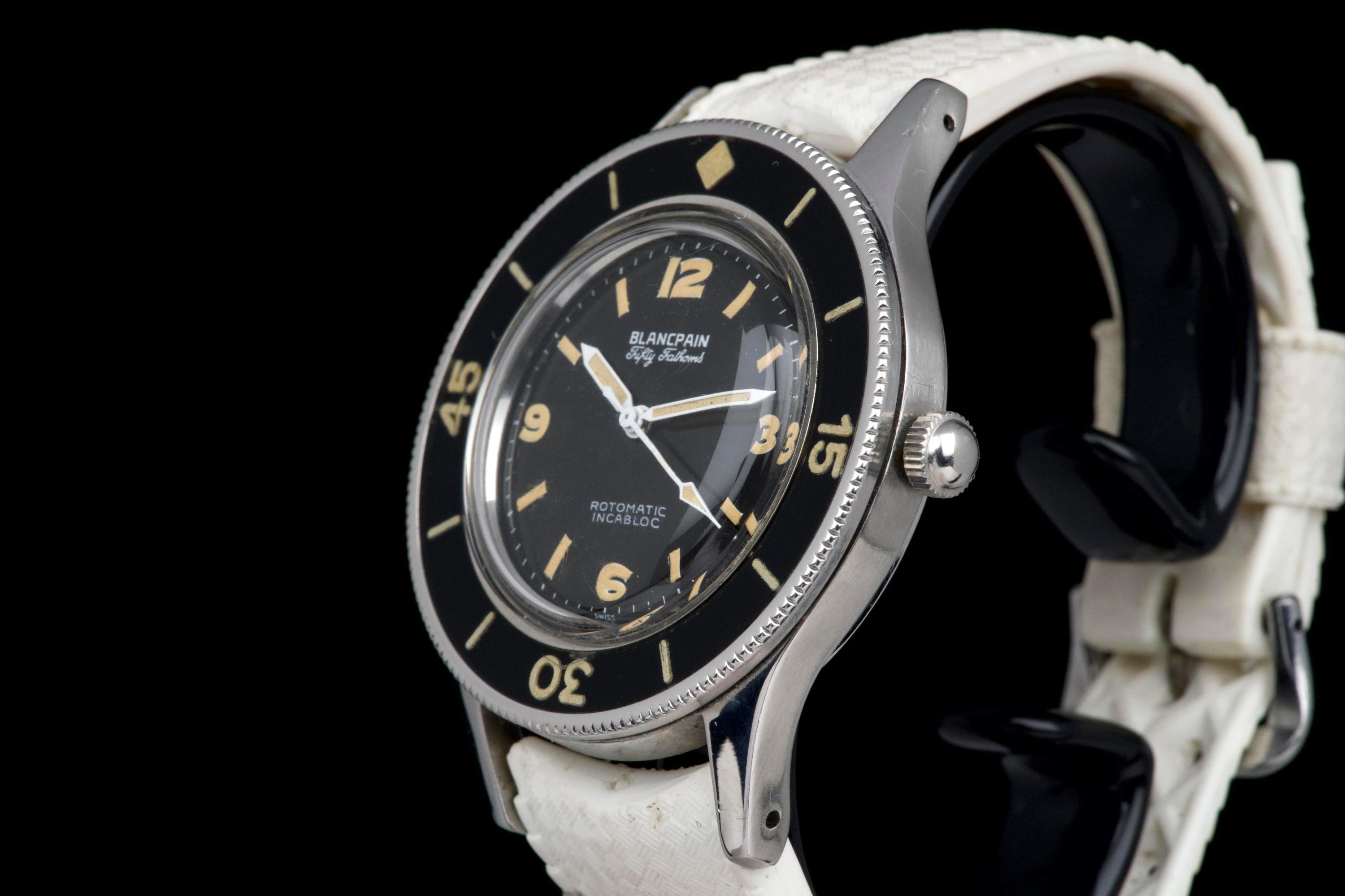 A very rare and early Blancpain Fifty Fathoms, dating to circa 1957, representing one of the foundational models in the history of dive watches. Originally developed in collaboration with the French Navy’s combat diver unit, the Fifty Fathoms set the standard for modern tool watches. This example features a desirable 41 mm stainless steel case, in strong overall condition, preserving the robust proportions of this early diver. The watch is fitted with its original glossy black dial, with white printing and bold Arabic radium hour markers, all preserved in beautiful and highly collectible condition. Finding such well-preserved original dials is increasingly difficult. The original hands retain their radium lume, well matched with the hour markers, though showing minor cracking consistent with age. The watch is also fitted with its original bakelite bezel, which remains in excellent condition. Powering the watch is the automatic Blancpain calibre 1361N, which has been checked by our watchmaker and is running well. The watch will be delivered with a Blancpain Heritage report, confirming its authenticity and correct configuration. An important and highly collectible early Fifty Fathoms, combining military history, originality, and strong overall condition—an essential piece for any serious vintage diver collection.