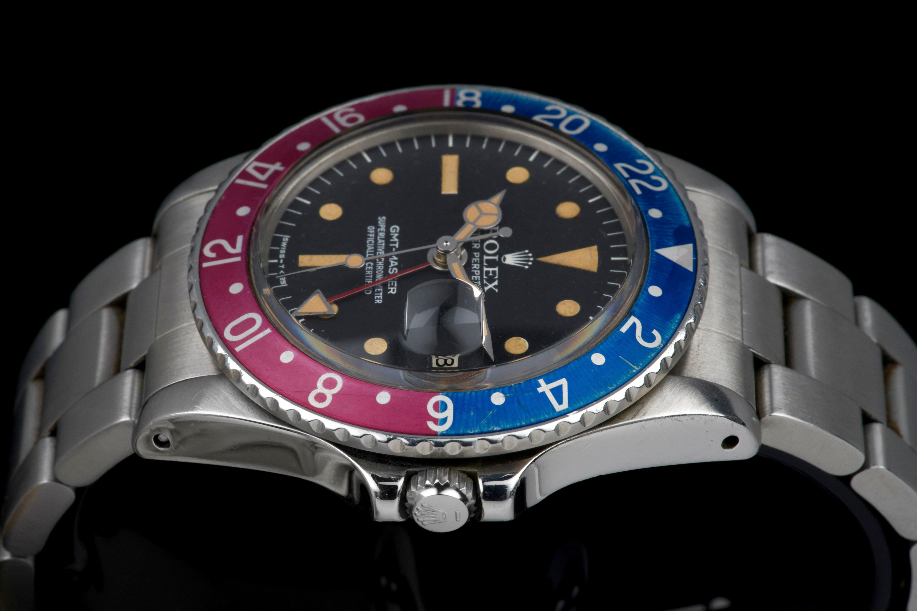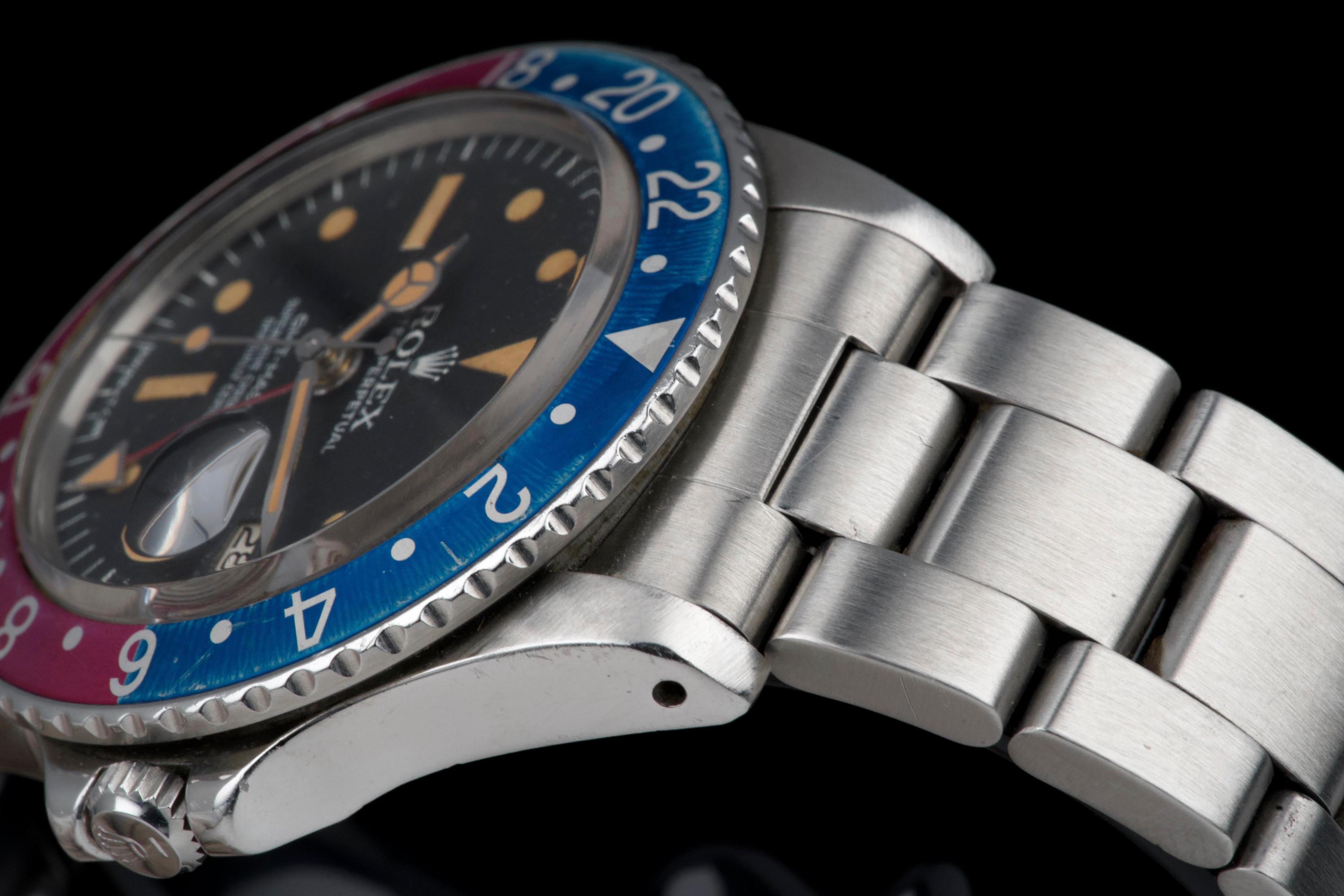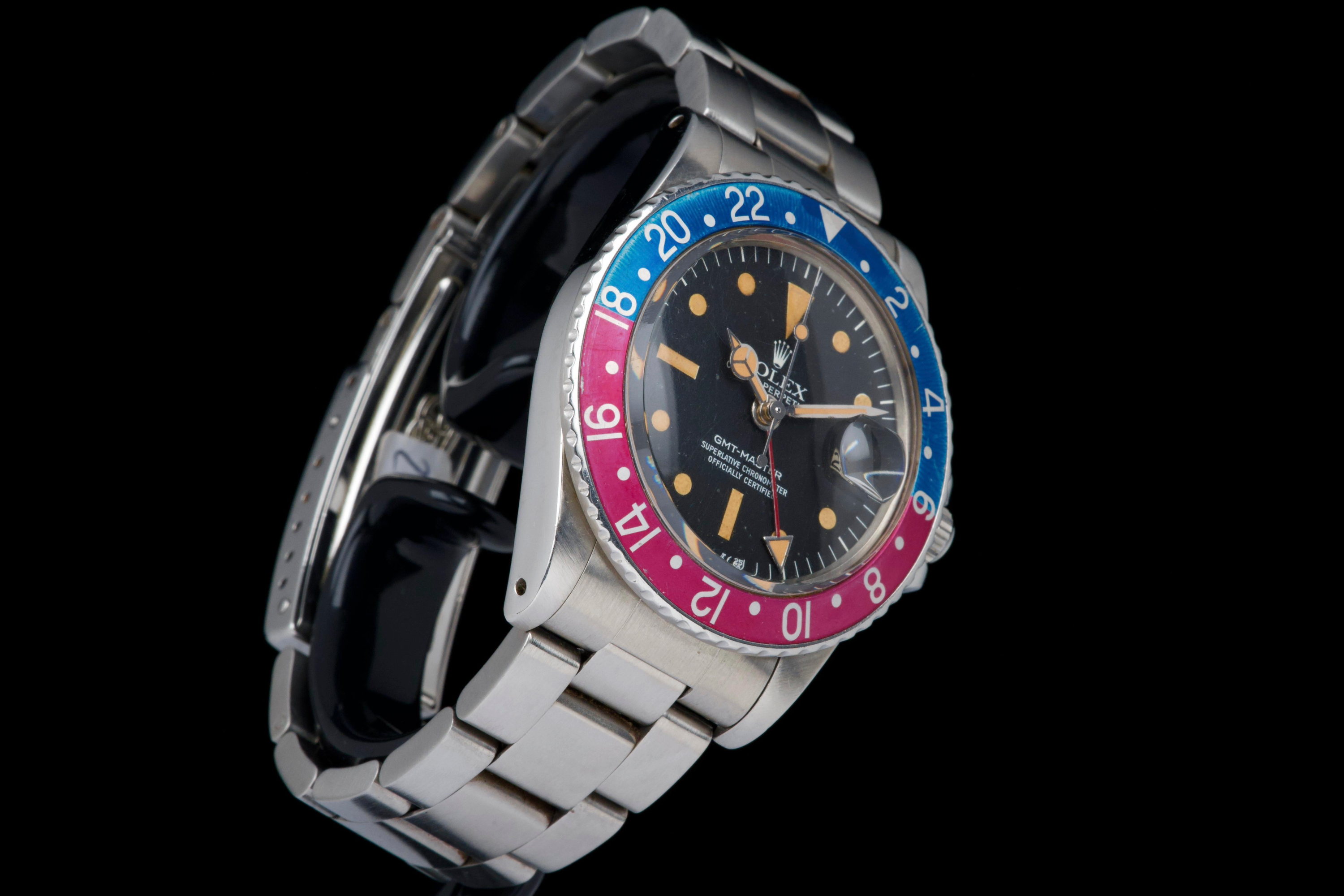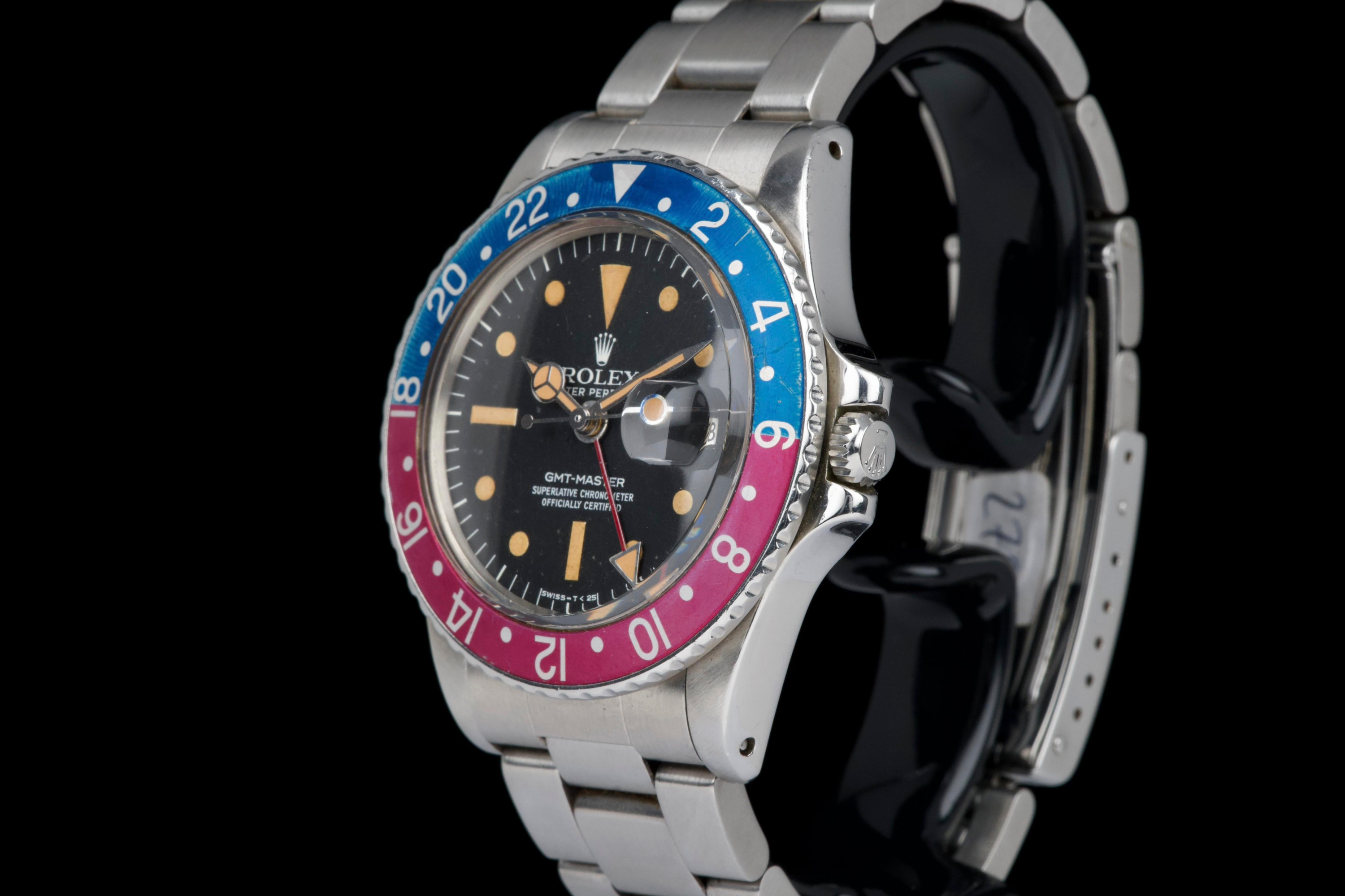 Presented here is a well-preserved and highly appealing example of the Rolex GMT-Master reference 1675, featuring the sought-after “Pepsi” bezel and dating to 1978, with a serial number in the 5.747.xxx range. The case has been polished in the past and today shows light wear consistent with use, while retaining well-defined proportions and crisp, clearly legible reference and serial numbers between the lugs. The caseback is correctly stamped 1675. The watch is distinguished by its rare MK3 radial dial, displaying an attractive “pumpkin” patina across the tritium hour markers and perfectly matching hands. The dial surface shows minor surface spotting, a characteristic commonly observed on radial dials from this period and appreciated by collectors as an authentic sign of age. The original Pepsi bezel insert presents with gentle fading, the red portion having shifted subtly toward a fuchsia tone, adding further vintage character. The watch is fitted with a slightly later Oyster bracelet, reference 78360 with correct 580 end links, showing only very light stretch. With no recorded service history, the movement is nonetheless in perfect working condition. A correct and characterful example of the classic GMT-Master 1675, combining a rare dial configuration, honest wear, and strong overall presentation, appealing to collectors of vintage Rolex sports models.