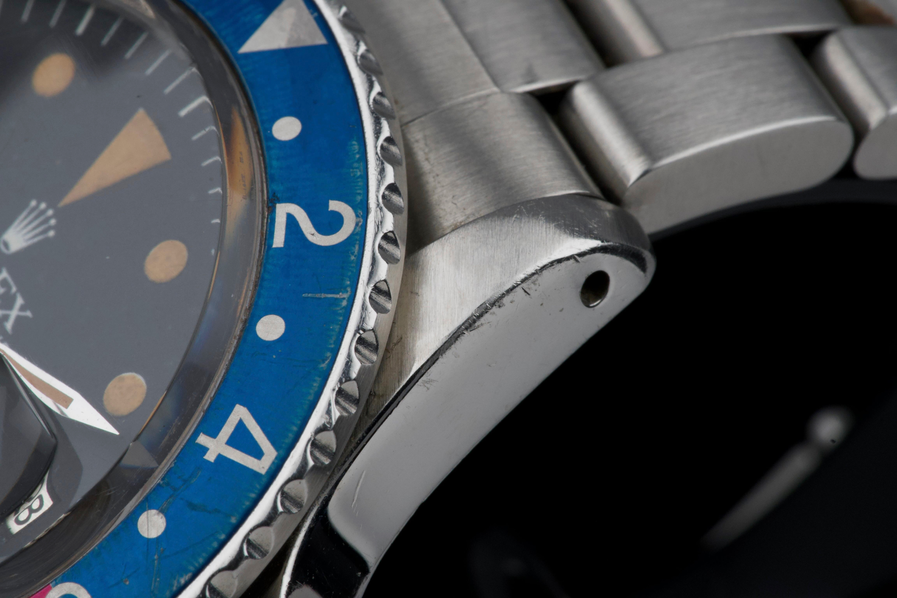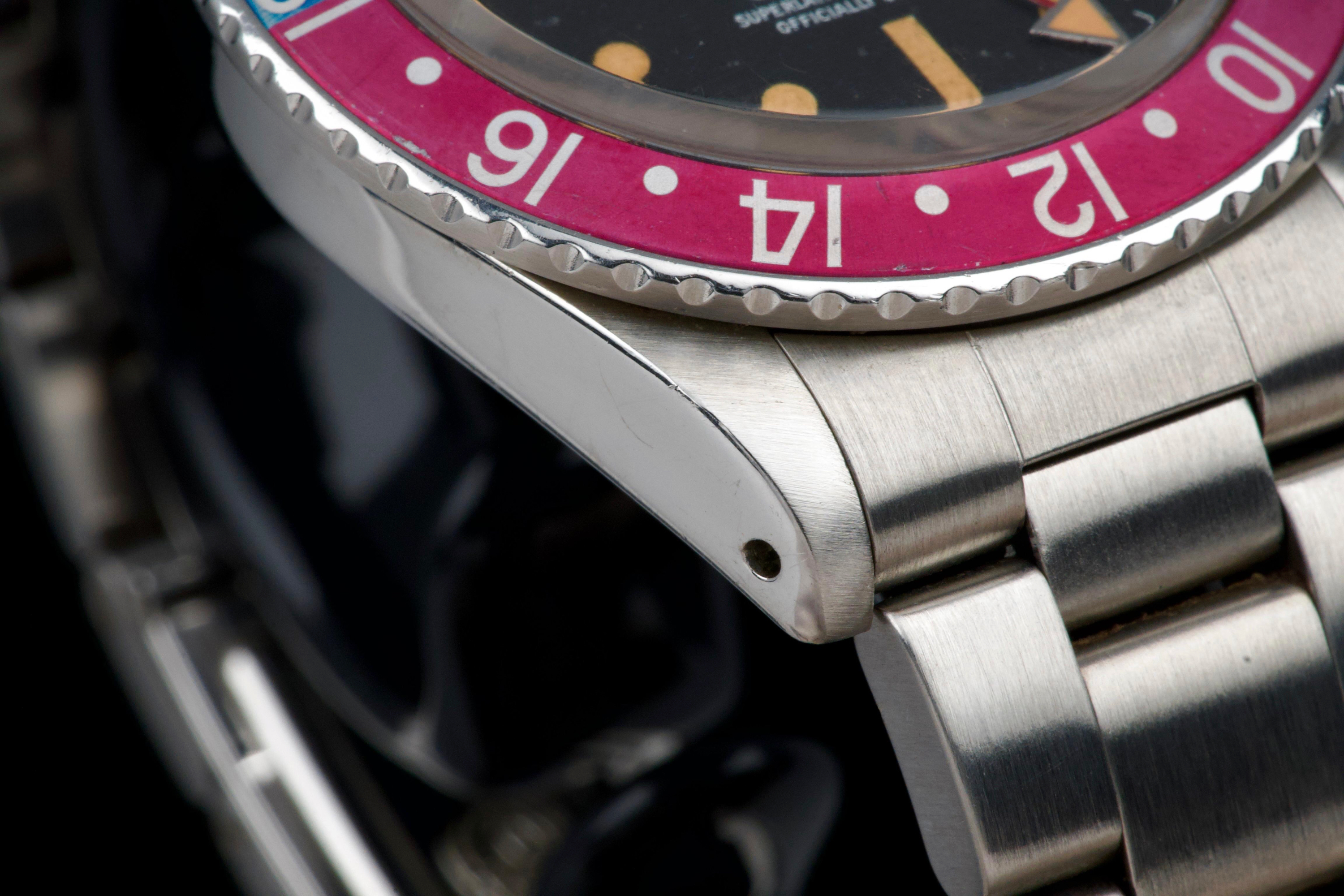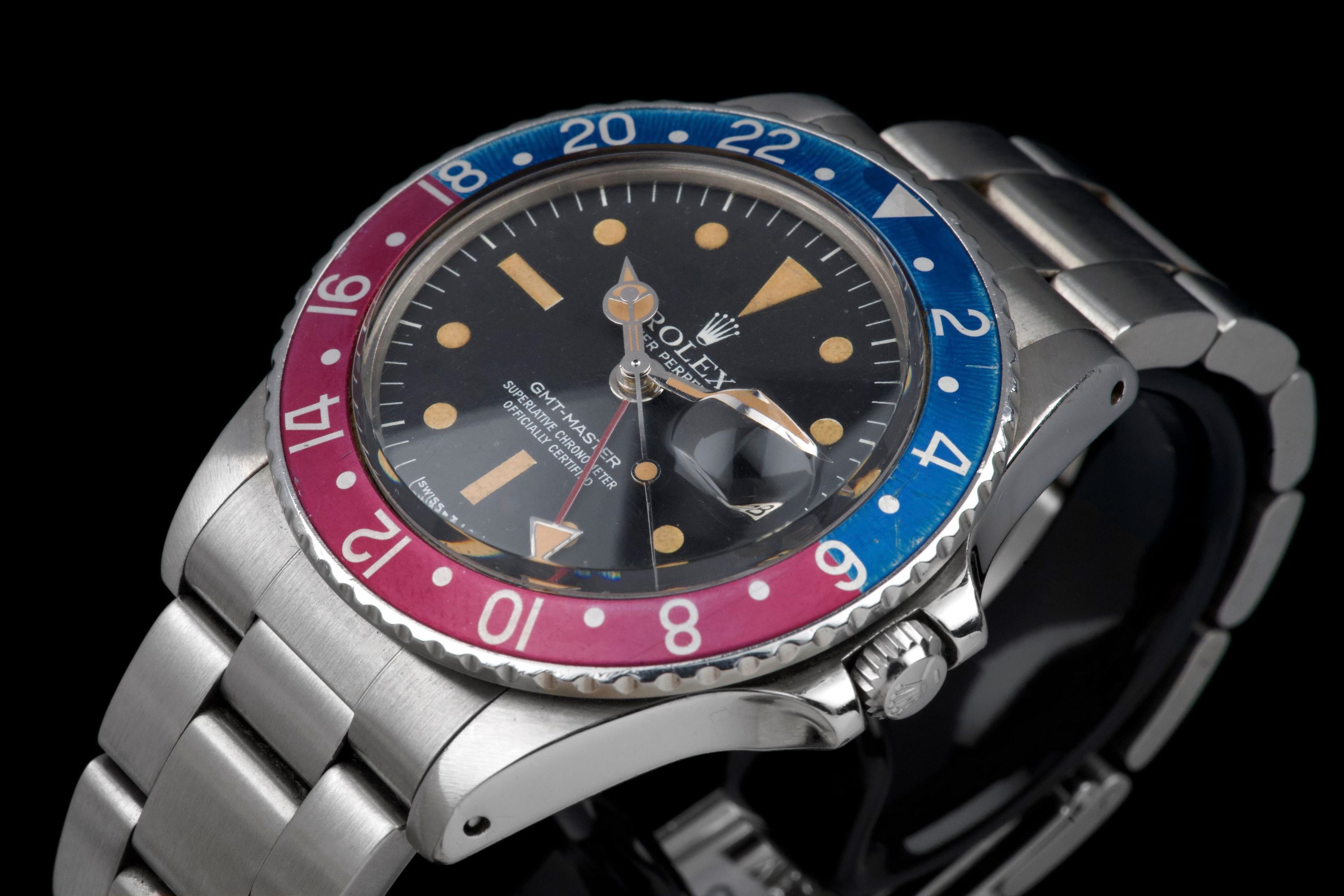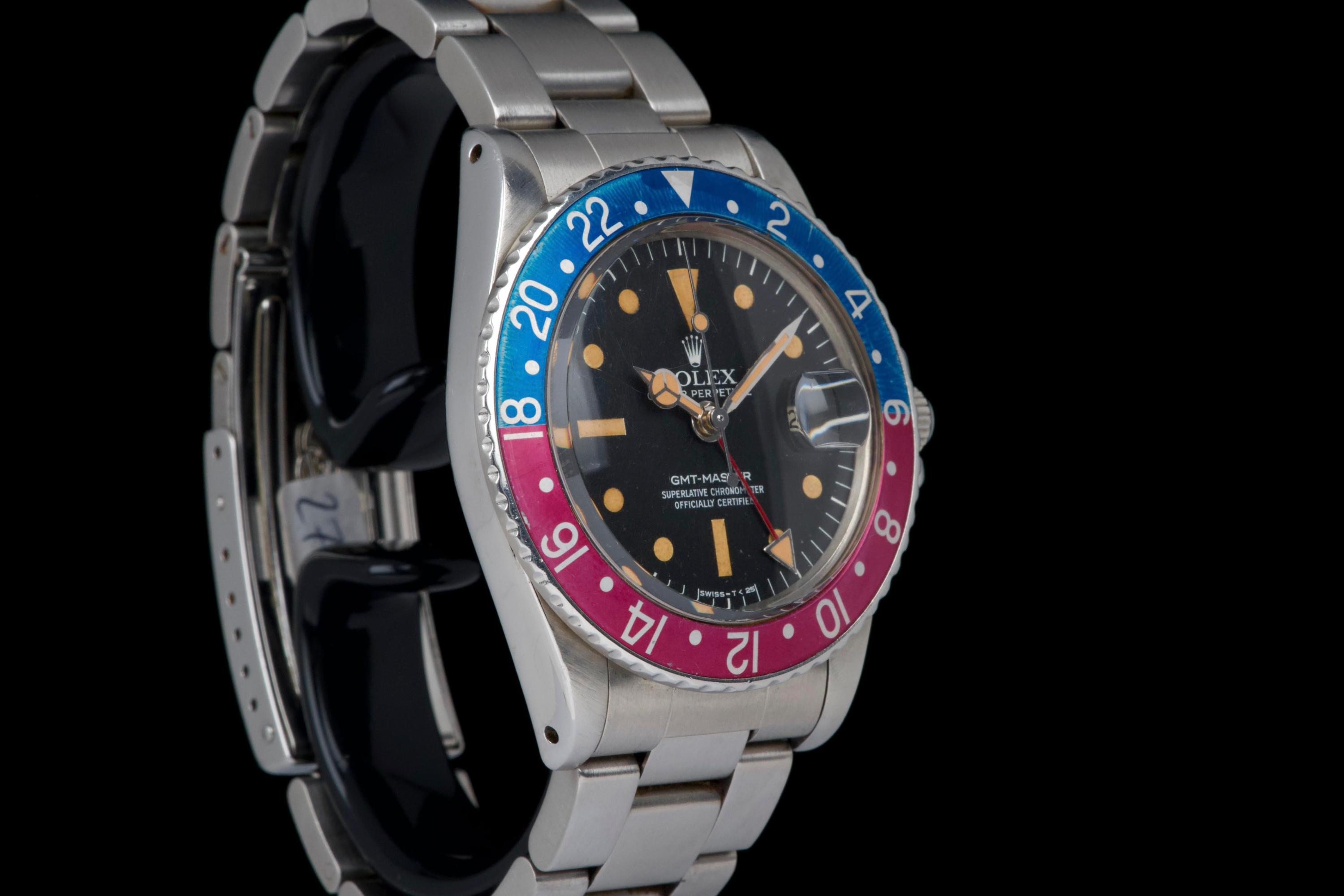 Presented here is a well-preserved and highly appealing example of the Rolex GMT-Master reference 1675, featuring the sought-after “Pepsi” bezel and dating to 1978, with a serial number in the 5.747.xxx range. The case has been polished in the past and today shows light wear consistent with use, while retaining well-defined proportions and crisp, clearly legible reference and serial numbers between the lugs. The caseback is correctly stamped 1675. The watch is distinguished by its rare MK3 radial dial, displaying an attractive “pumpkin” patina across the tritium hour markers and perfectly matching hands. The dial surface shows minor surface spotting, a characteristic commonly observed on radial dials from this period and appreciated by collectors as an authentic sign of age. The original Pepsi bezel insert presents with gentle fading, the red portion having shifted subtly toward a fuchsia tone, adding further vintage character. The watch is fitted with a slightly later Oyster bracelet, reference 78360 with correct 580 end links, showing only very light stretch. With no recorded service history, the movement is nonetheless in perfect working condition. A correct and characterful example of the classic GMT-Master 1675, combining a rare dial configuration, honest wear, and strong overall presentation, appealing to collectors of vintage Rolex sports models.