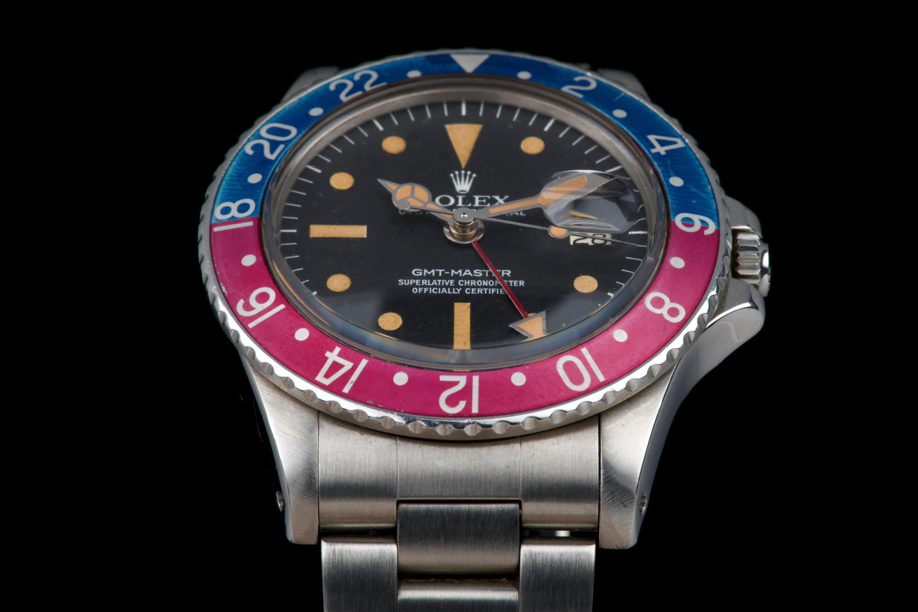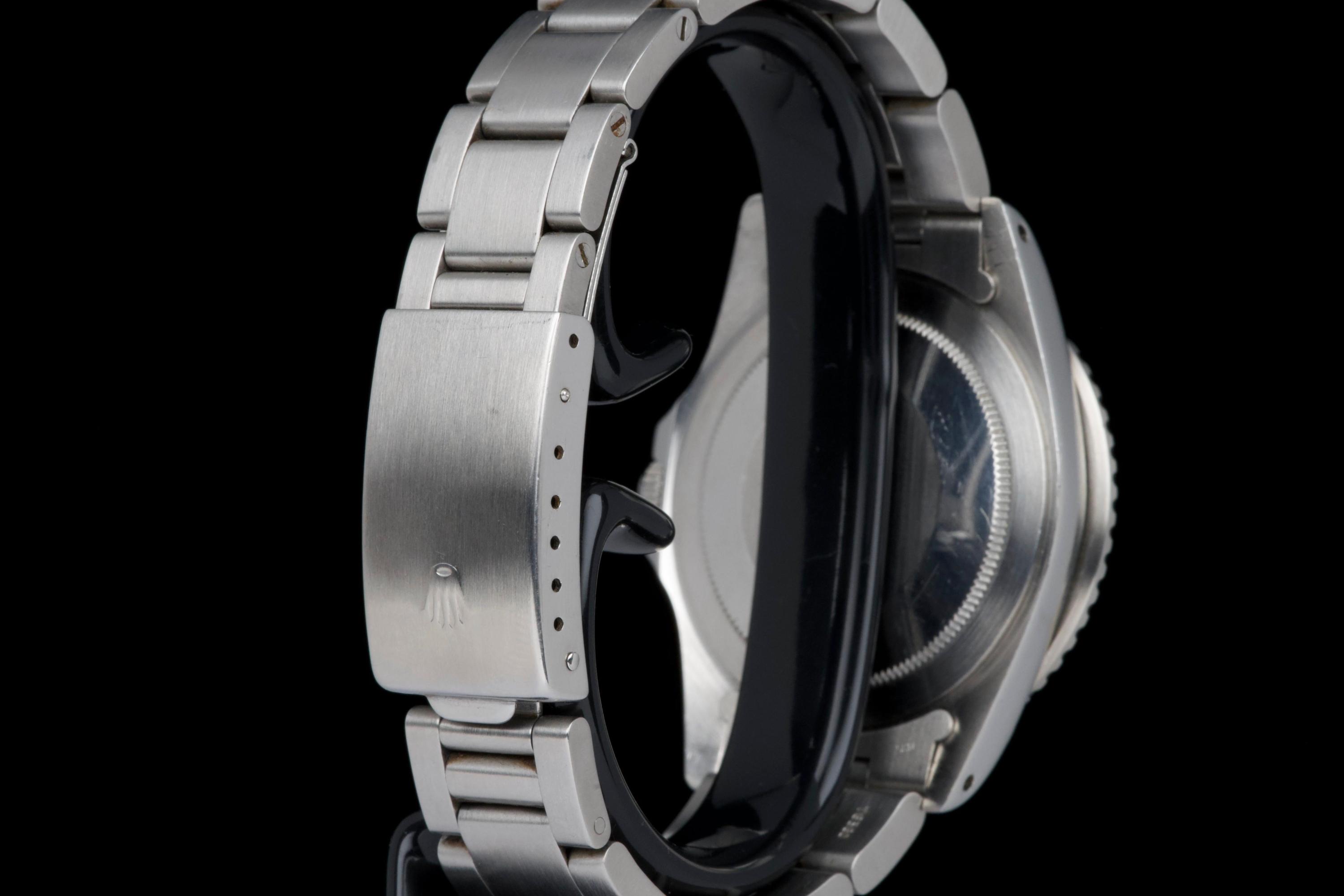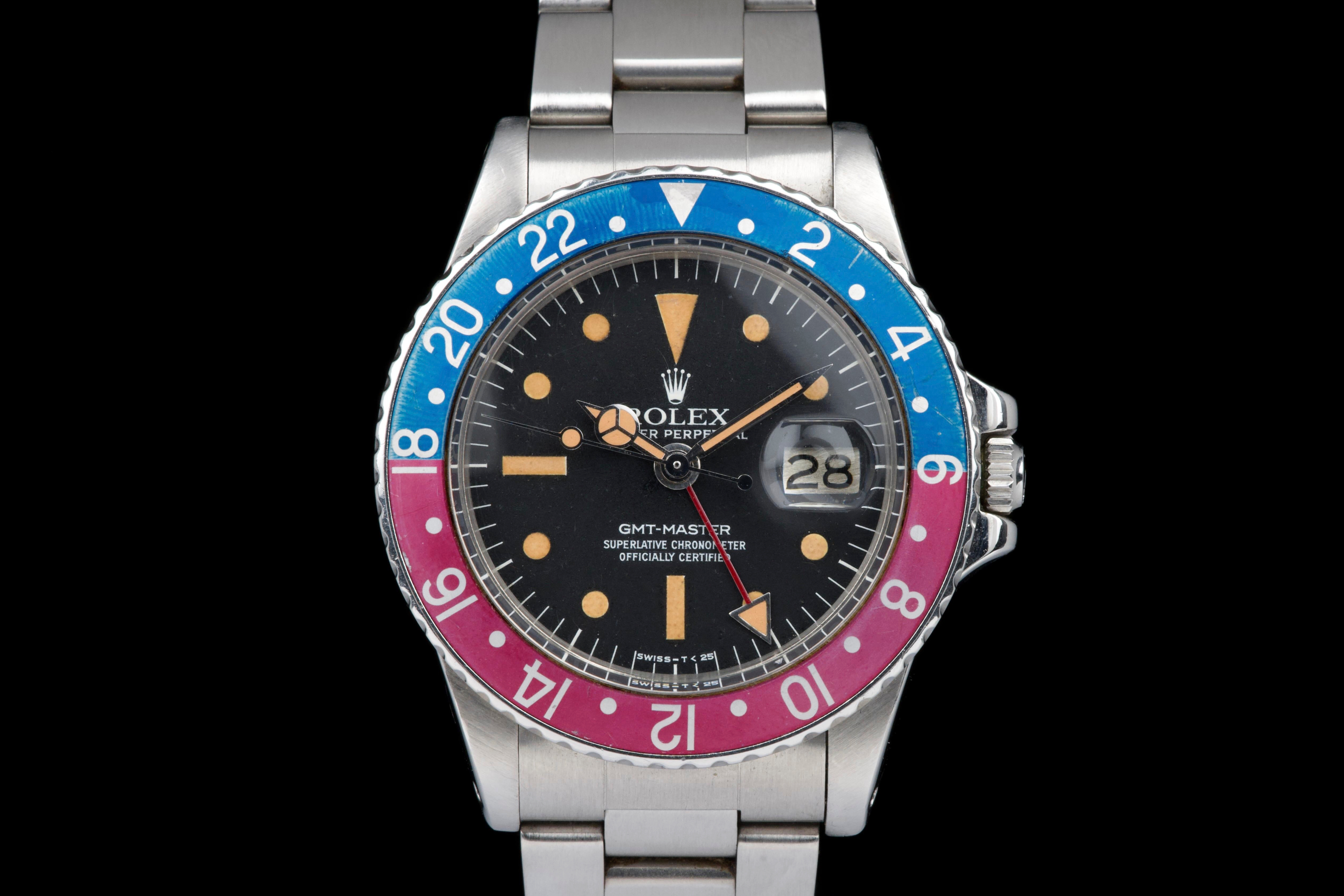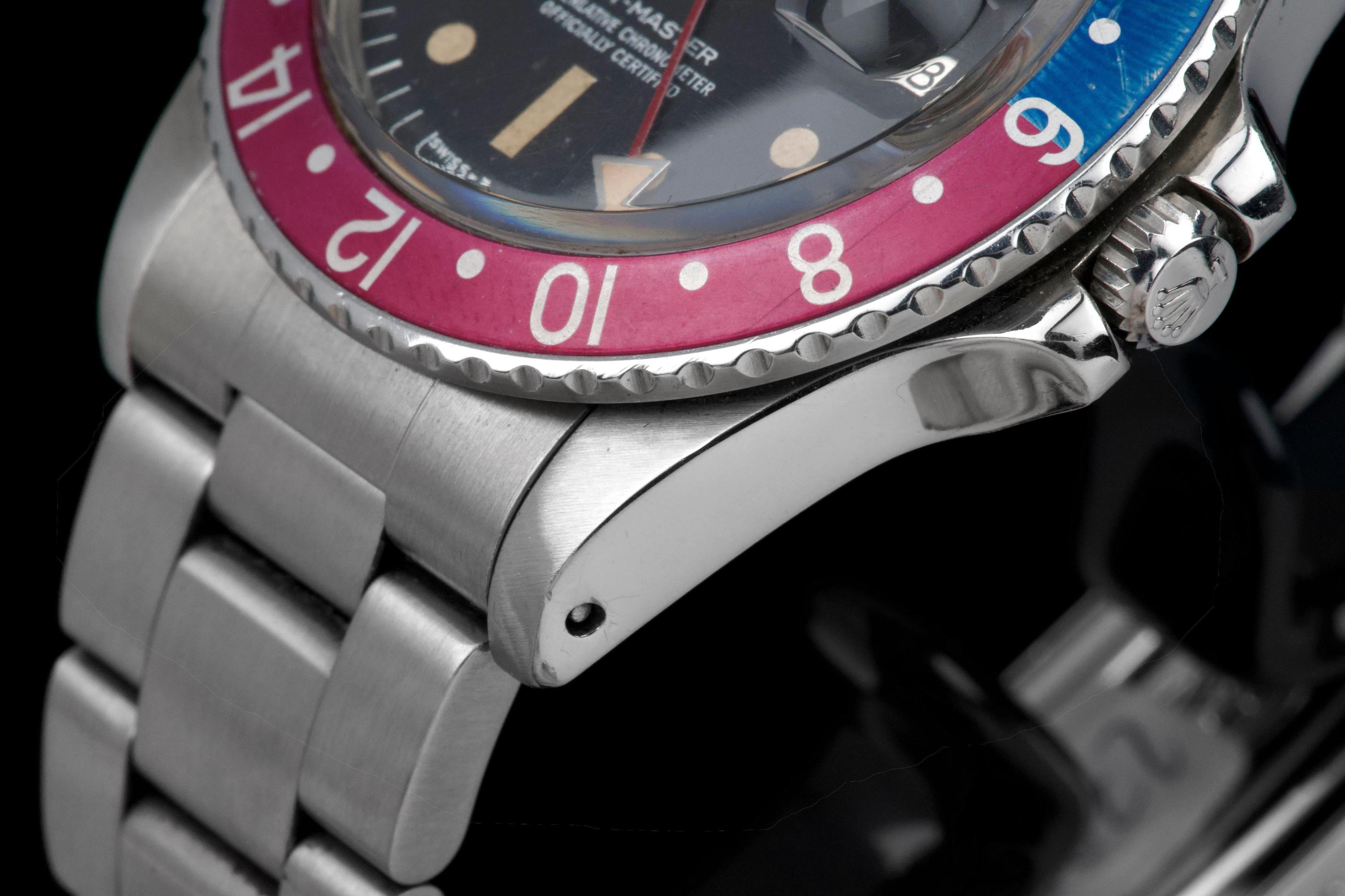 Presented here is a well-preserved and highly appealing example of the Rolex GMT-Master reference 1675, featuring the sought-after “Pepsi” bezel and dating to 1978, with a serial number in the 5.747.xxx range. The case has been polished in the past and today shows light wear consistent with use, while retaining well-defined proportions and crisp, clearly legible reference and serial numbers between the lugs. The caseback is correctly stamped 1675. The watch is distinguished by its rare MK3 radial dial, displaying an attractive “pumpkin” patina across the tritium hour markers and perfectly matching hands. The dial surface shows minor surface spotting, a characteristic commonly observed on radial dials from this period and appreciated by collectors as an authentic sign of age. The original Pepsi bezel insert presents with gentle fading, the red portion having shifted subtly toward a fuchsia tone, adding further vintage character. The watch is fitted with a slightly later Oyster bracelet, reference 78360 with correct 580 end links, showing only very light stretch. With no recorded service history, the movement is nonetheless in perfect working condition. A correct and characterful example of the classic GMT-Master 1675, combining a rare dial configuration, honest wear, and strong overall presentation, appealing to collectors of vintage Rolex sports models.