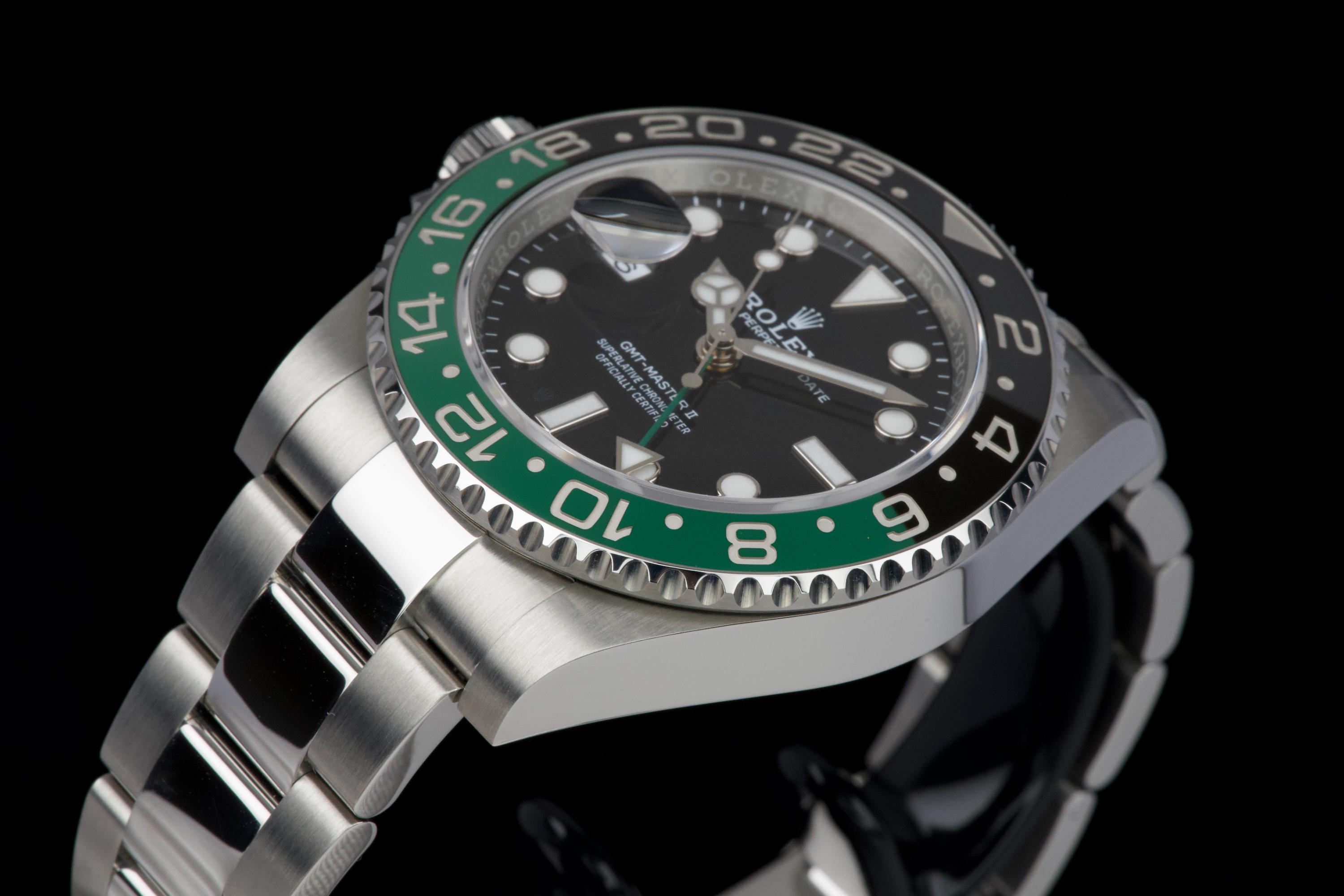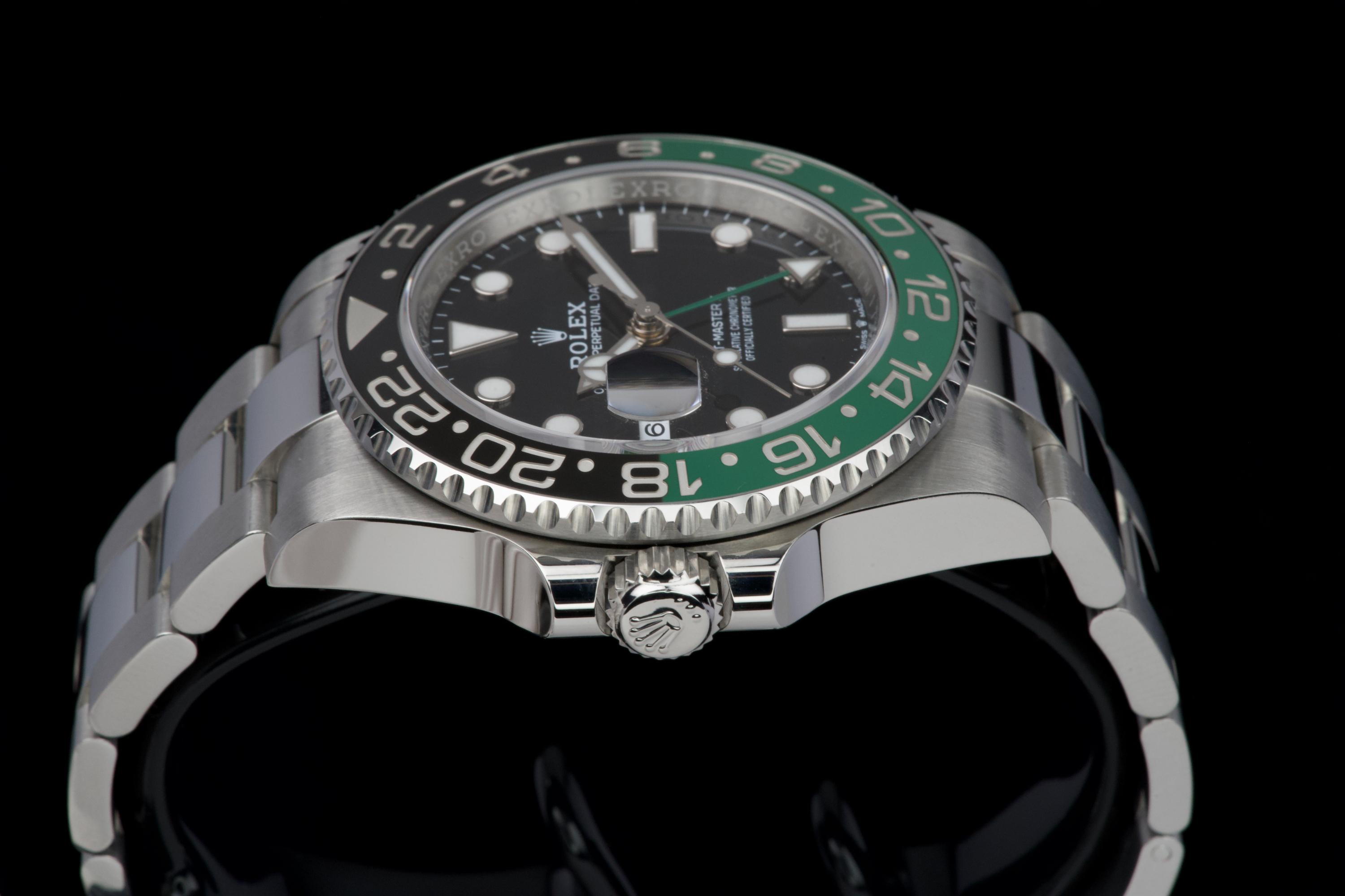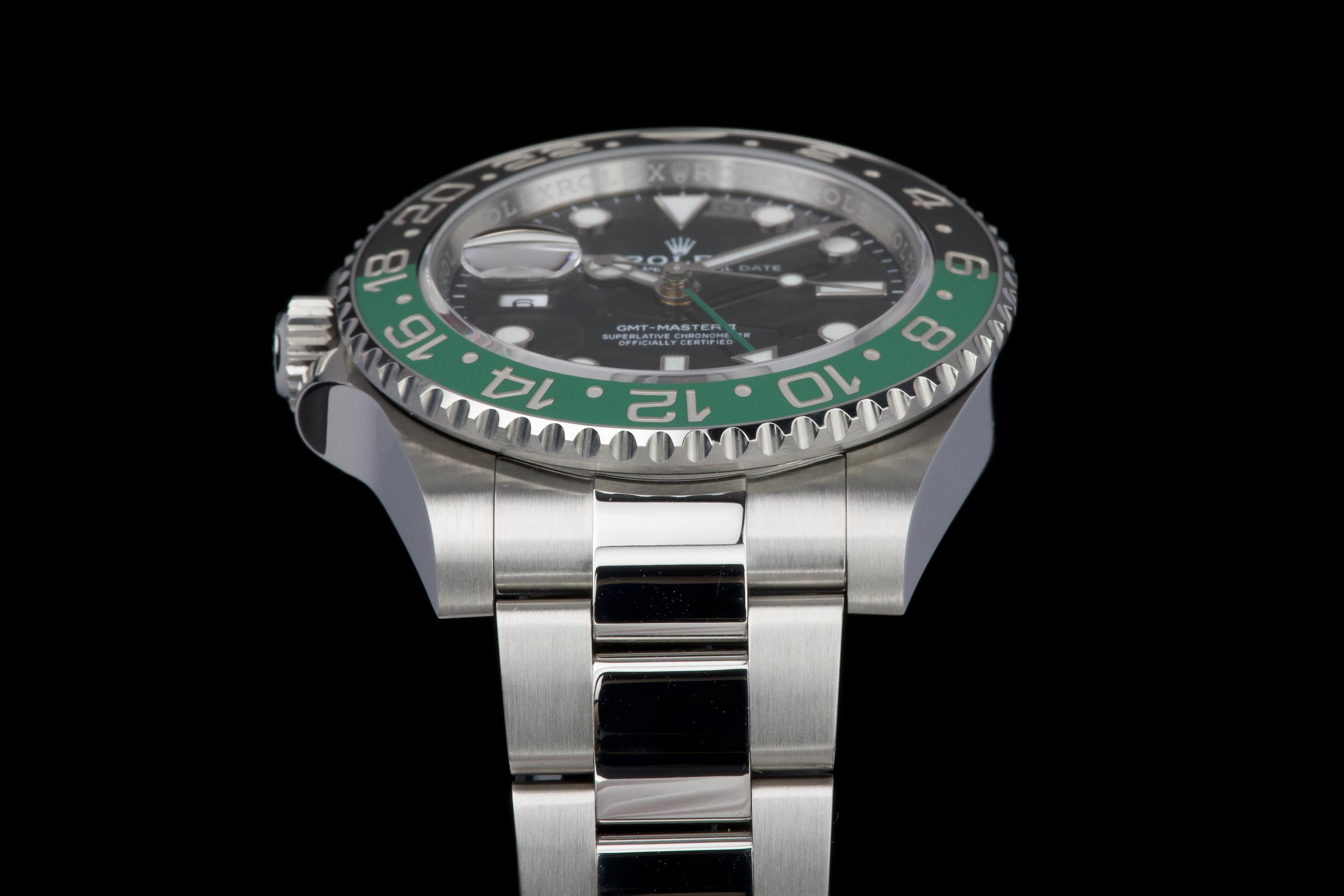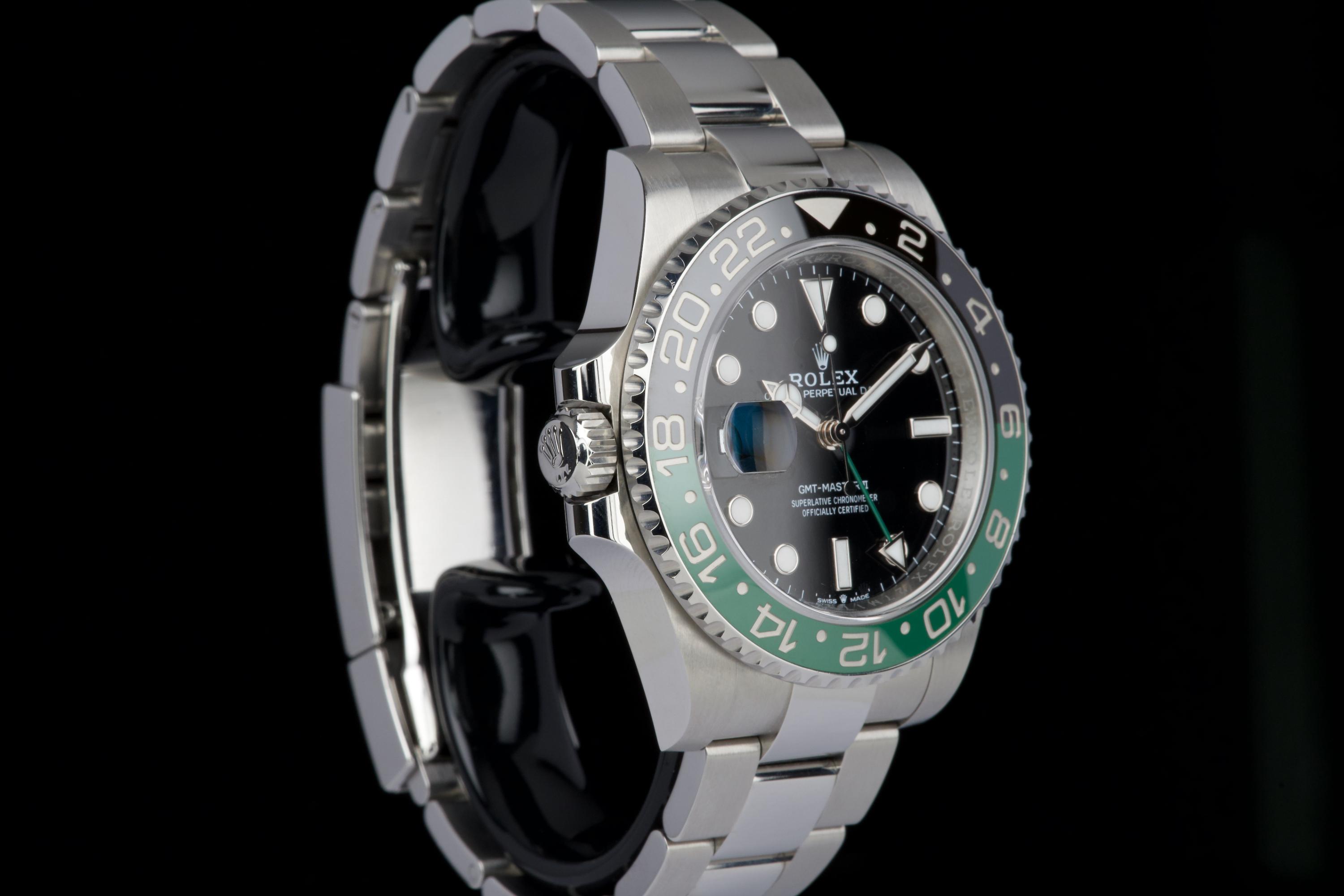 The present Rolex GMT-Master II reference 126720VTNR, offered here as a complete full set and dating to 2022, is a striking and highly sought-after modern interpretation of Rolex’s iconic travel watch. Instantly recognizable for its left-handed configuration, with the crown positioned on the left side of the case, this reference has become one of the most distinctive contemporary GMT-Master II models. The watch is fitted with its original Oyster bracelet and has just returned from polishing, presenting in excellent overall condition with clean surfaces and sharp lines throughout the case and bracelet. The black dial and black-and-green Cerachrom bezel remain flawless, offering a bold yet balanced aesthetic that defines this reference. Delivered as a full set, this GMT-Master II 126720VTNR represents an appealing opportunity to acquire a modern Rolex sports watch in outstanding condition, combining contemporary design, technical reliability, and strong collectability.