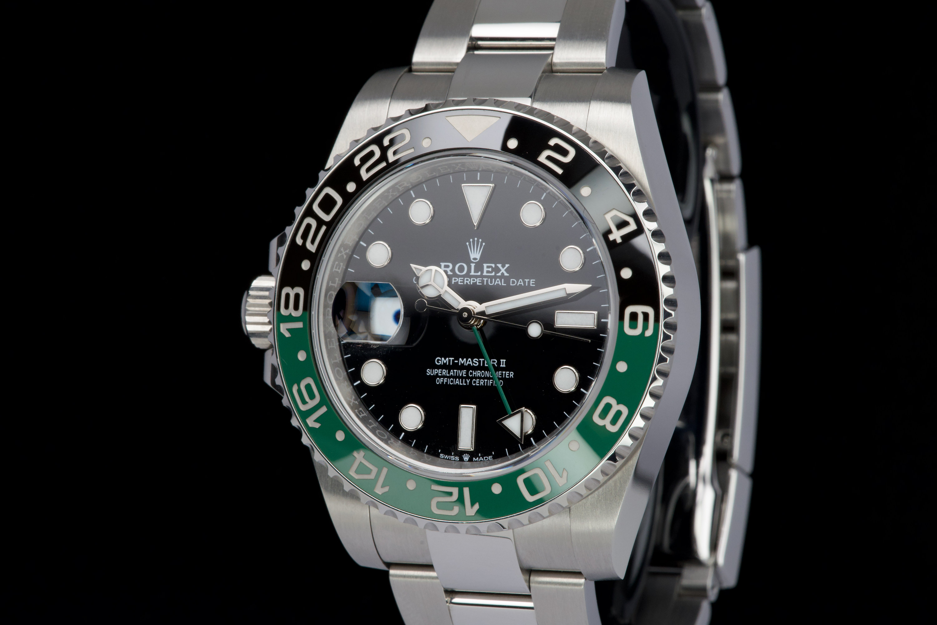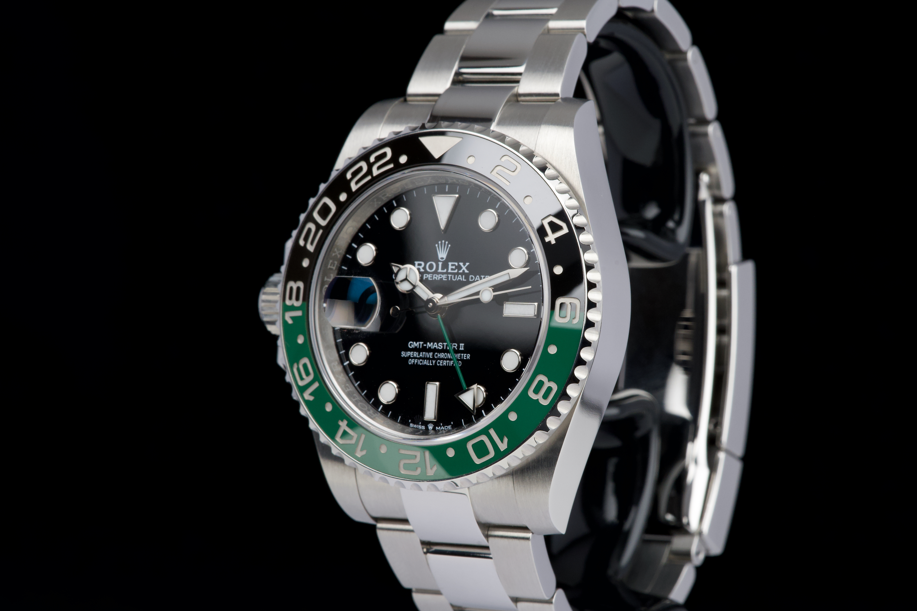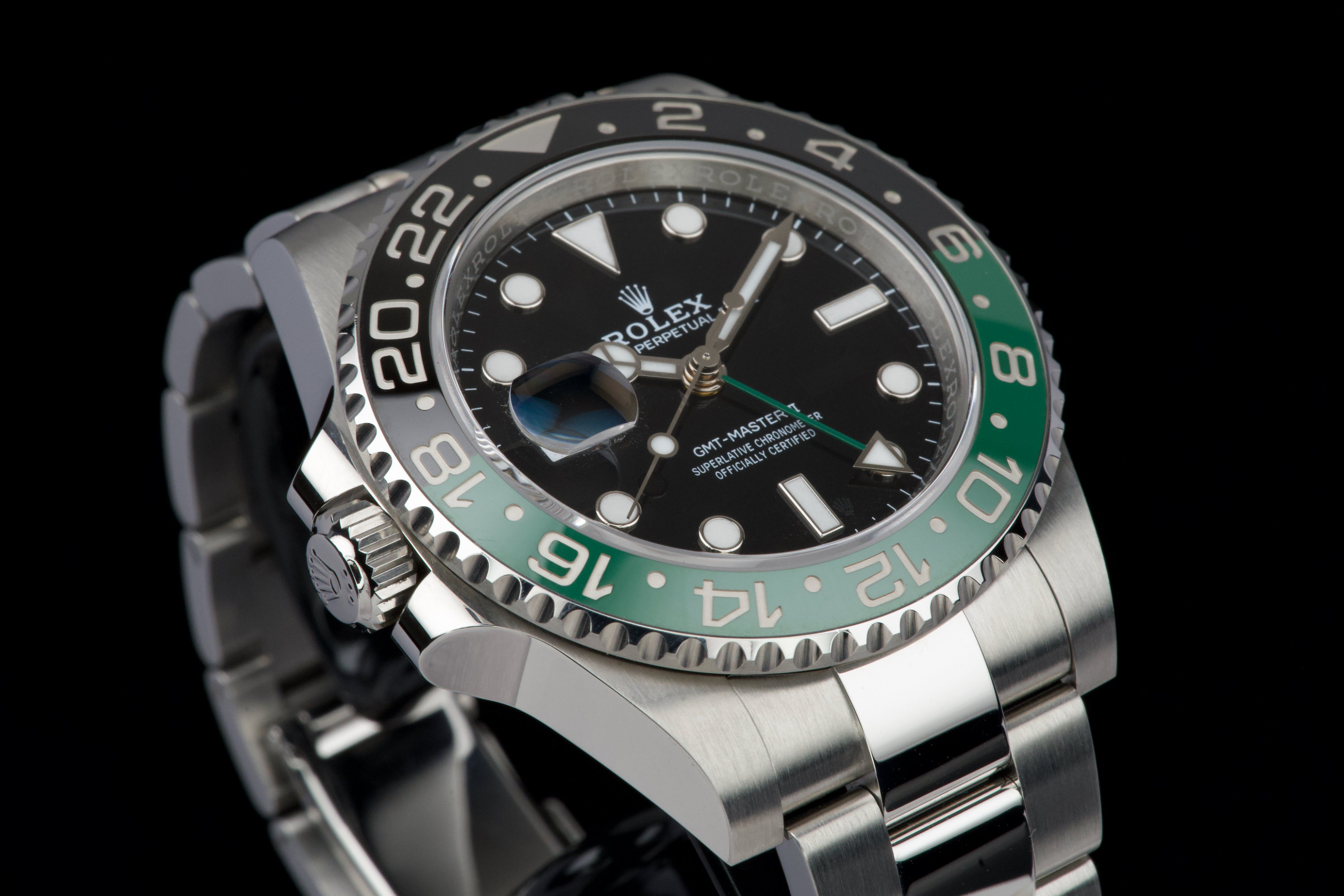 The present Rolex GMT-Master II reference 126720VTNR, offered here as a complete full set and dating to 2022, is a striking and highly sought-after modern interpretation of Rolex’s iconic travel watch. Instantly recognizable for its left-handed configuration, with the crown positioned on the left side of the case, this reference has become one of the most distinctive contemporary GMT-Master II models. The watch is fitted with its original Oyster bracelet and has just returned from polishing, presenting in excellent overall condition with clean surfaces and sharp lines throughout the case and bracelet. The black dial and black-and-green Cerachrom bezel remain flawless, offering a bold yet balanced aesthetic that defines this reference. Delivered as a full set, this GMT-Master II 126720VTNR represents an appealing opportunity to acquire a modern Rolex sports watch in outstanding condition, combining contemporary design, technical reliability, and strong collectability.