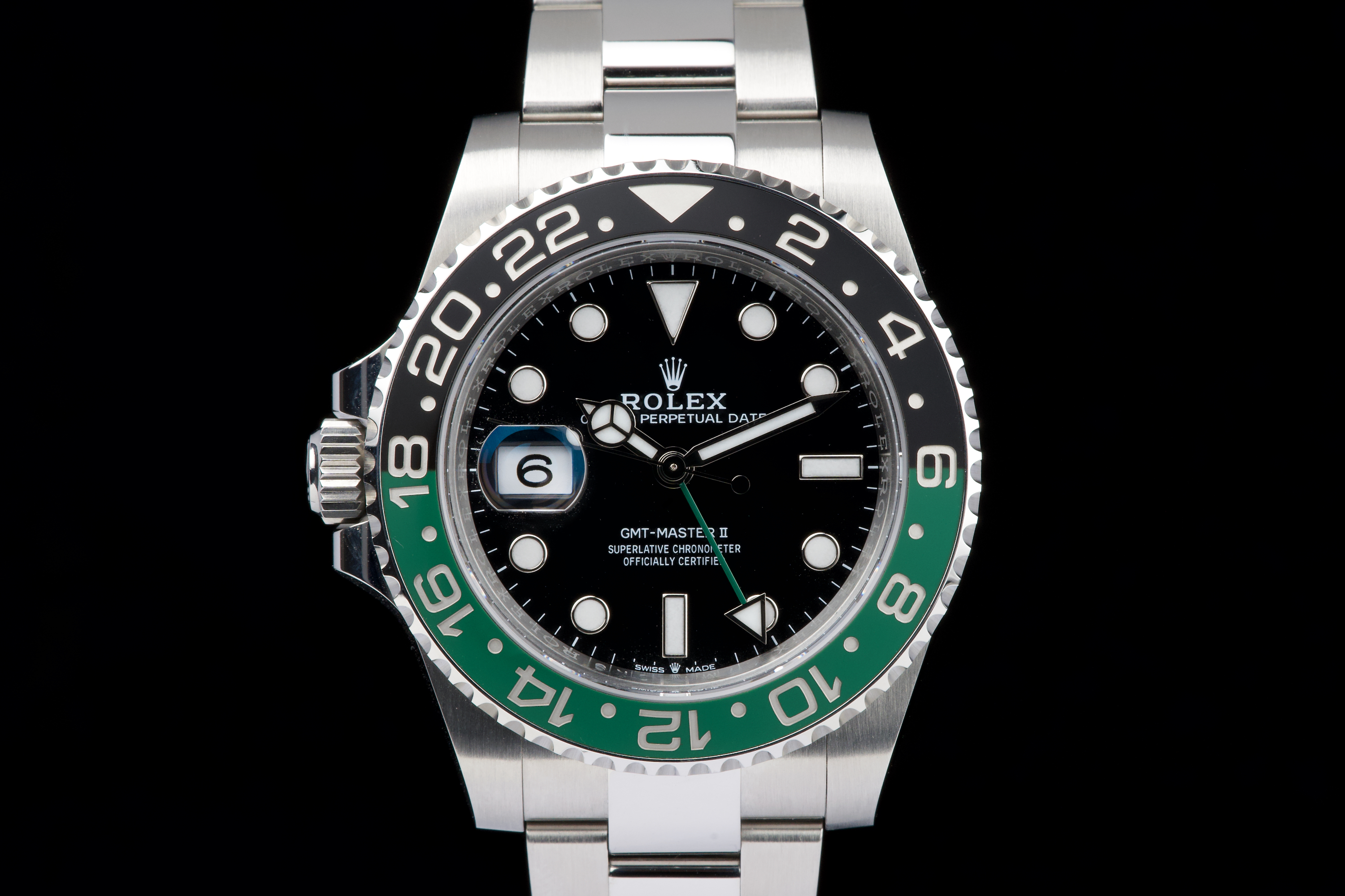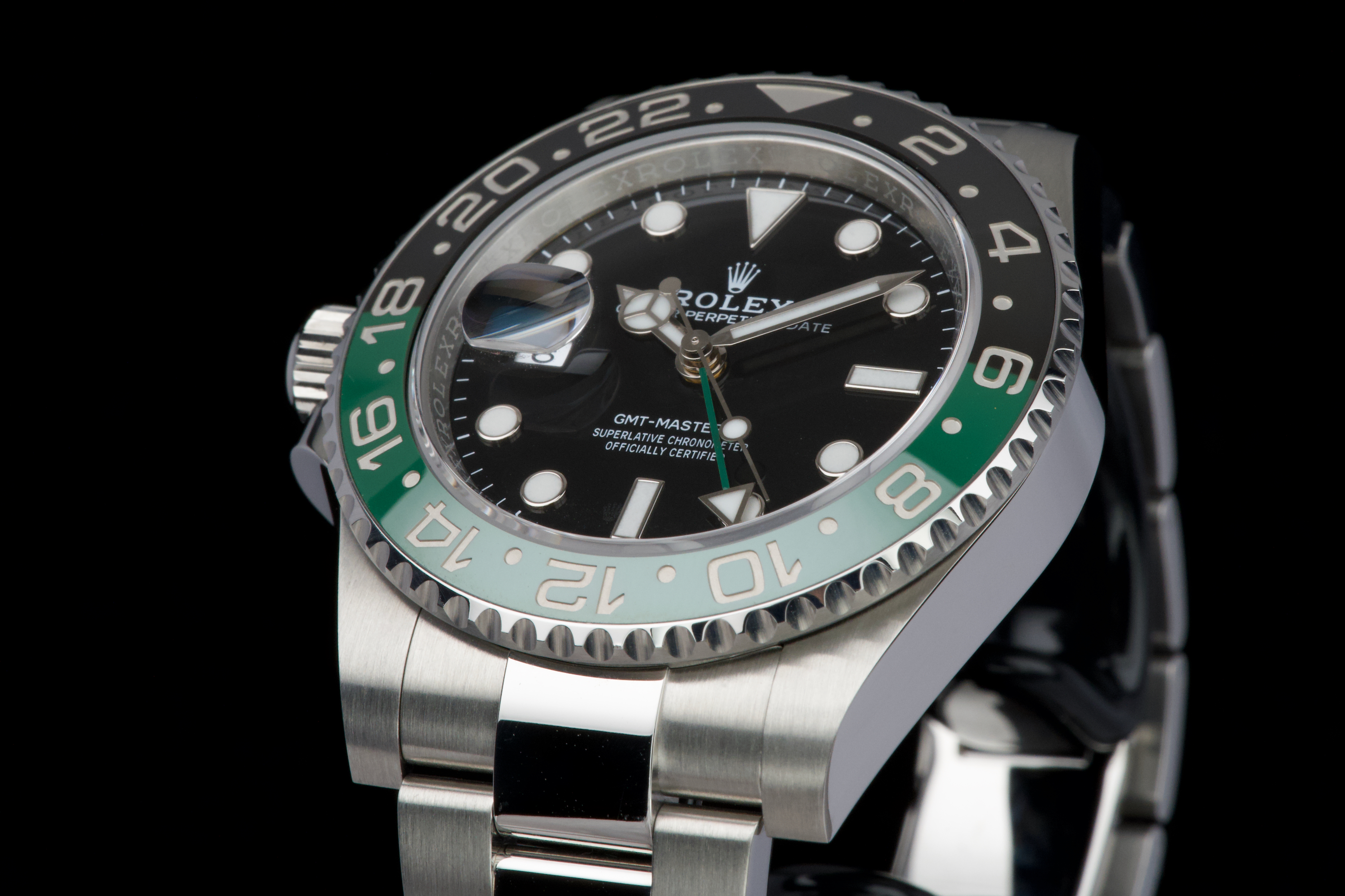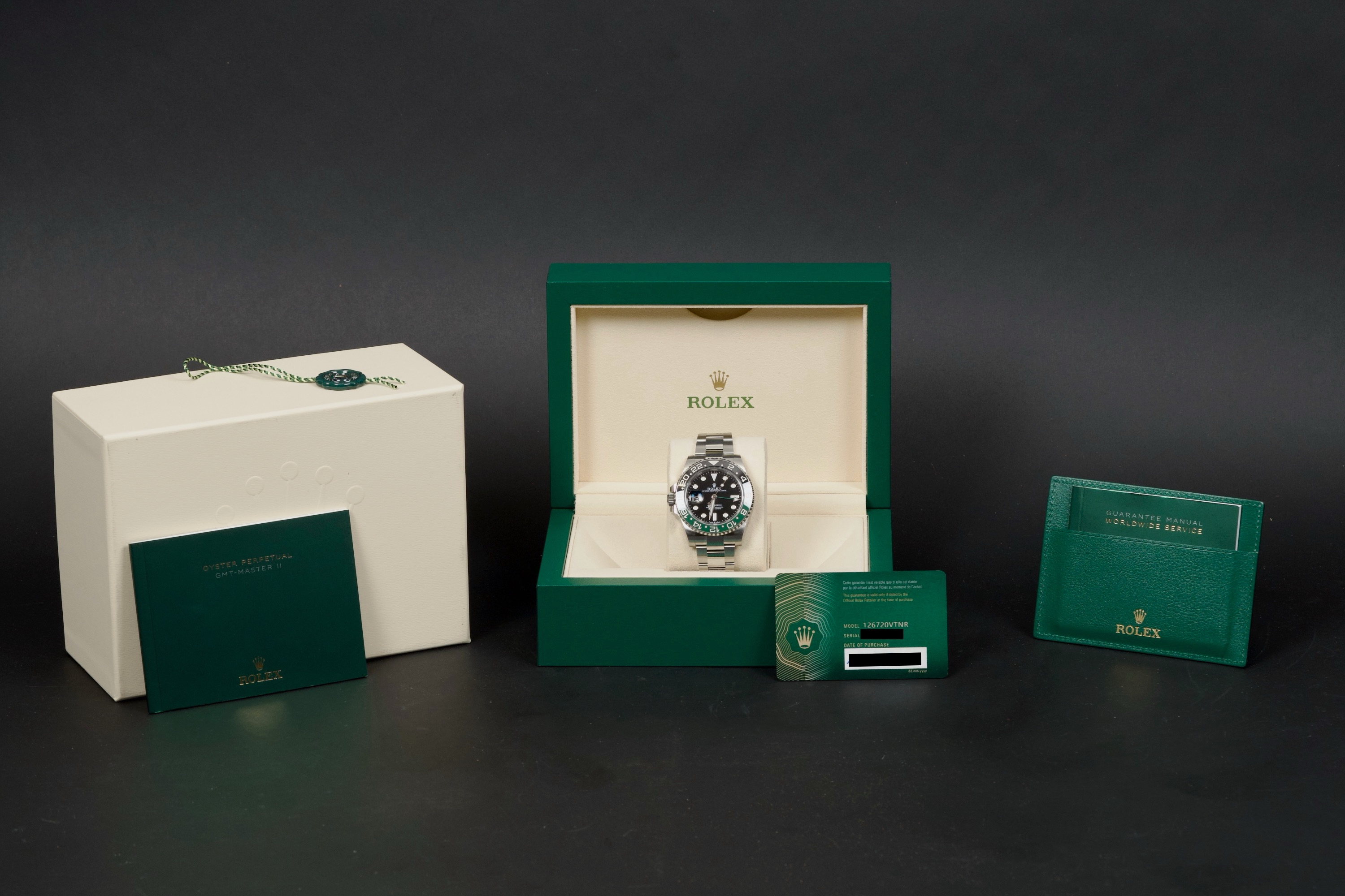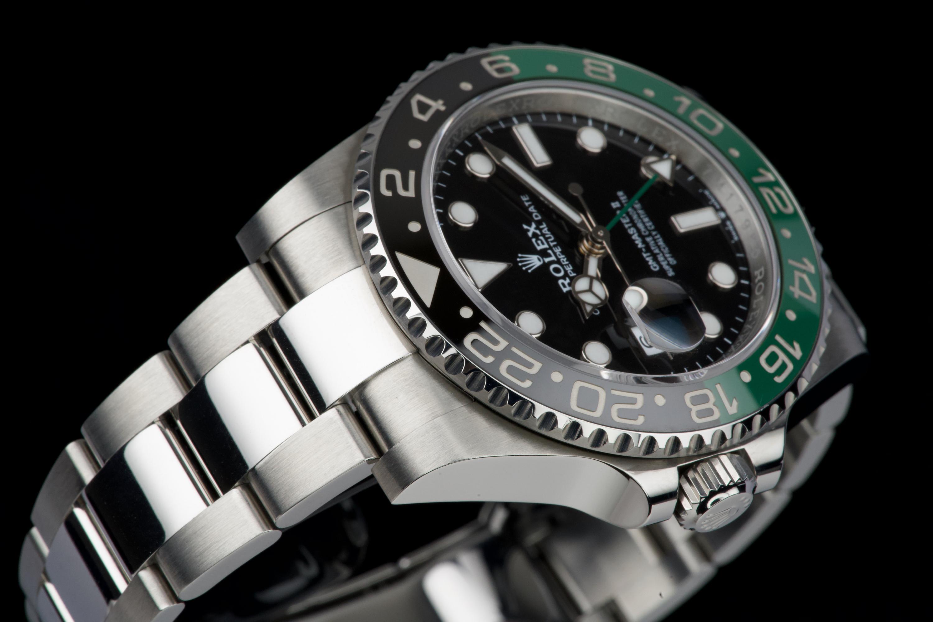 The present Rolex GMT-Master II reference 126720VTNR, offered here as a complete full set and dating to 2022, is a striking and highly sought-after modern interpretation of Rolex’s iconic travel watch. Instantly recognizable for its left-handed configuration, with the crown positioned on the left side of the case, this reference has become one of the most distinctive contemporary GMT-Master II models. The watch is fitted with its original Oyster bracelet and has just returned from polishing, presenting in excellent overall condition with clean surfaces and sharp lines throughout the case and bracelet. The black dial and black-and-green Cerachrom bezel remain flawless, offering a bold yet balanced aesthetic that defines this reference. Delivered as a full set, this GMT-Master II 126720VTNR represents an appealing opportunity to acquire a modern Rolex sports watch in outstanding condition, combining contemporary design, technical reliability, and strong collectability.