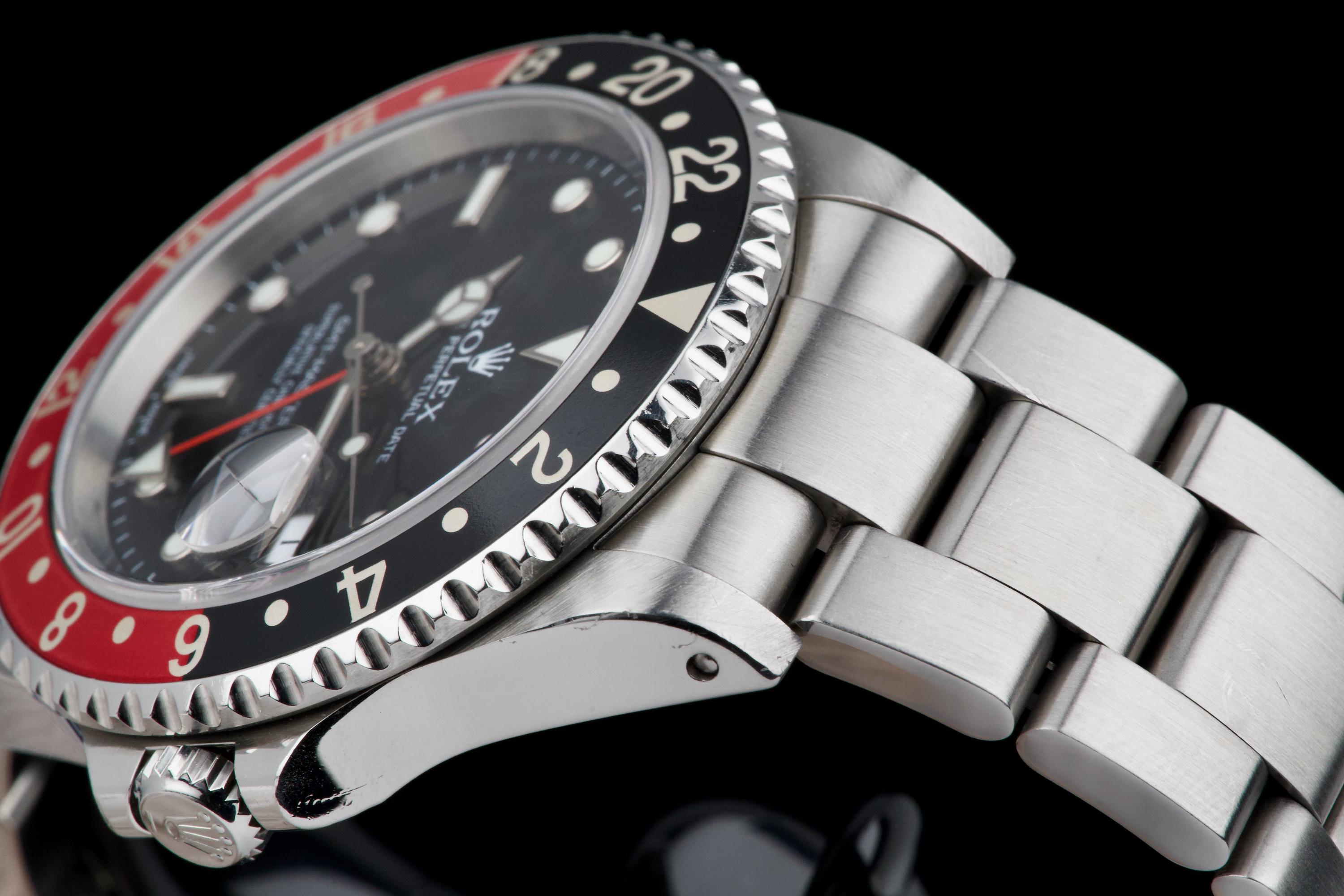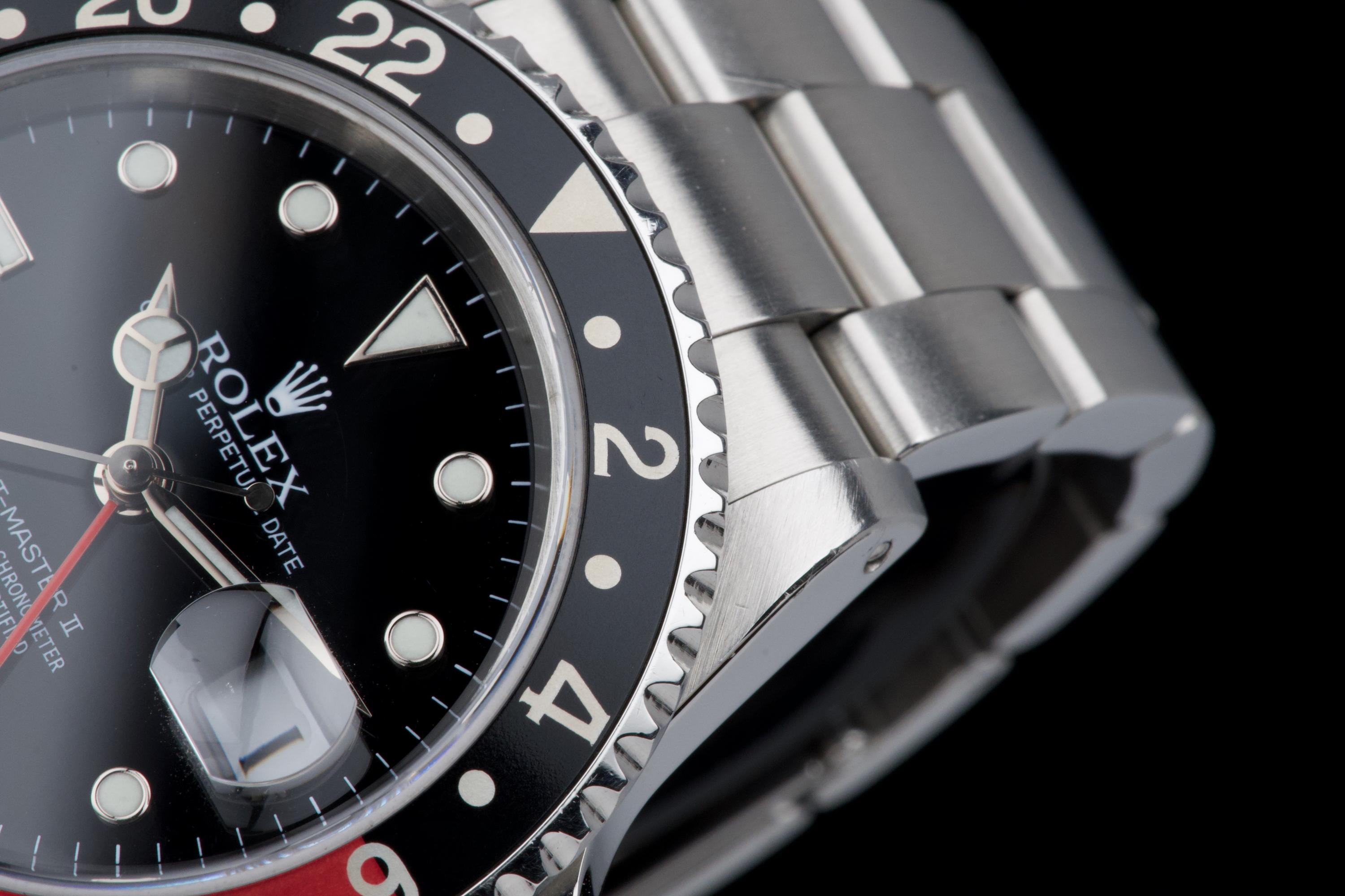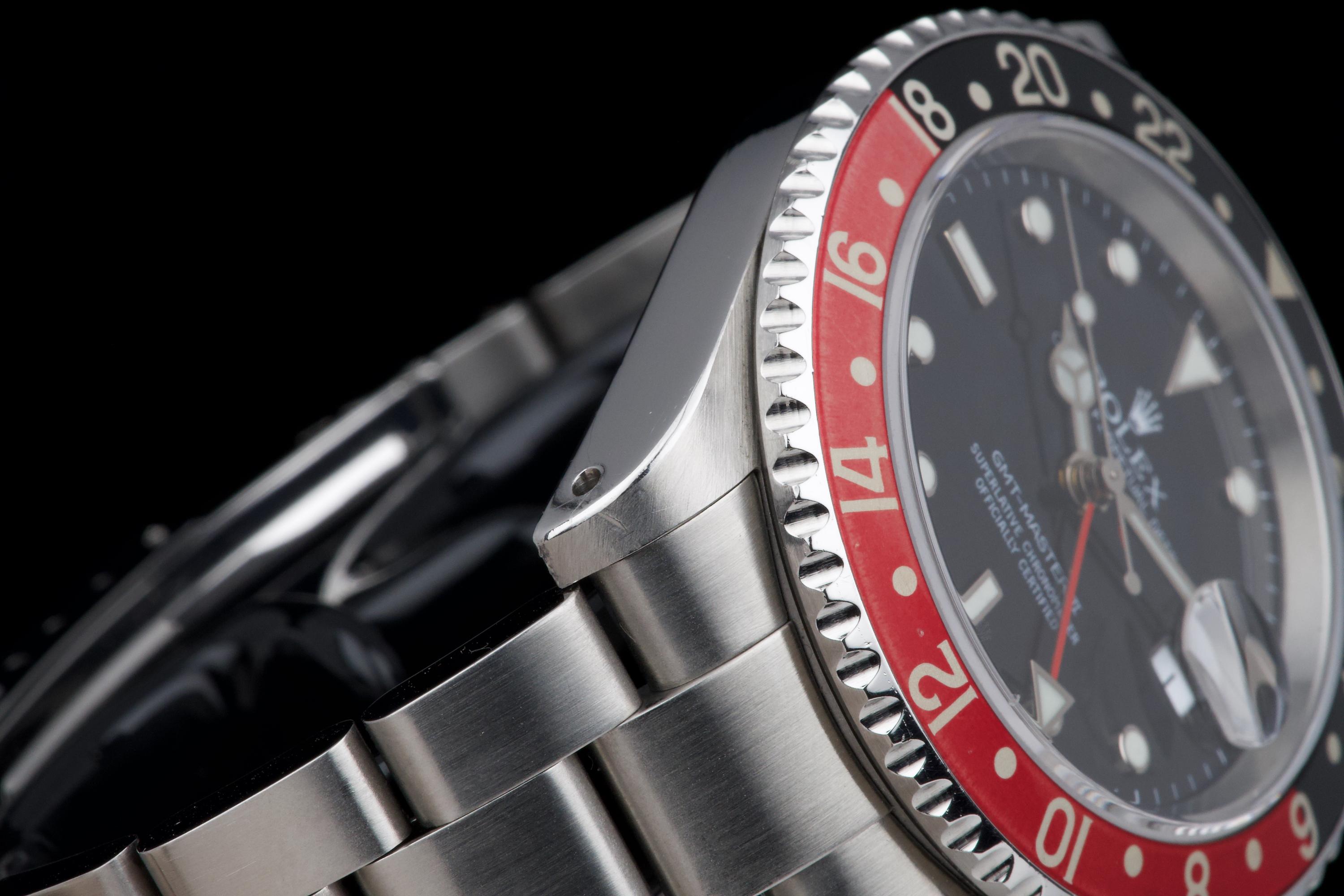 A beautiful example of the classic GMT-Master II “Coke” K Serial featuring the black dial and red/black bezel insert. The stainless steel case has been polished in the past but remains thick with strong proportions. It shows light wear with a few minor scratches and dings, nothing out of the ordinary for a watch of this age. The glossy black luminova dial is in perfect condition with matching hands. The steel bezel is excellent, and the original serif “Coke” insert shows a pleasing light fade, giving it a very attractive vintage look. The original Oyster bracelet 78790A with solid end-links (claspcode DT7) shows minimal stretch and remains tight and crisp. The movement has just been fully serviced and authenticated by our watchmaker. The watch is offered without its original box and papers. A strong example of the now discontinued GMT-Master II 16710 “Coke,” combining a clean case, excellent dial, and a beautiful lightly faded insert — a highly collectible modern classic.