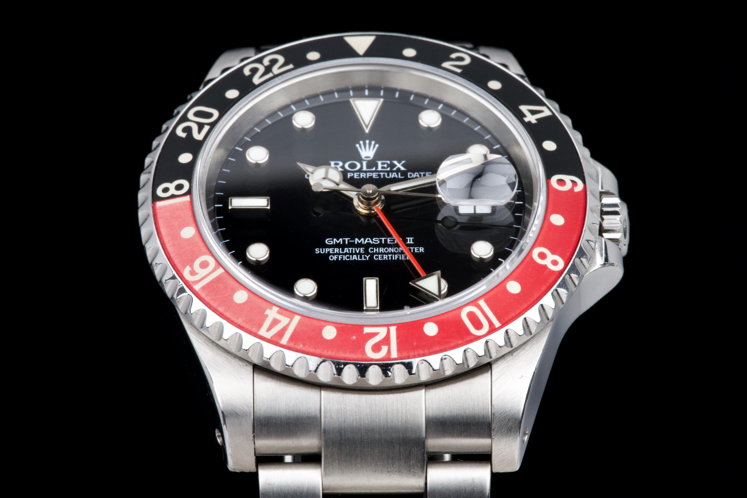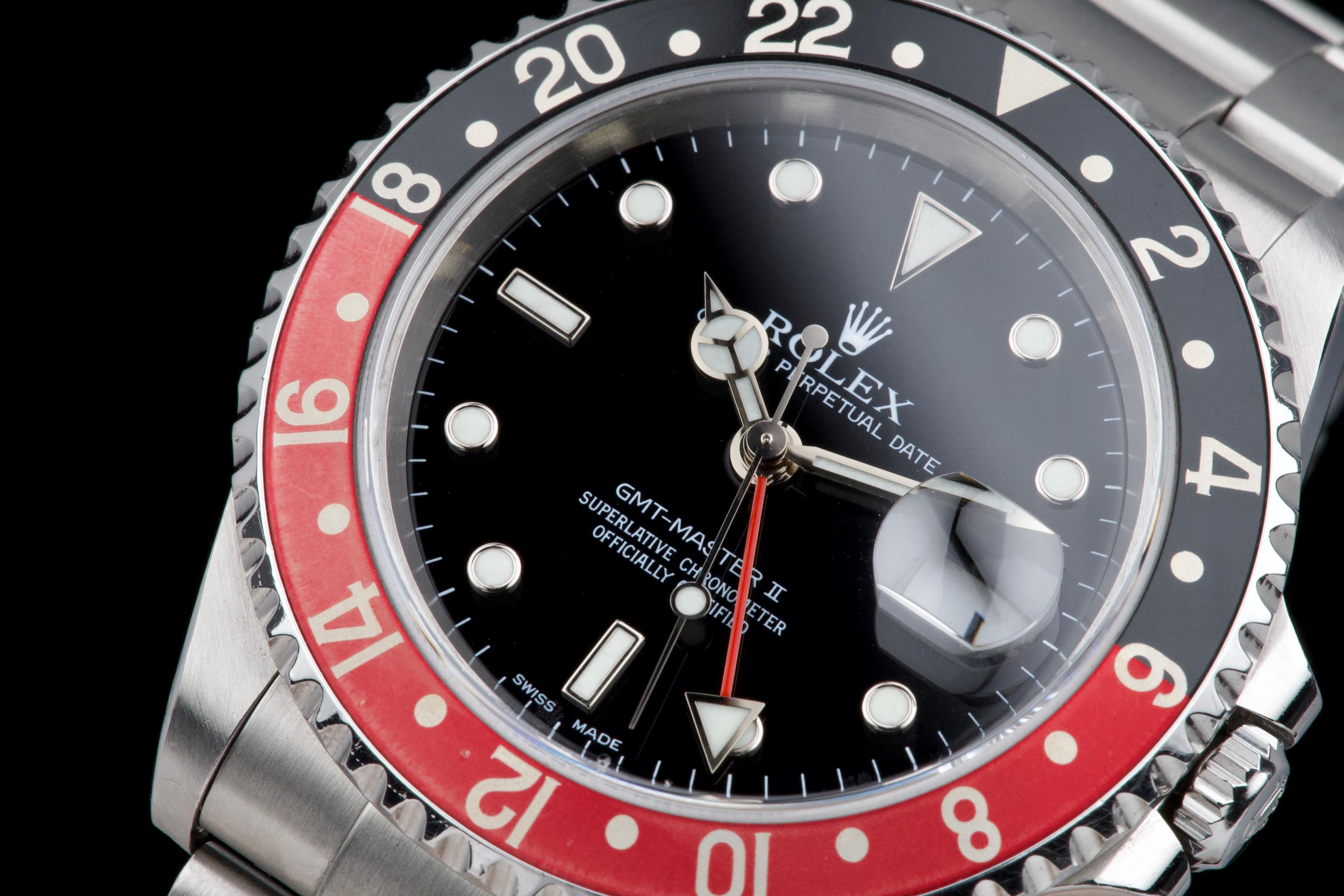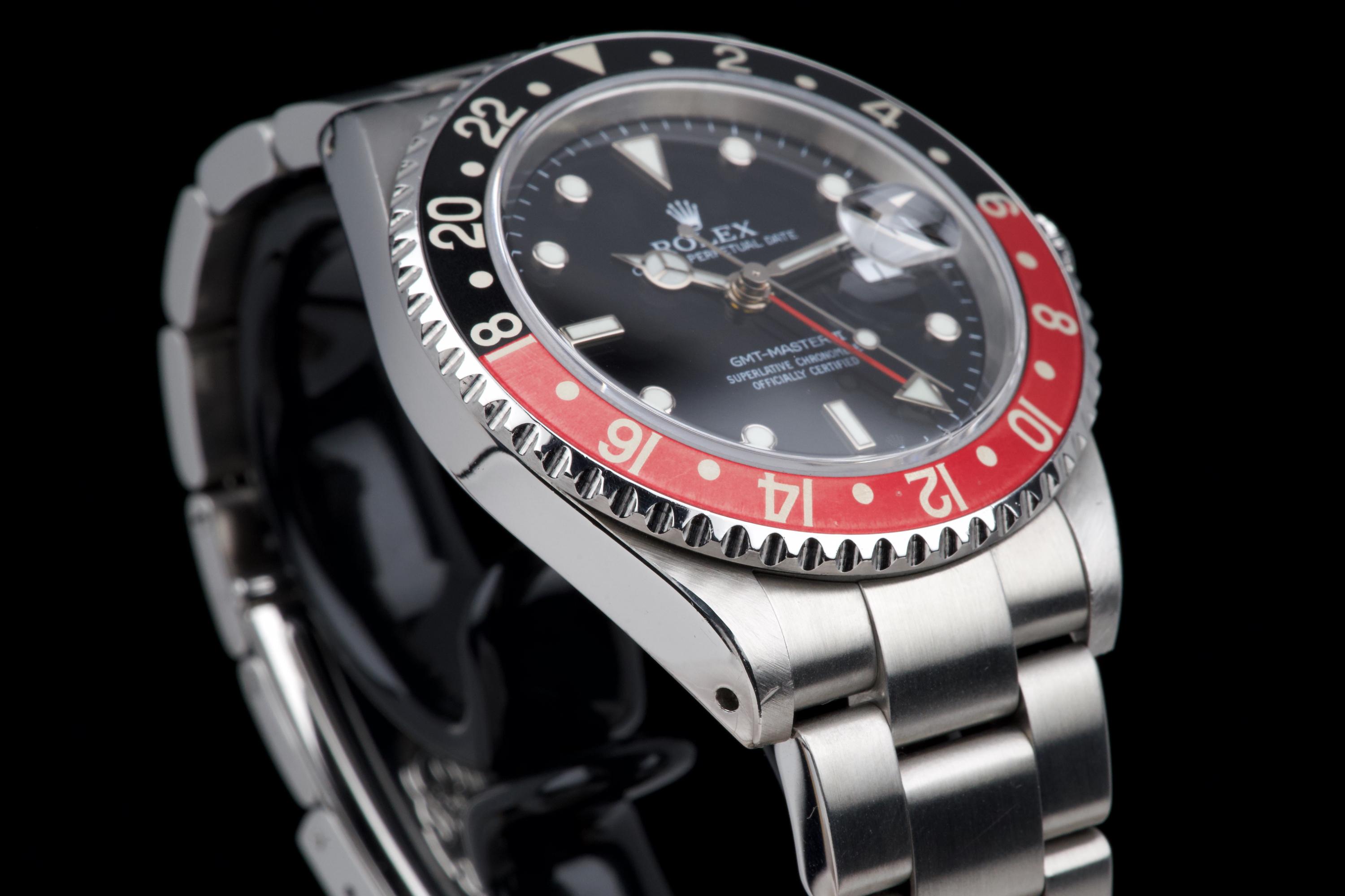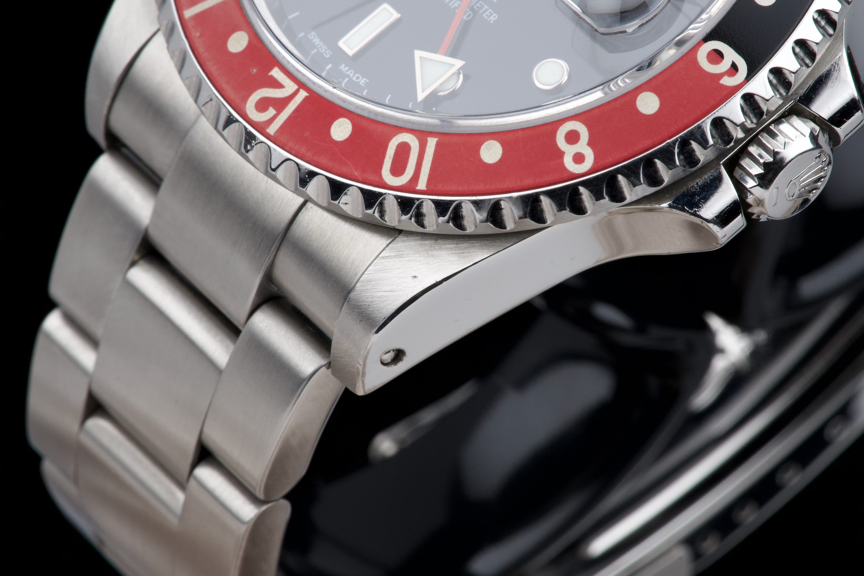 A beautiful example of the classic GMT-Master II “Coke” K Serial featuring the black dial and red/black bezel insert. The stainless steel case has been polished in the past but remains thick with strong proportions. It shows light wear with a few minor scratches and dings, nothing out of the ordinary for a watch of this age. The glossy black luminova dial is in perfect condition with matching hands. The steel bezel is excellent, and the original serif “Coke” insert shows a pleasing light fade, giving it a very attractive vintage look. The original Oyster bracelet 78790A with solid end-links (claspcode DT7) shows minimal stretch and remains tight and crisp. The movement has just been fully serviced and authenticated by our watchmaker. The watch is offered without its original box and papers. A strong example of the now discontinued GMT-Master II 16710 “Coke,” combining a clean case, excellent dial, and a beautiful lightly faded insert — a highly collectible modern classic.