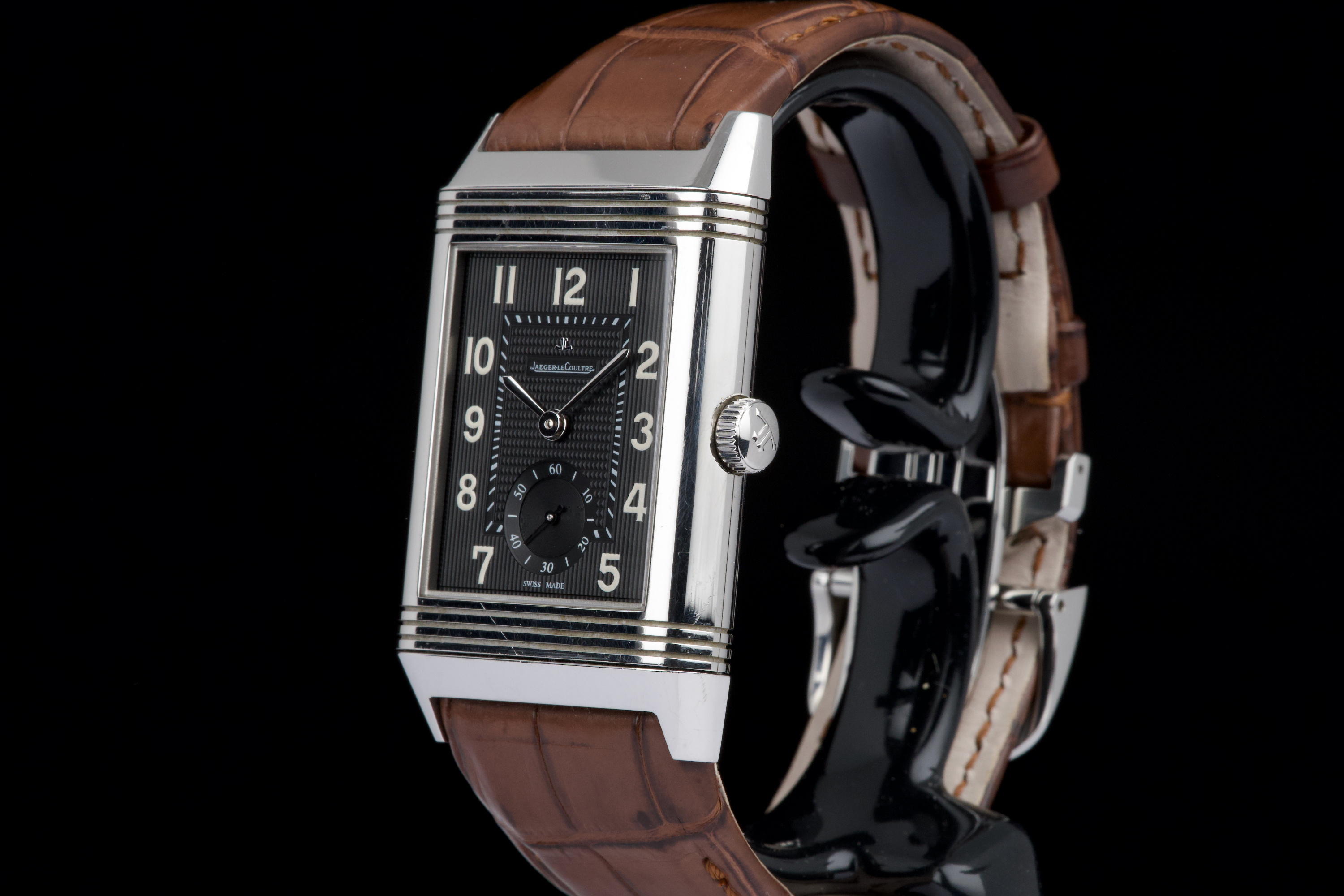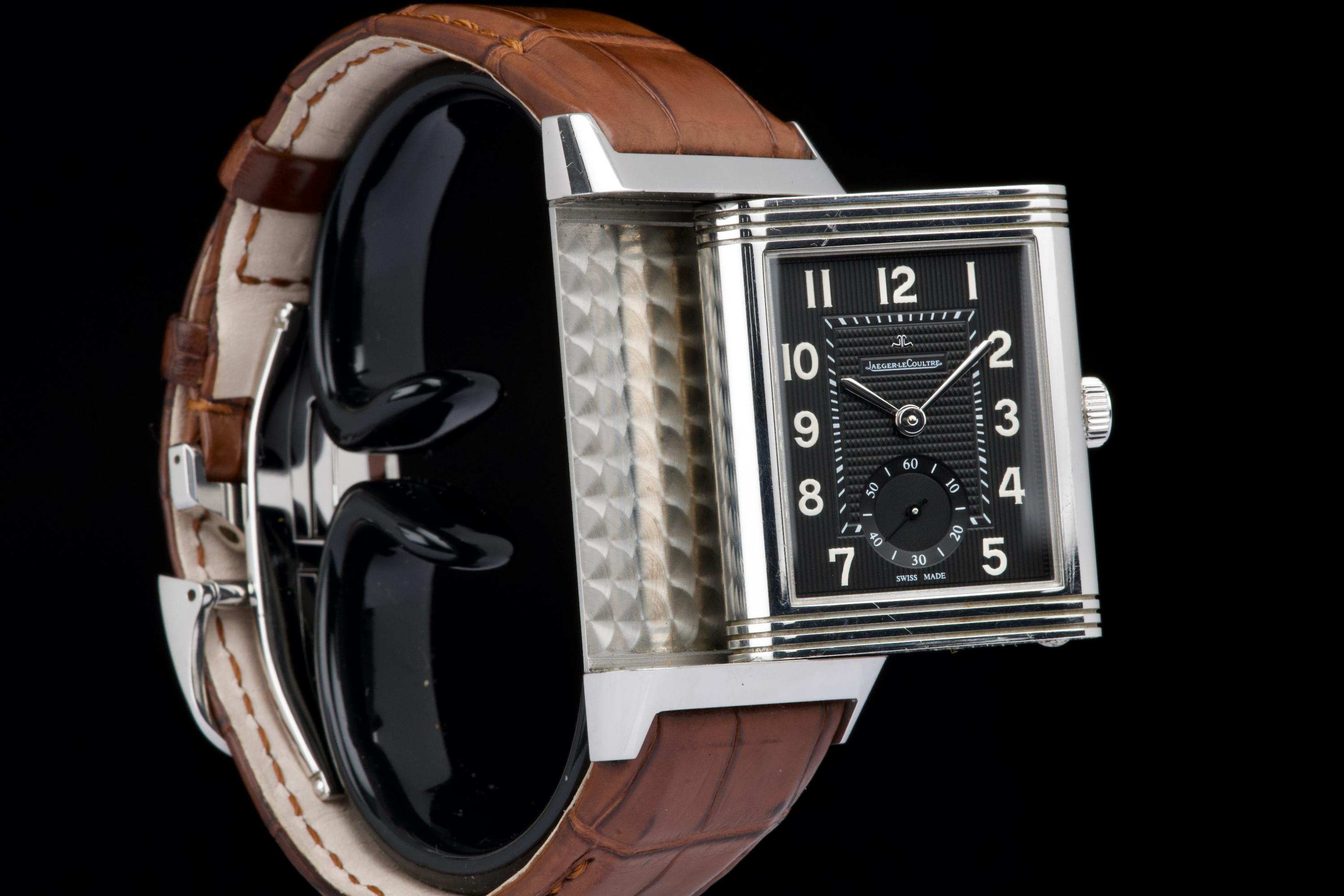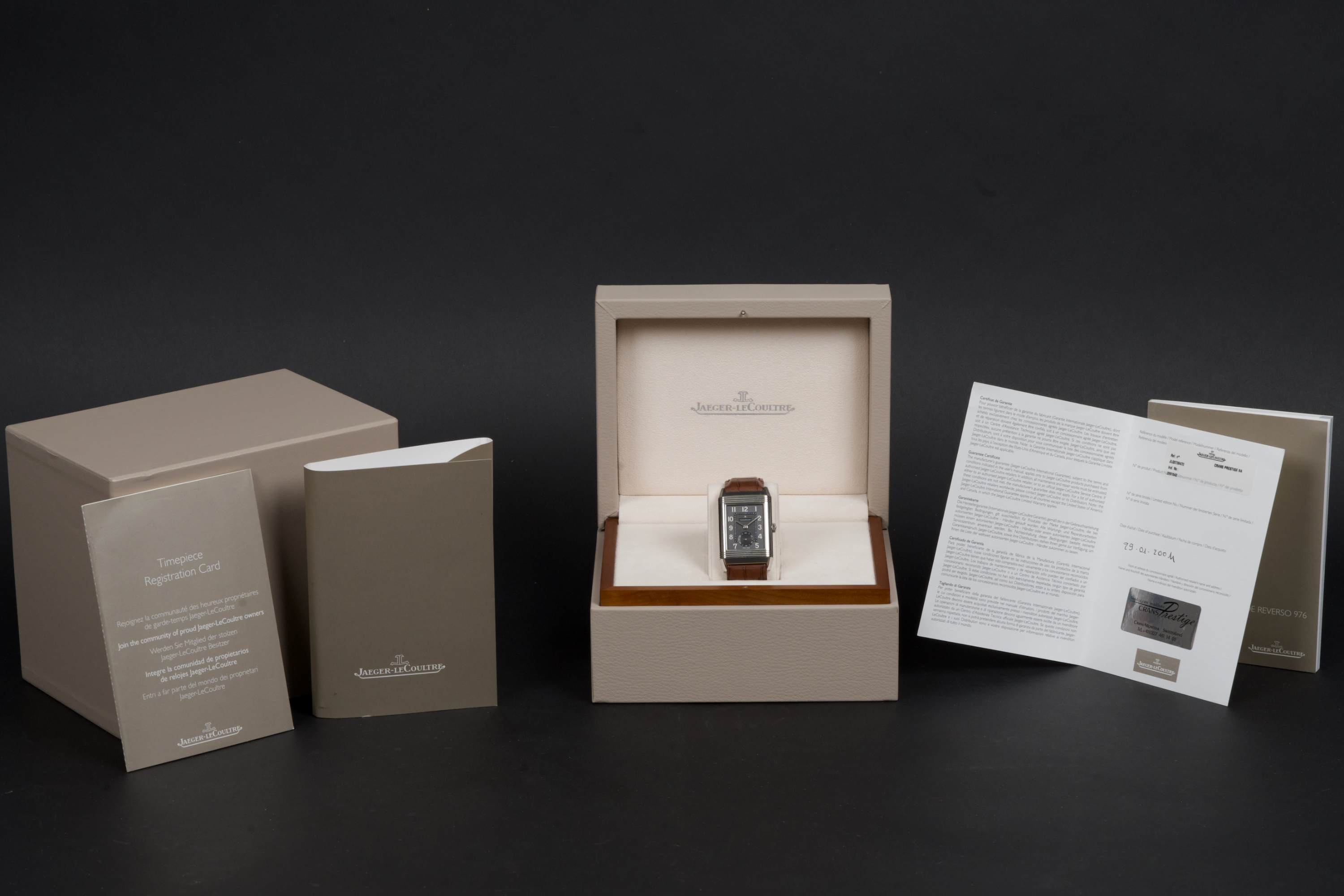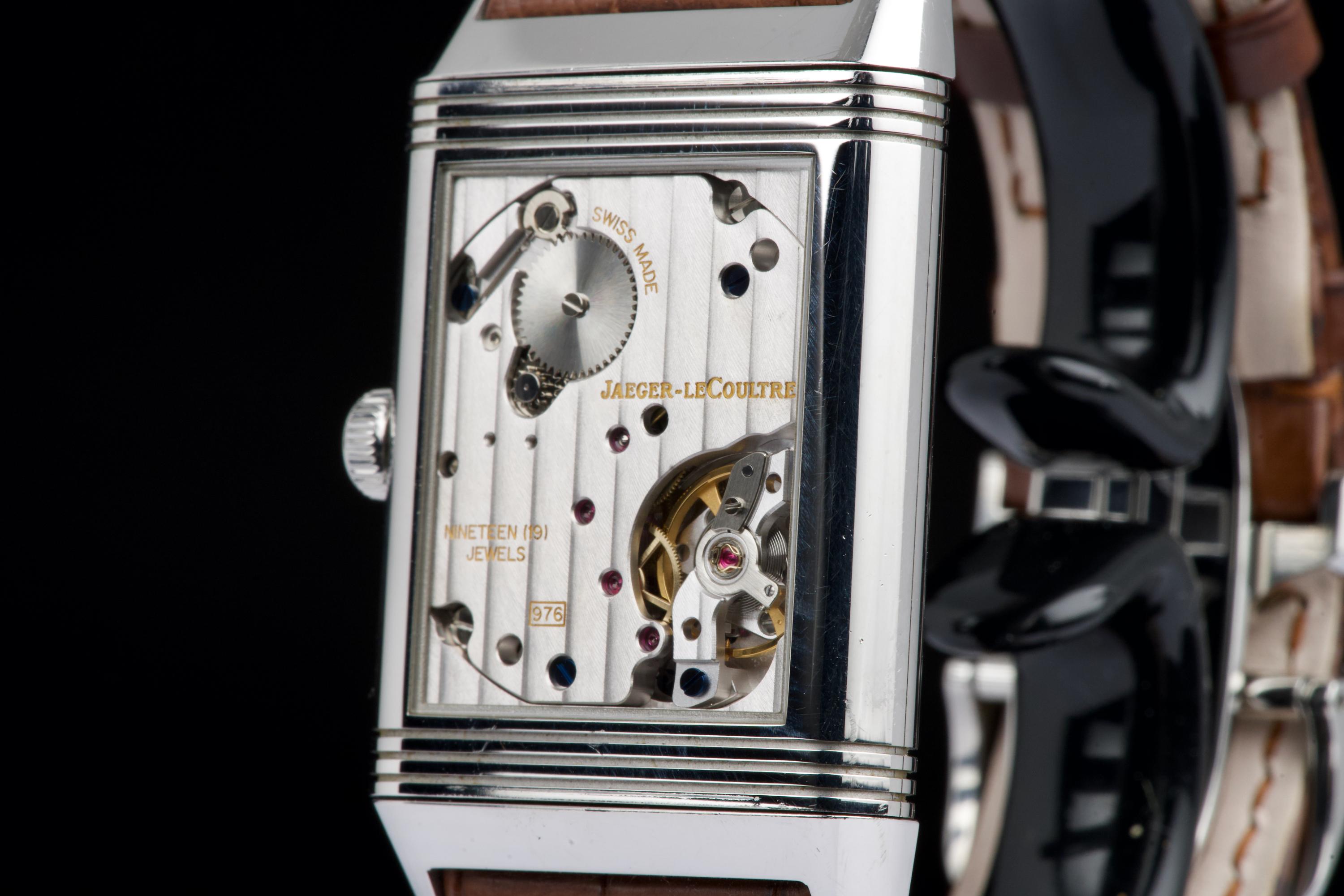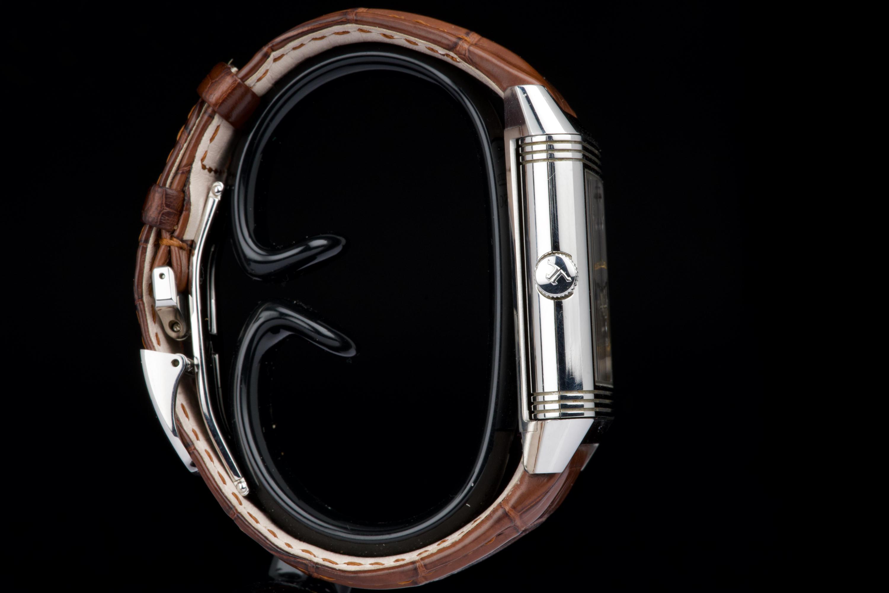 This Jaeger-LeCoultre Grande Reverso 976 features a sleek black dial housed in the iconic reversible stainless steel case. Measuring 30mm x 48.5mm, it offers a strong wrist presence while maintaining the timeless elegance of the Reverso line. Powered by the manually wound JLC Calibre 976, visible through the sapphire caseback. Originally sold in 2011 and coming from the original owner, the watch is unpolished and shows only light wear from careful use. The black alligator strap is in excellent condition. It comes with its original box and papers. No service history, but the movement is running perfectly.
