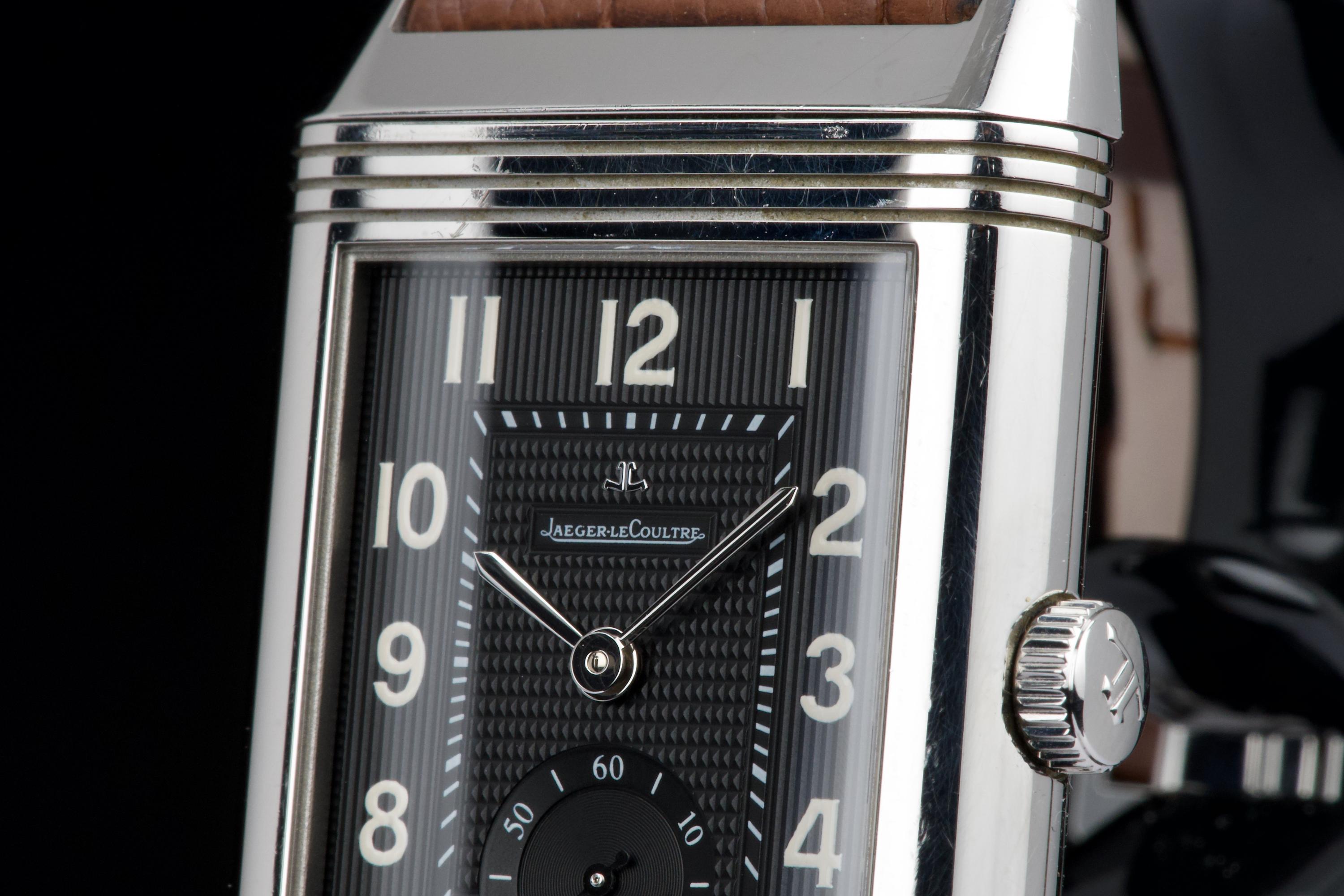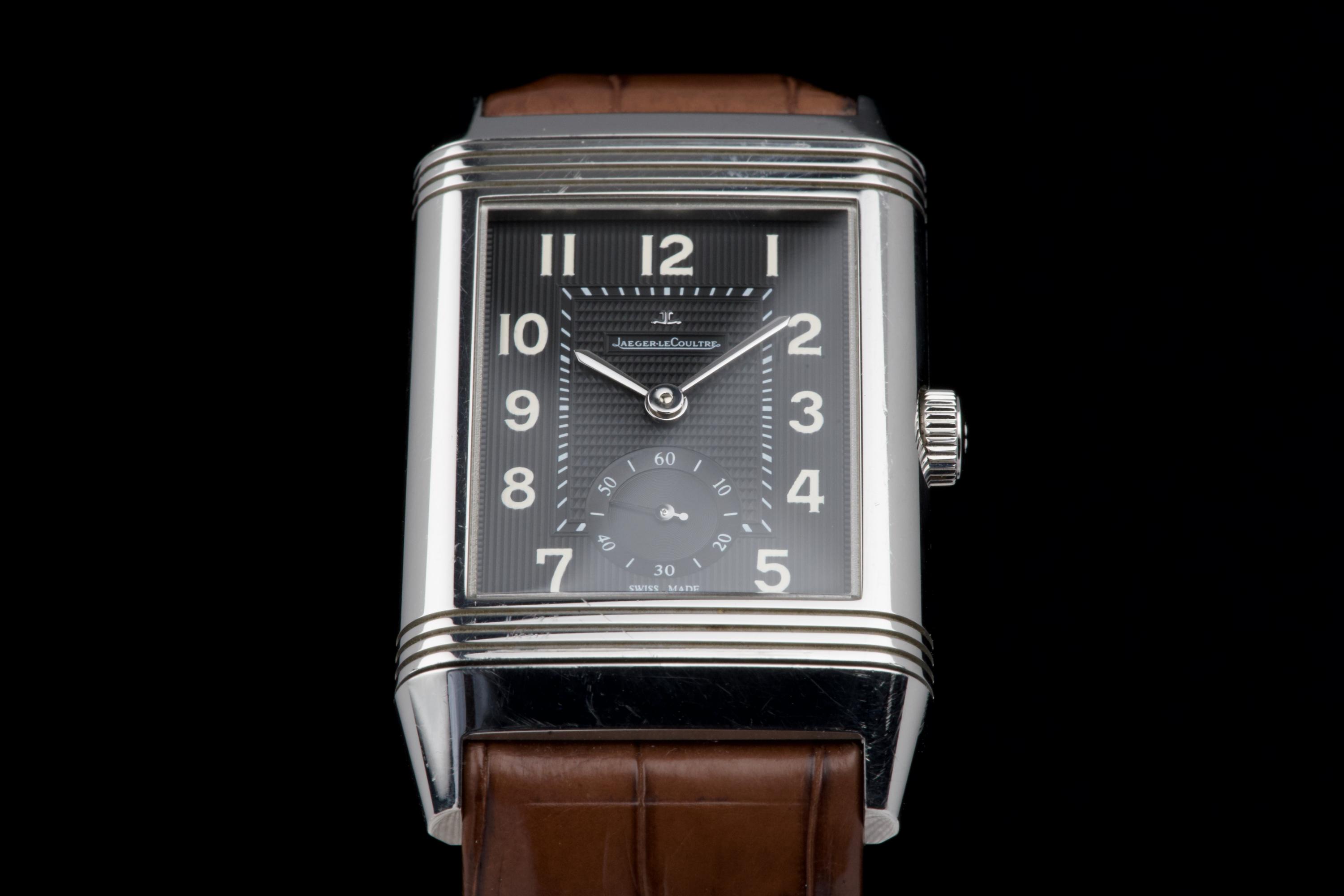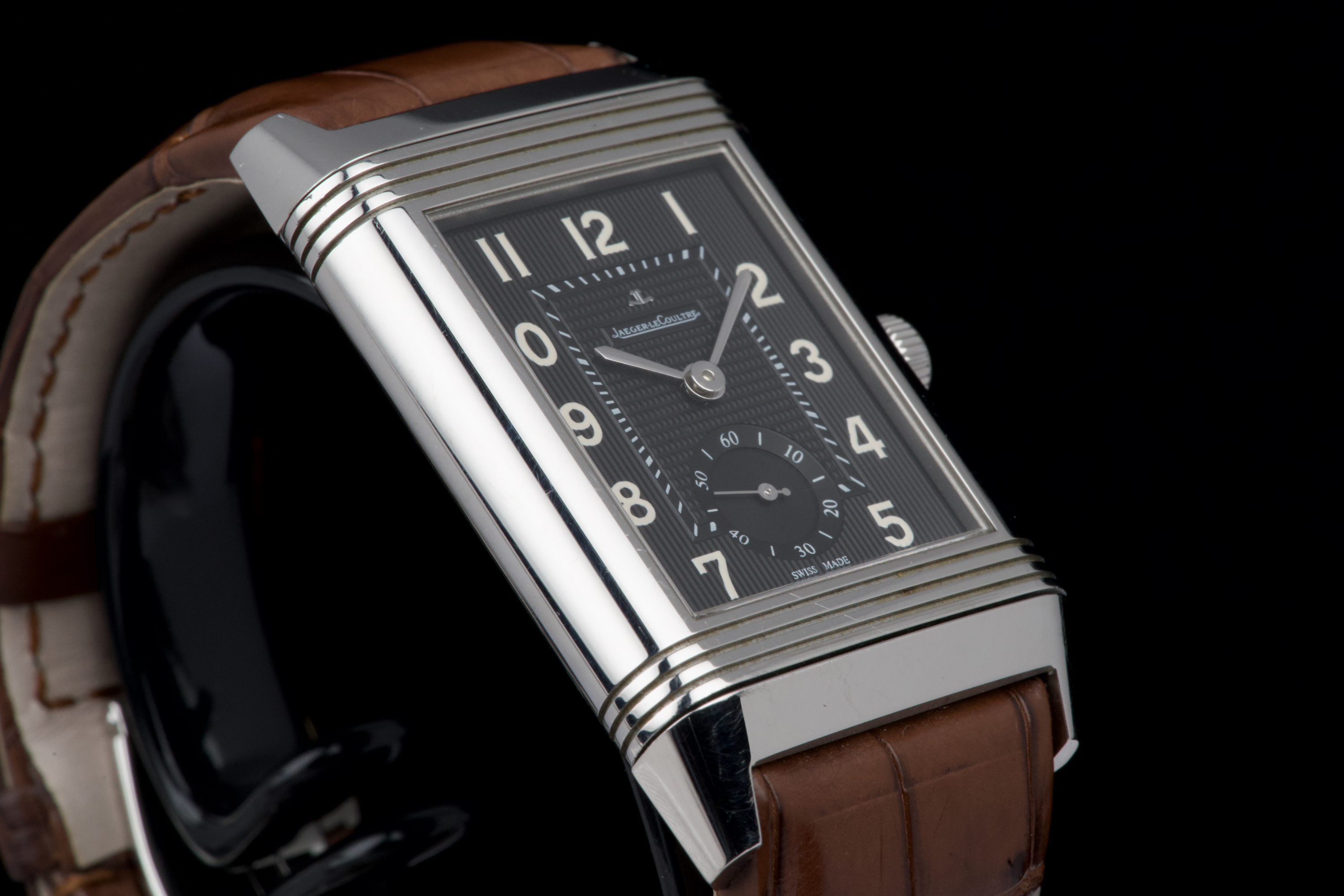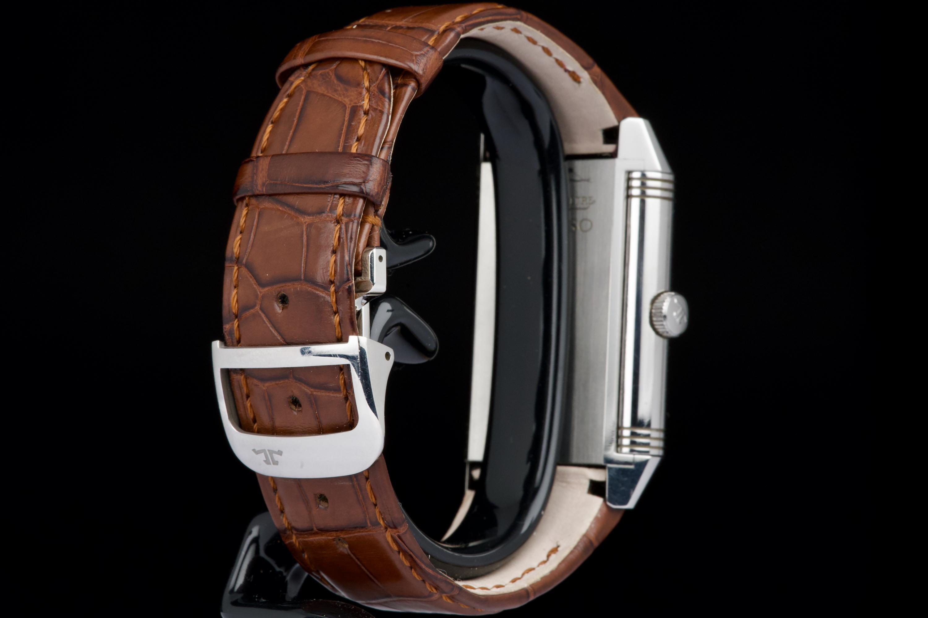 This Jaeger-LeCoultre Grande Reverso 976 features a sleek black dial housed in the iconic reversible stainless steel case. Measuring 30mm x 48.5mm, it offers a strong wrist presence while maintaining the timeless elegance of the Reverso line. Powered by the manually wound JLC Calibre 976, visible through the sapphire caseback. Originally sold in 2011 and coming from the original owner, the watch is unpolished and shows only light wear from careful use. The black alligator strap is in excellent condition. It comes with its original box and papers. No service history, but the movement is running perfectly.