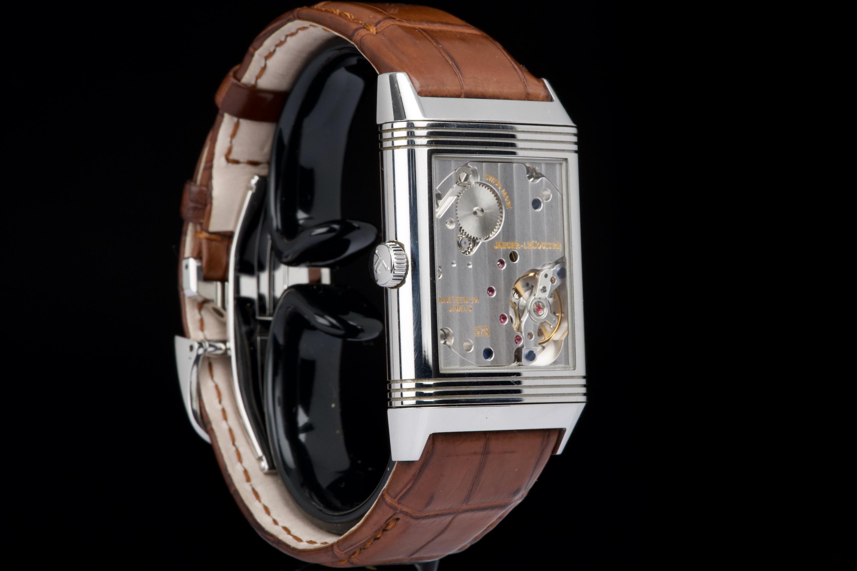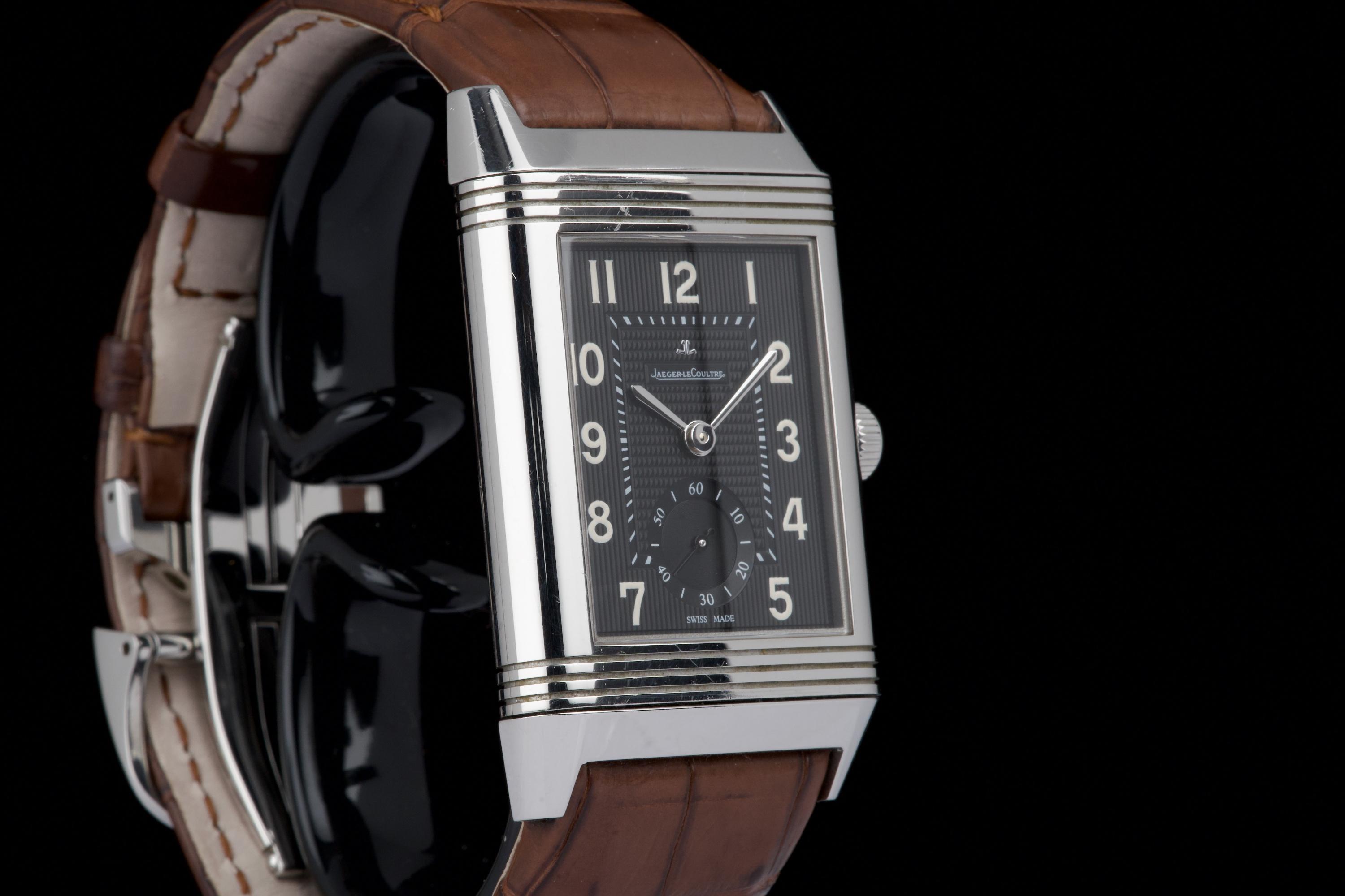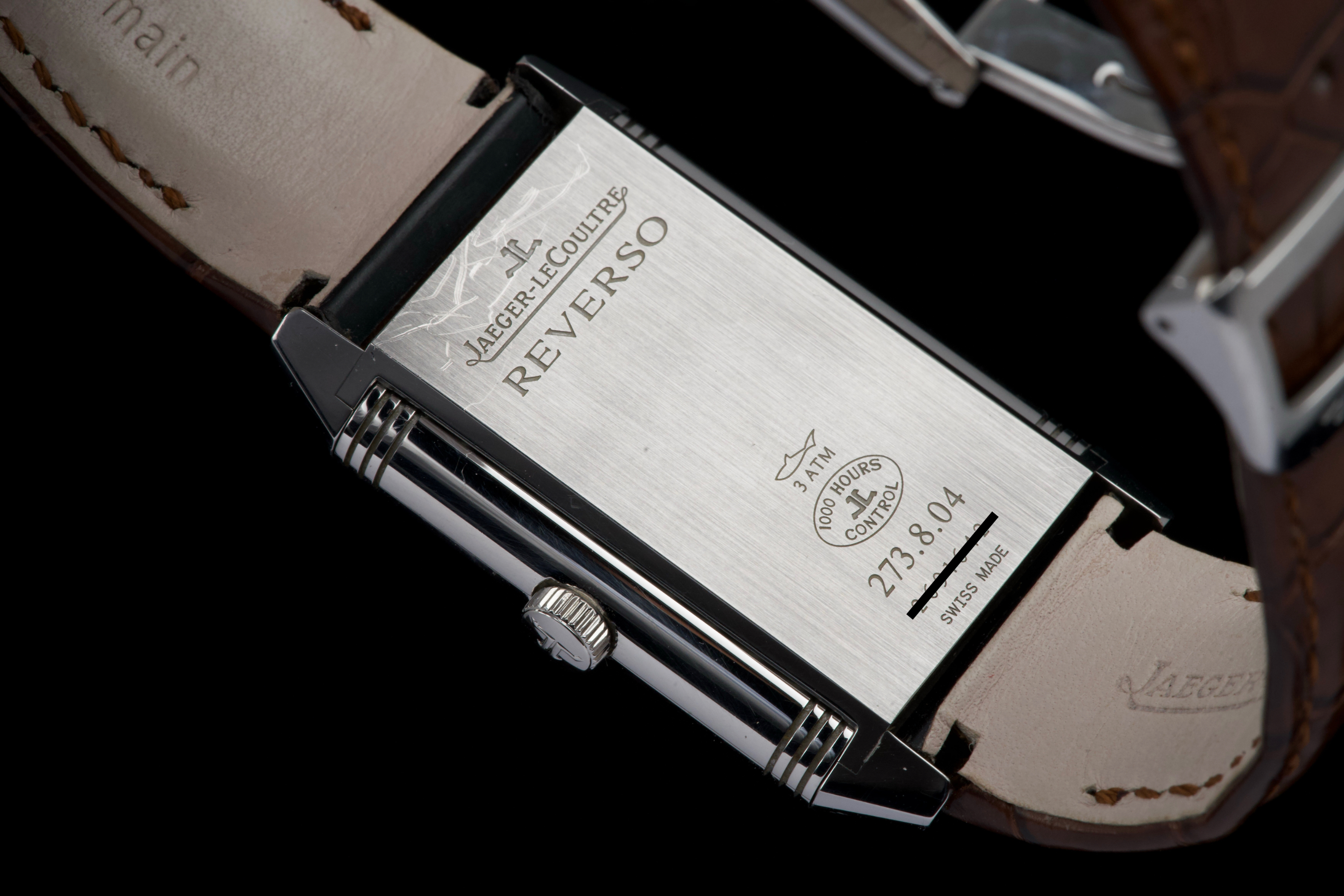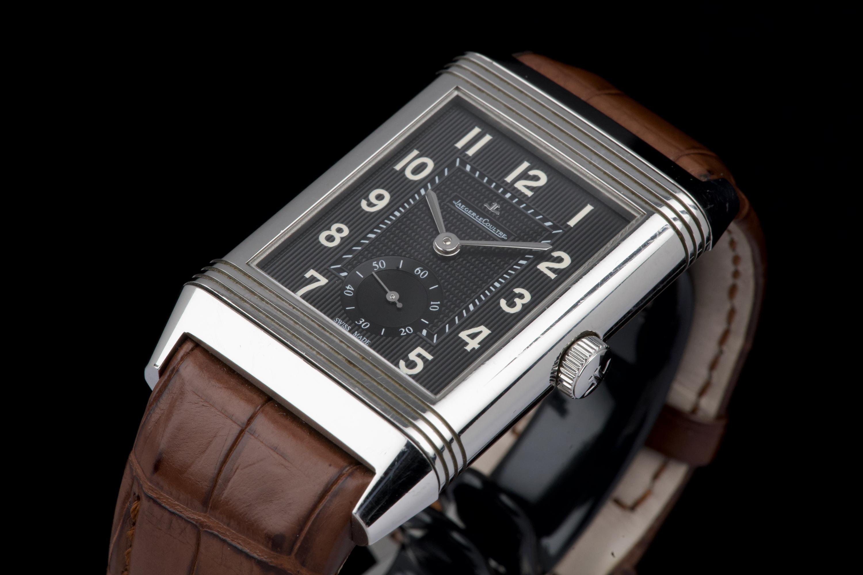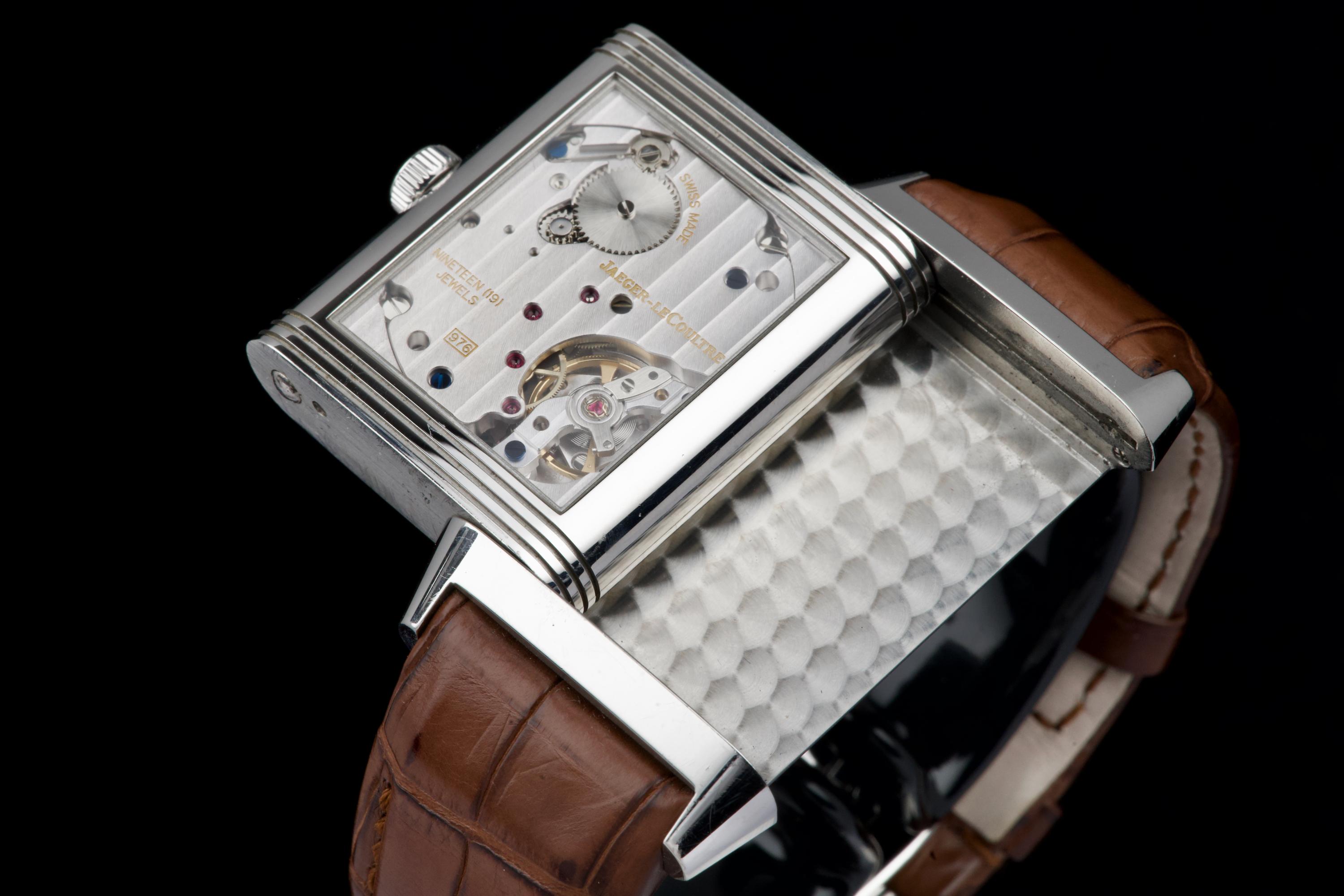 This Jaeger-LeCoultre Grande Reverso 976 features a sleek black dial housed in the iconic reversible stainless steel case. Measuring 30mm x 48.5mm, it offers a strong wrist presence while maintaining the timeless elegance of the Reverso line. Powered by the manually wound JLC Calibre 976, visible through the sapphire caseback. Originally sold in 2011 and coming from the original owner, the watch is unpolished and shows only light wear from careful use. The black alligator strap is in excellent condition. It comes with its original box and papers. No service history, but the movement is running perfectly.