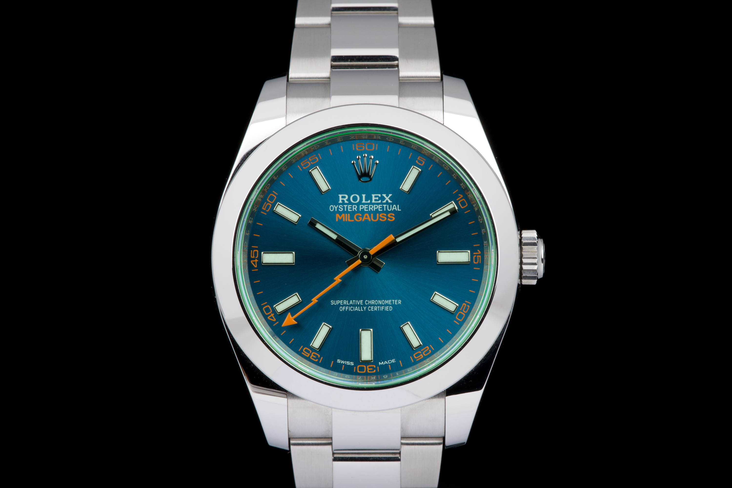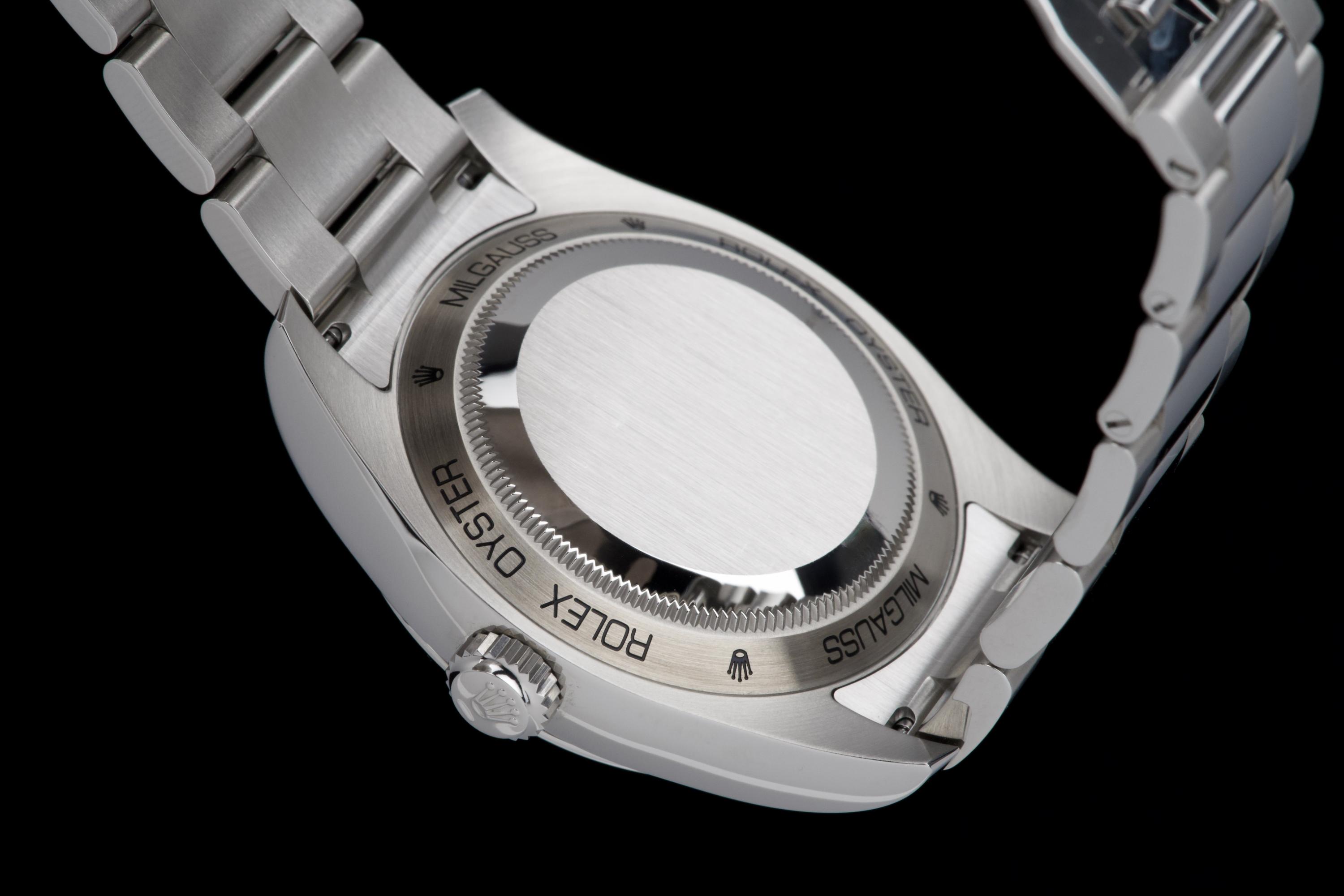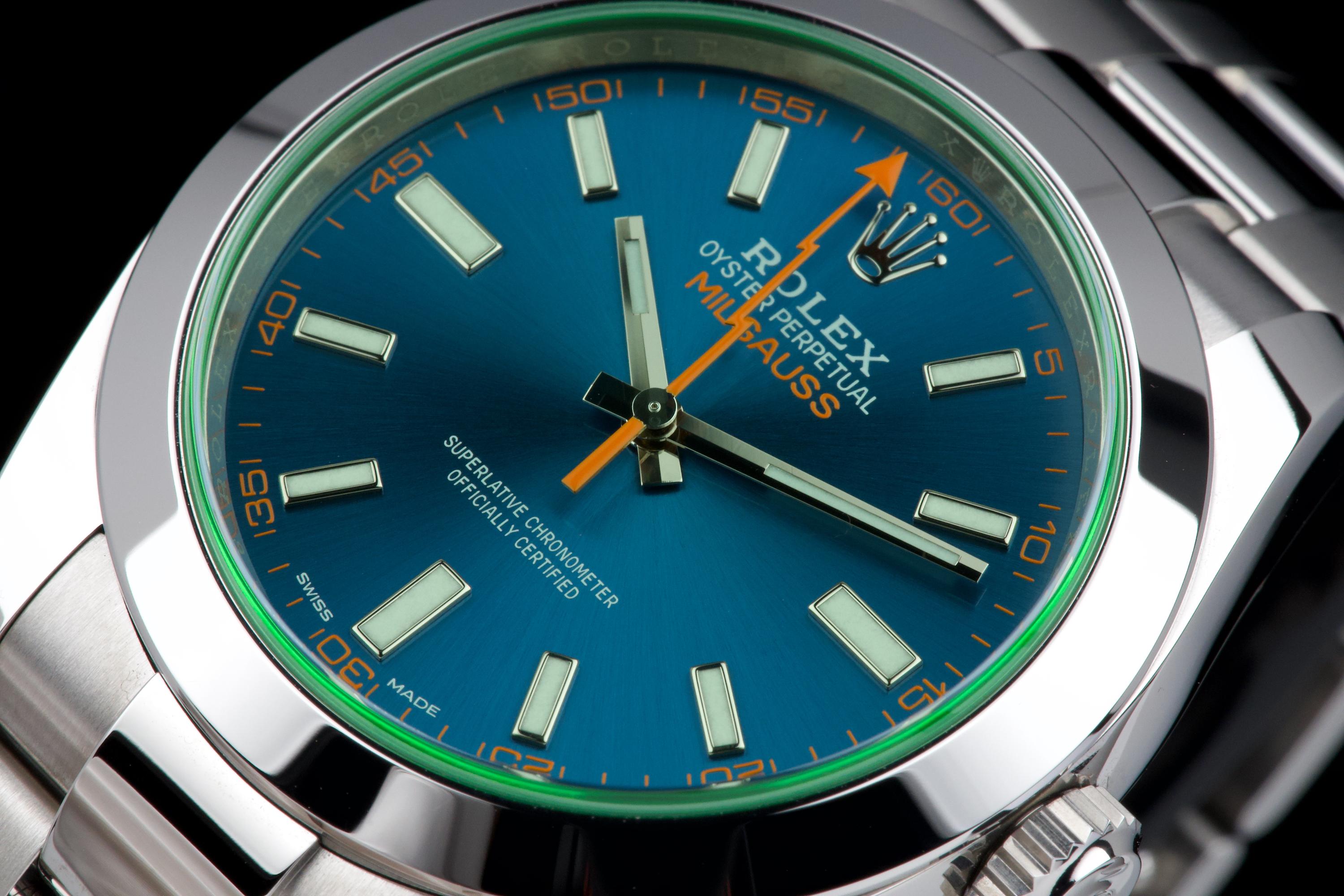 An unworn example of the Rolex Milgauss 116400GV, featuring the striking Z-Blue sunburst dial under the signature green sapphire crystal. The 40 mm stainless steel case remains in factory condition, with no signs of wear. Powered by the Rolex caliber 3131, specifically engineered for anti-magnetic resistance, combining precision and durability. Complete with its original box, 2022 warranty card, booklets, and accessories. A perfect collector-grade example of the now discontinued Milgauss 116400GV.