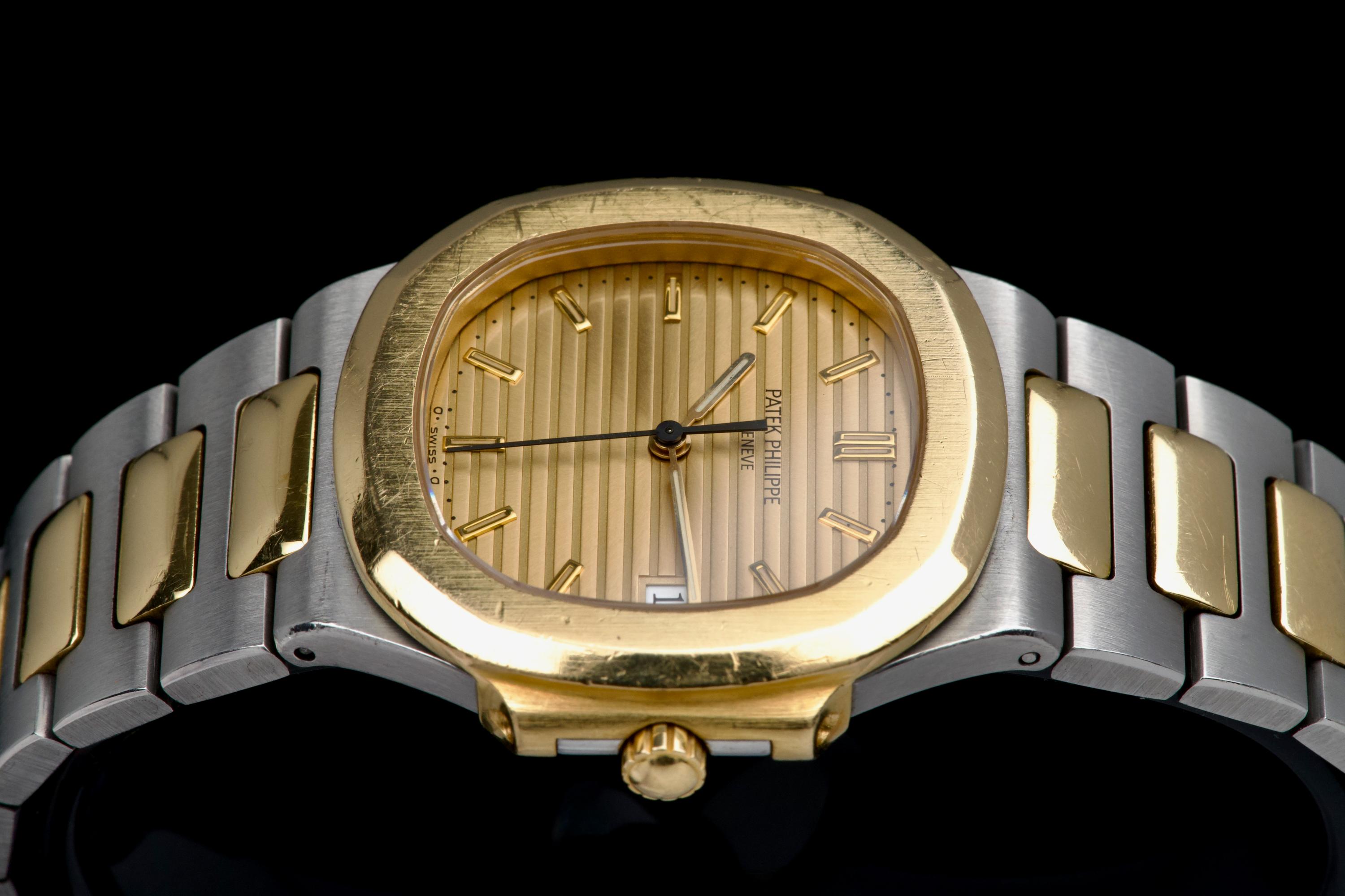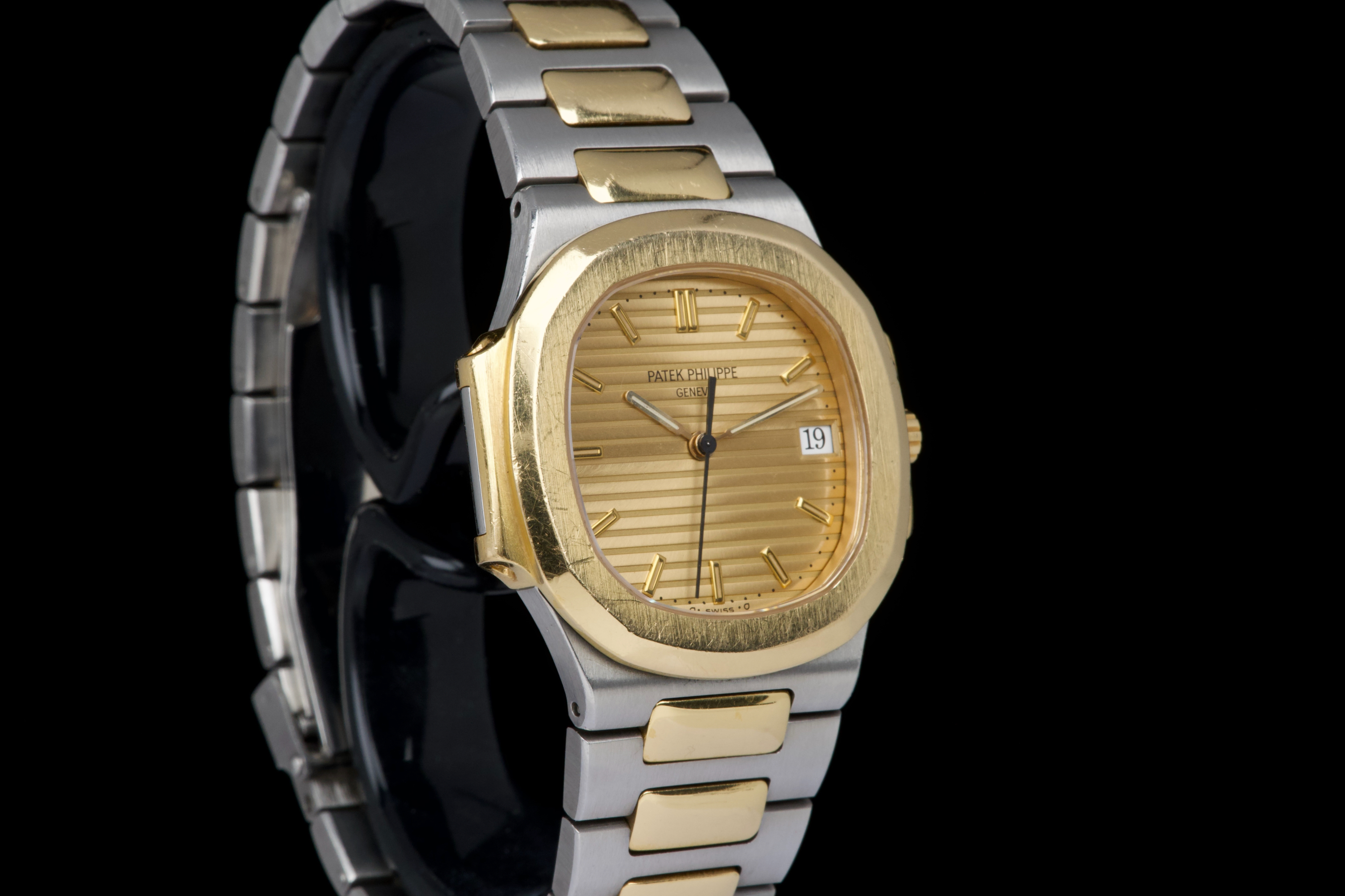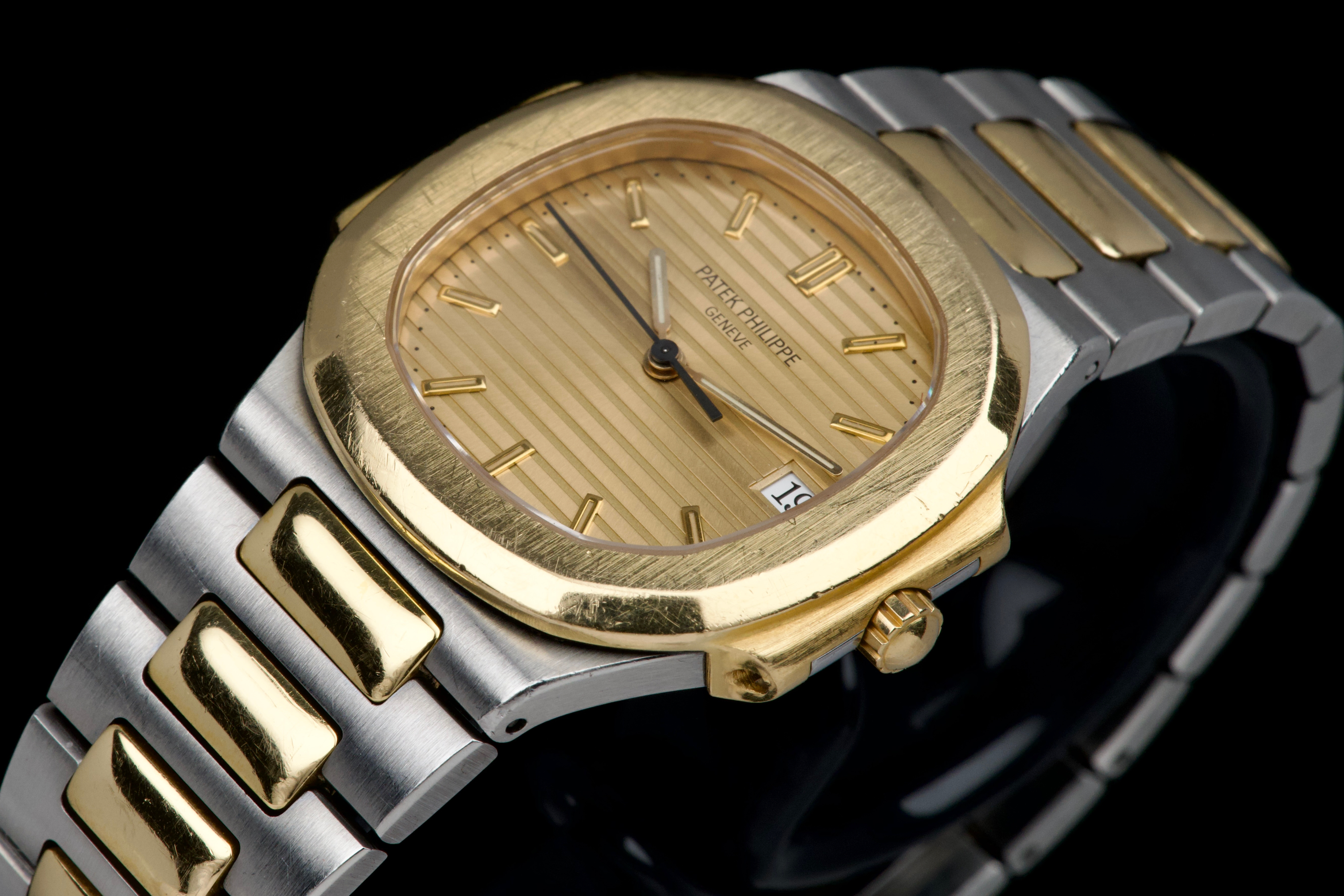 The present Patek Philippe Nautilus reference 3900, measuring 33 mm and executed in two-tone stainless steel and yellow gold, dates from the early 1990s and is offered in highly attractive and honest original condition. This example comes directly from its original owner, although the box and papers have unfortunately been misplaced over time. The case appears unpolished and shows wear consistent with age and careful use, retaining its original proportions and character. The bracelet remains in excellent condition with extremely little stretch and includes a generous number of links, comfortably fitting a wrist of up to approximately 18.5 cm, a particularly desirable attribute for this reference. The watch is fitted with an excellent original champagne “sigma” tritium dial, preserved in very fine condition. The tritium hour markers display attractive, even ageing, while the tritium hands have aged a few shades lighter, a natural and commonly observed phenomenon that adds to the watch’s vintage charm without detracting from its overall harmony. Powered by a quartz movement, the watch has had its battery replaced and is in perfect working order at the time of cataloguing, offering the convenience and reliability that defined Patek Philippe’s high-end quartz production of the period. Elegant, understated, and increasingly appreciated by collectors, this Nautilus 3900 represents a compelling opportunity to acquire a well-preserved early two-tone Nautilus with strong originality, excellent wearability, and appealing first-owner provenance