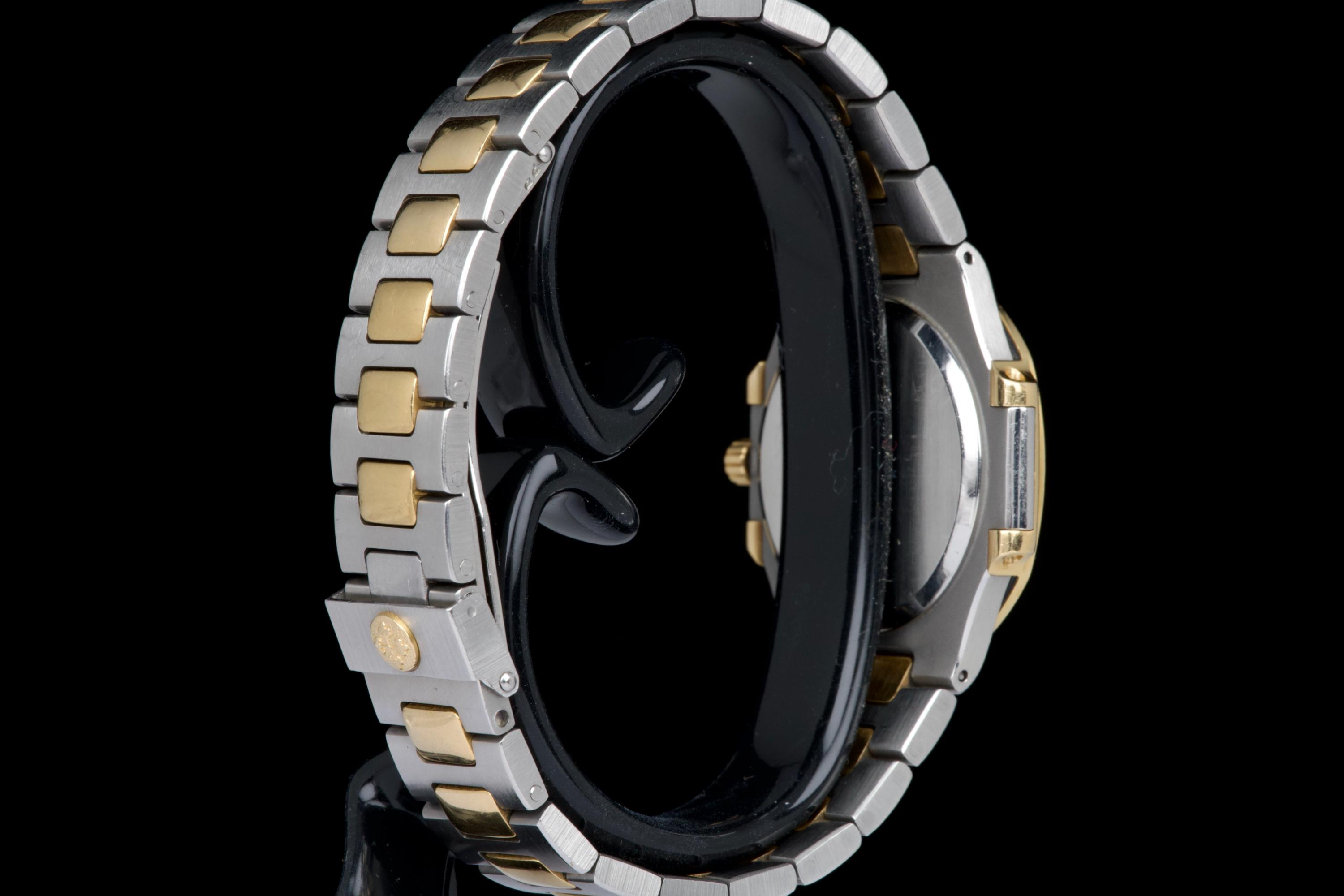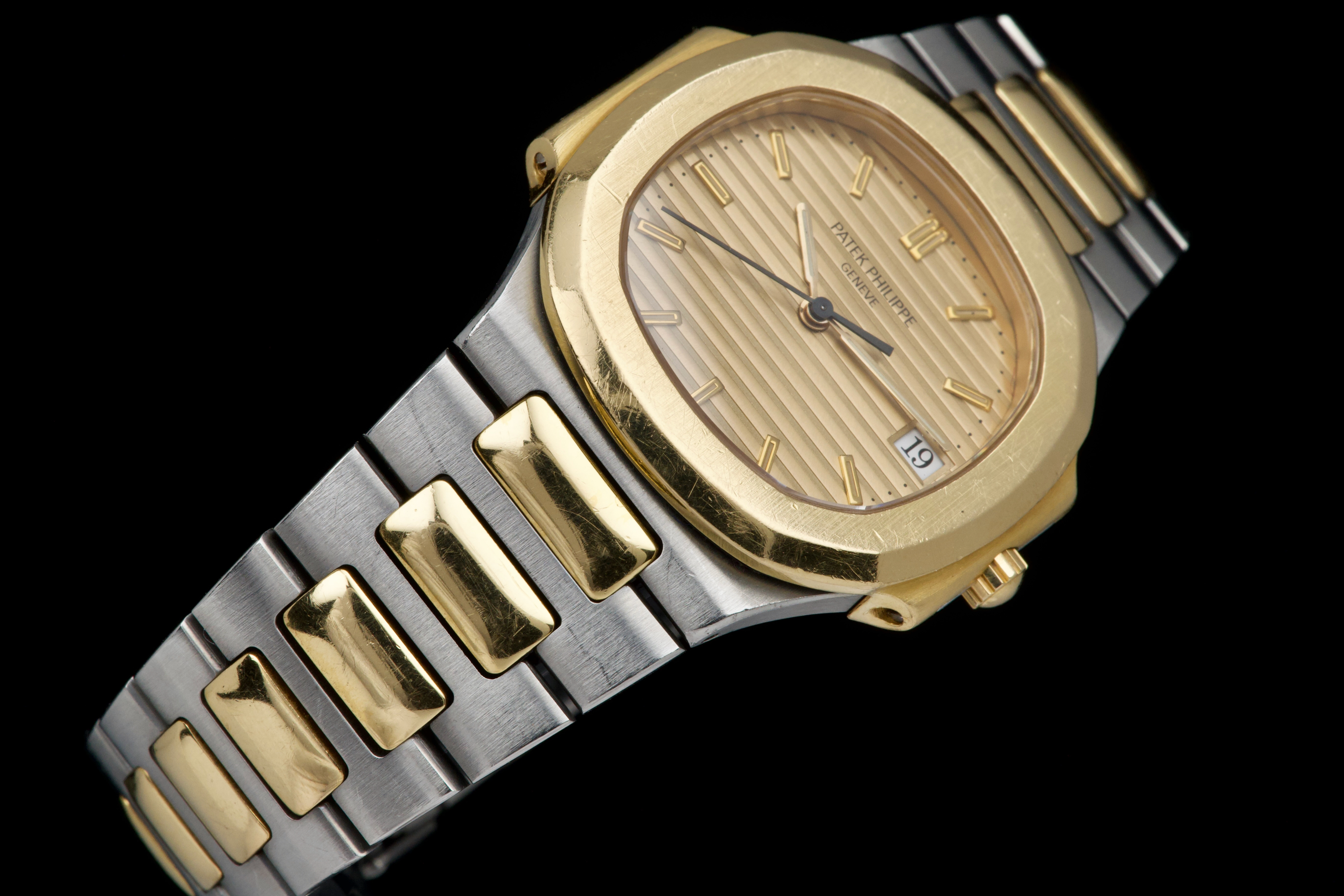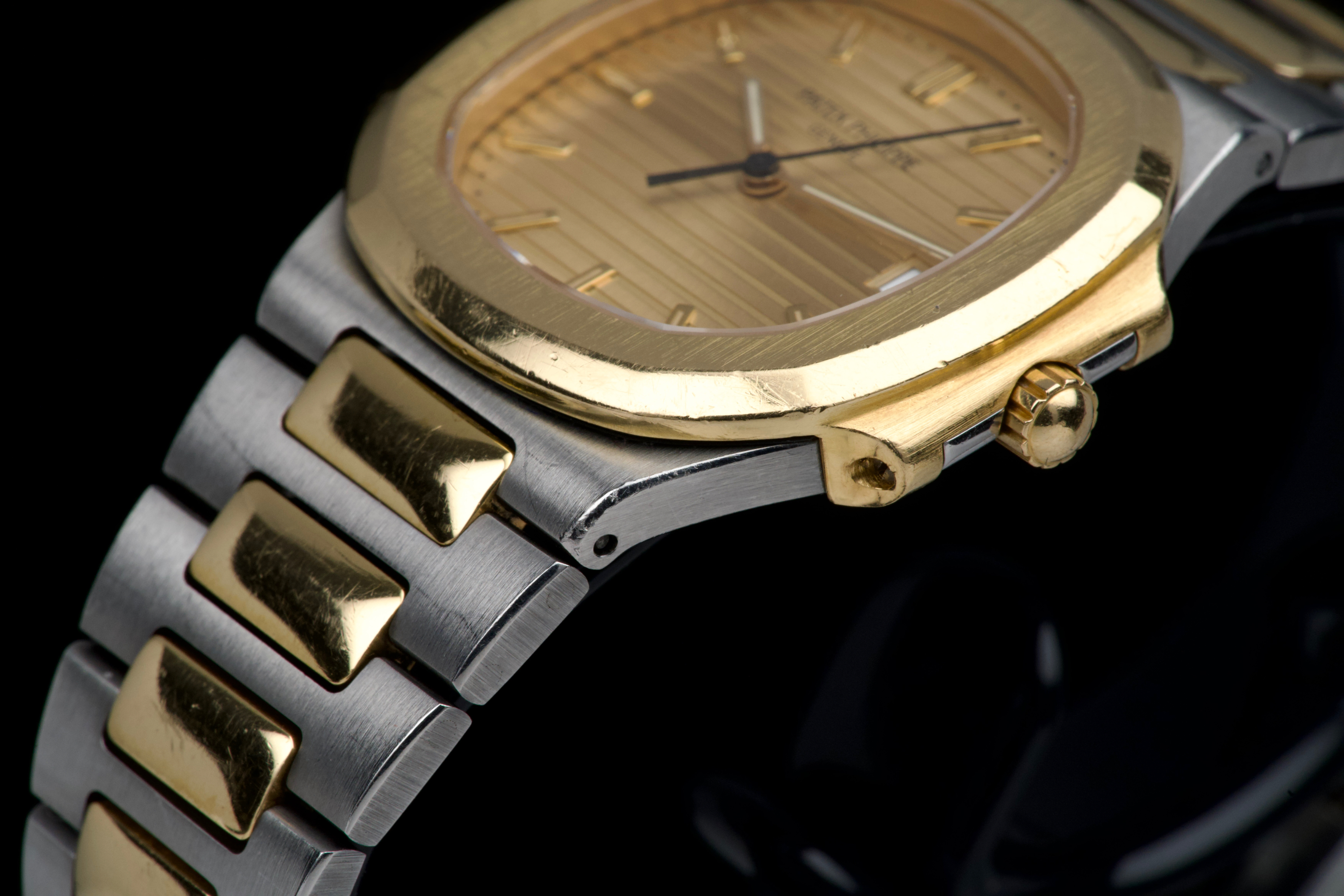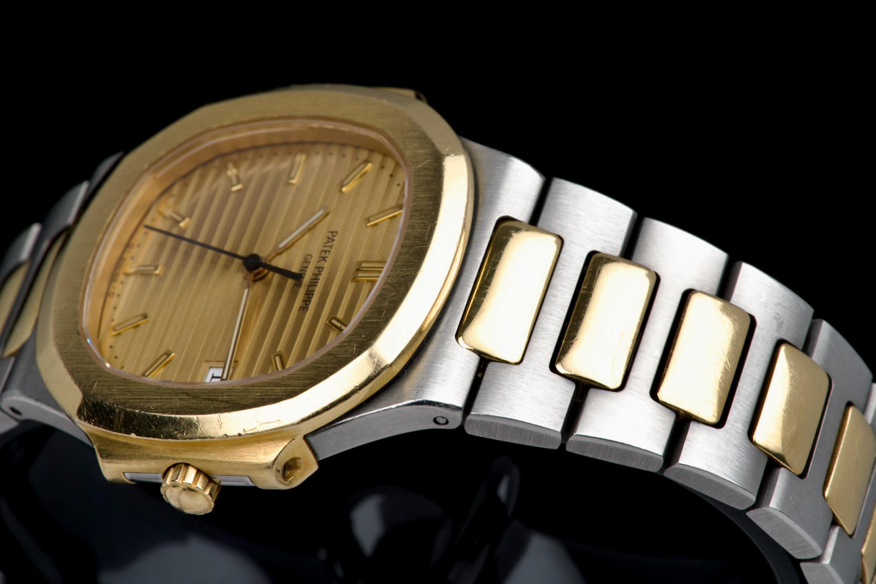The present Patek Philippe Nautilus reference 3900, measuring 33 mm and executed in two-tone stainless steel and yellow gold, dates from the early 1990s and is offered in highly attractive and honest original condition. This example comes directly from its original owner, although the box and papers have unfortunately been misplaced over time. The case appears unpolished and shows wear consistent with age and careful use, retaining its original proportions and character. The bracelet remains in excellent condition with extremely little stretch and includes a generous number of links, comfortably fitting a wrist of up to approximately 18.5 cm, a particularly desirable attribute for this reference. The watch is fitted with an excellent original champagne “sigma” tritium dial, preserved in very fine condition. The tritium hour markers display attractive, even ageing, while the tritium hands have aged a few shades lighter, a natural and commonly observed phenomenon that adds to the watch’s vintage charm without detracting from its overall harmony. Powered by a quartz movement, the watch has had its battery replaced and is in perfect working order at the time of cataloguing, offering the convenience and reliability that defined Patek Philippe’s high-end quartz production of the period. Elegant, understated, and increasingly appreciated by collectors, this Nautilus 3900 represents a compelling opportunity to acquire a well-preserved early two-tone Nautilus with strong originality, excellent wearability, and appealing first-owner provenance