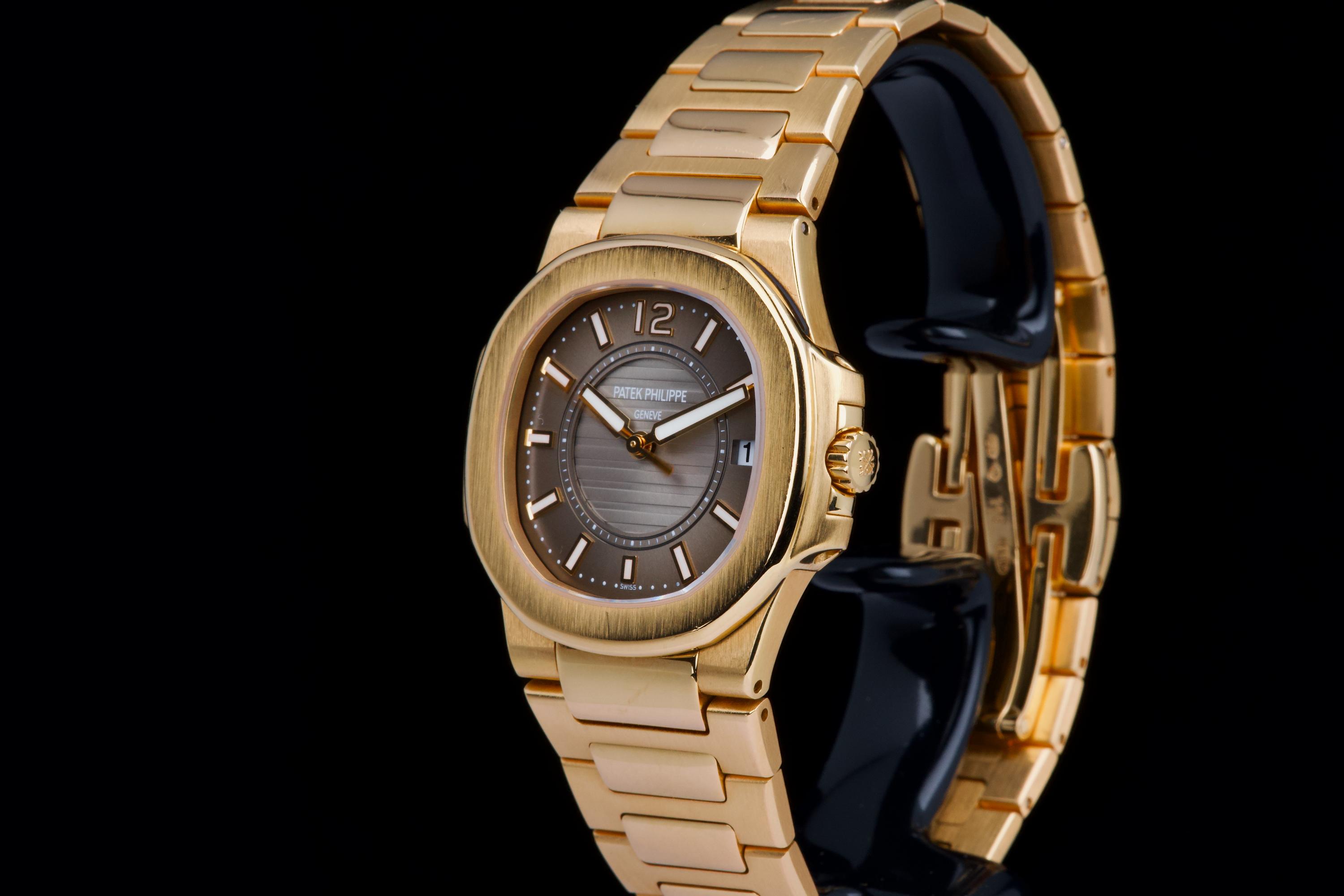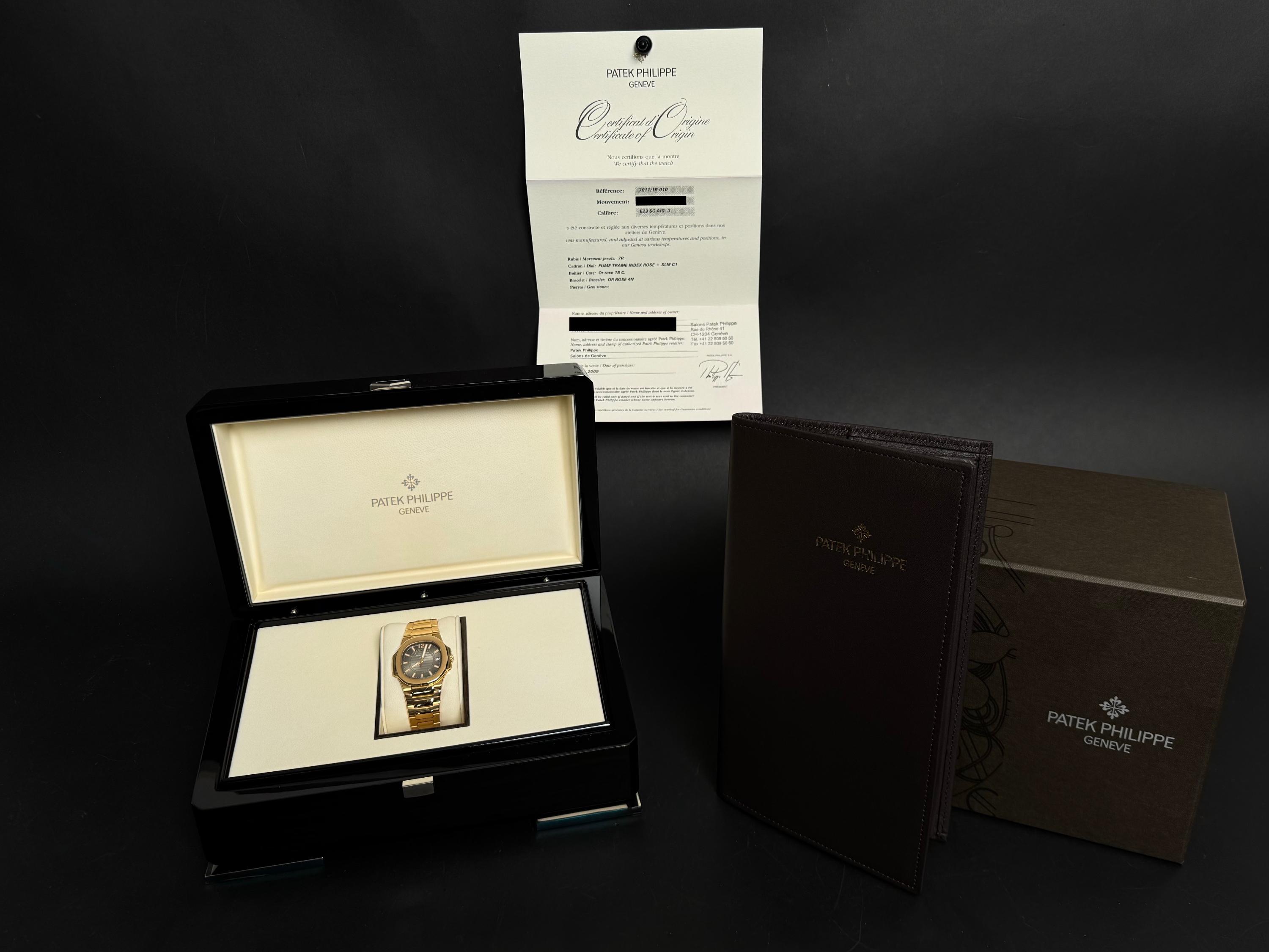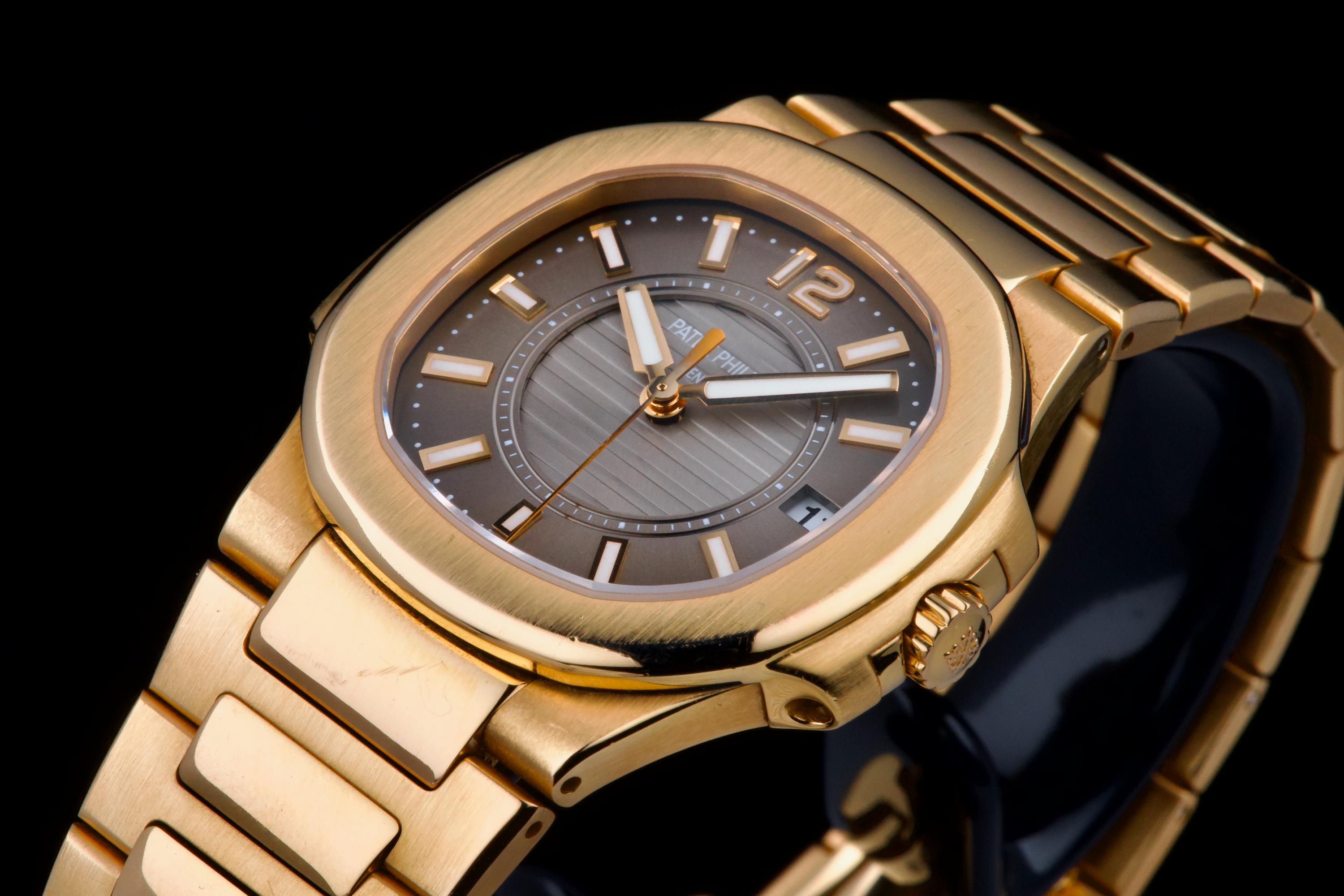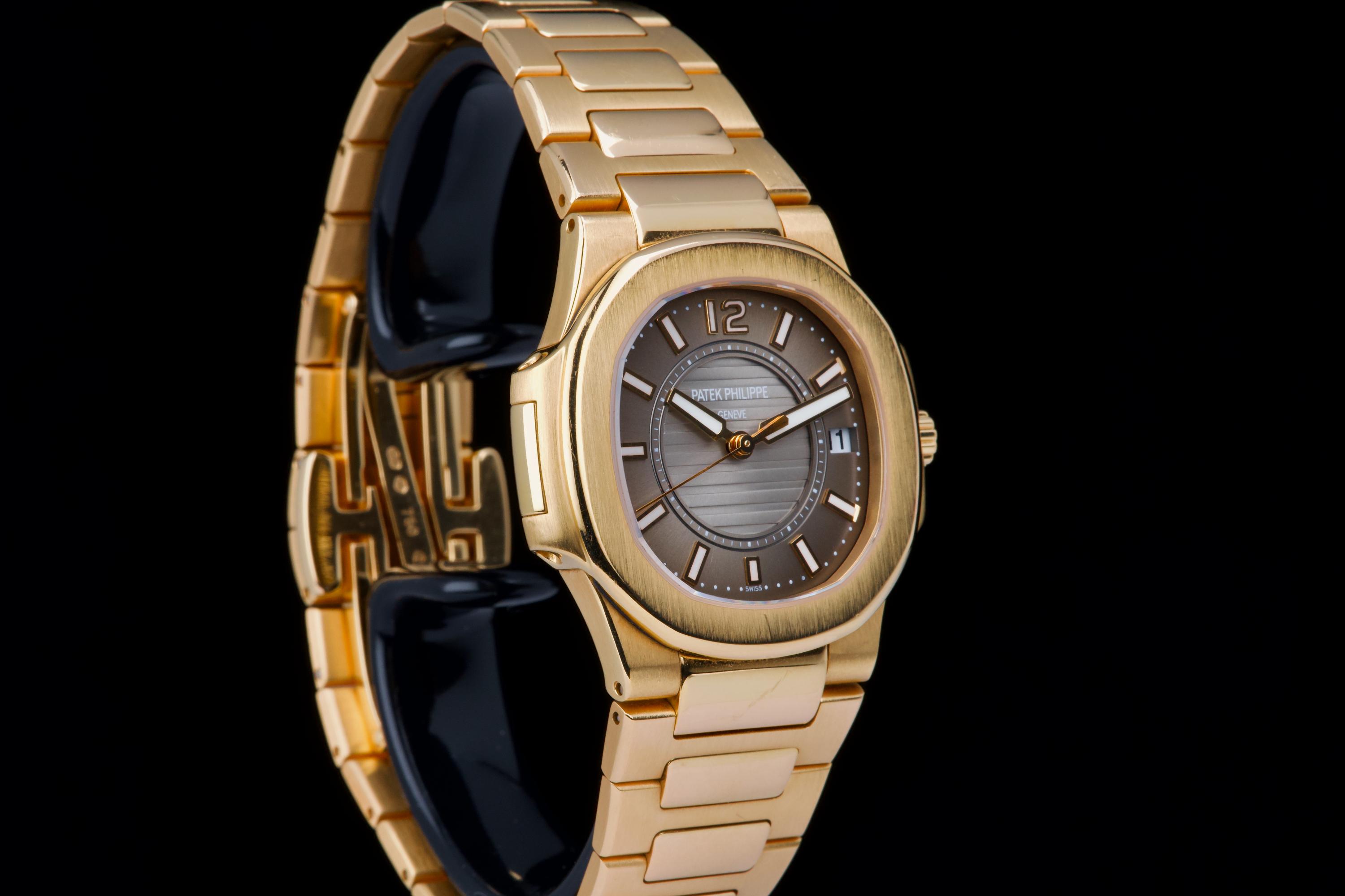 A beautiful and feminine example of the Patek Philippe Nautilus in full 18k rose gold, reference 7011/1R-010. This 33mm model is fitted with a smoky grey-brown dial featuring horizontal embossing and applied gold hour markers, and is powered by a reliable quartz movement. The watch is in well-worn but attractive condition, showing light surface scratches consistent with regular use. It can be professionally polished upon request. The integrated rose gold bracelet comes with all links included and shows only minimal stretch for its age. Sold as a full set with box and papers dated 2009. A rare and elegant ladies' Nautilus combining warm tones and timeless design.