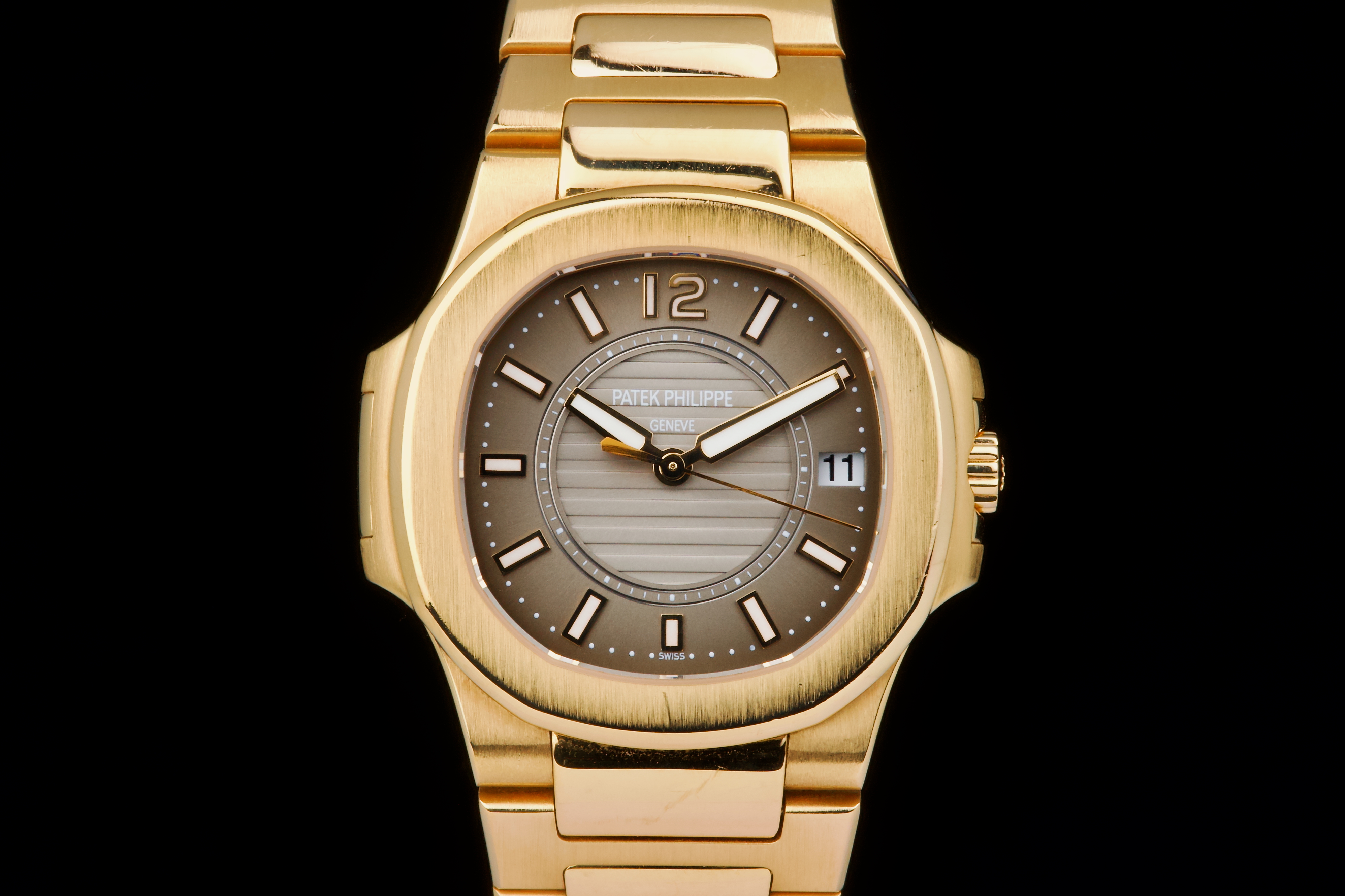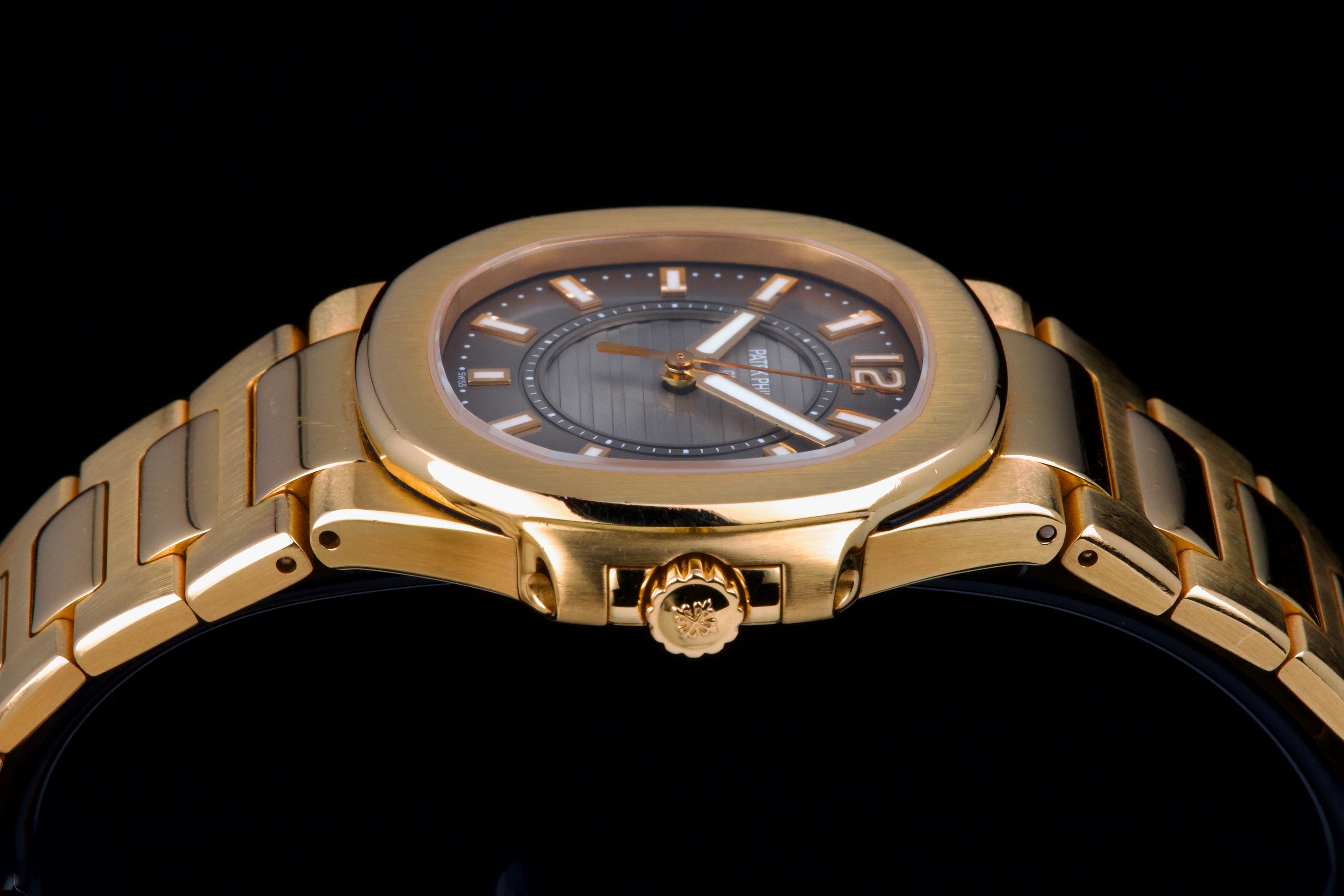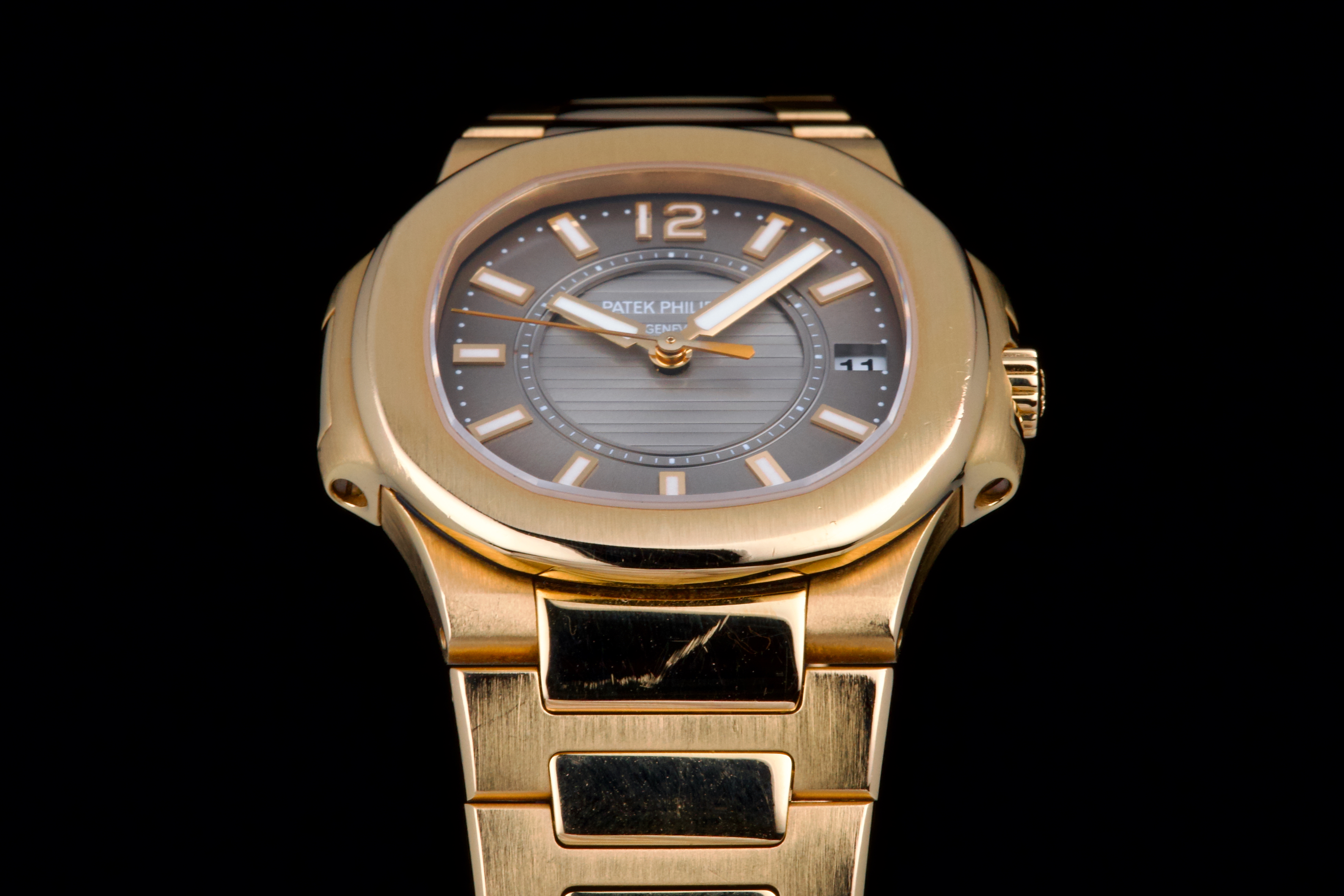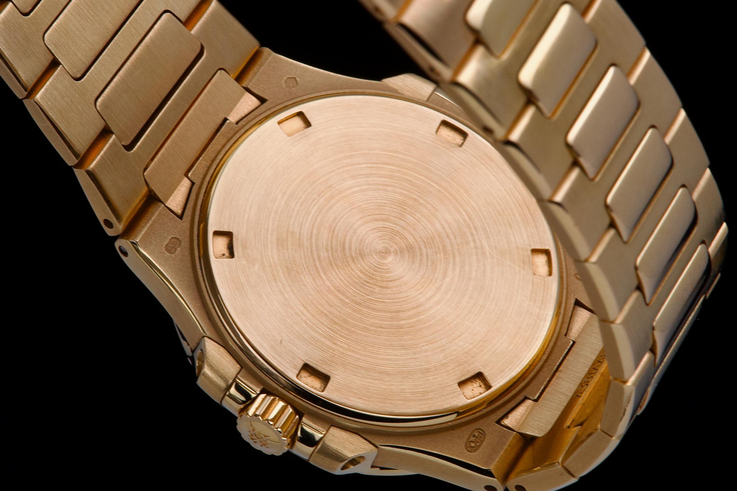 A beautiful and feminine example of the Patek Philippe Nautilus in full 18k rose gold, reference 7011/1R-010. This 33mm model is fitted with a smoky grey-brown dial featuring horizontal embossing and applied gold hour markers, and is powered by a reliable quartz movement. The watch is in well-worn but attractive condition, showing light surface scratches consistent with regular use. It can be professionally polished upon request. The integrated rose gold bracelet comes with all links included and shows only minimal stretch for its age. Sold as a full set with box and papers dated 2009. A rare and elegant ladies' Nautilus combining warm tones and timeless design.