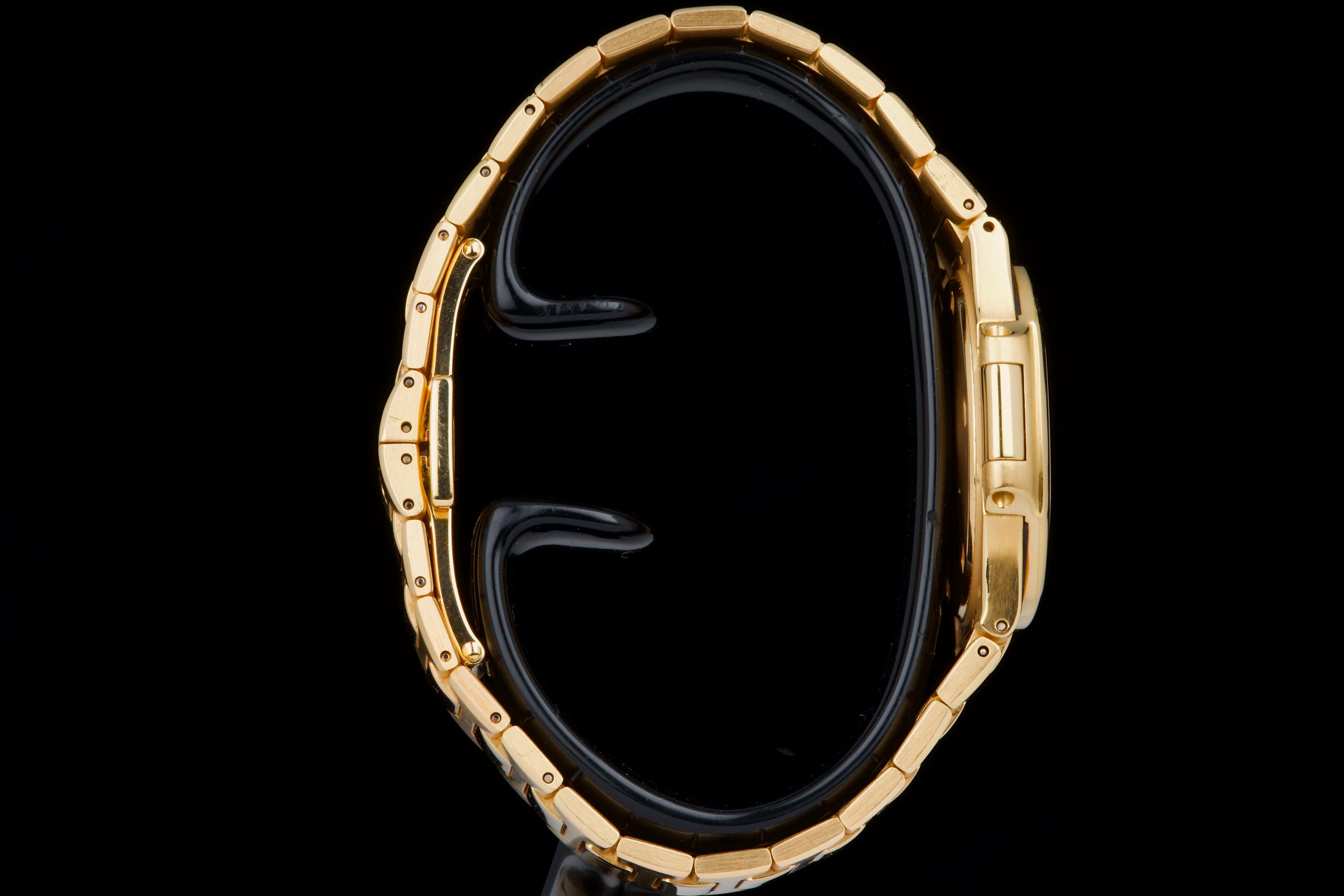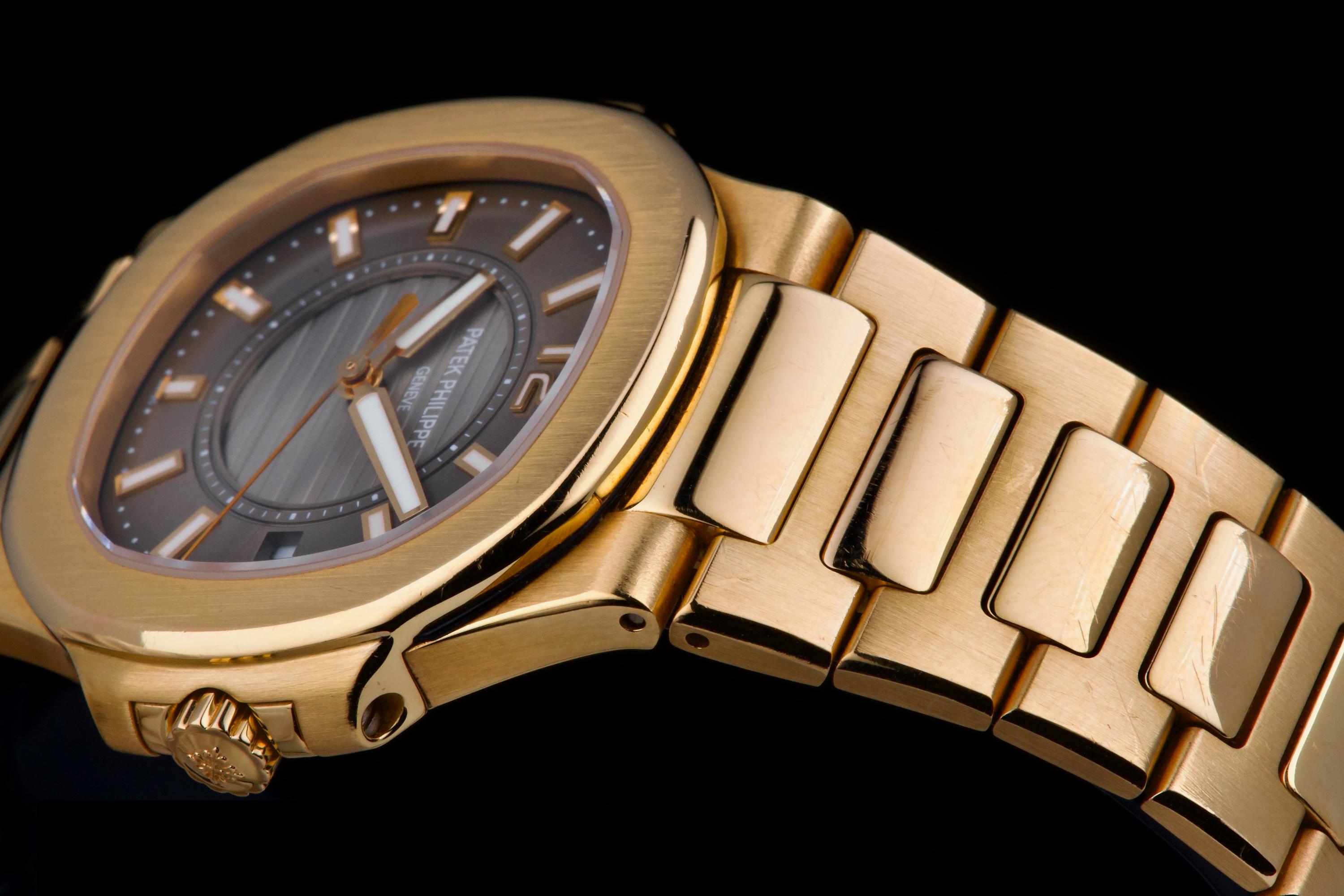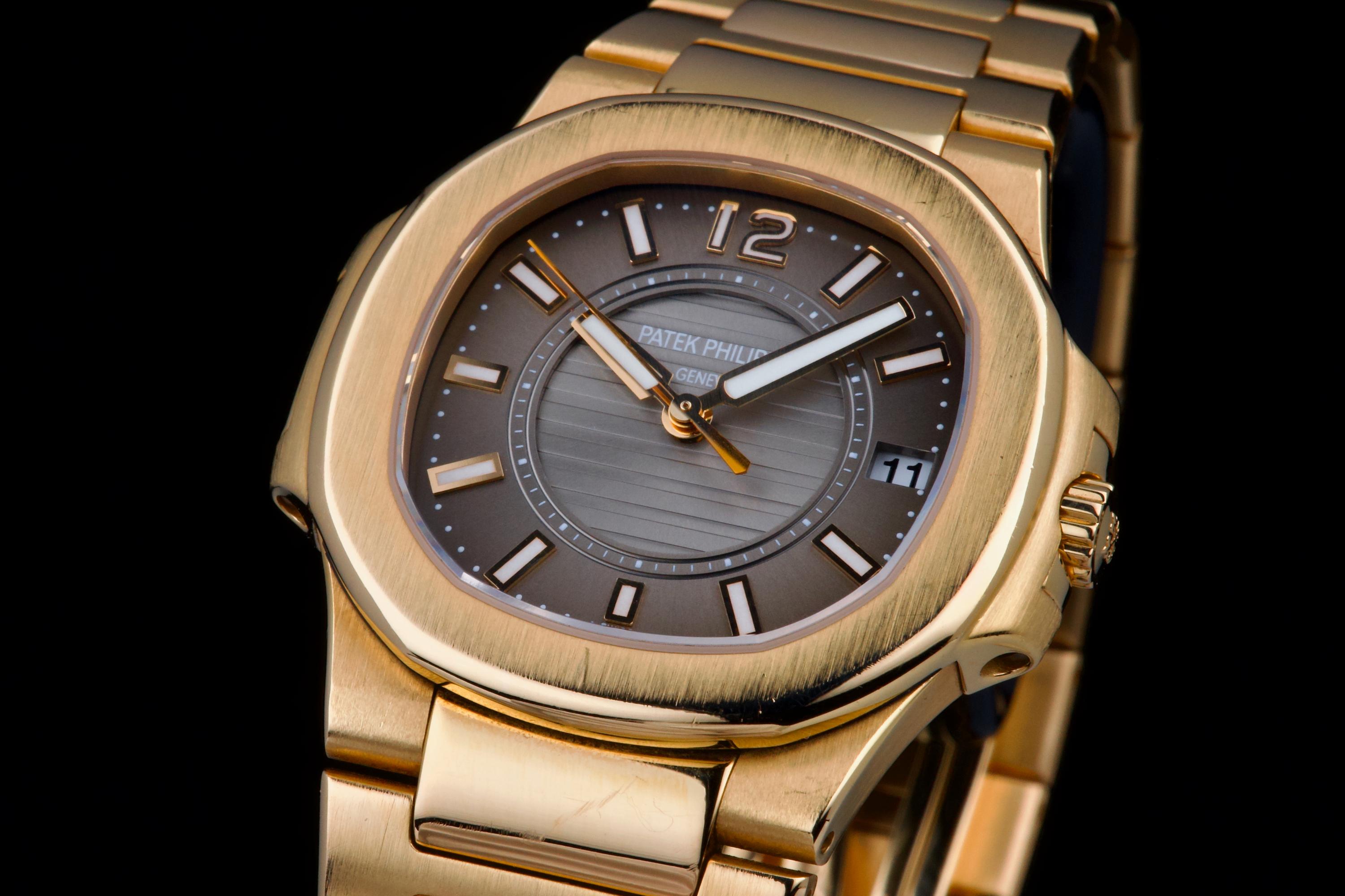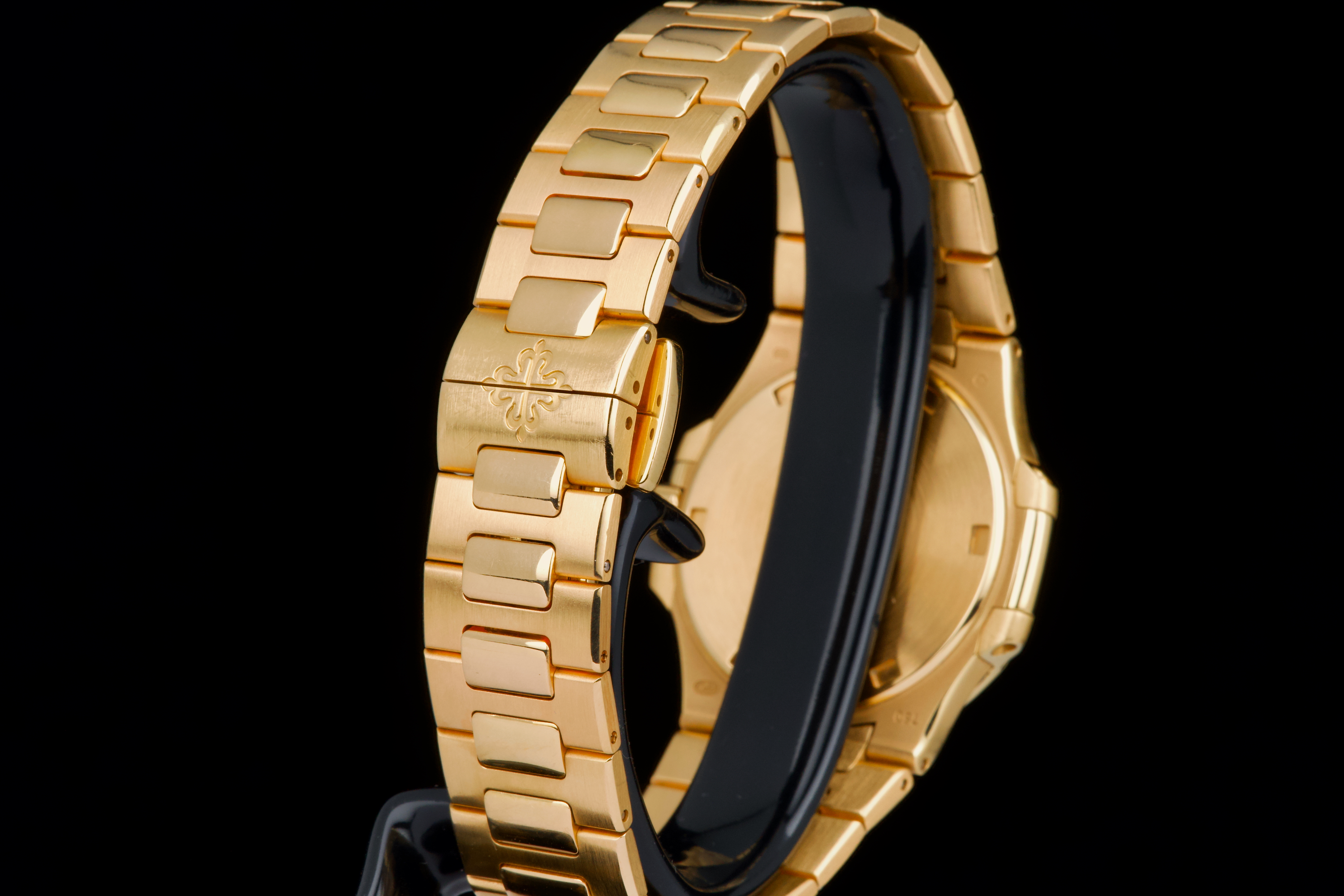 A beautiful and feminine example of the Patek Philippe Nautilus in full 18k rose gold, reference 7011/1R-010. This 33mm model is fitted with a smoky grey-brown dial featuring horizontal embossing and applied gold hour markers, and is powered by a reliable quartz movement. The watch is in well-worn but attractive condition, showing light surface scratches consistent with regular use. It can be professionally polished upon request. The integrated rose gold bracelet comes with all links included and shows only minimal stretch for its age. Sold as a full set with box and papers dated 2009. A rare and elegant ladies' Nautilus combining warm tones and timeless design.