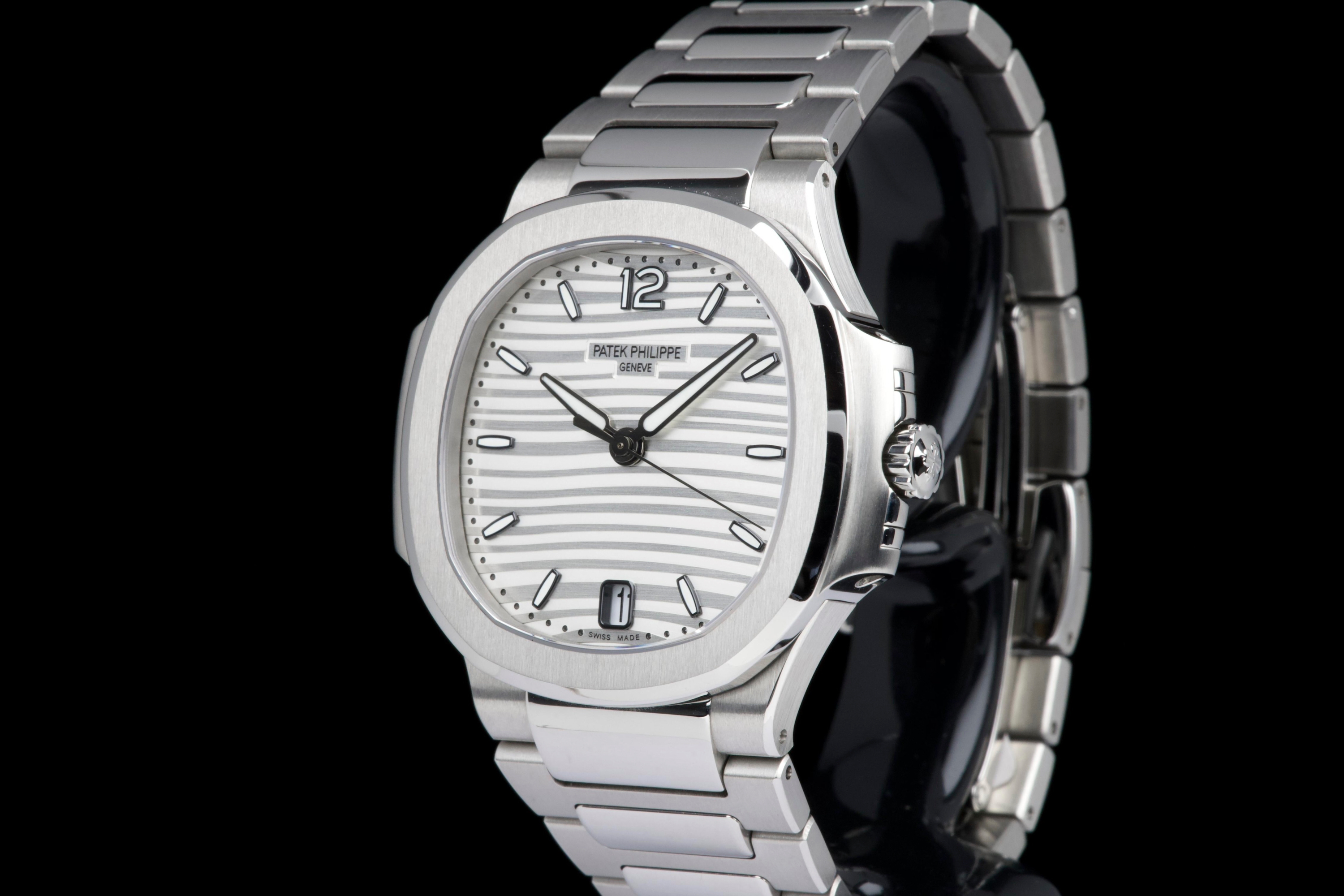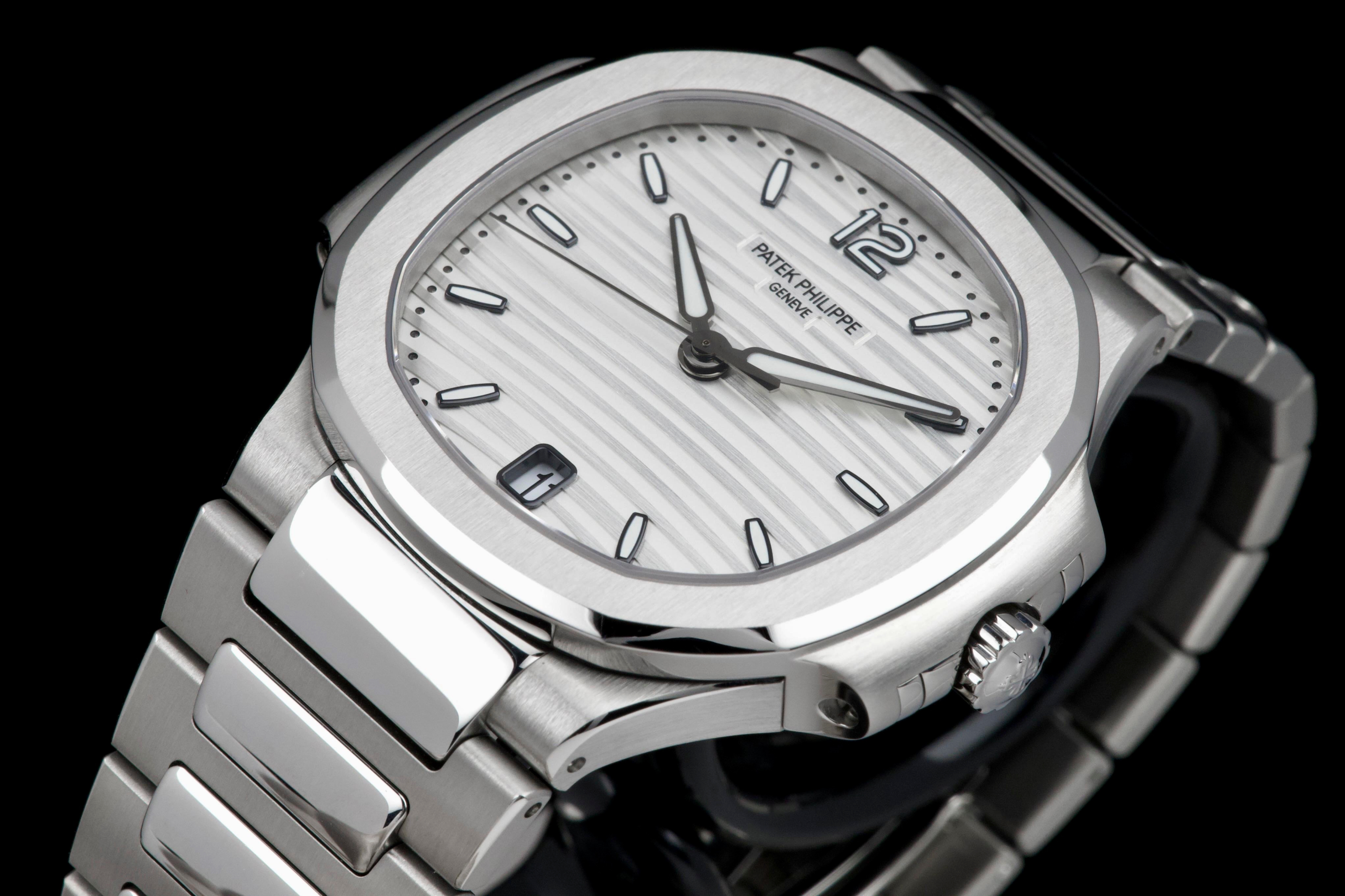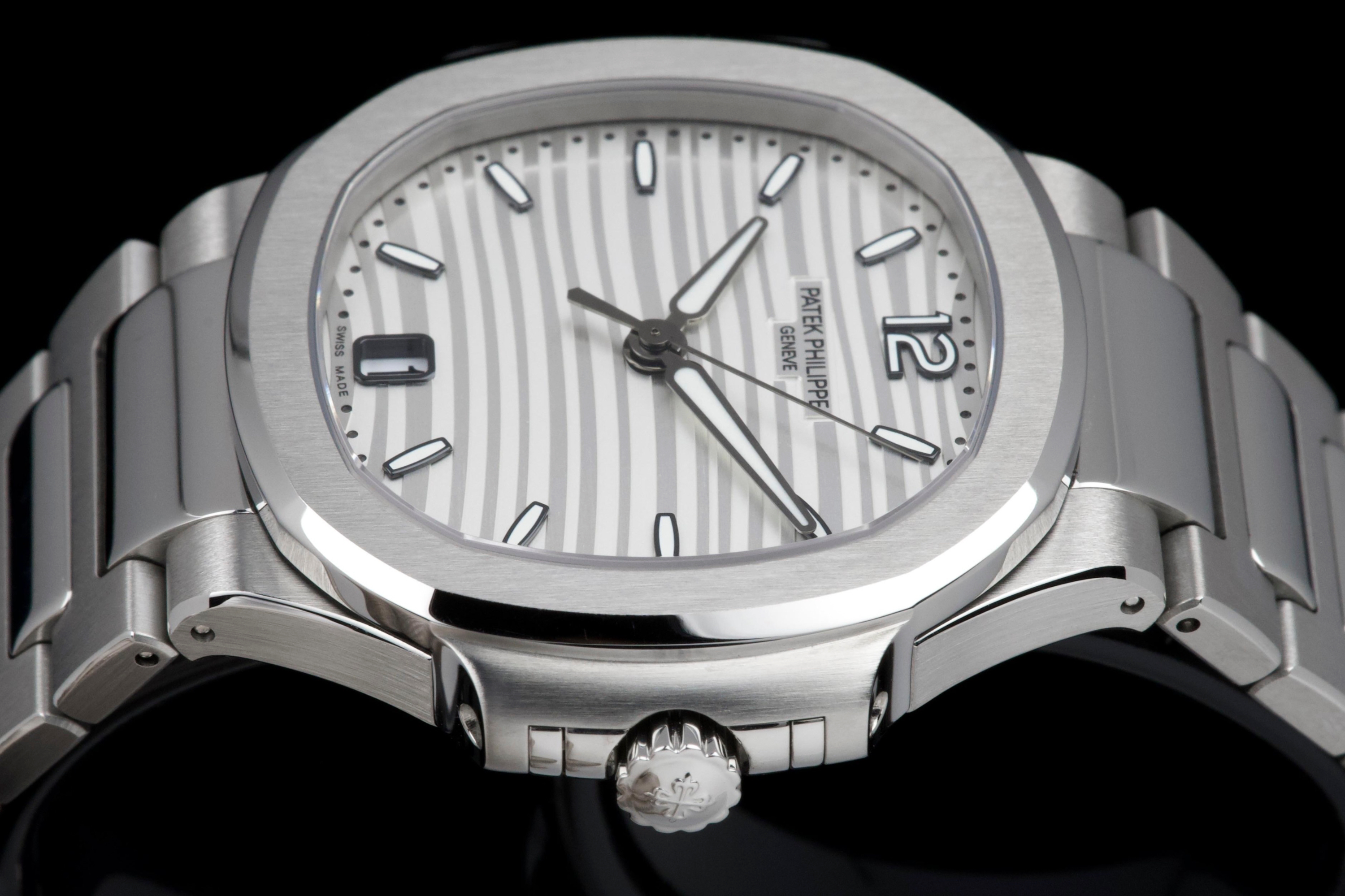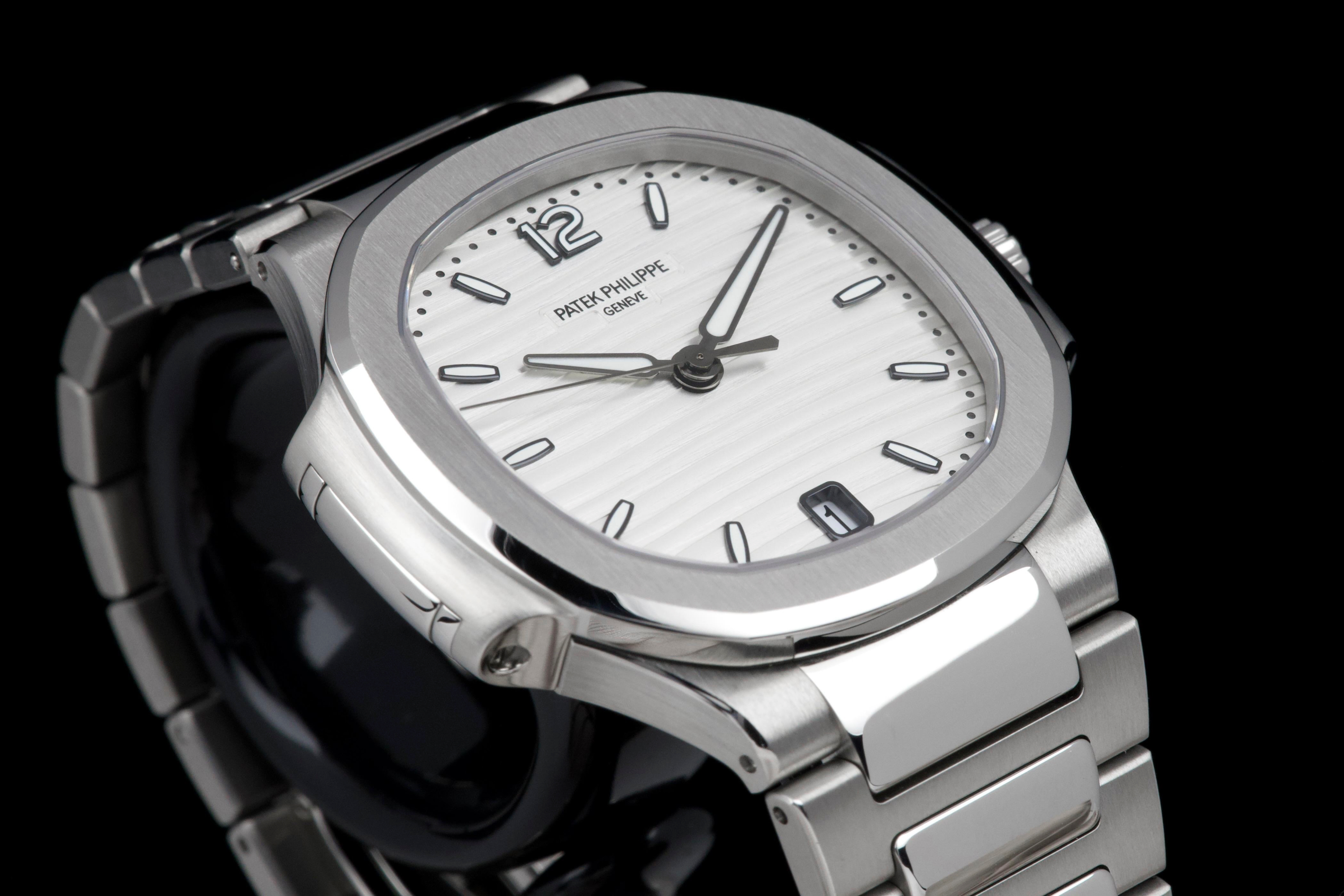 Presented is an exceptional and highly desirable example of one of Patek Philippe’s most iconic creations: the Nautilus reference 7118/1A-010. Crafted in stainless steel and measuring 36mm, this elegantly proportioned Nautilus offers a refined interpretation of Gérald Genta’s legendary design, combining sportiness with unmistakable sophistication. This particular watch dates to 2019 and is offered in unworn condition, retaining its original factory finish throughout. The luminous white dial, adorned with the signature horizontal embossing, provides a striking yet timeless contrast against the steel case and integrated bracelet. Accompanied by its full set, including box and Swiss-issued papers, this example represents a rare opportunity to acquire a pristine Nautilus in outstanding condition. A compelling and enduring timepiece, highly sought after by collectors for its elegance, versatility, and unquestionable horological pedigree.