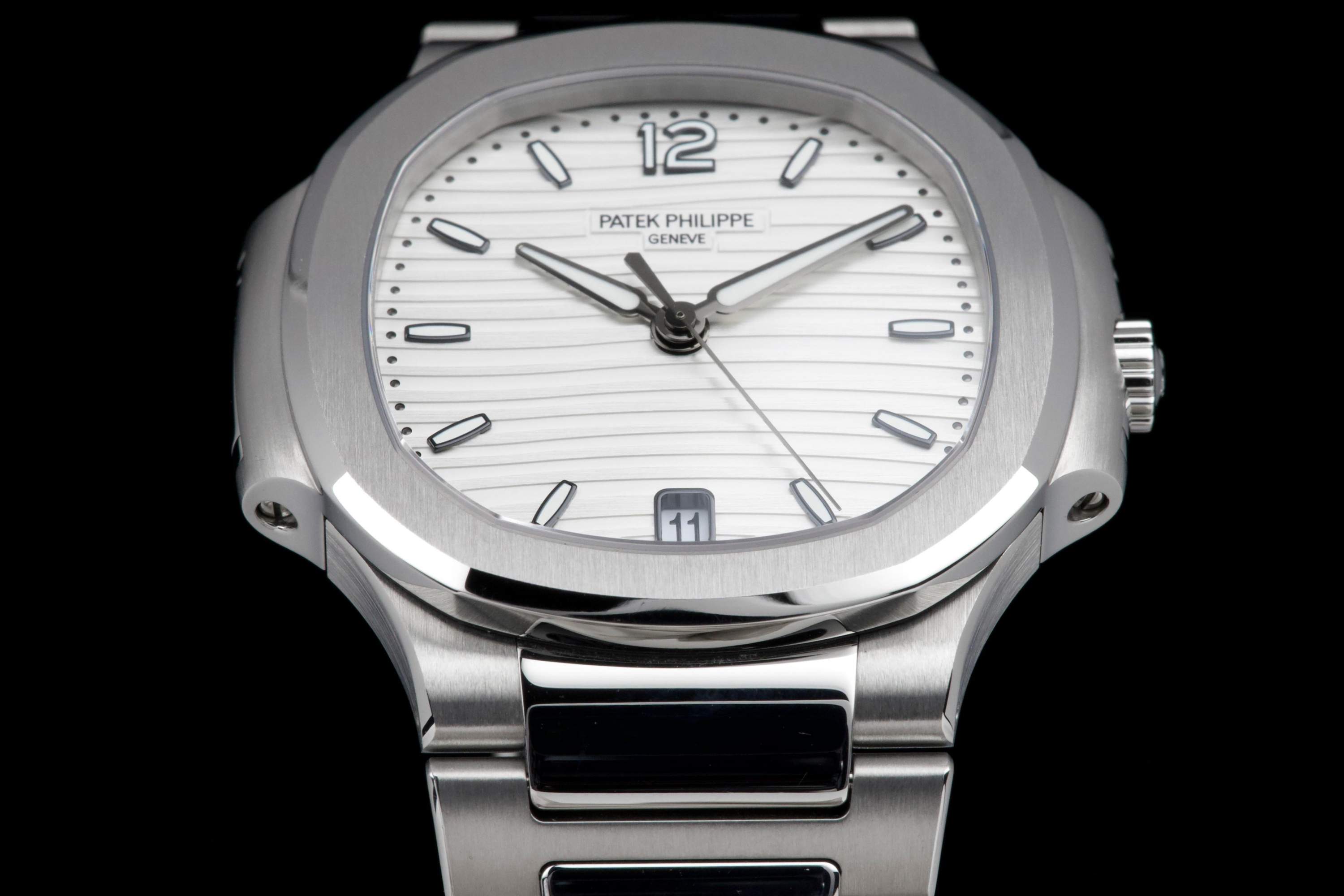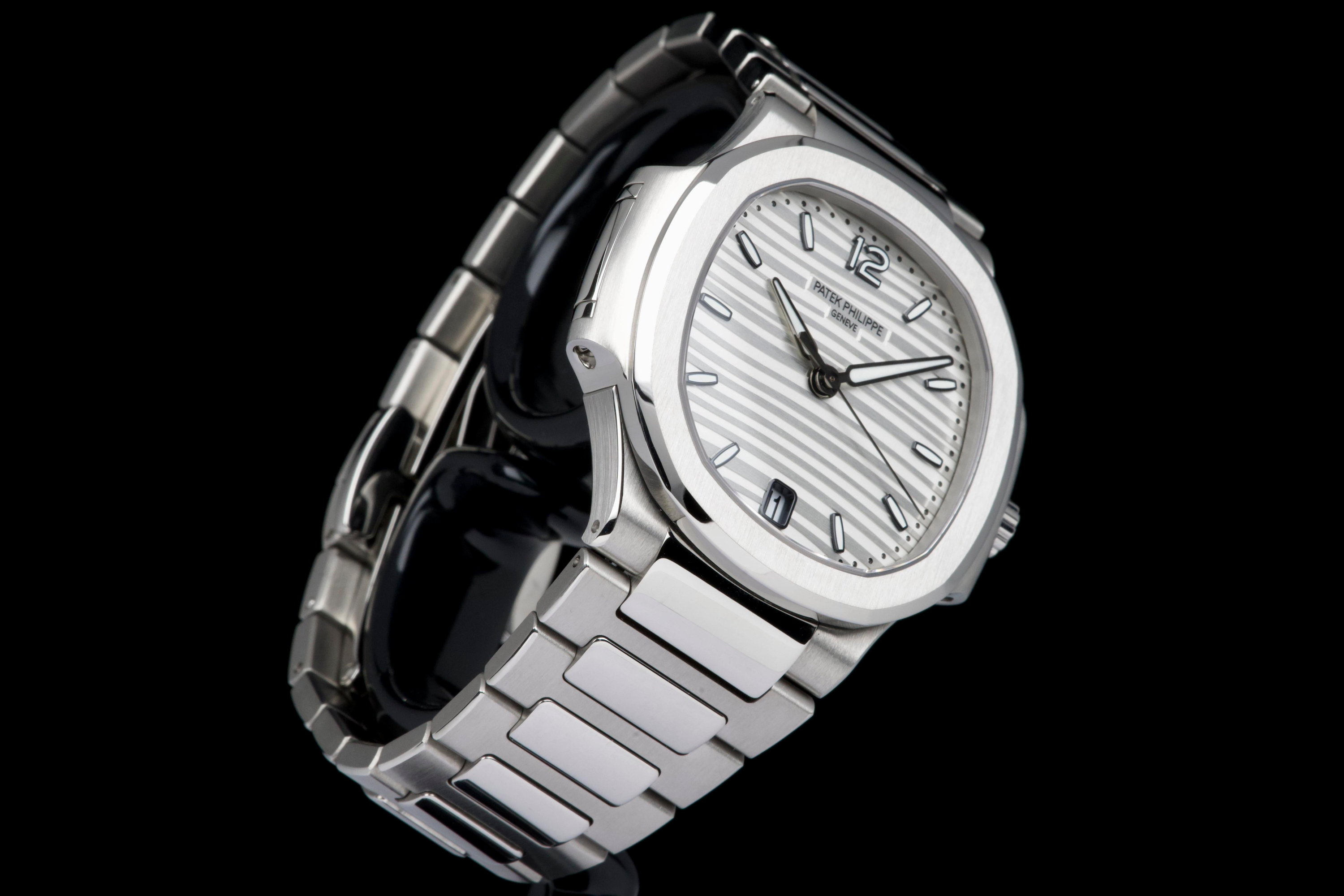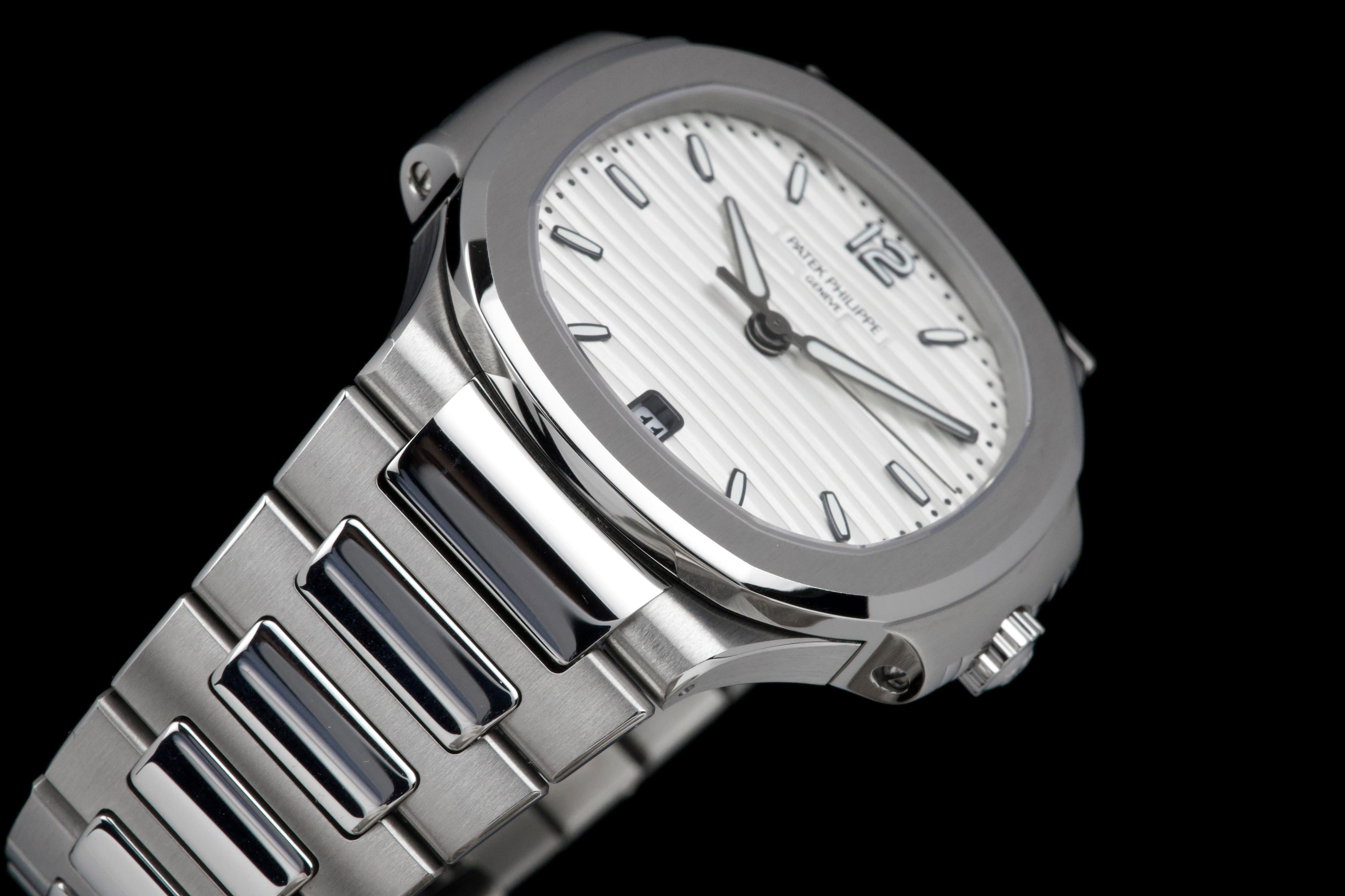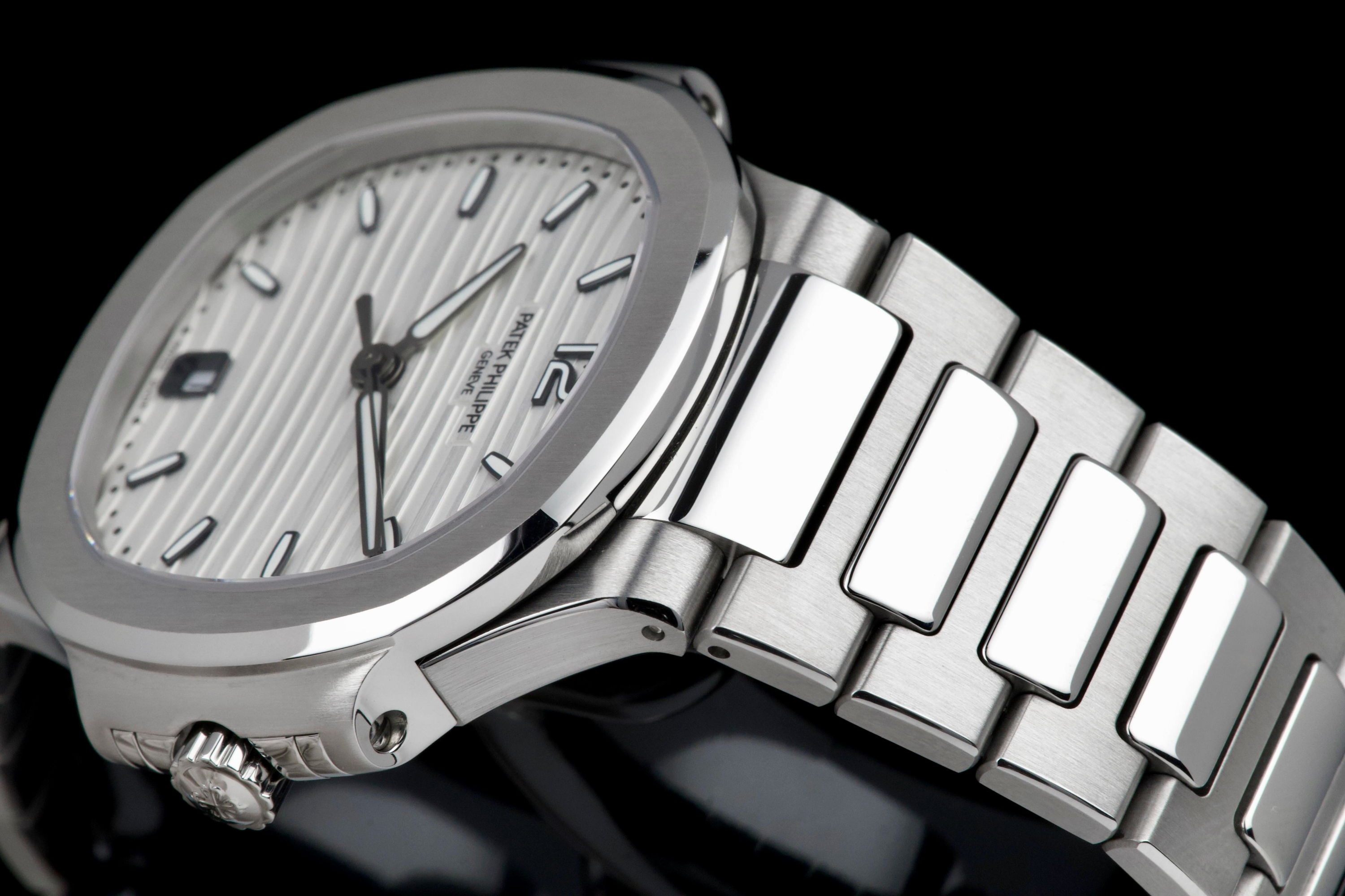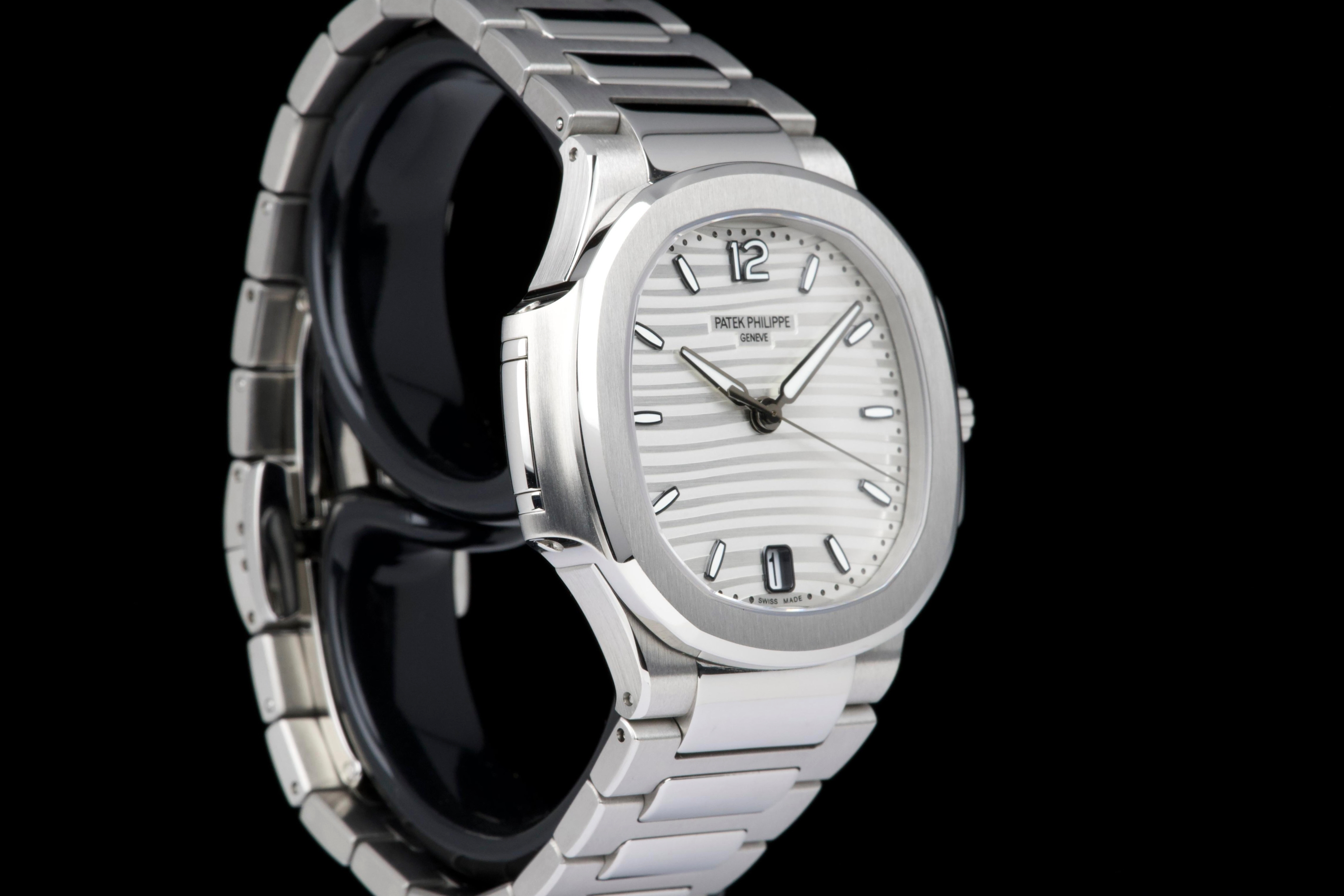 Presented is an exceptional and highly desirable example of one of Patek Philippe’s most iconic creations: the Nautilus reference 7118/1A-010. Crafted in stainless steel and measuring 36mm, this elegantly proportioned Nautilus offers a refined interpretation of Gérald Genta’s legendary design, combining sportiness with unmistakable sophistication. This particular watch dates to 2019 and is offered in unworn condition, retaining its original factory finish throughout. The luminous white dial, adorned with the signature horizontal embossing, provides a striking yet timeless contrast against the steel case and integrated bracelet. Accompanied by its full set, including box and Swiss-issued papers, this example represents a rare opportunity to acquire a pristine Nautilus in outstanding condition. A compelling and enduring timepiece, highly sought after by collectors for its elegance, versatility, and unquestionable horological pedigree.