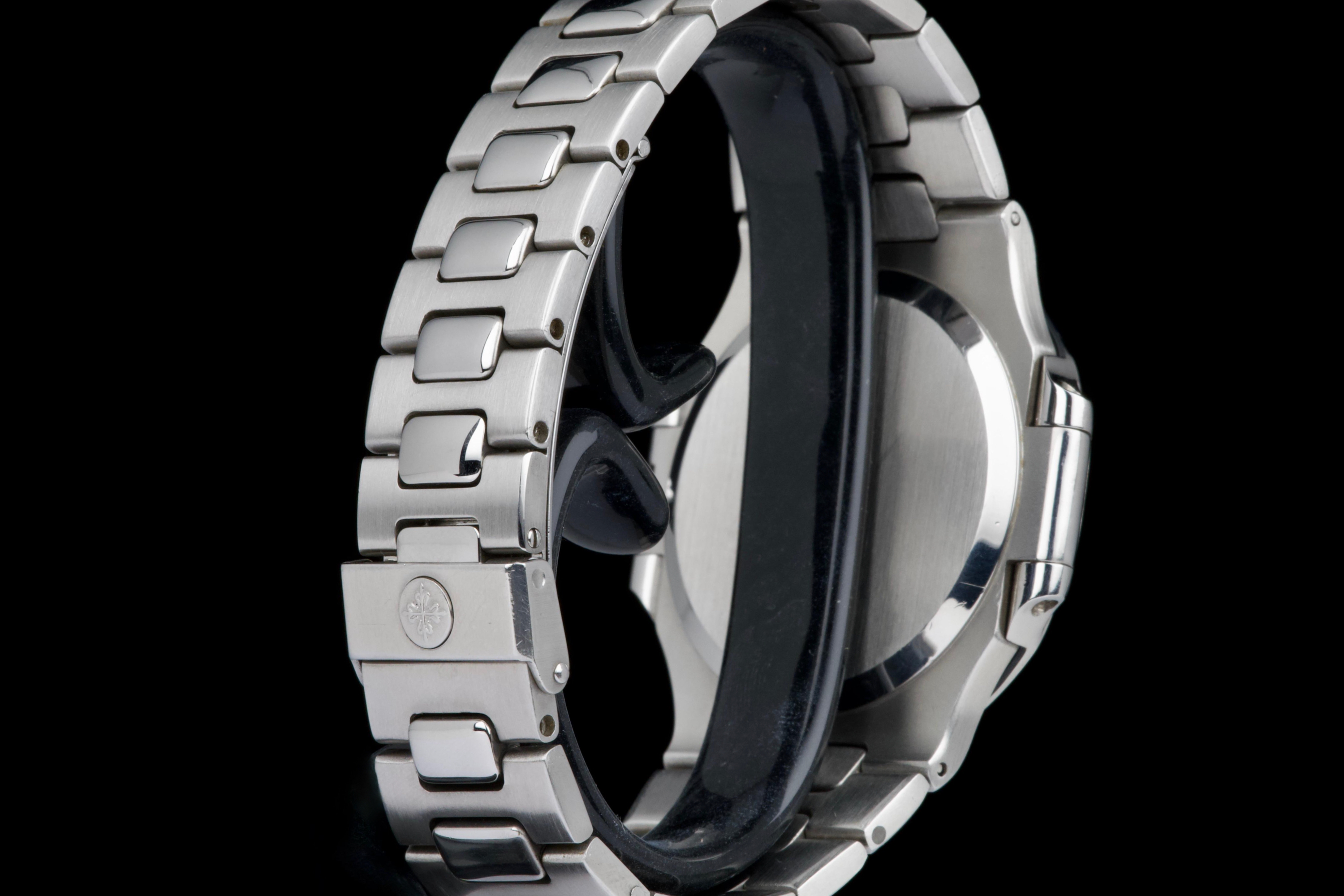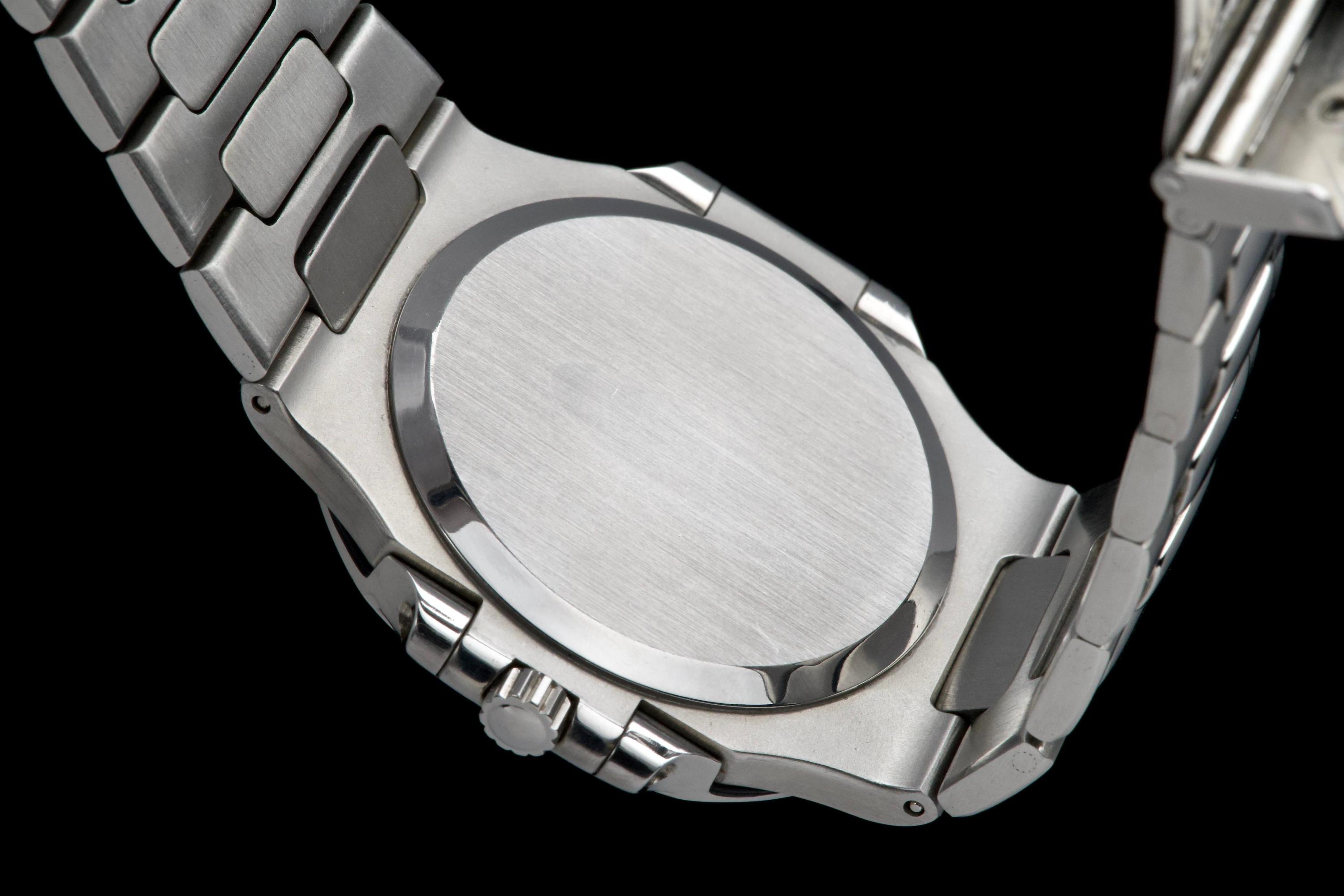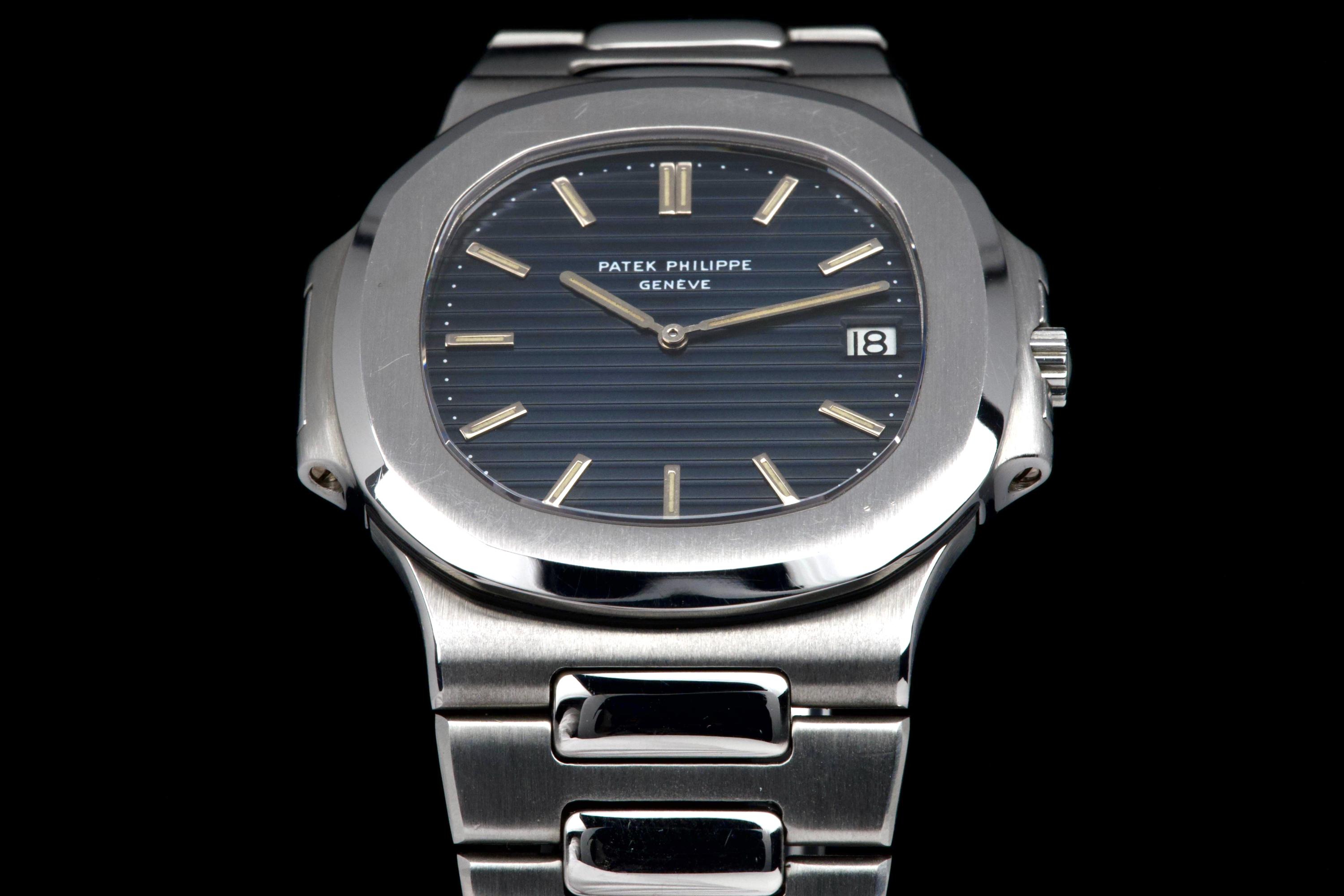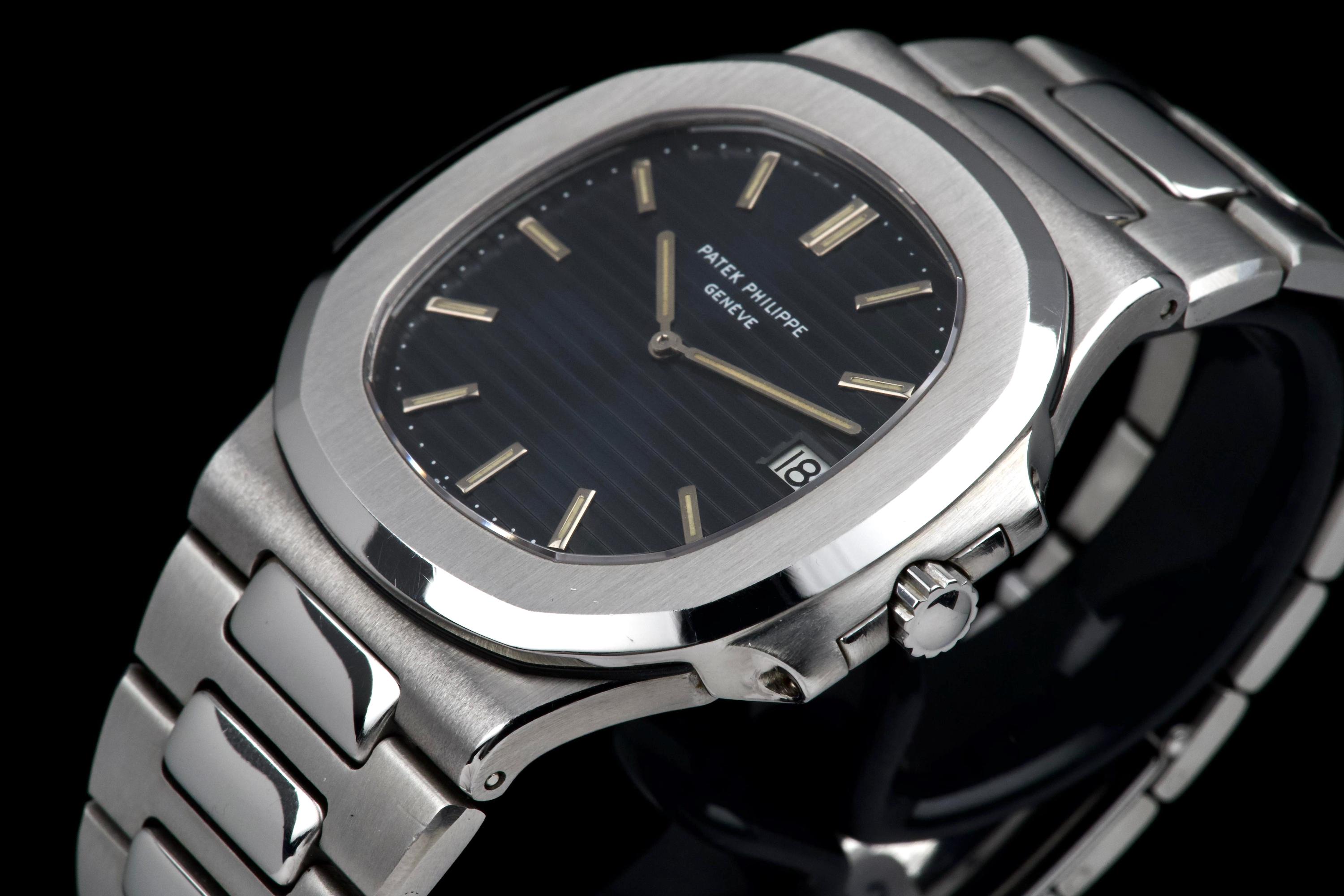 The present Patek Philippe Nautilus reference 3700/1, dating to 1978, is a superb and highly attractive example of Gérald Genta’s most iconic sports watch, preserved in outstanding overall condition and representing a particularly high-quality specimen of this landmark reference. The stainless-steel case has been very lightly polished in the past and now shows only light wear consistent with careful use. Importantly, the bezel remains well defined, symmetrical, and sharp, retaining its original geometry and crisp edges—an essential characteristic for discerning collectors of early Nautilus models. The watch is fitted with the highly desirable “large” integrated bracelet, preserved in excellent condition with very little stretch. Notably, the bracelet is sufficiently tight that the watch can stand upright when placed on its clasp, a strong indicator of exceptional bracelet integrity. The clasp is original and correct for the period. The original Mk II dial is truly outstanding, displaying a deep and vibrant navy blue tone with remarkable richness and freshness. The hands match perfectly, creating a harmonious and coherent aesthetic. The original date disc is also present, further underscoring the originality and quality of this example. The watch is accompanied by an Extract from the Archives, confirming production in 1978 and original sale in June 1980, adding important historical documentation and further strengthening the provenance of the piece. Altogether, this Nautilus 3700 Mk II stands out as a particularly high-grade example, combining a strong case, exceptional bracelet condition, a sublime original dial, and confirmed archival documentation. A watch of this quality represents a rare opportunity to acquire one of the most important and collectible sports watches of the 20th century in truly outstanding condition.