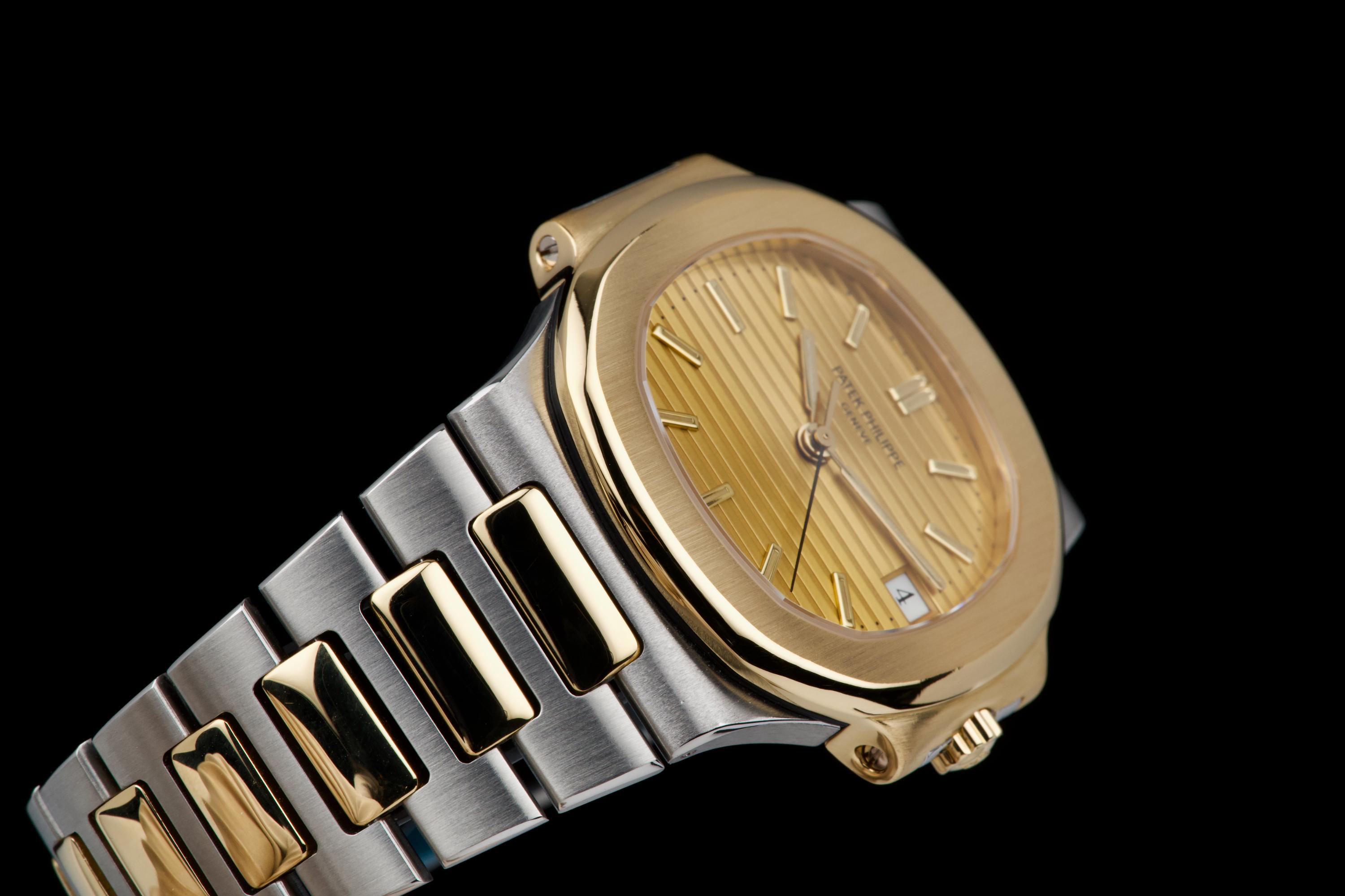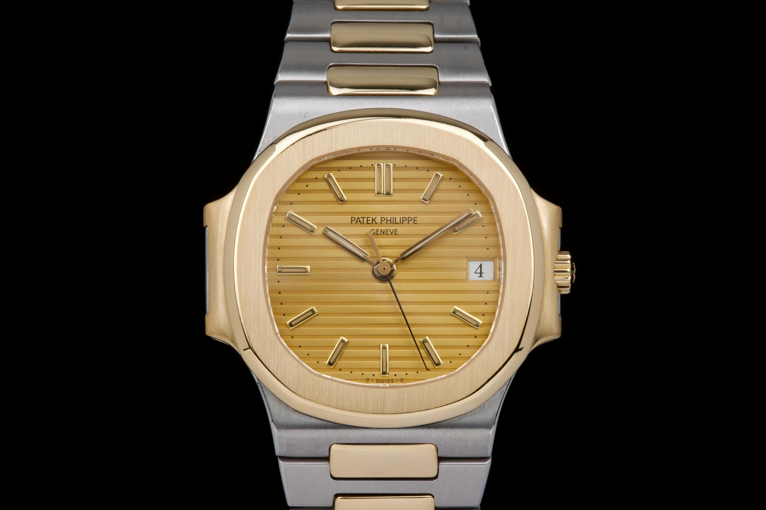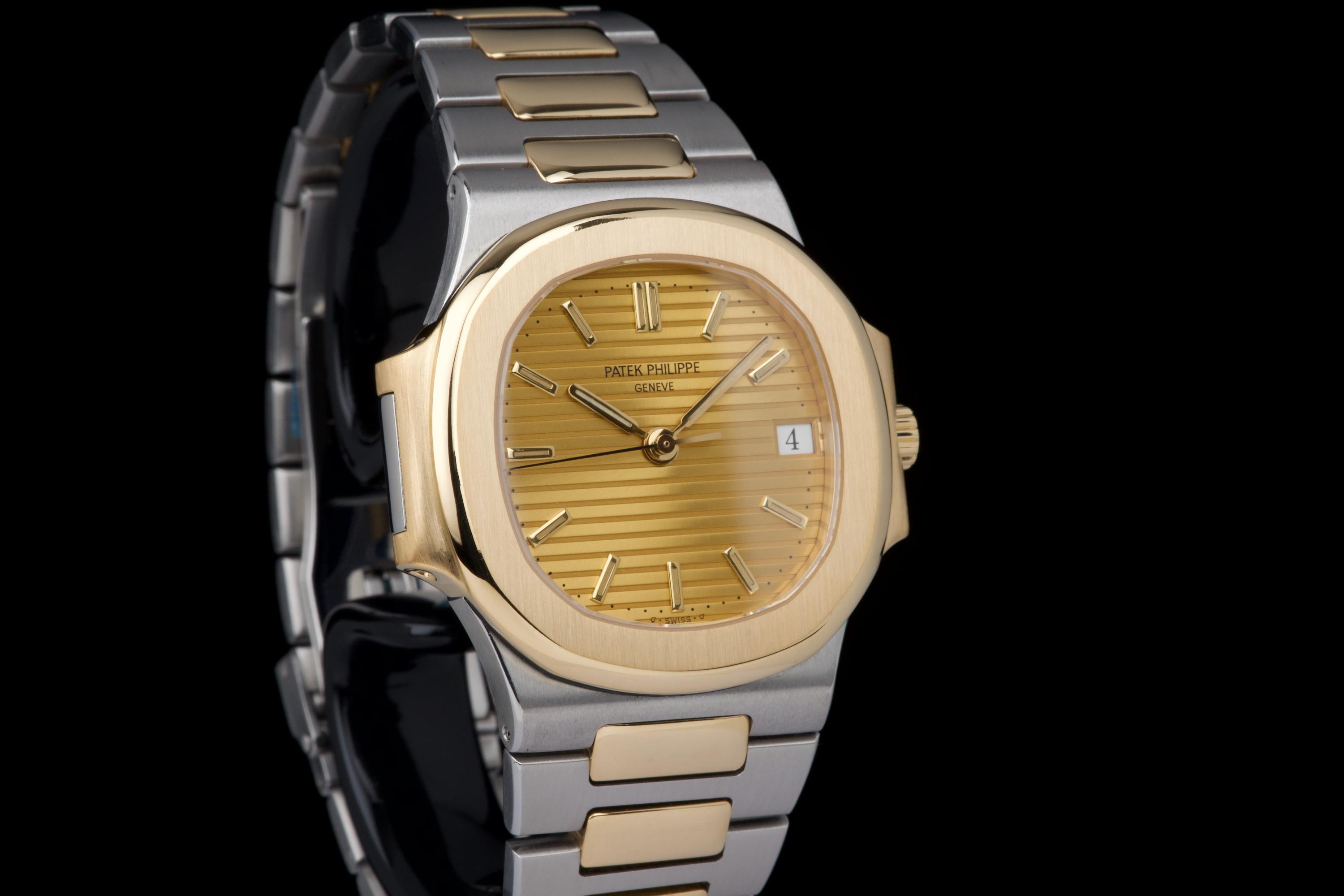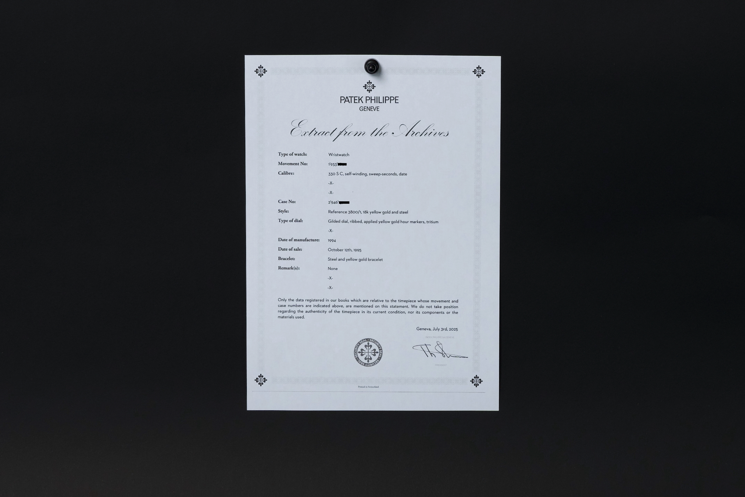 A beautiful and classic example of the two-tone Patek Philippe Nautilus reference 3800/1JA, featuring the sought-after gilt dial. This watch comes from its original owner and has just returned from a complete service and polish by Patek Philippein 2025. The original dial is flawless, with perfectly matching hands, and the two-tone gold and steel case and bracelet retain their crisp lines and elegant contrast. The bracelet shows moderate stretch from use, consistent with age. Accompanied by its original box, a copy of the Extract from the Archives confirming production in 1994 and sale in 1995, as well as the 2025 Patek Philippe service papers. A refined and timeless example of the Nautilus 3800 — beautifully maintained, freshly serviced, and preserved with its complete documentation.