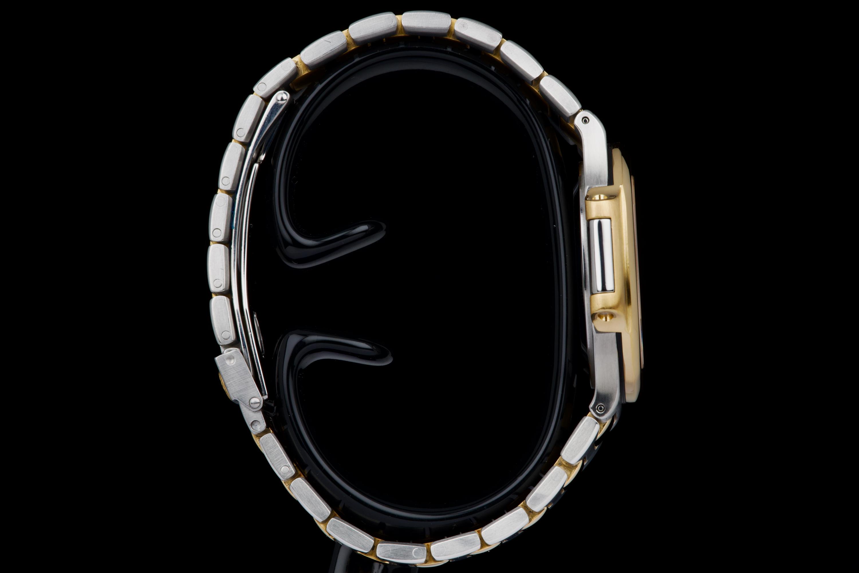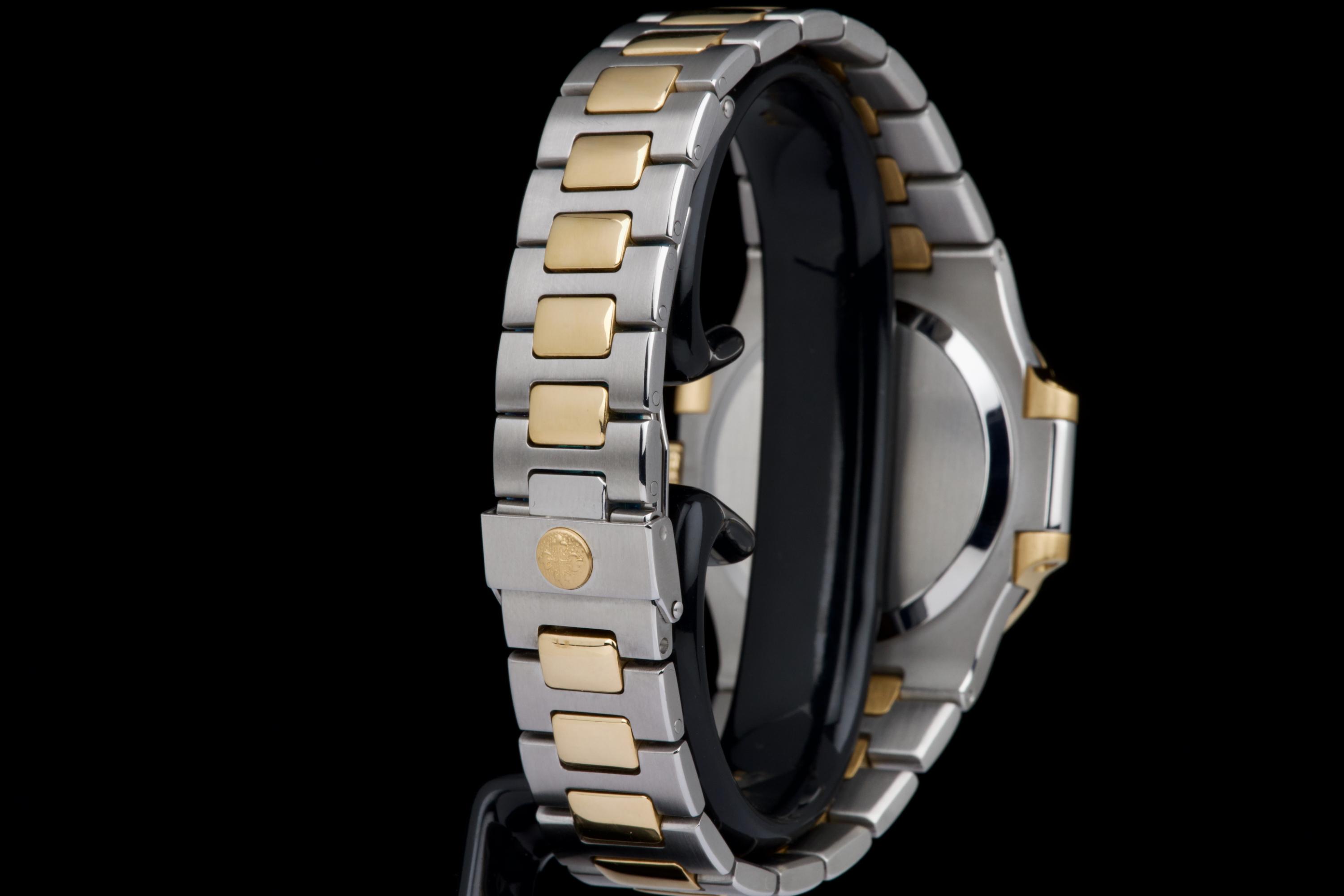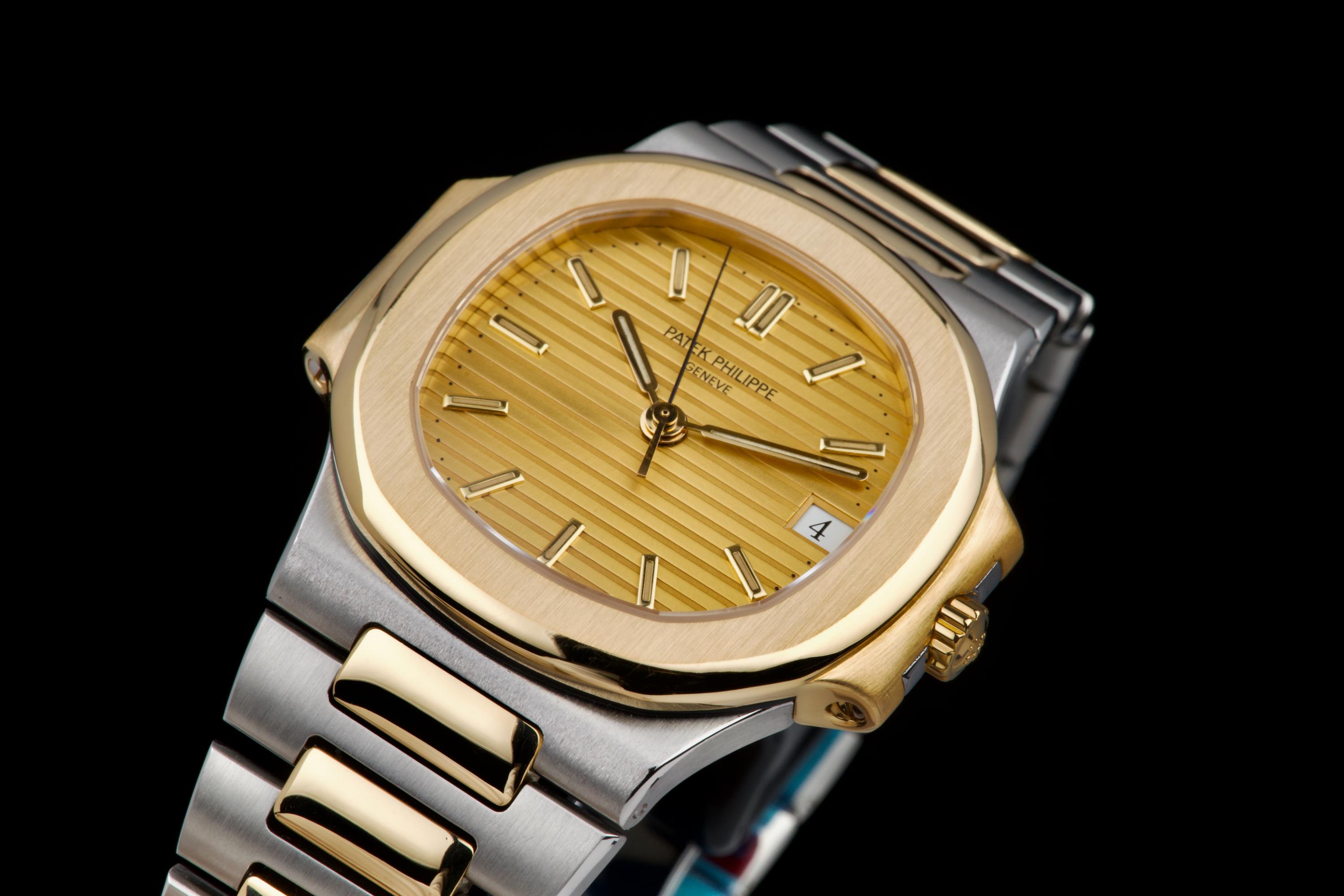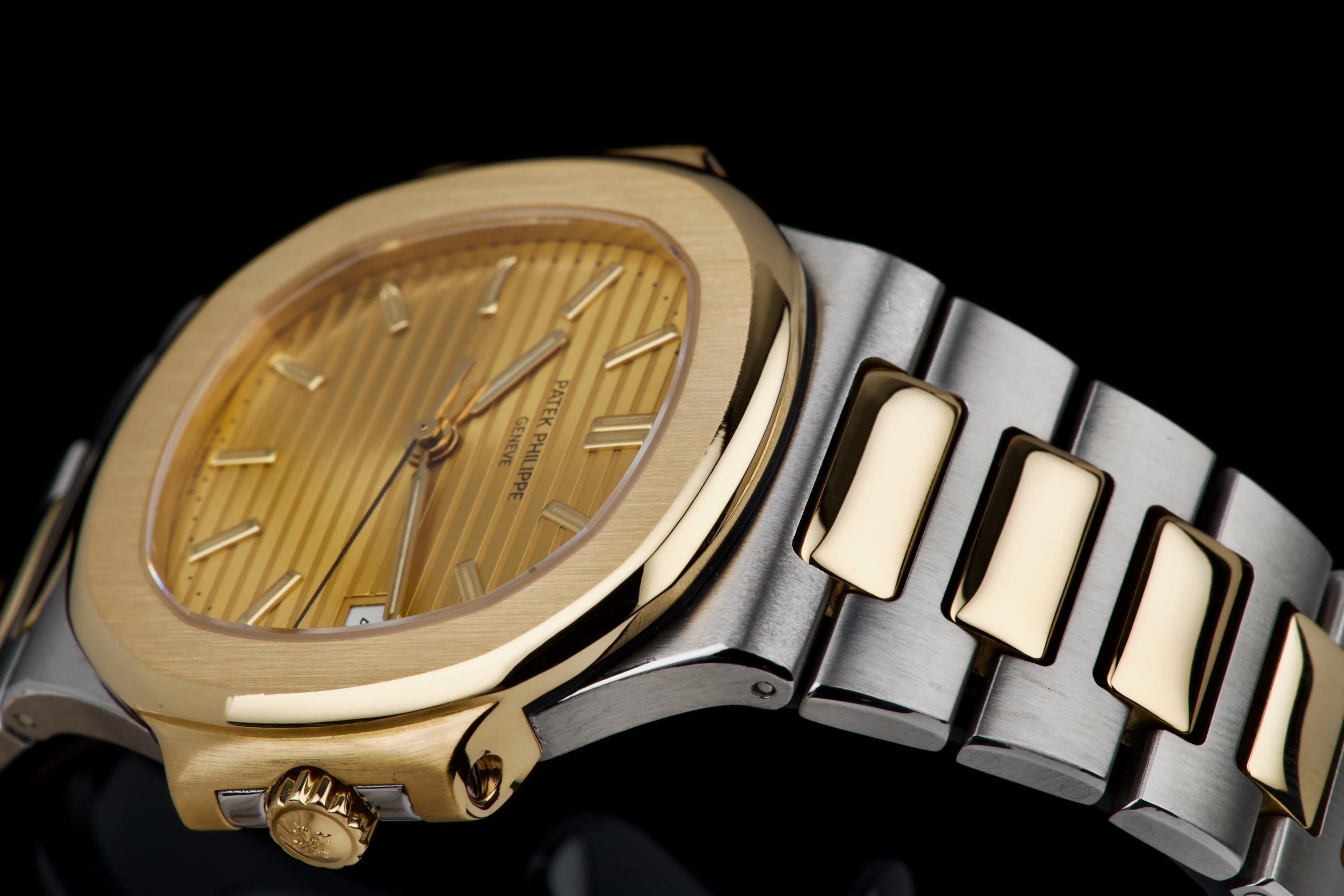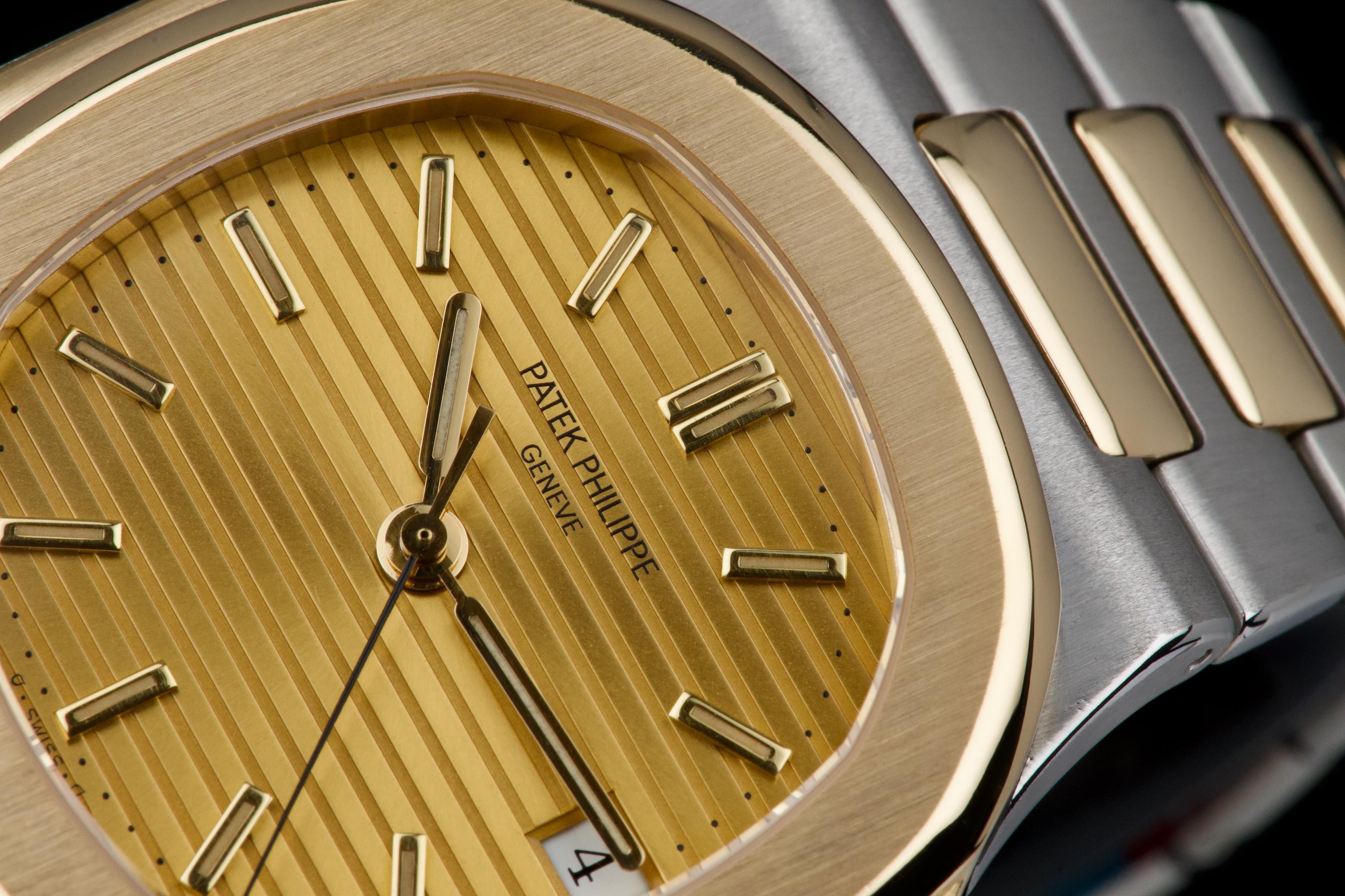 A beautiful and classic example of the two-tone Patek Philippe Nautilus reference 3800/1JA, featuring the sought-after gilt dial. This watch comes from its original owner and has just returned from a complete service and polish by Patek Philippein 2025. The original dial is flawless, with perfectly matching hands, and the two-tone gold and steel case and bracelet retain their crisp lines and elegant contrast. The bracelet shows moderate stretch from use, consistent with age. Accompanied by its original box, a copy of the Extract from the Archives confirming production in 1994 and sale in 1995, as well as the 2025 Patek Philippe service papers. A refined and timeless example of the Nautilus 3800 — beautifully maintained, freshly serviced, and preserved with its complete documentation.