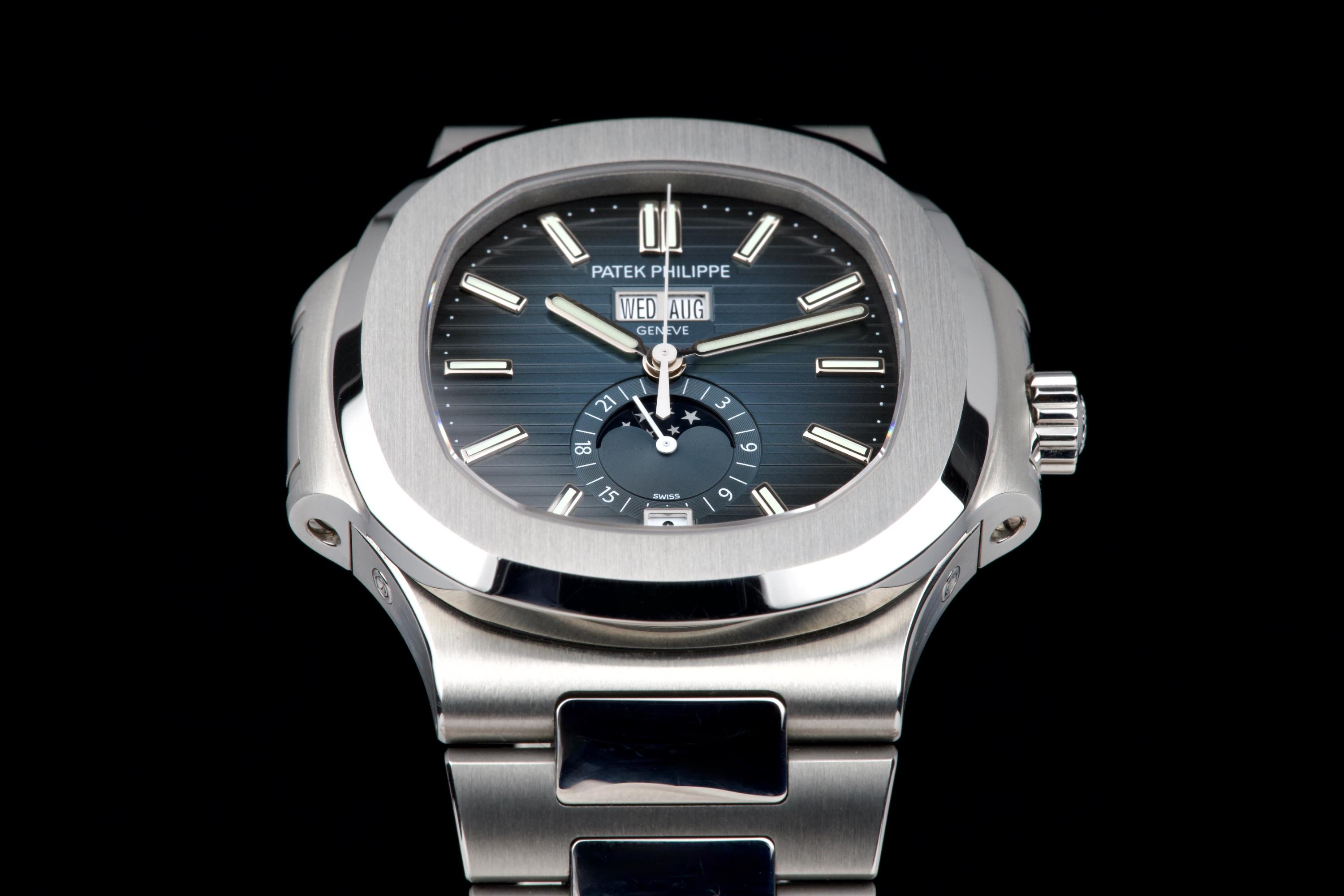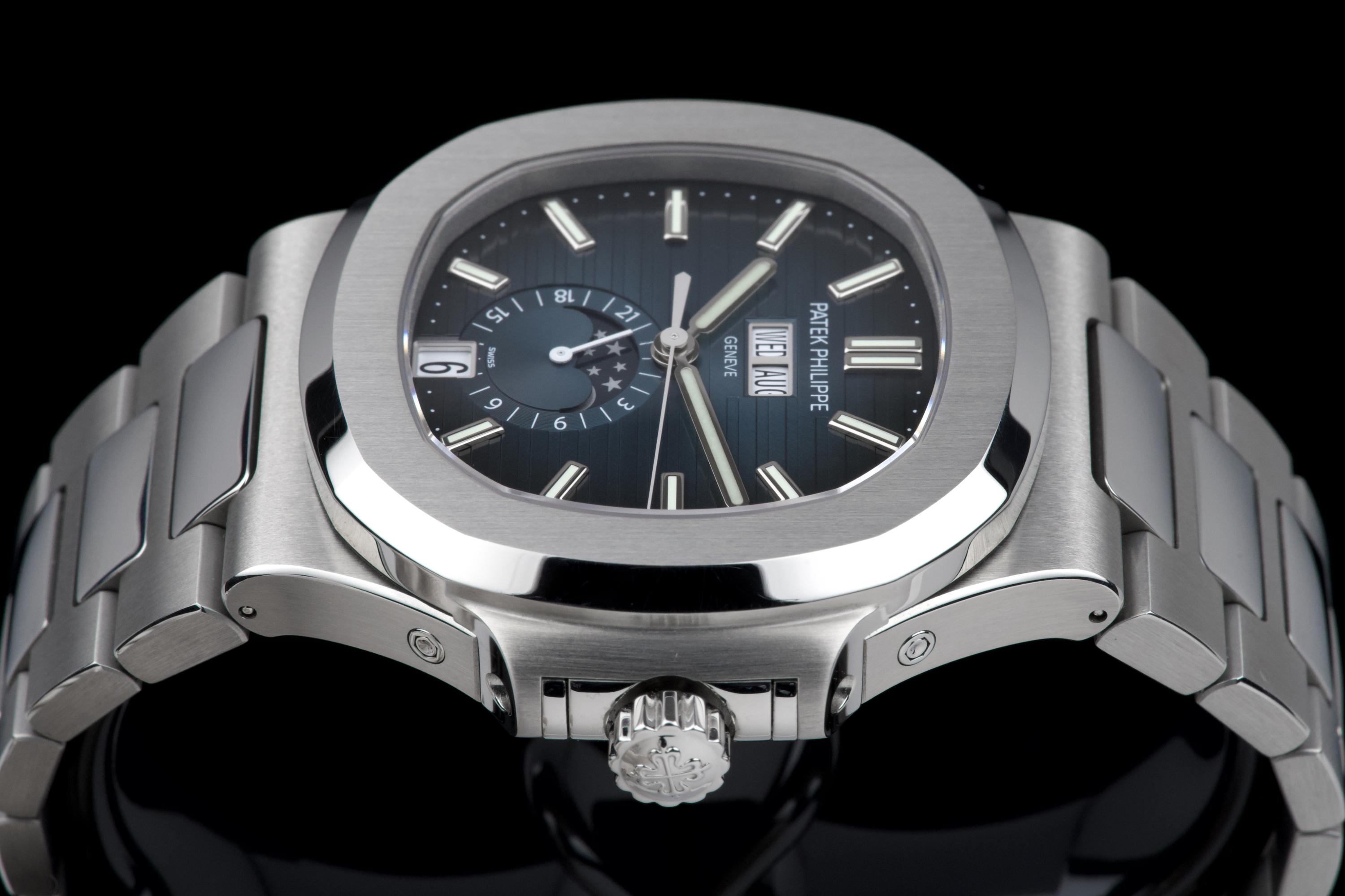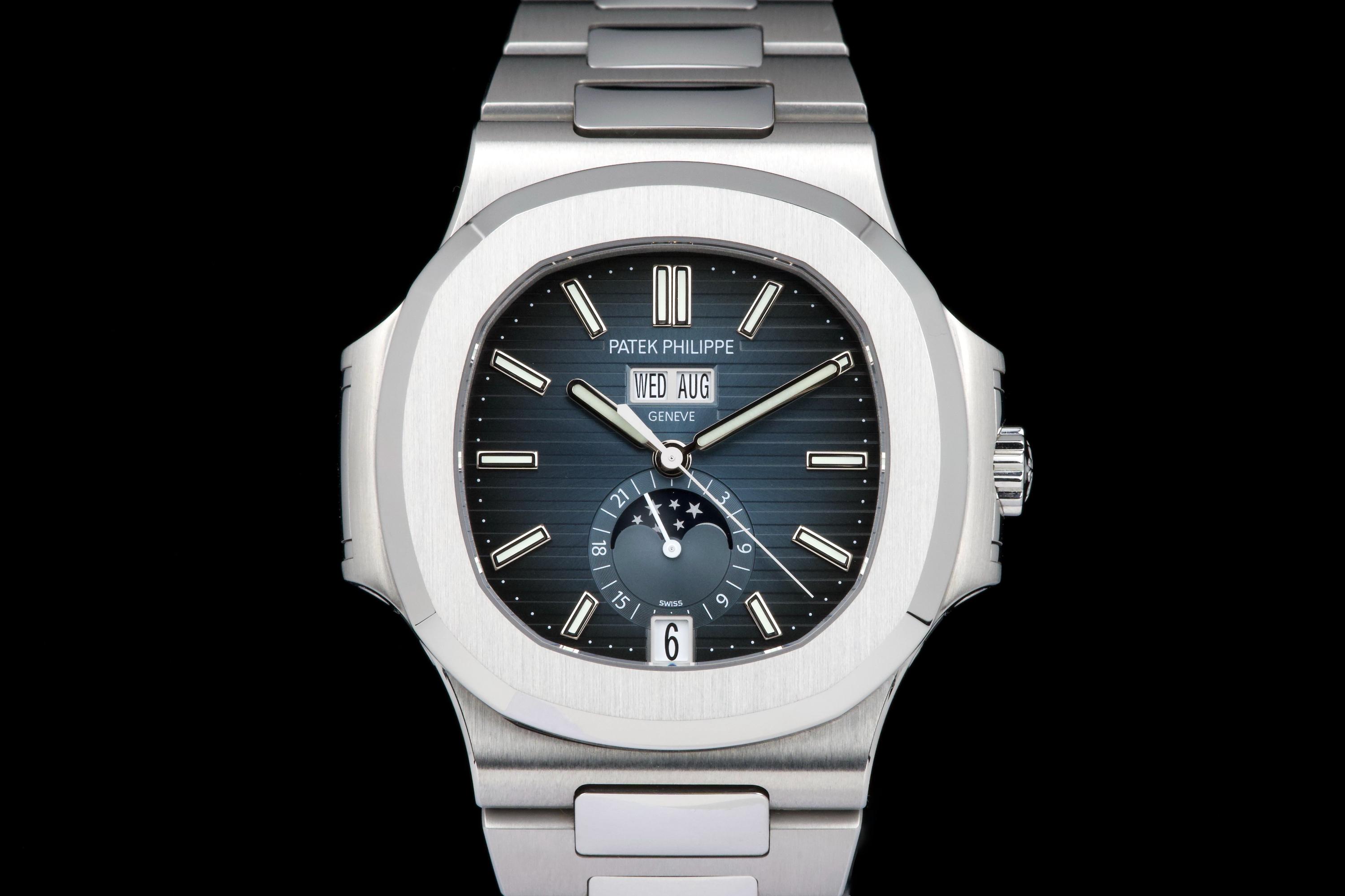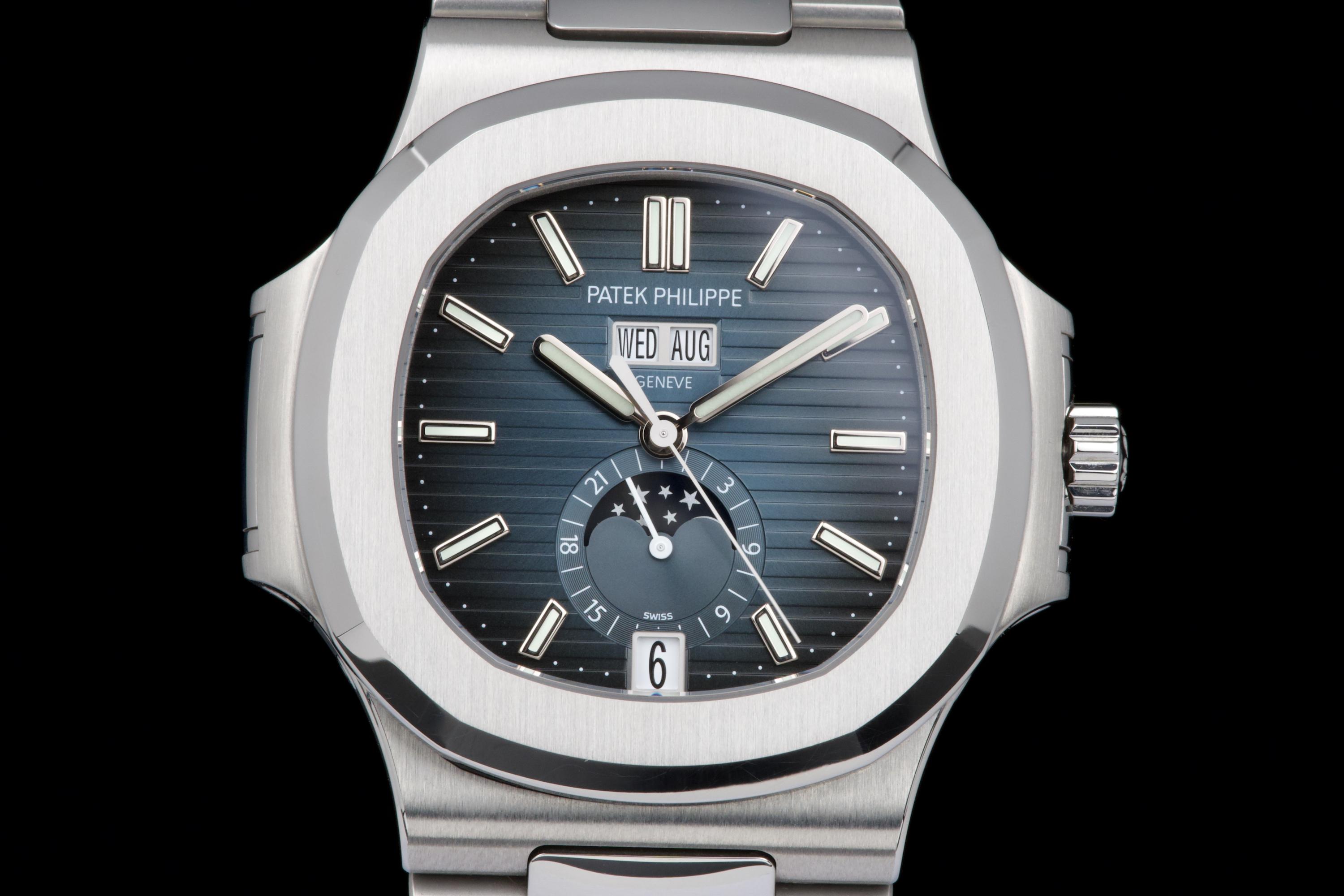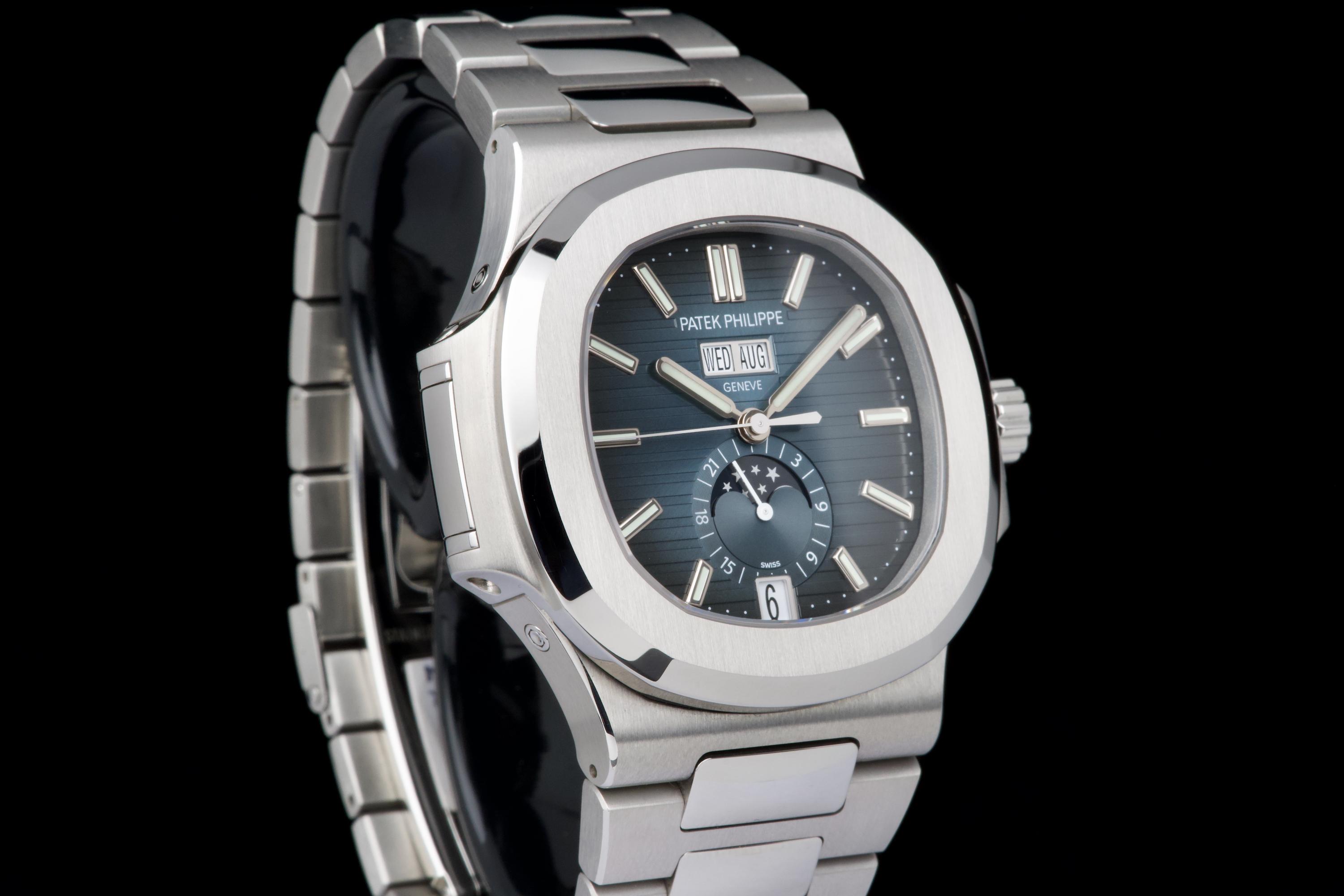 A superb example of the stainless steel Nautilus 5726 with blue gradient dial, reference 5726/1A-014, coming from its first and only owner. Originally sold in Switzerland in 2021, this piece remains unpolished and shows extremely light signs of wear, having been worn only a few times. This version features the earlier-style folding clasp, paired with the elegant horizontally embossed blue dial that shifts from deep navy to black at the edges. The watch displays day, date, month, moonphase and 24-hour indication, powered by the automatic caliber 324 S QA LU 24H/303 — combining Patek Philippe’s Annual Calendar complication with the iconic Nautilus design. The 40.5 mm stainless steel case and integrated bracelet remain in outstanding condition throughout. Complete with its original box, certificate of origin, booklets, and accessories. A beautiful, lightly worn, single-owner example of the highly sought-after Nautilus 5726/1A-014 — one of the most elegant and functional expressions of the Nautilus line.