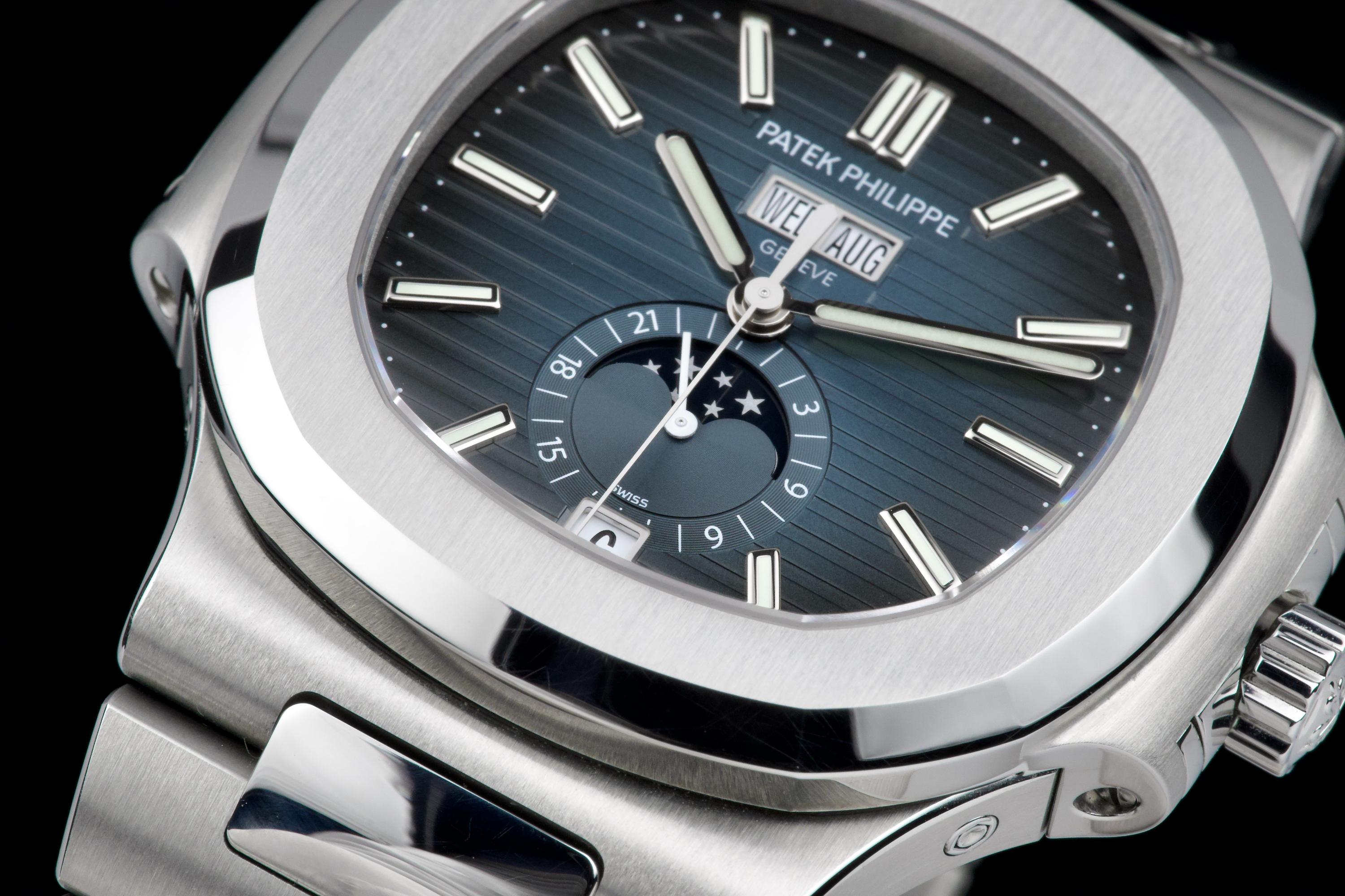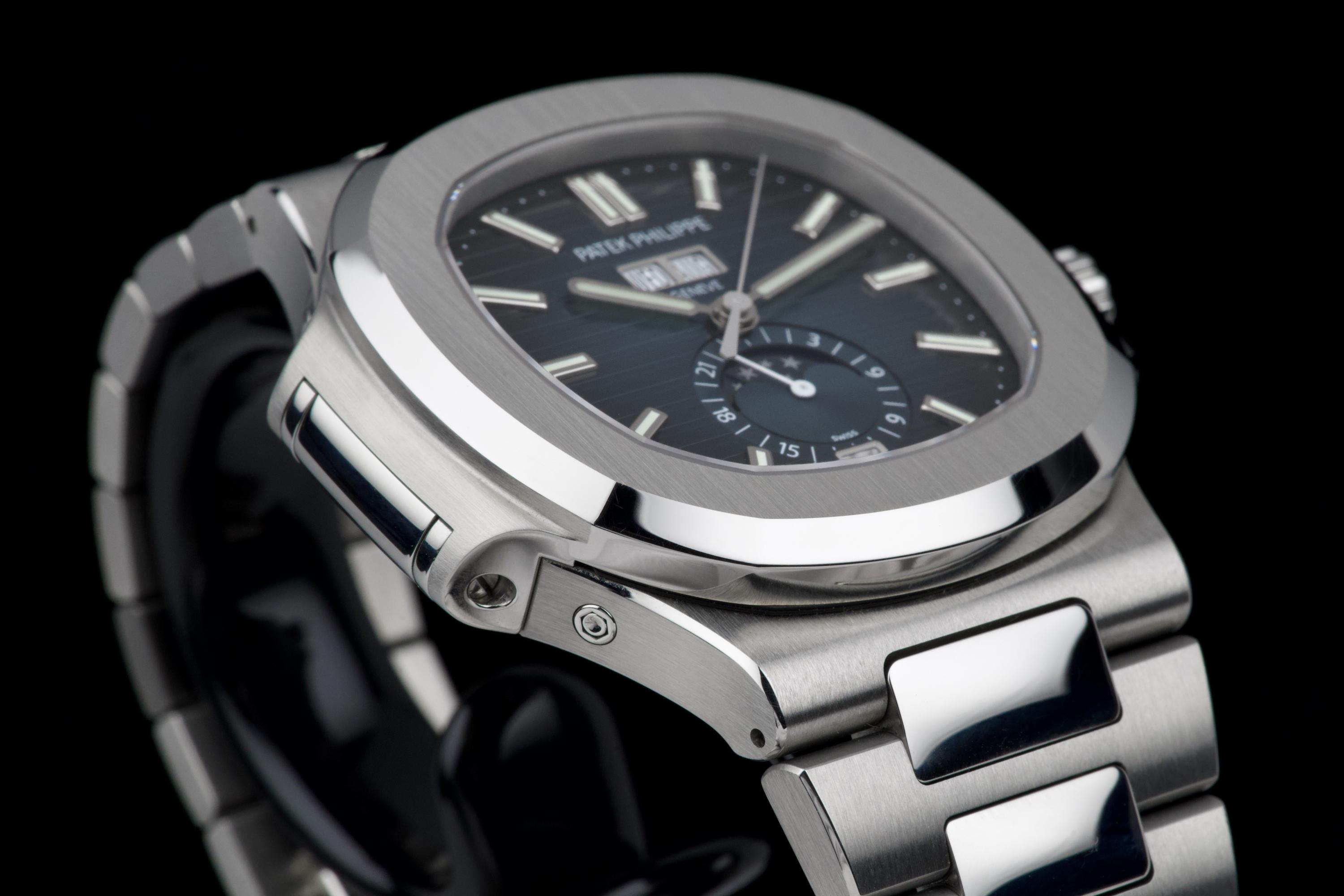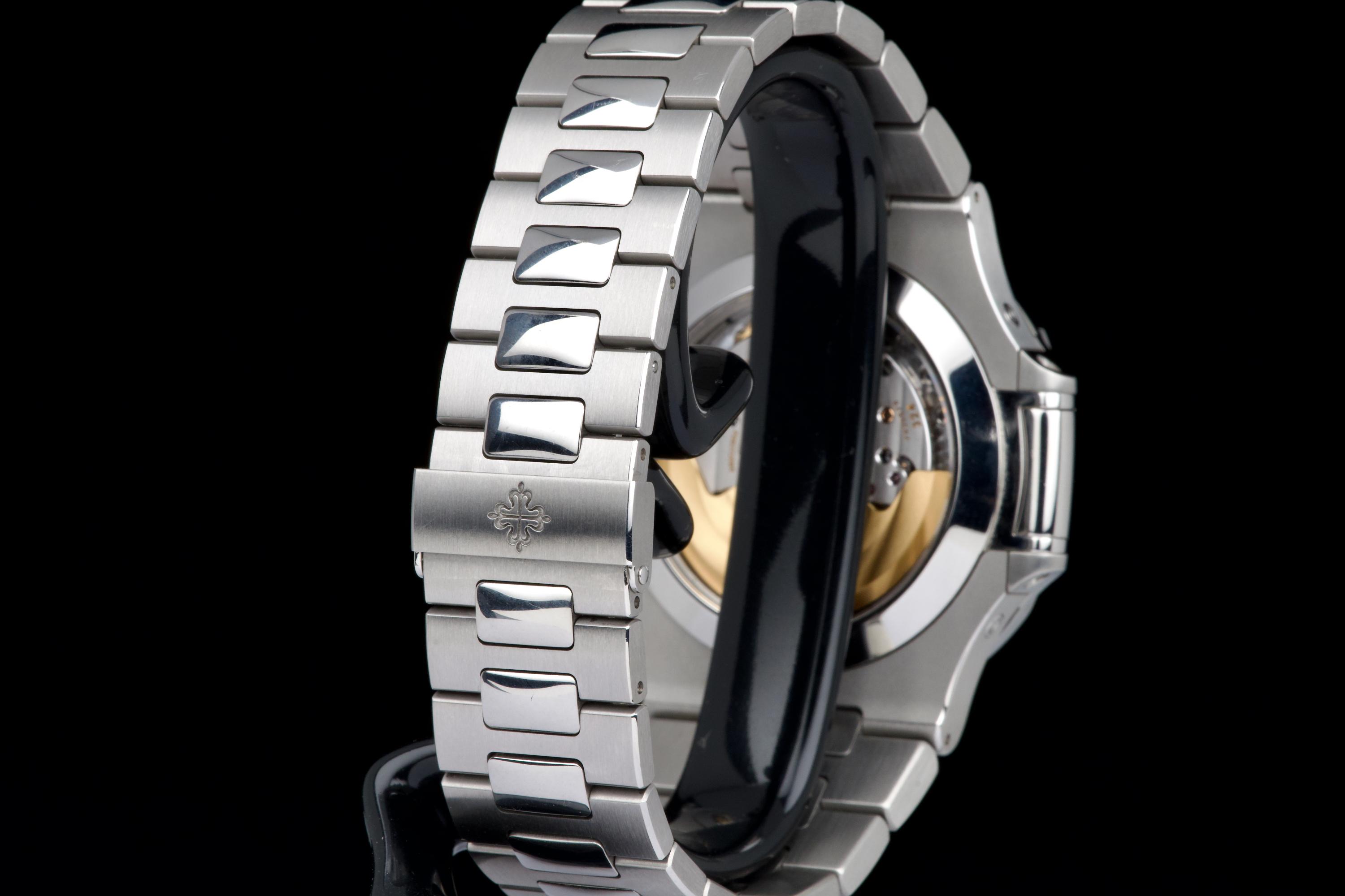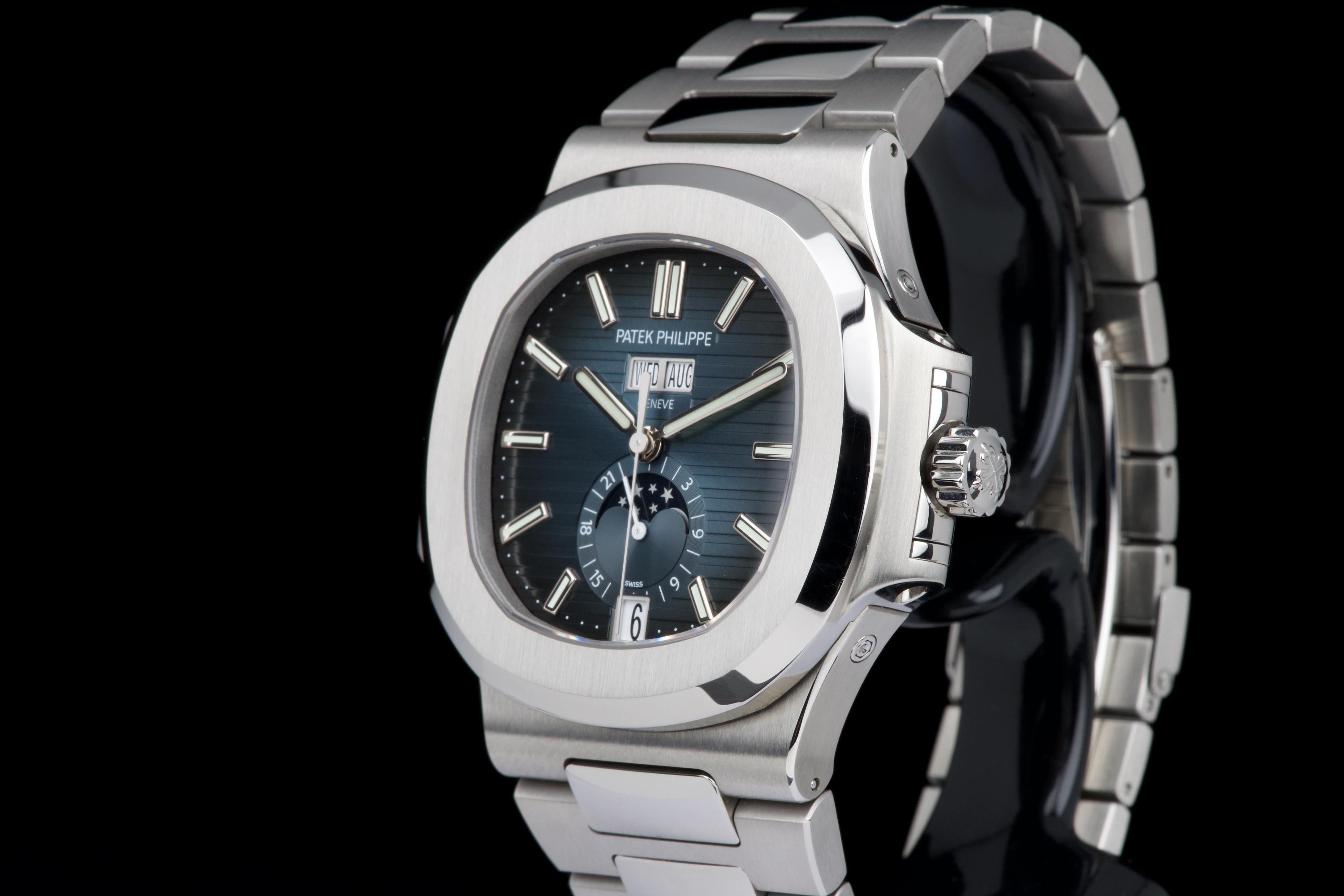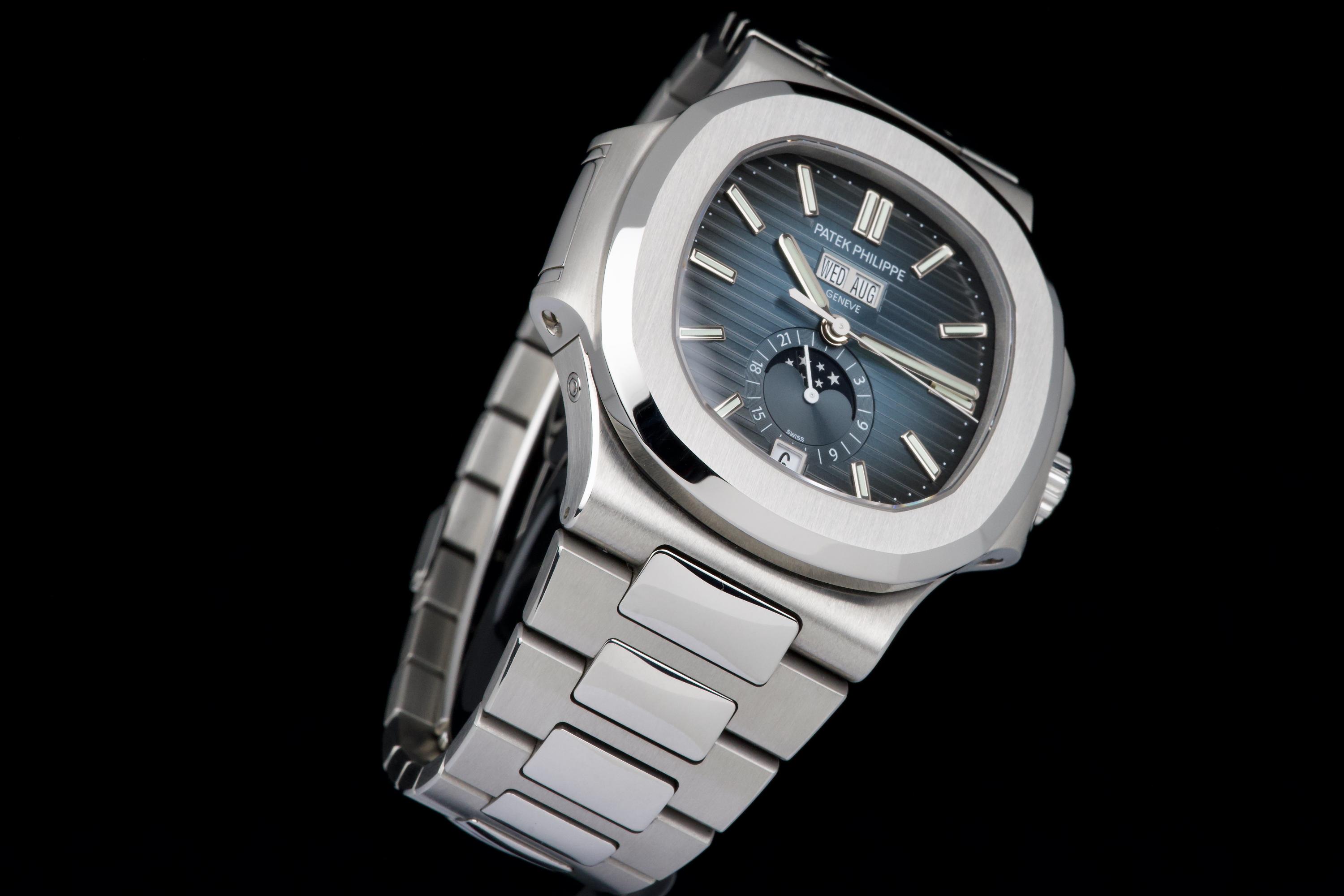 A superb example of the stainless steel Nautilus 5726 with blue gradient dial, reference 5726/1A-014, coming from its first and only owner. Originally sold in Switzerland in 2021, this piece remains unpolished and shows extremely light signs of wear, having been worn only a few times. This version features the earlier-style folding clasp, paired with the elegant horizontally embossed blue dial that shifts from deep navy to black at the edges. The watch displays day, date, month, moonphase and 24-hour indication, powered by the automatic caliber 324 S QA LU 24H/303 — combining Patek Philippe’s Annual Calendar complication with the iconic Nautilus design. The 40.5 mm stainless steel case and integrated bracelet remain in outstanding condition throughout. Complete with its original box, certificate of origin, booklets, and accessories. A beautiful, lightly worn, single-owner example of the highly sought-after Nautilus 5726/1A-014 — one of the most elegant and functional expressions of the Nautilus line.