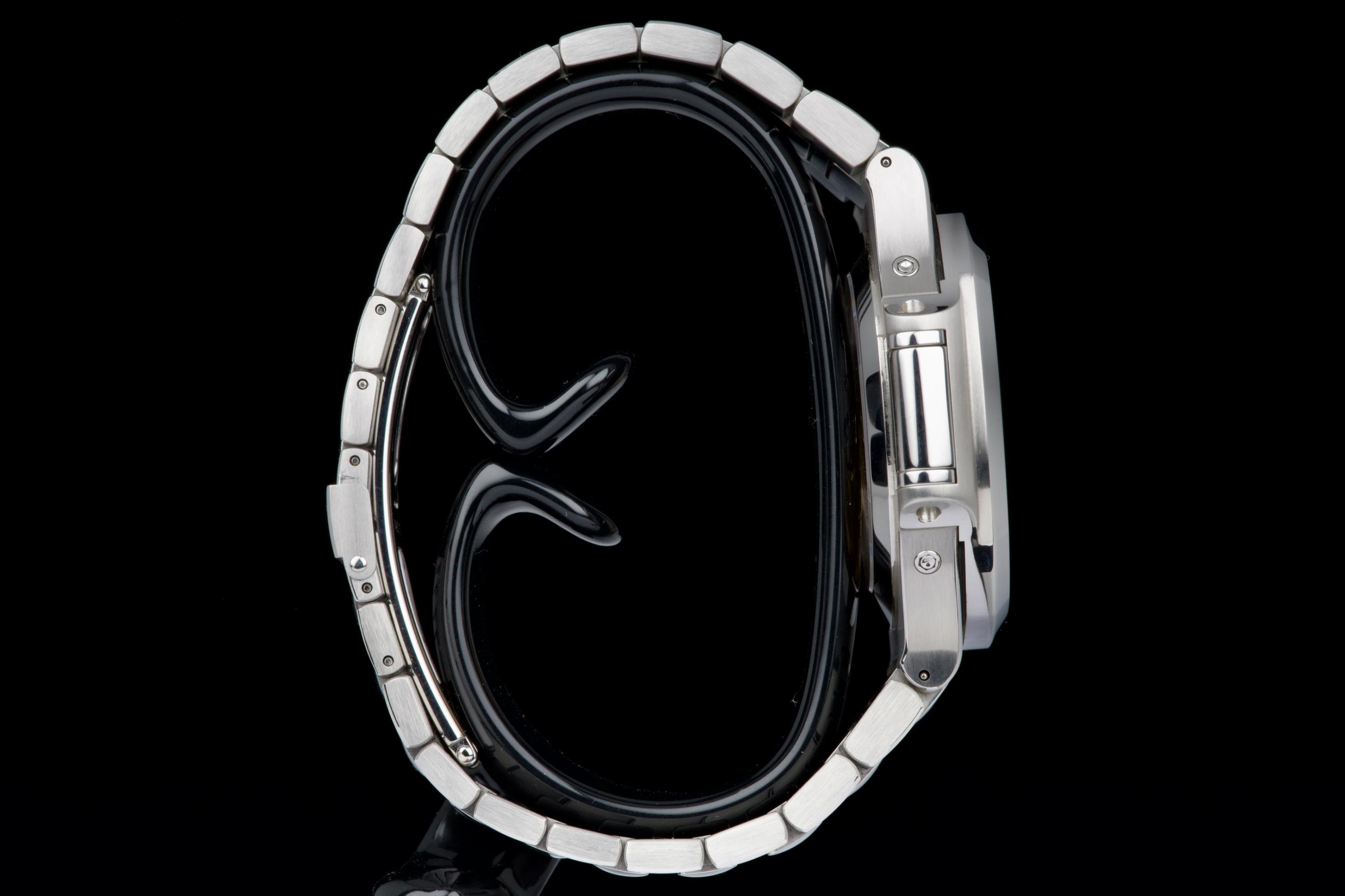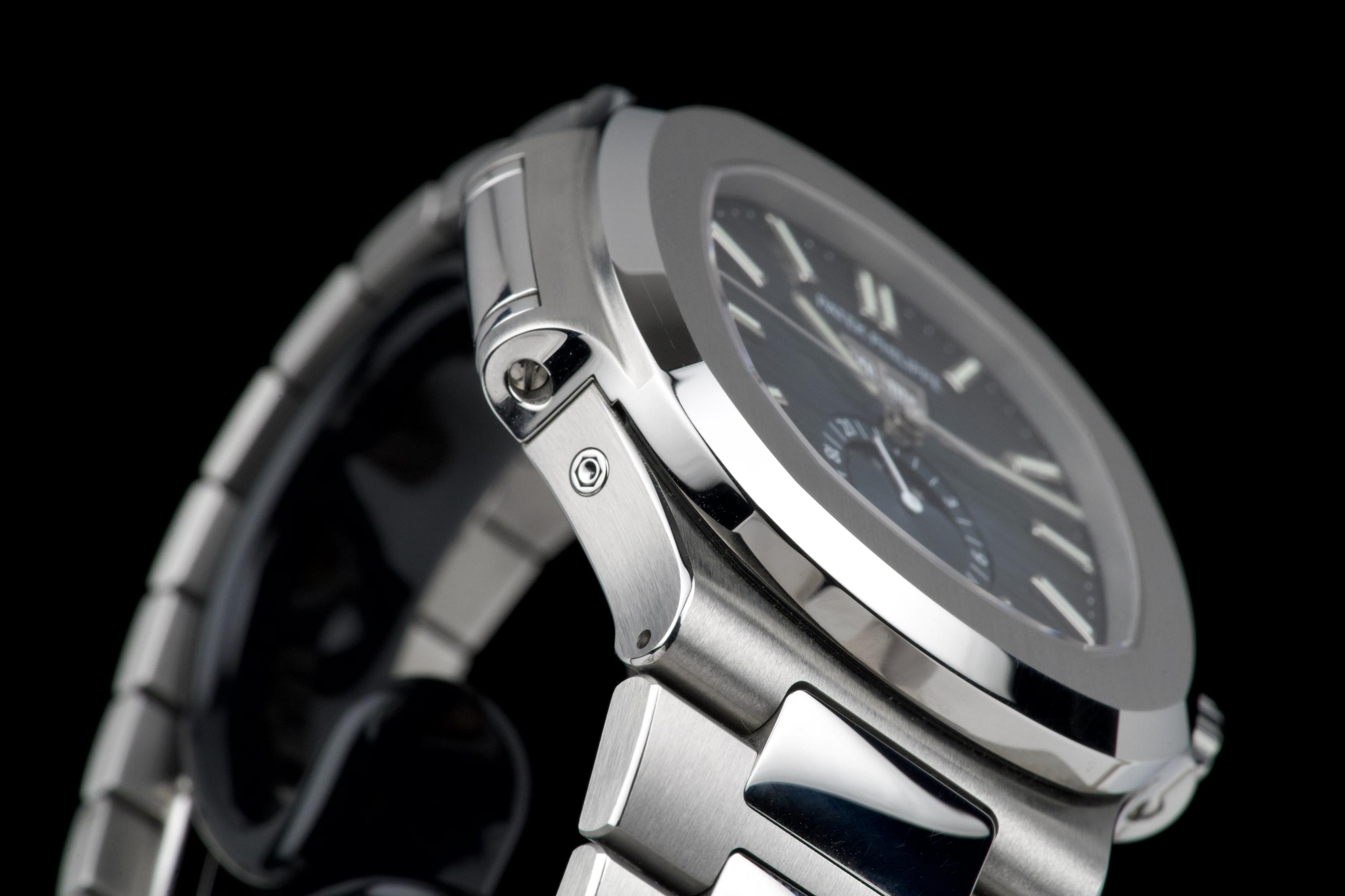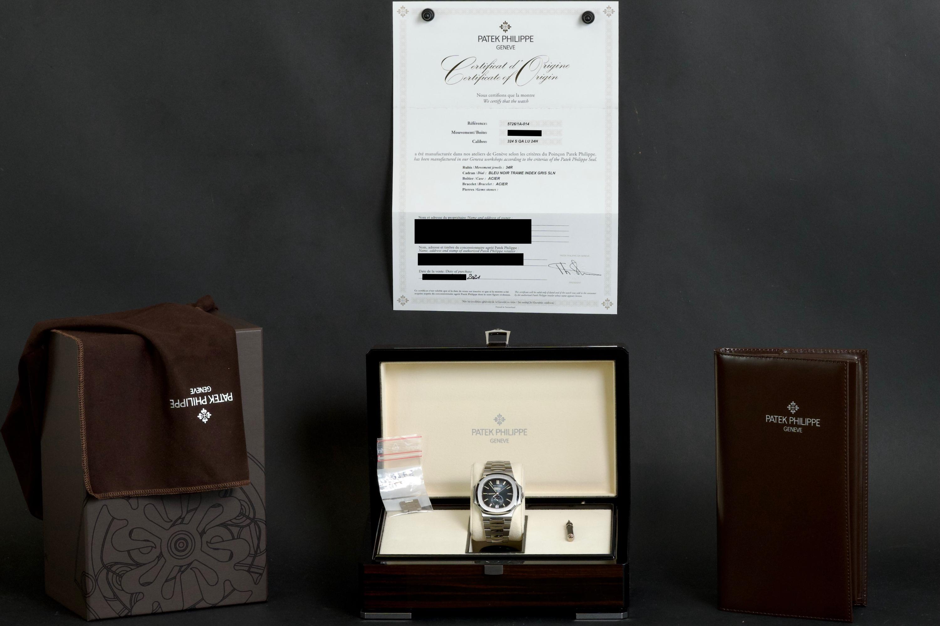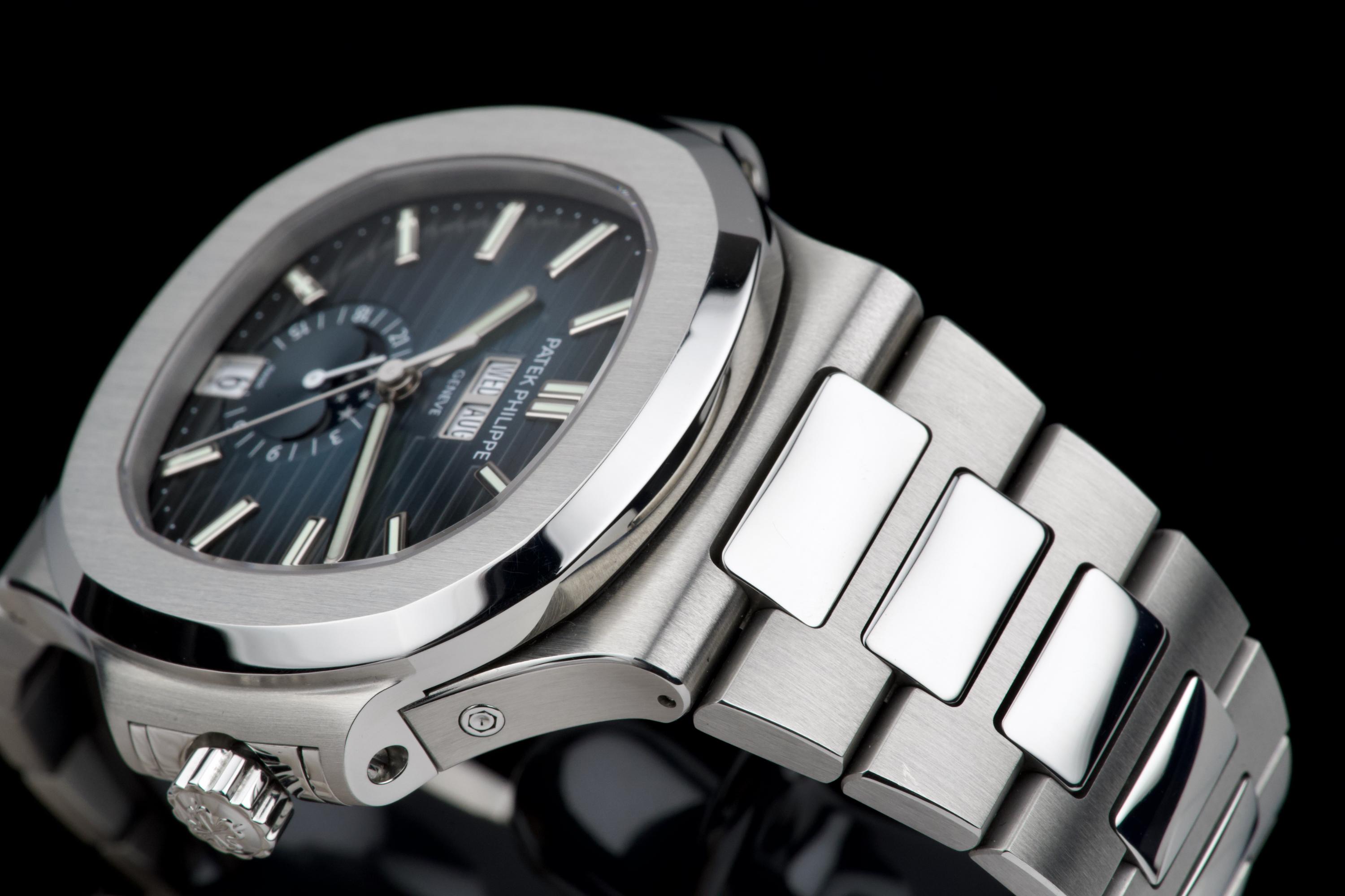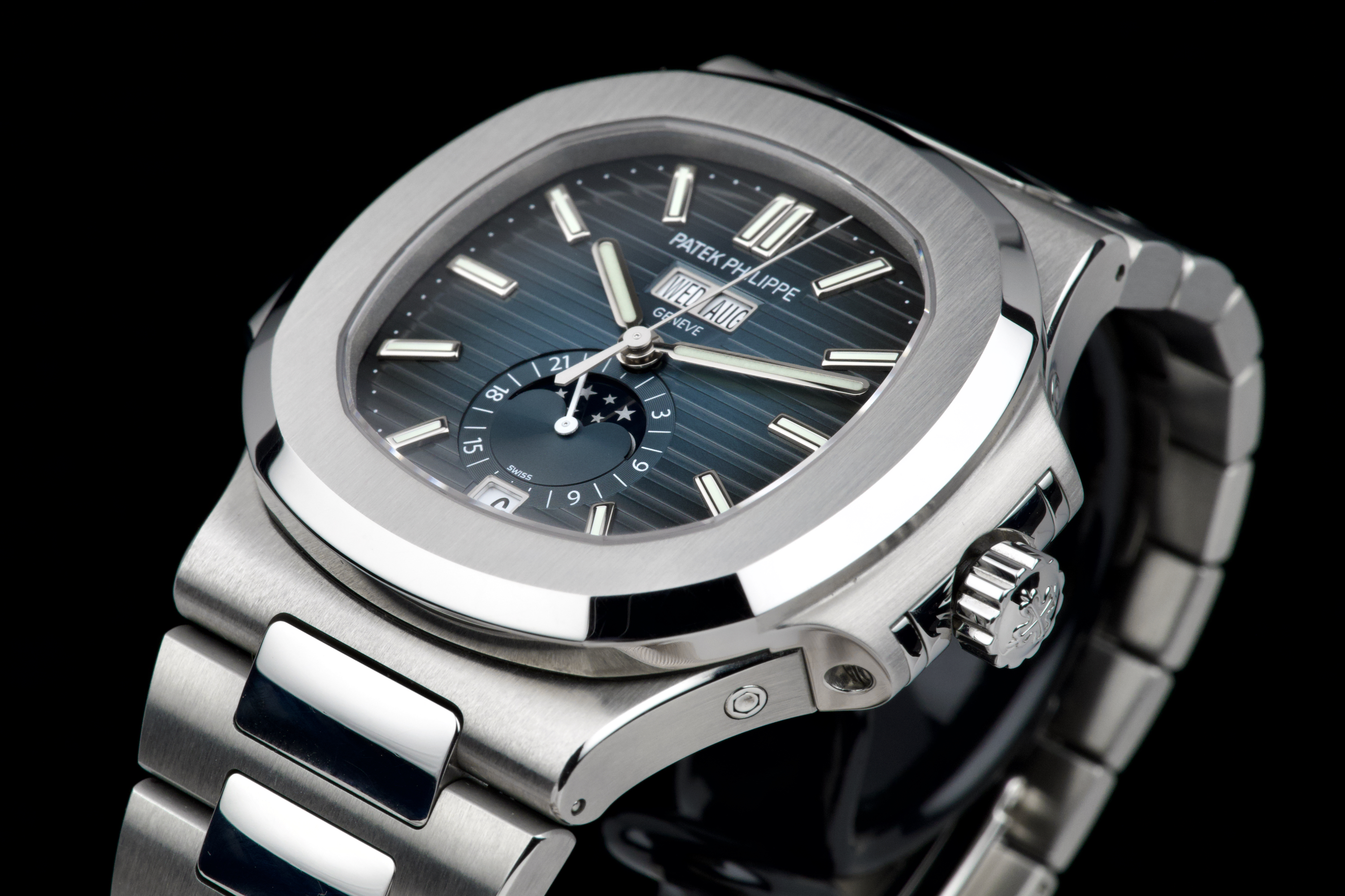 A superb example of the stainless steel Nautilus 5726 with blue gradient dial, reference 5726/1A-014, coming from its first and only owner. Originally sold in Switzerland in 2021, this piece remains unpolished and shows extremely light signs of wear, having been worn only a few times. This version features the earlier-style folding clasp, paired with the elegant horizontally embossed blue dial that shifts from deep navy to black at the edges. The watch displays day, date, month, moonphase and 24-hour indication, powered by the automatic caliber 324 S QA LU 24H/303 — combining Patek Philippe’s Annual Calendar complication with the iconic Nautilus design. The 40.5 mm stainless steel case and integrated bracelet remain in outstanding condition throughout. Complete with its original box, certificate of origin, booklets, and accessories. A beautiful, lightly worn, single-owner example of the highly sought-after Nautilus 5726/1A-014 — one of the most elegant and functional expressions of the Nautilus line.