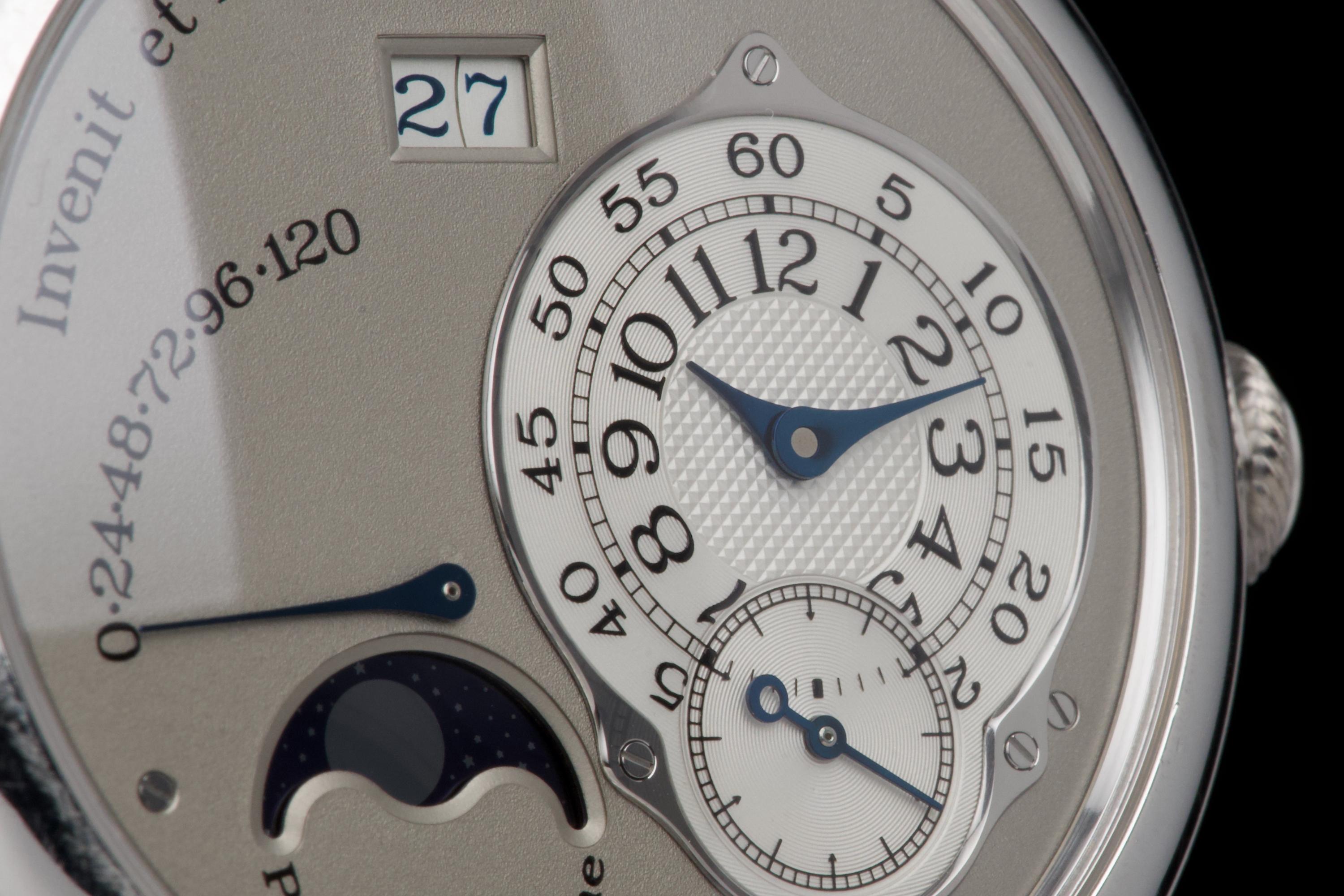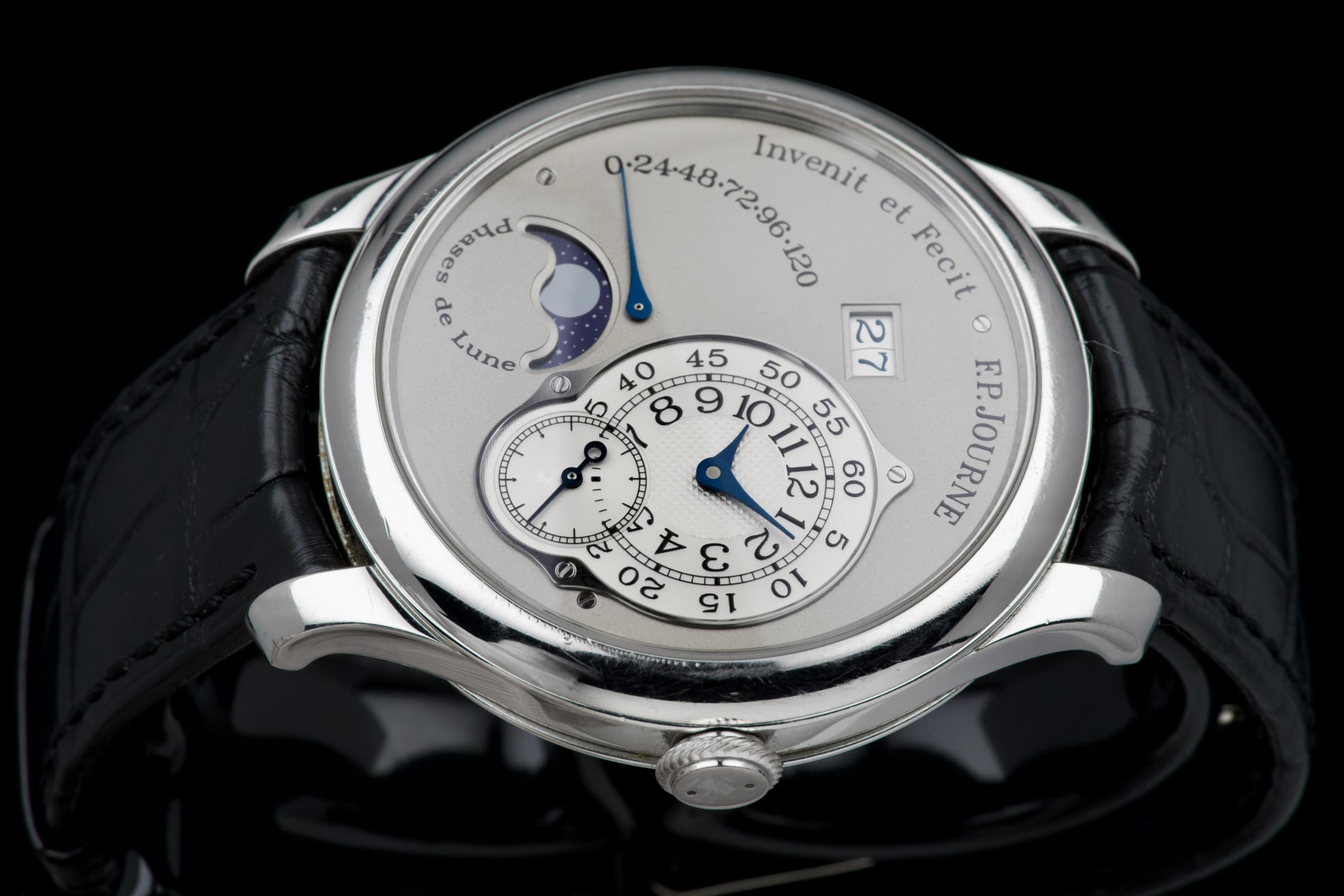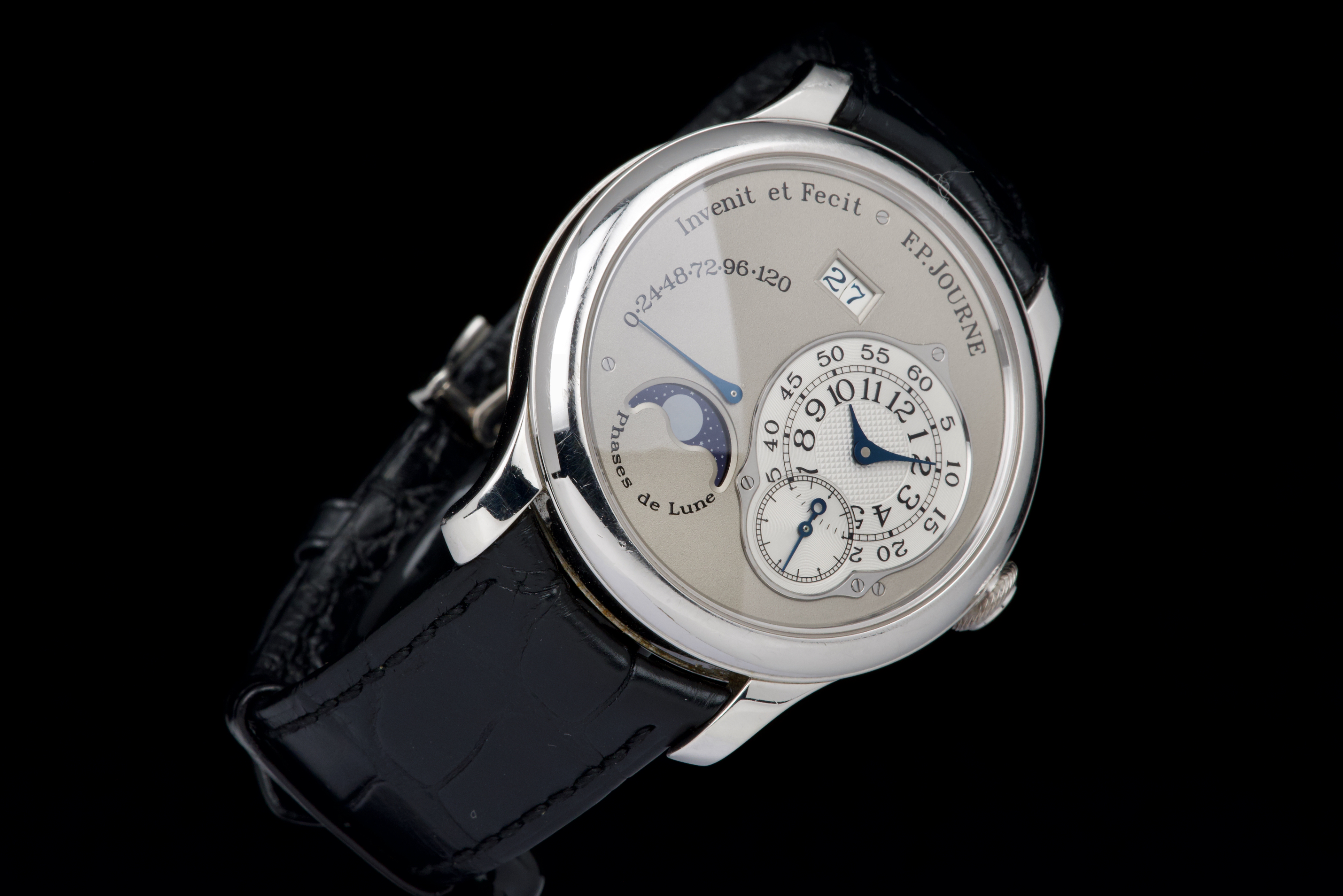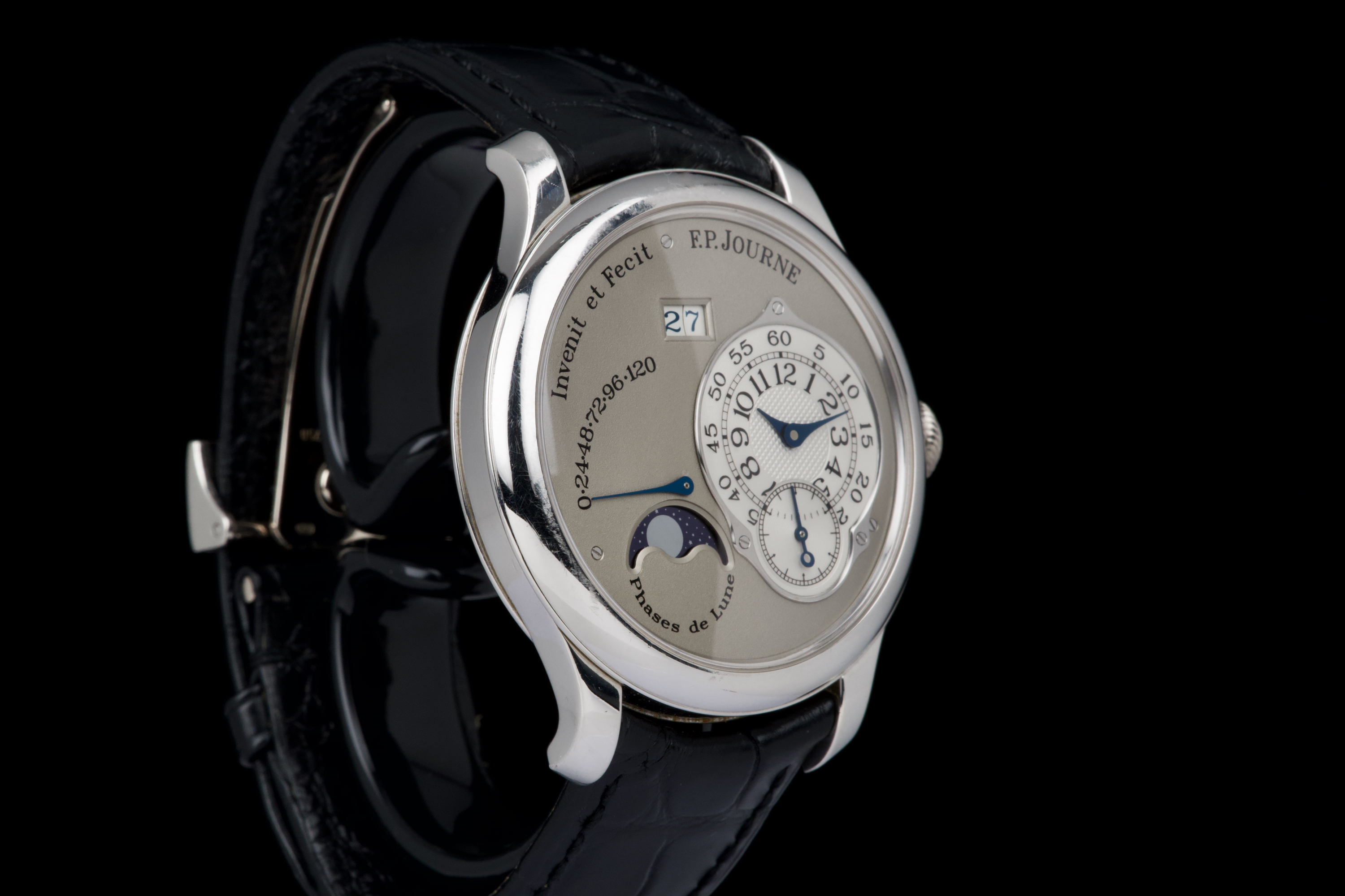 A well-preserved and honest example of the F.P. Journe Octa Lune in platinum with grey dial, sold new in Moscow in 2007. The watch remains unpolished, showing numerous surface scratches from wear, yet no deep dents or damage to the case. The dial is flawless, displaying the elegant and balanced layout typical of the early Octa series. Powered by the automatic F.P. Journe caliber 1300.2, crafted in solid 18K rose gold, and in perfect working order. Complete with its original box and papers. A superb early Octa Lune in platinum — unpolished, fully original, and with beautiful provenance from the Mercury Moscow boutique.