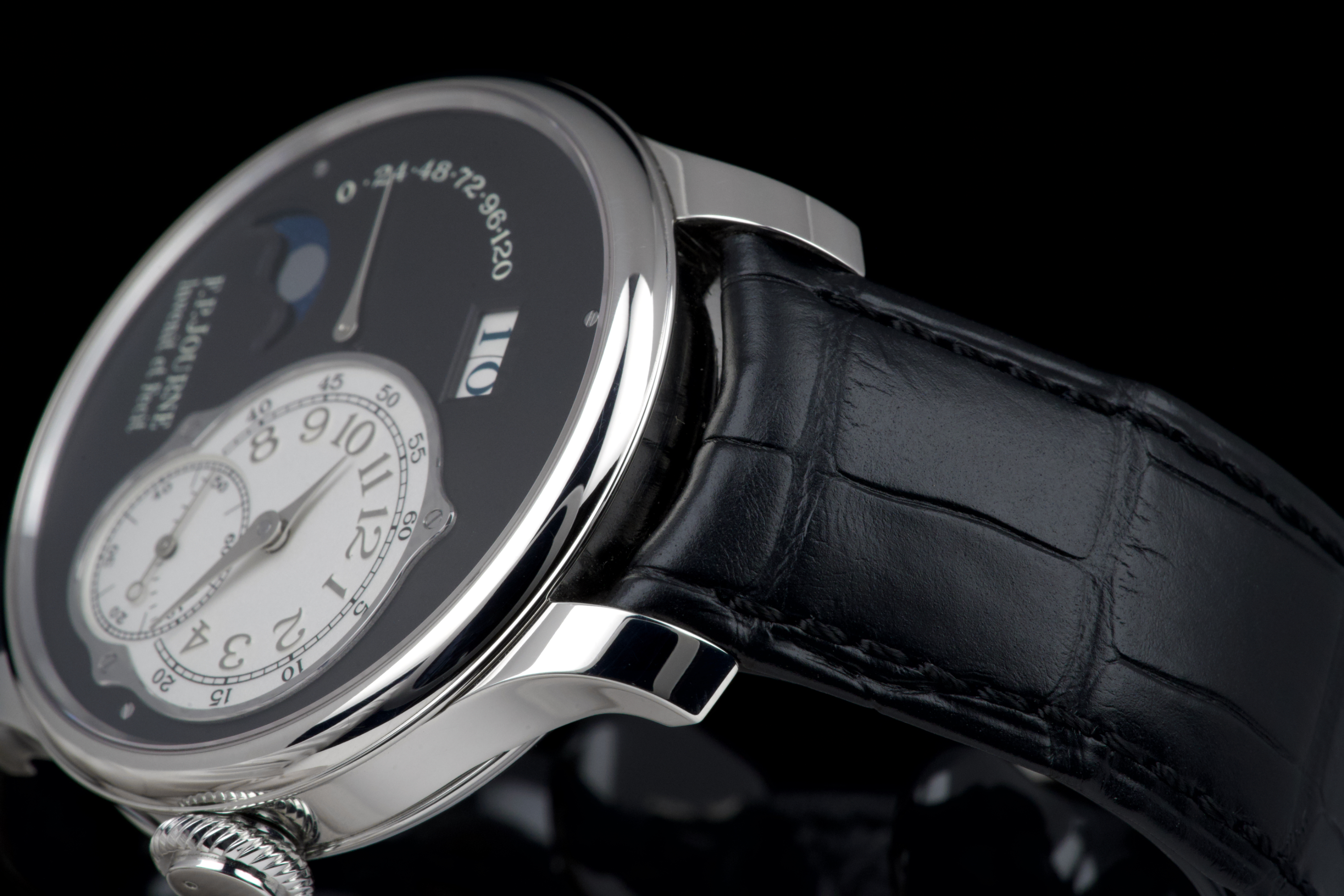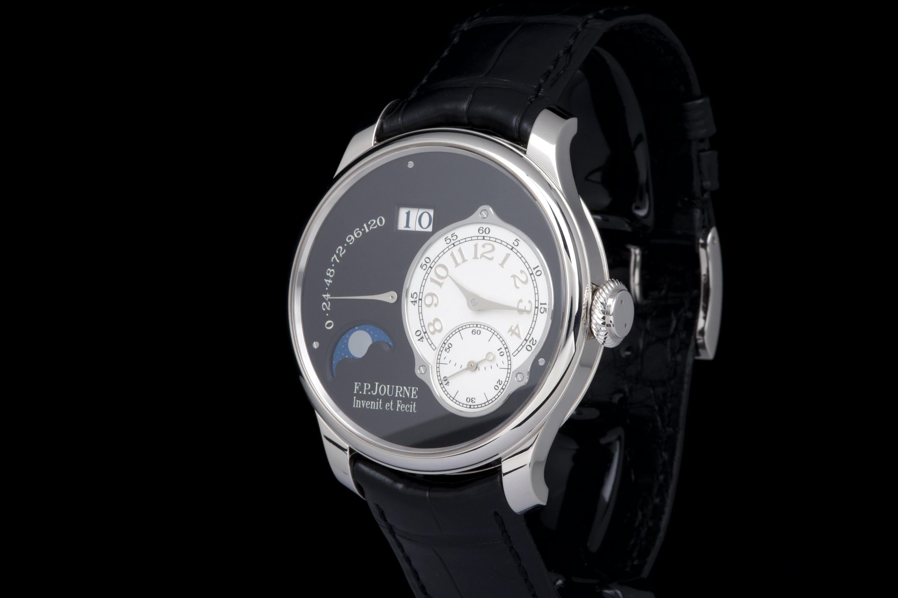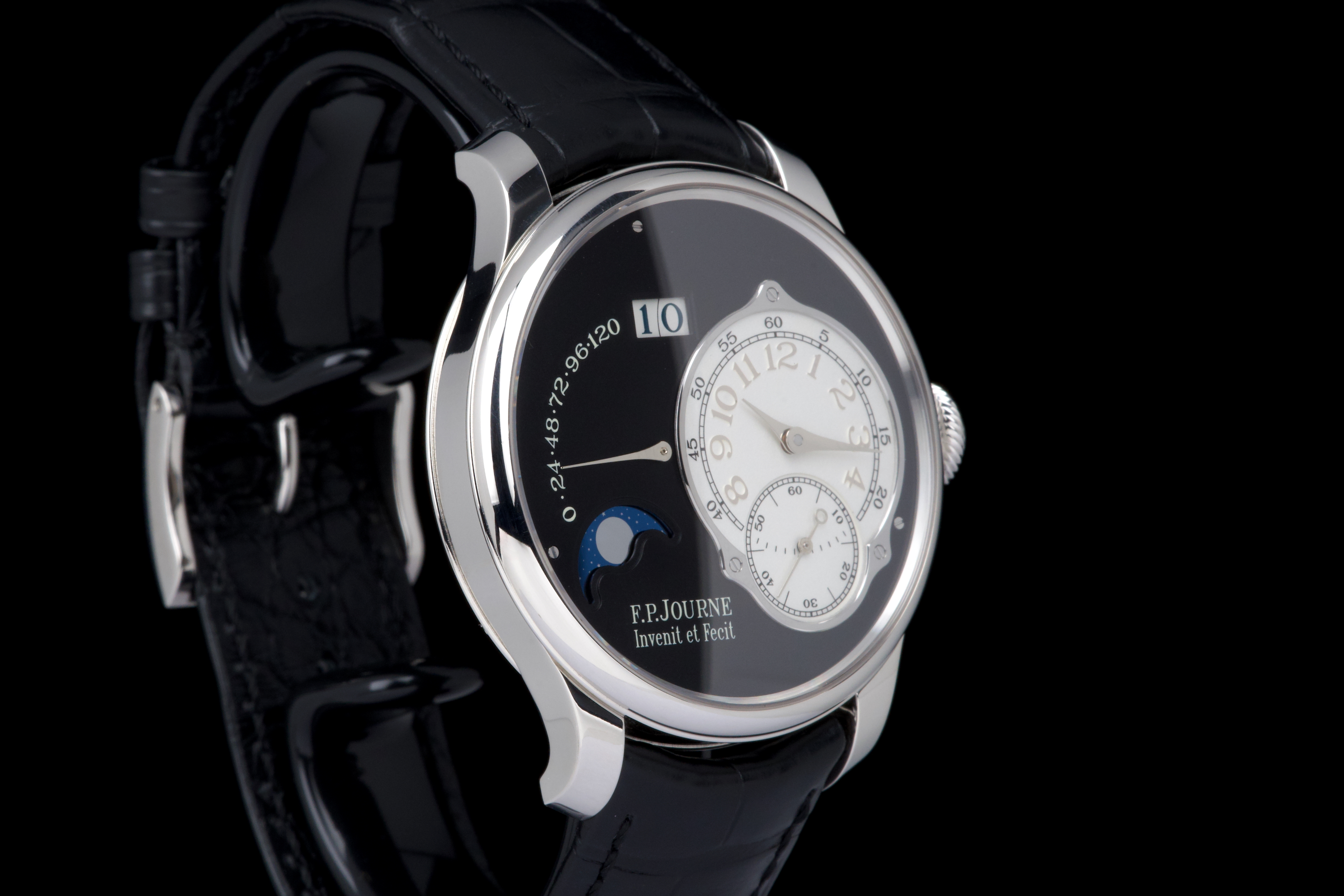 A superb example of the highly exclusive F.P. Journe Octa Lune Black Label, crafted in platinum and available only to existing F.P. Journe owners. The watch remains unpolished and shows extremely light wear from careful use. The deep black lacquer dialcontrasts beautifully with the white gold hands and applied numerals, while the moonphase and power reserve displays preserve perfect legibility and balance. Powered by the automatic F.P. Journe caliber 1300.3 in solid 18K rose gold, visible through the sapphire caseback. Complete with its original box, warranty card, and accessories. A rare opportunity to acquire one of the most coveted variants of the Octa Lune — elegant, exclusive, and beautifully preserved.