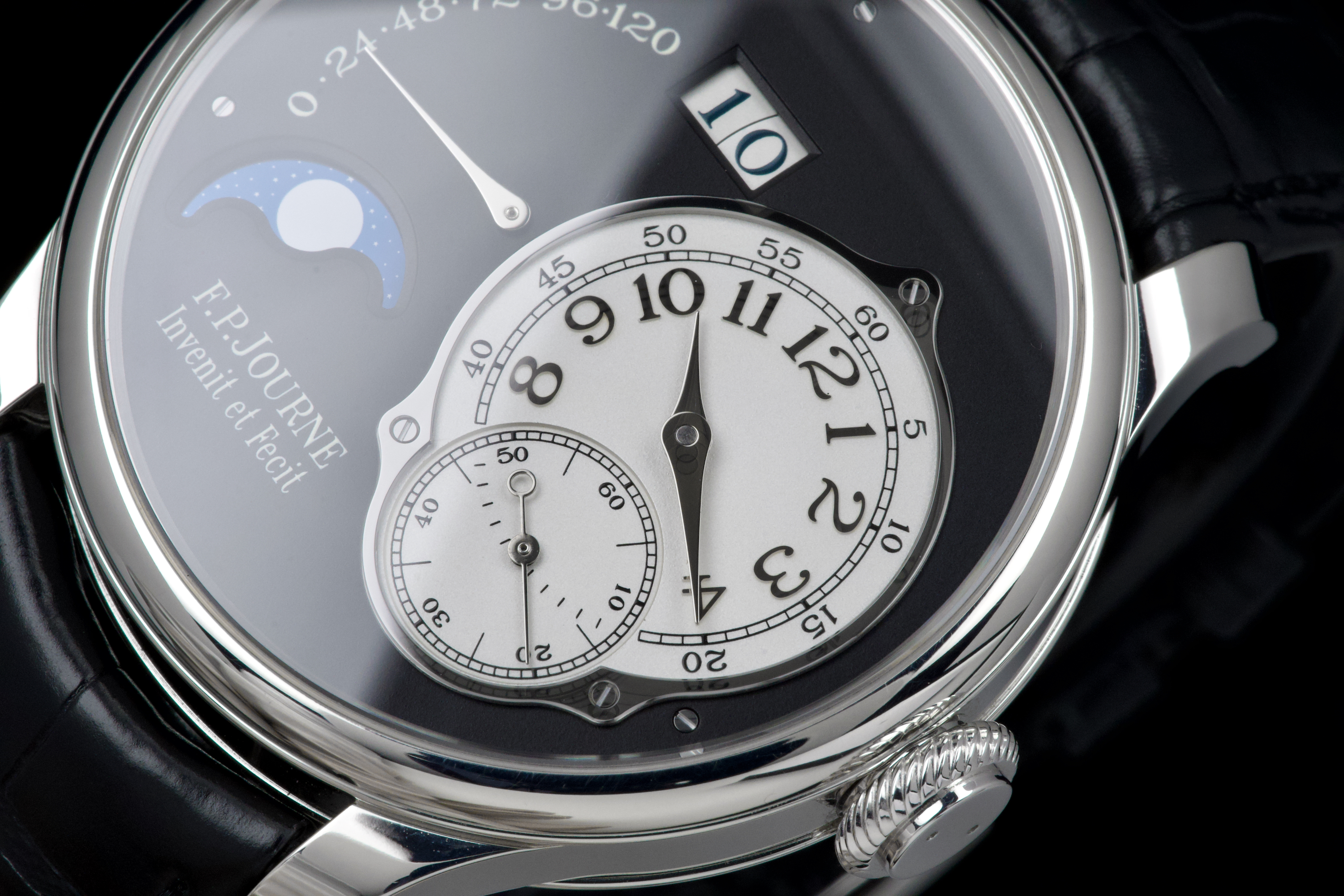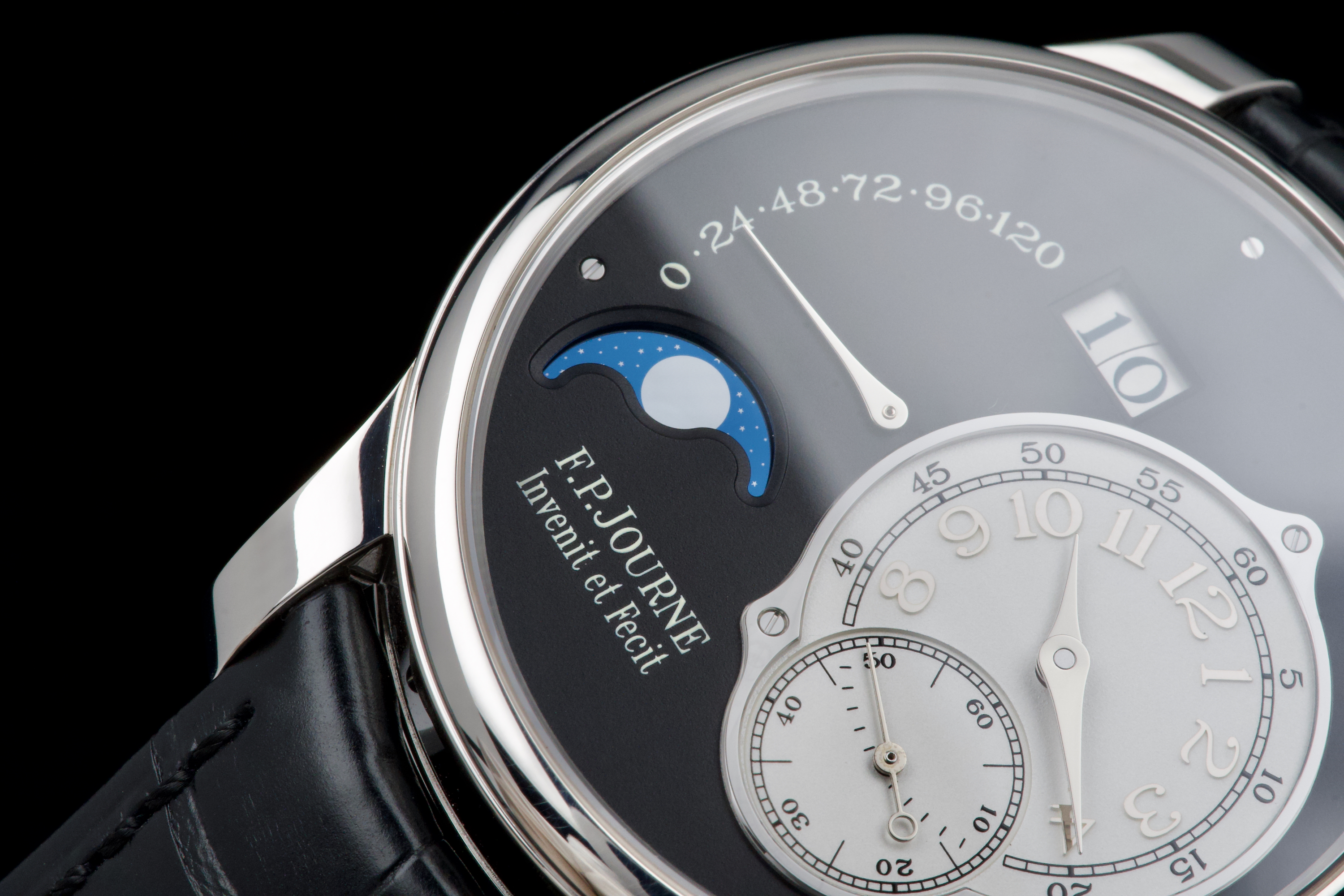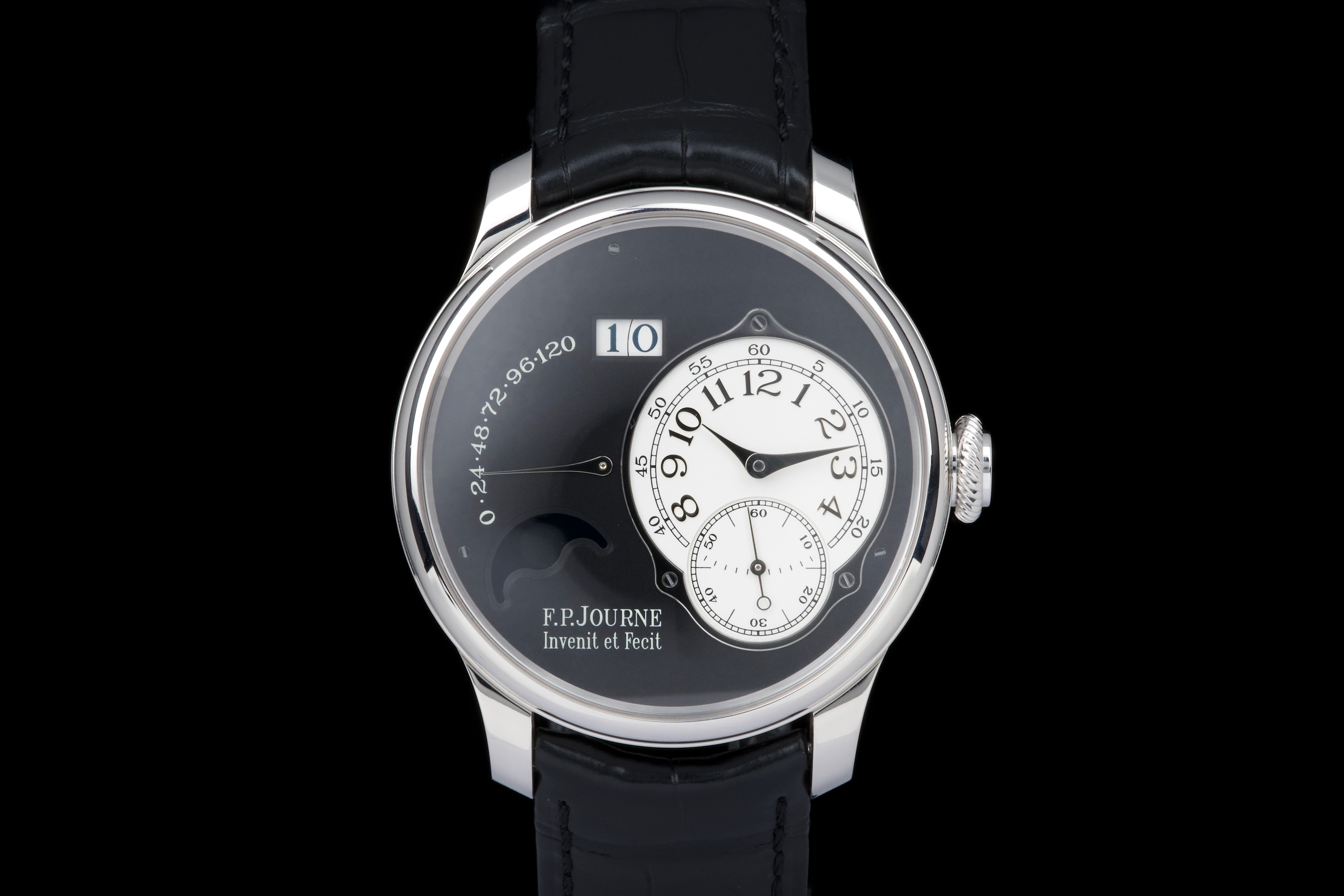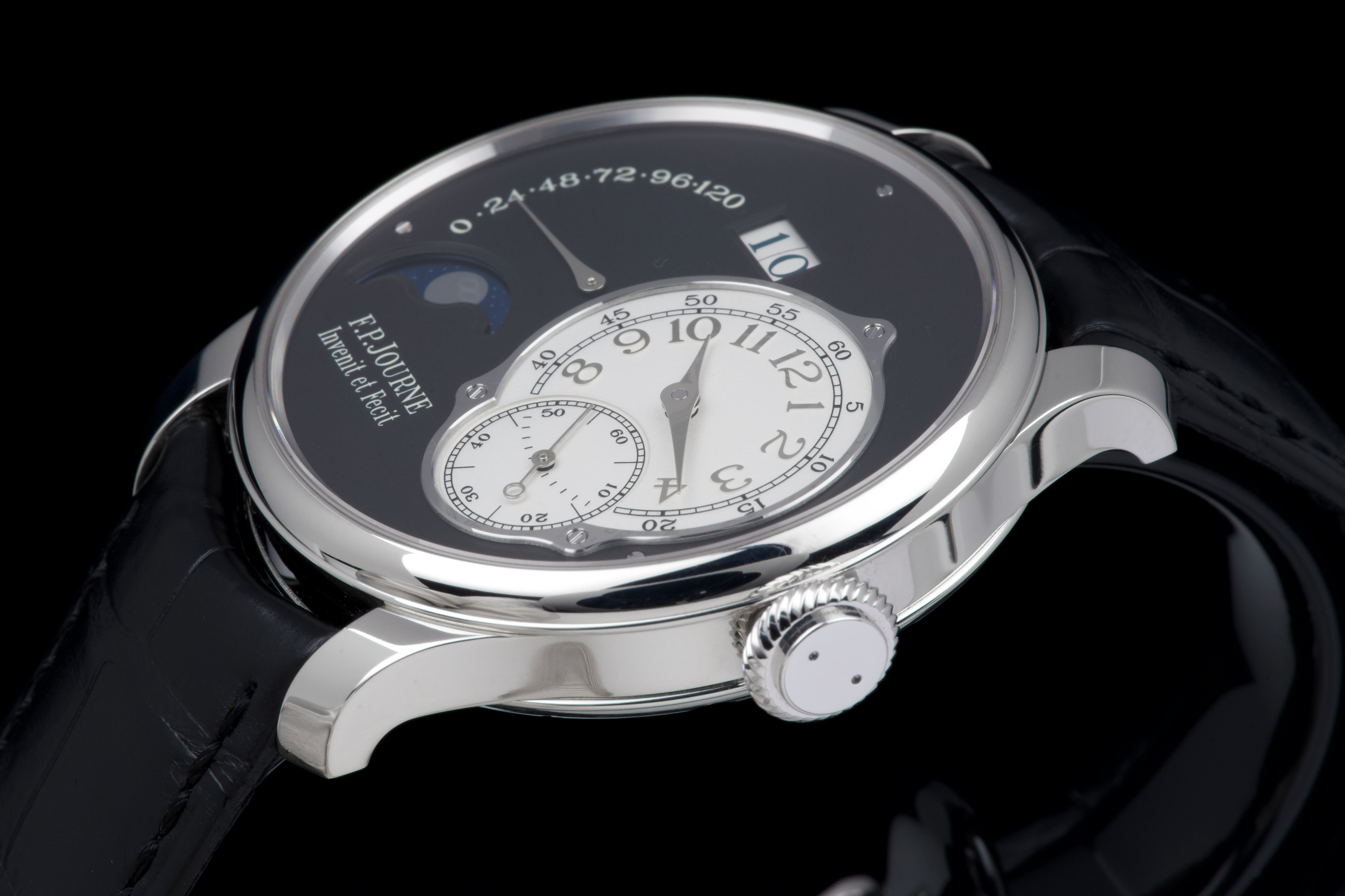 A superb example of the highly exclusive F.P. Journe Octa Lune Black Label, crafted in platinum and available only to existing F.P. Journe owners. The watch remains unpolished and shows extremely light wear from careful use. The deep black lacquer dialcontrasts beautifully with the white gold hands and applied numerals, while the moonphase and power reserve displays preserve perfect legibility and balance. Powered by the automatic F.P. Journe caliber 1300.3 in solid 18K rose gold, visible through the sapphire caseback. Complete with its original box, warranty card, and accessories. A rare opportunity to acquire one of the most coveted variants of the Octa Lune — elegant, exclusive, and beautifully preserved.