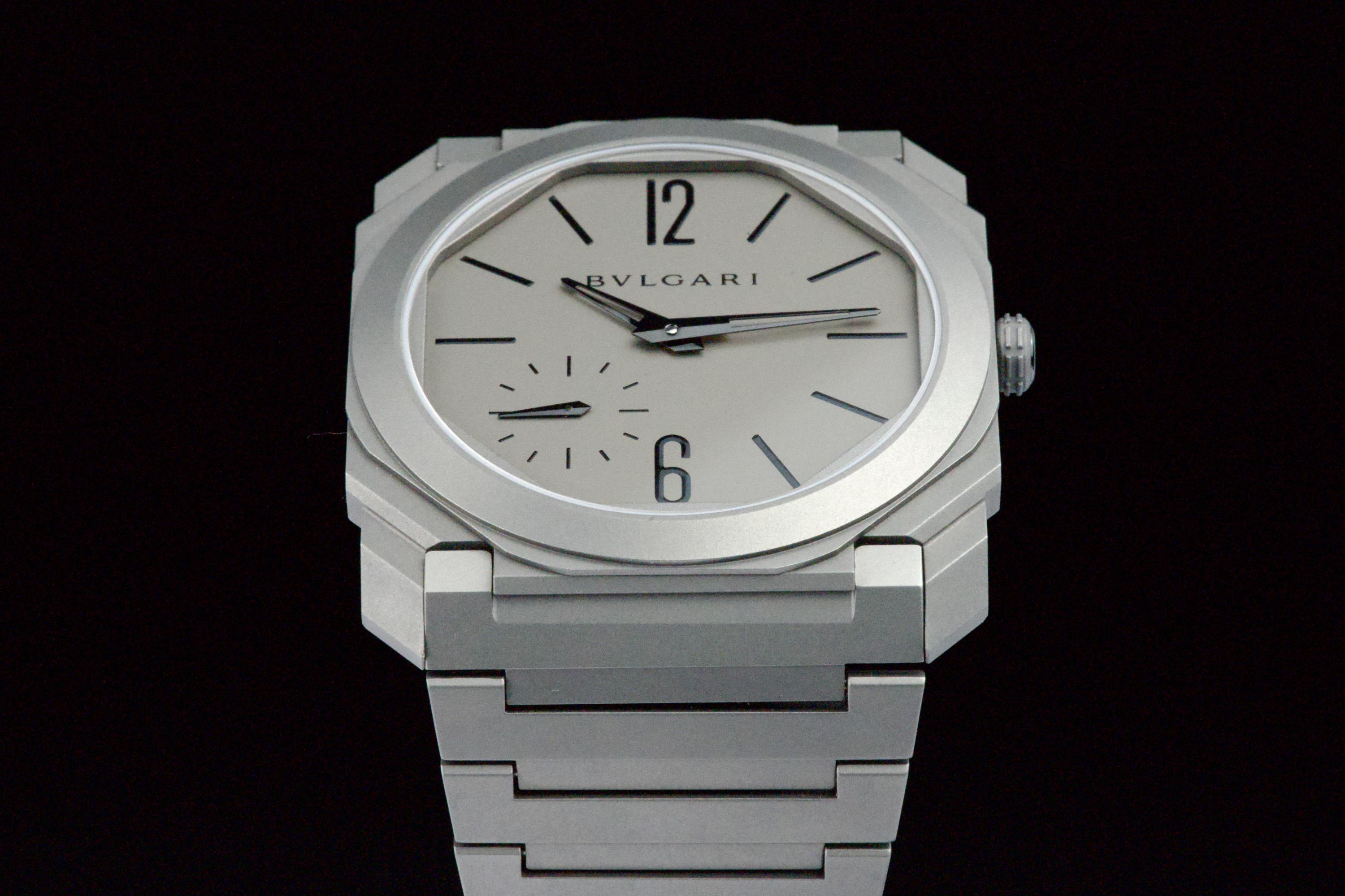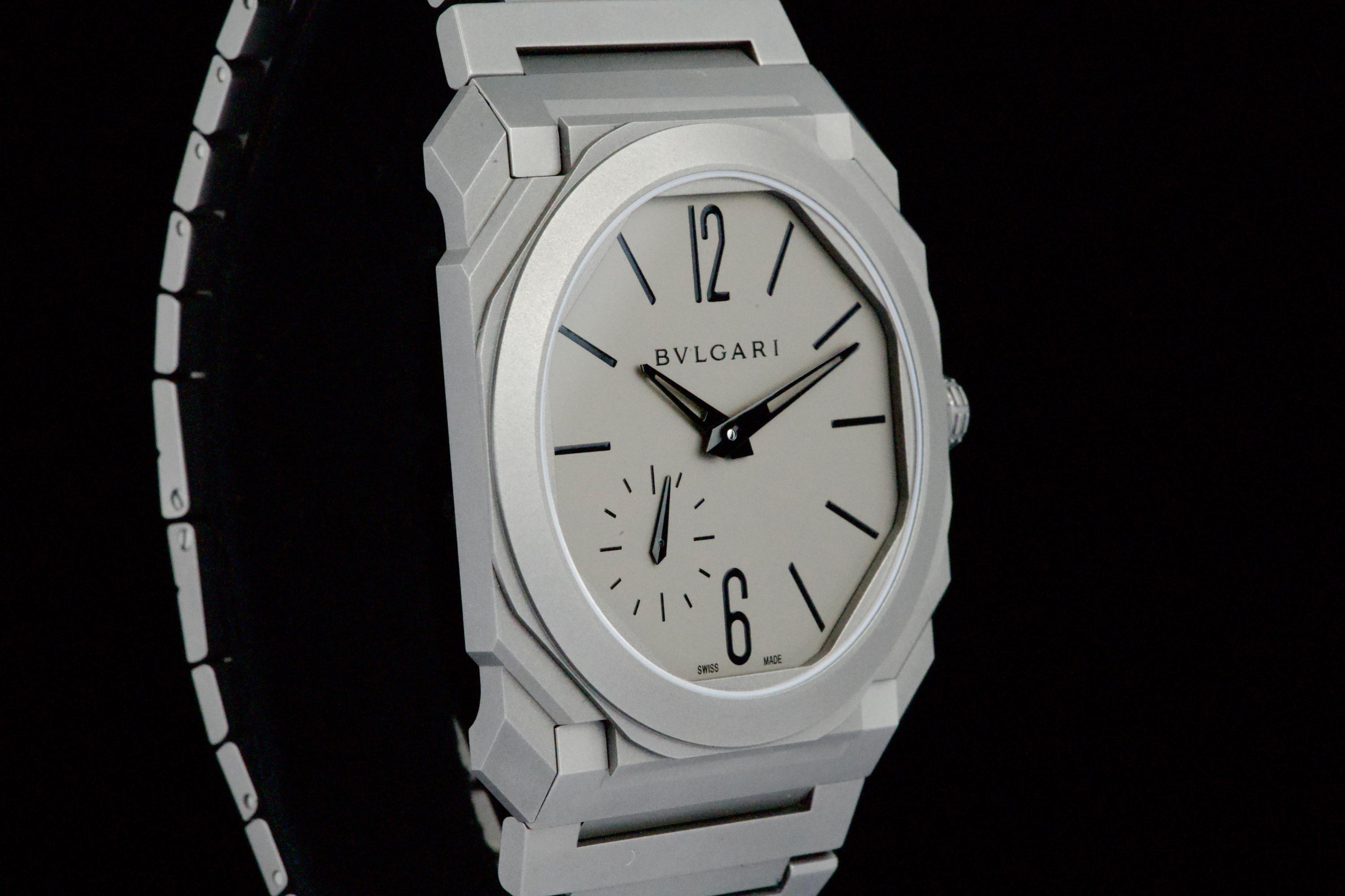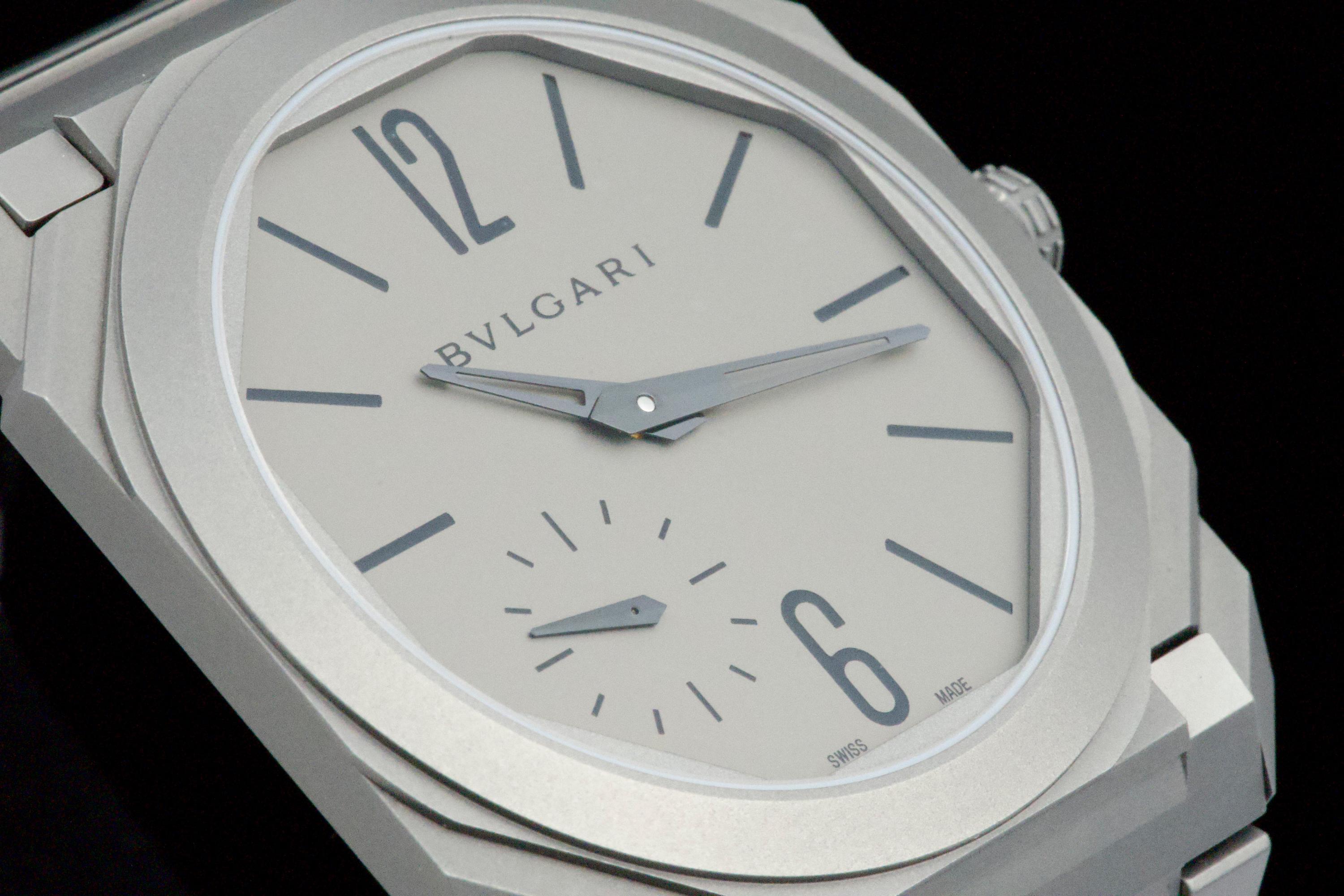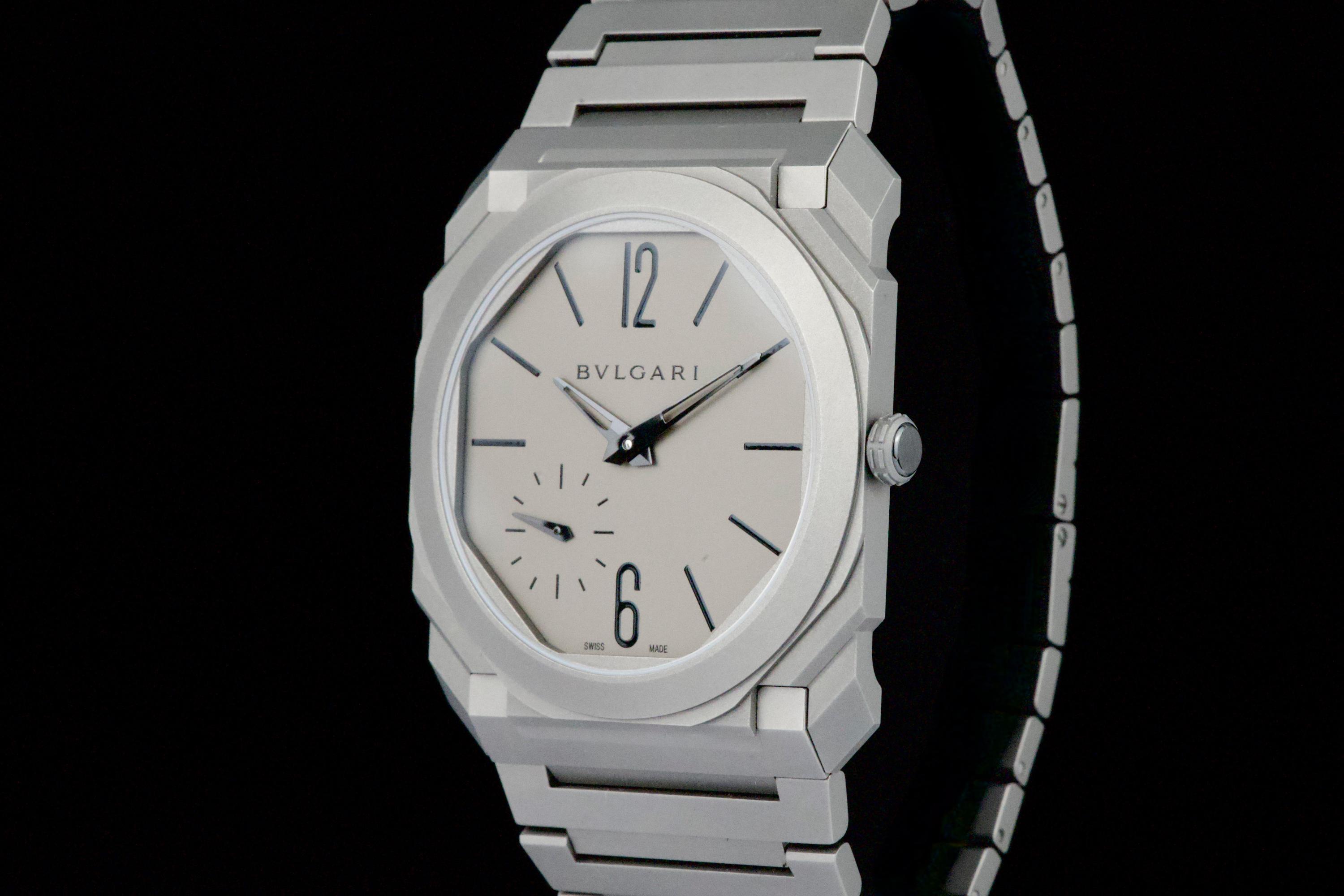An ultra-thin and contemporary Bulgari Octo Finissimo in titanium, presented in perfect condition. The watch is fitted with the original titanium bracelet, complete with all links, combining lightness and comfort with striking architectural design. Powered by the in-house automatic caliber BVL 138 with micro-rotor, visible through the sapphire caseback, offering a 60-hour power reserve within an exceptionally slim case. Complete with its original box, warranty card dated december 2024, and accessories. A superb opportunity to acquire one of Bulgari’s most celebrated modern creations, blending cutting-edge design, technical achievement, and everyday wearability.