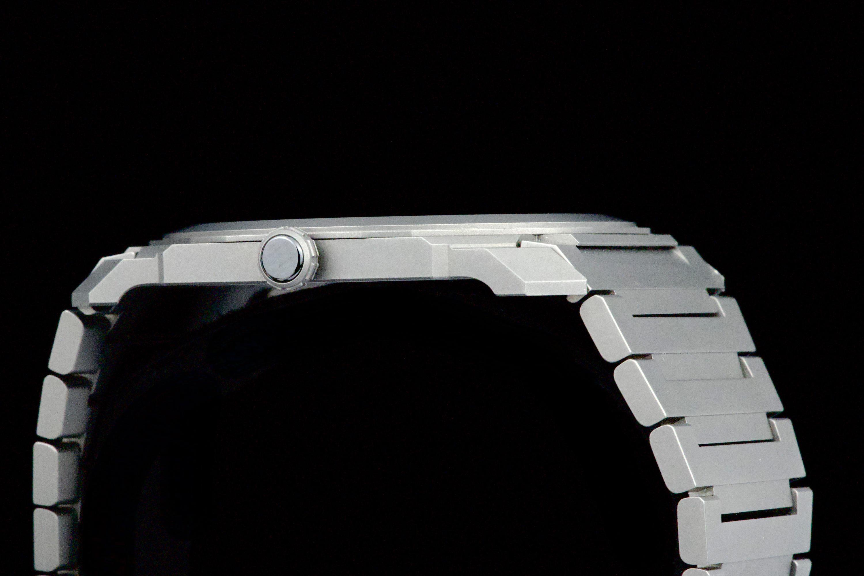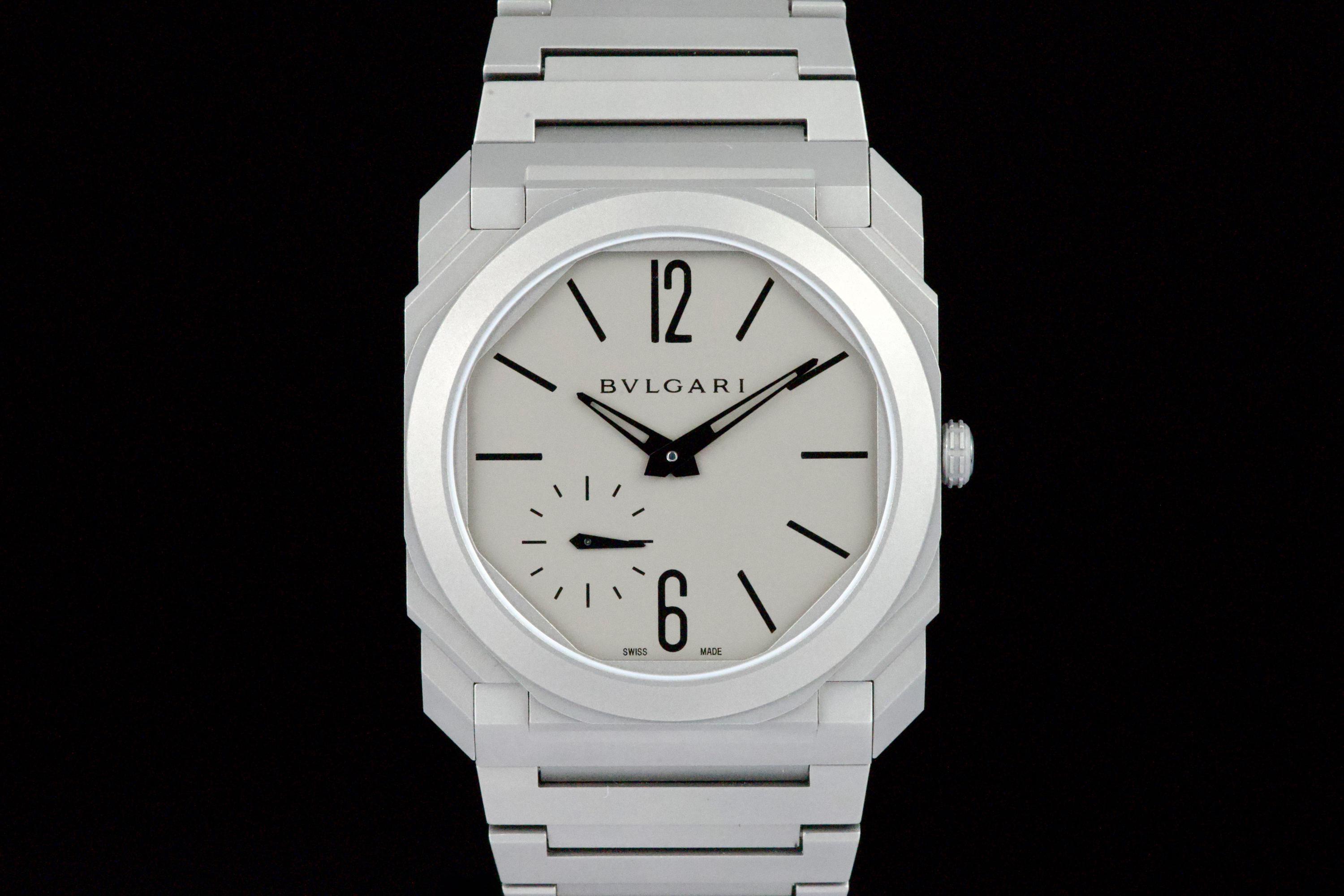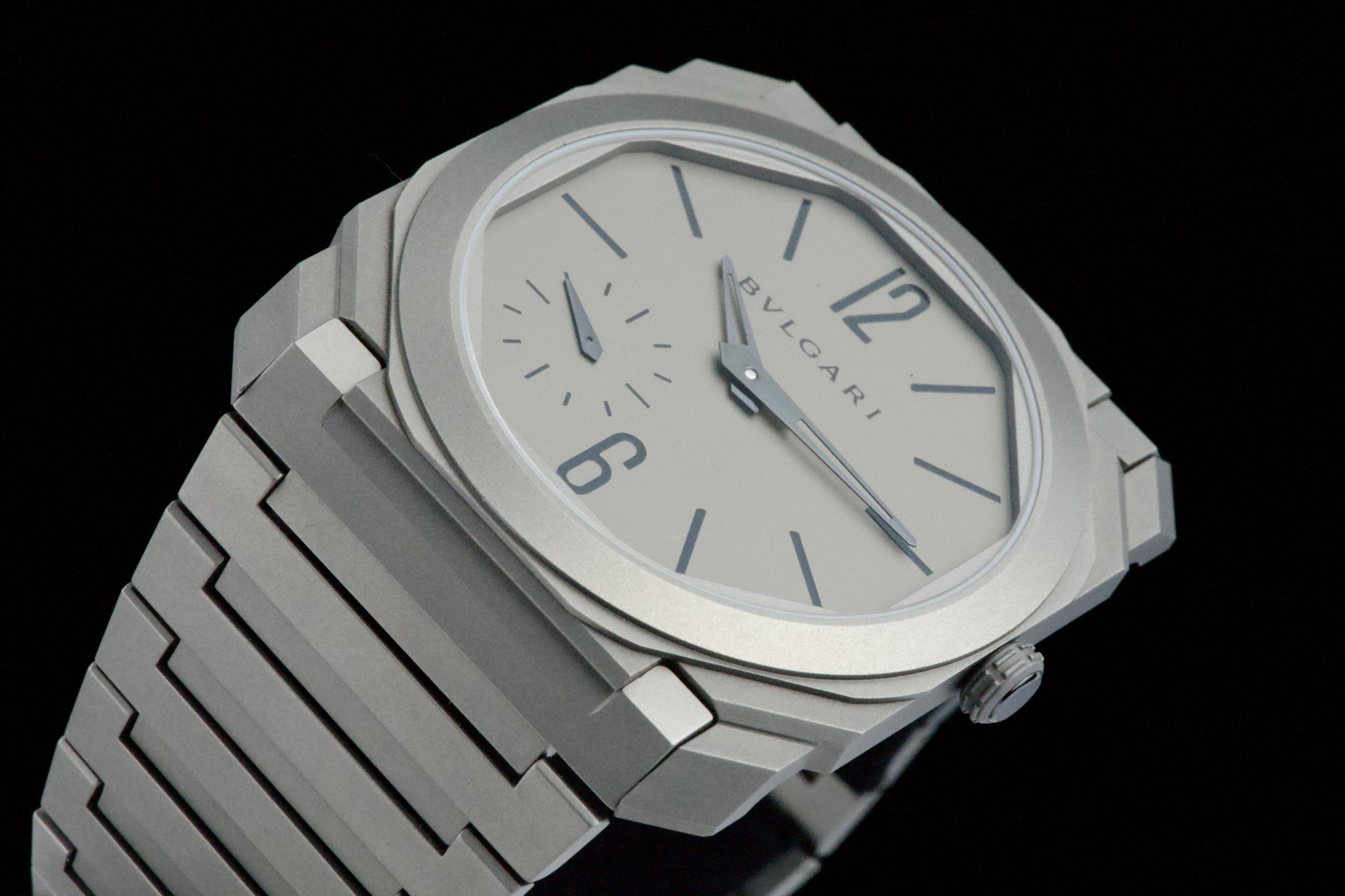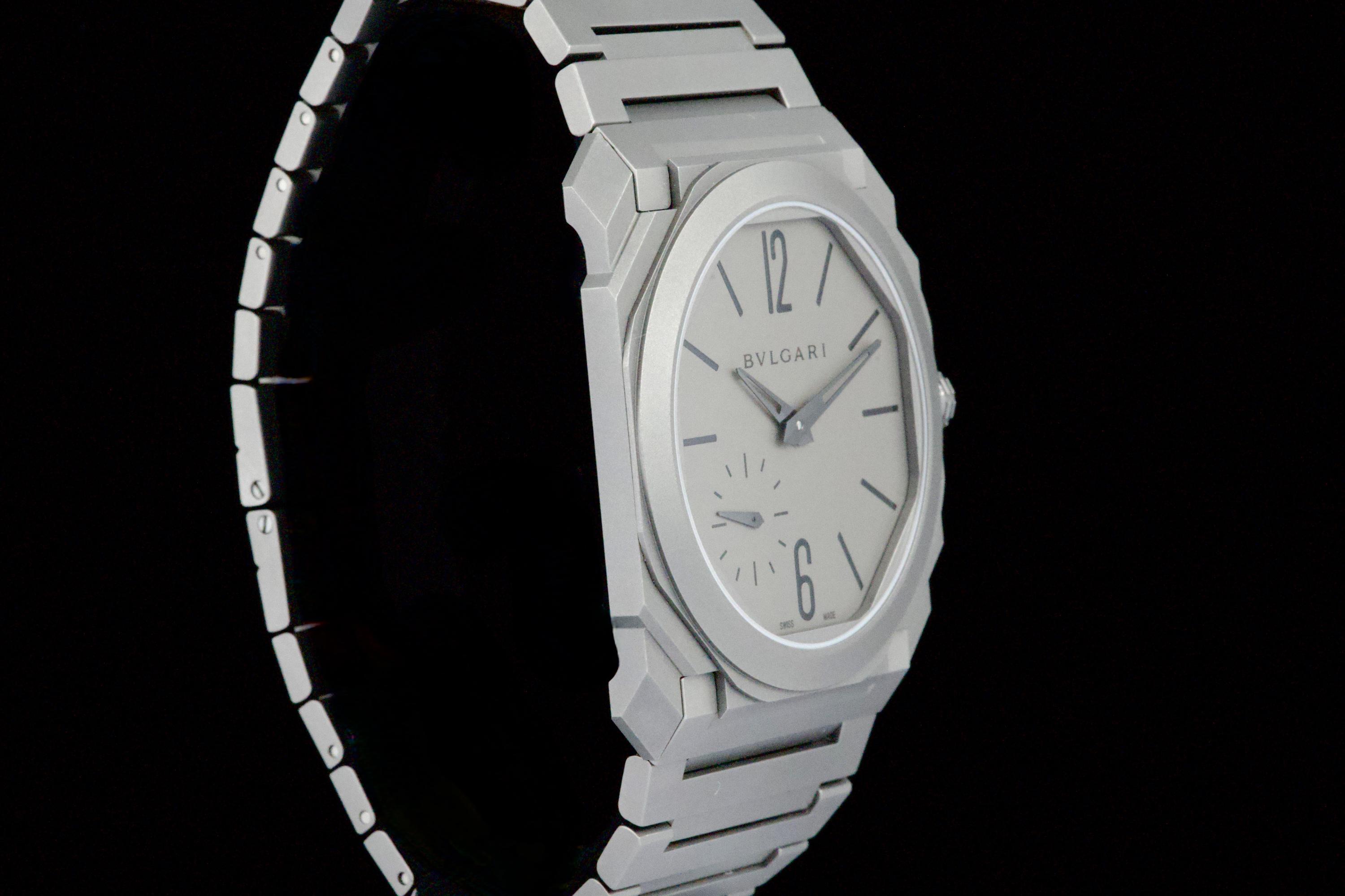 An ultra-thin and contemporary Bulgari Octo Finissimo in titanium, presented in perfect condition. The watch is fitted with the original titanium bracelet, complete with all links, combining lightness and comfort with striking architectural design. Powered by the in-house automatic caliber BVL 138 with micro-rotor, visible through the sapphire caseback, offering a 60-hour power reserve within an exceptionally slim case. Complete with its original box, warranty card dated december 2024, and accessories. A superb opportunity to acquire one of Bulgari’s most celebrated modern creations, blending cutting-edge design, technical achievement, and everyday wearability.