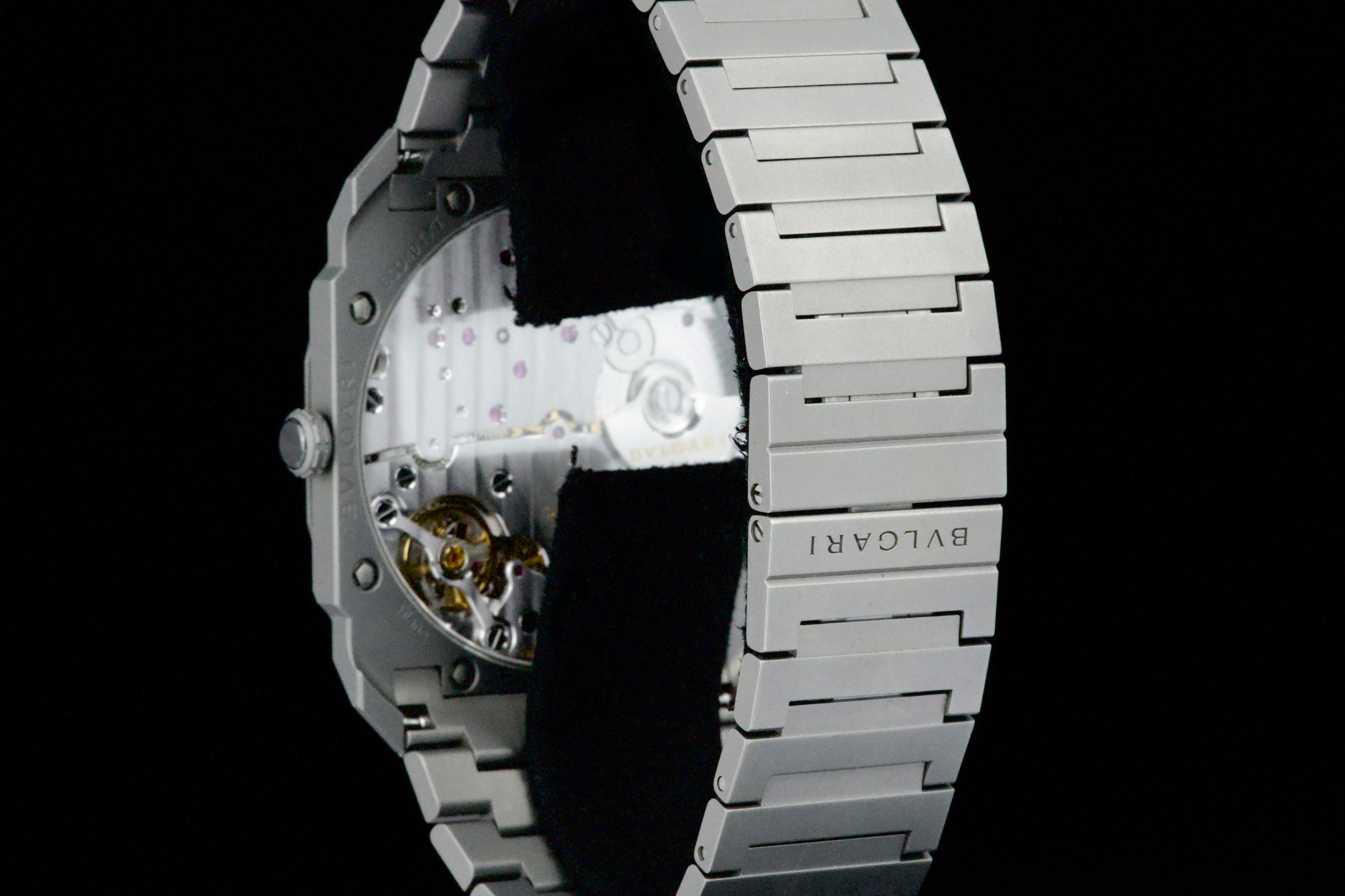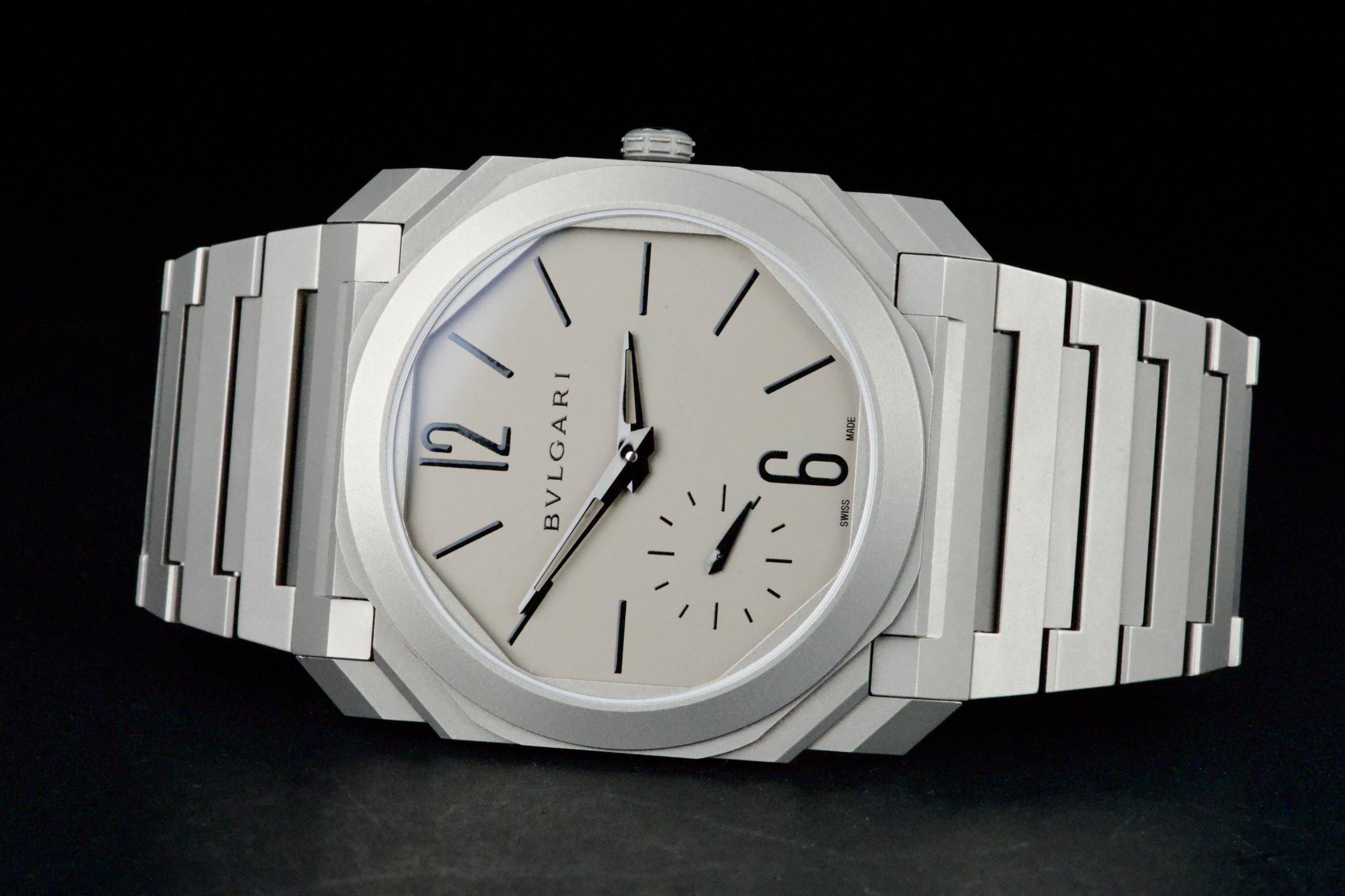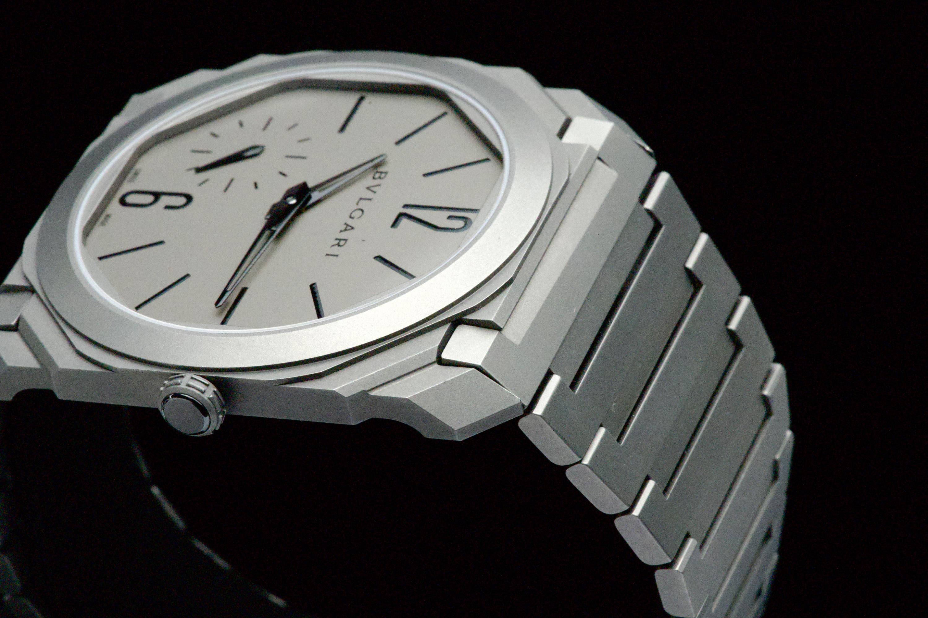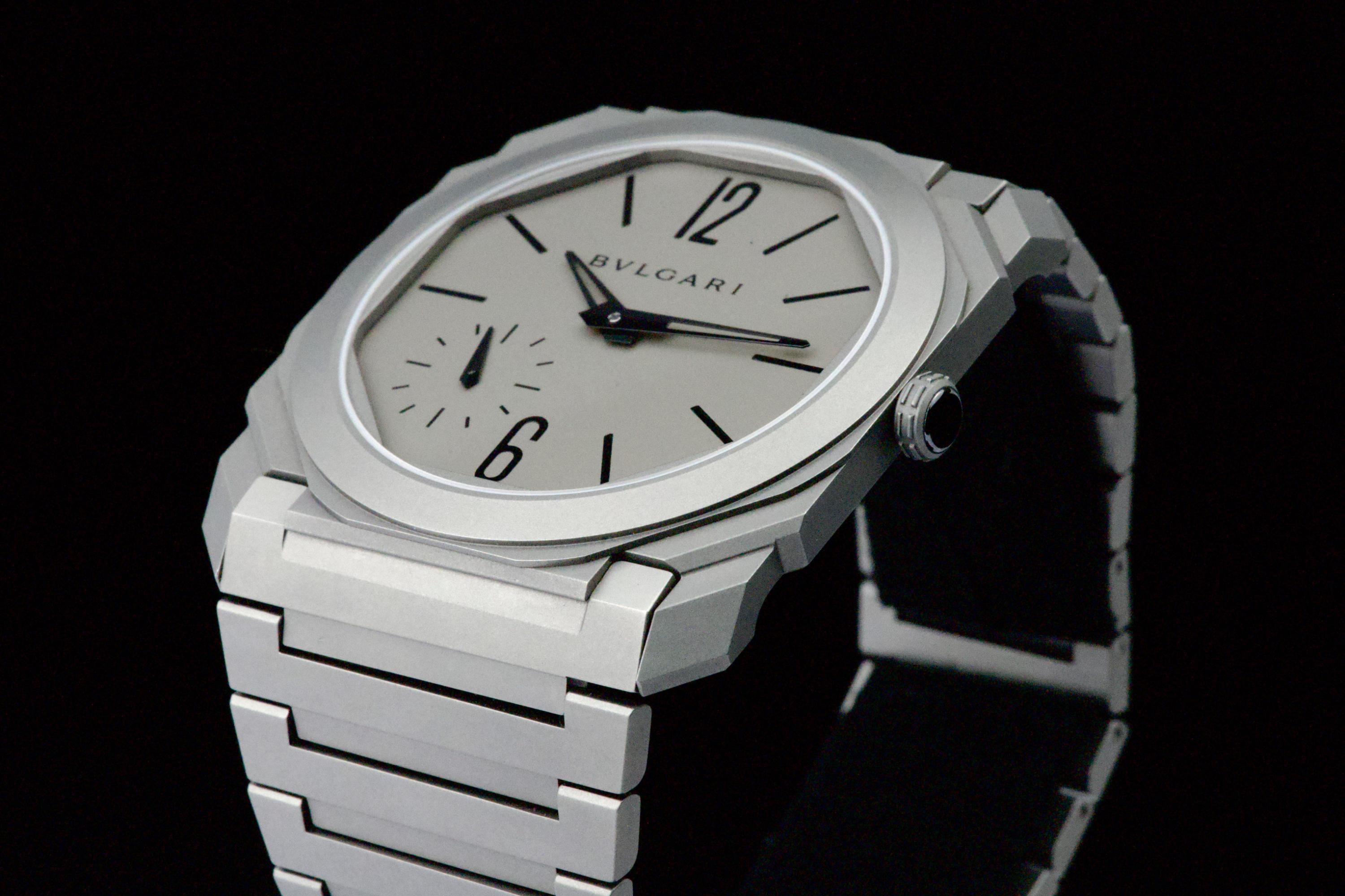 An ultra-thin and contemporary Bulgari Octo Finissimo in titanium, presented in perfect condition. The watch is fitted with the original titanium bracelet, complete with all links, combining lightness and comfort with striking architectural design. Powered by the in-house automatic caliber BVL 138 with micro-rotor, visible through the sapphire caseback, offering a 60-hour power reserve within an exceptionally slim case. Complete with its original box, warranty card dated december 2024, and accessories. A superb opportunity to acquire one of Bulgari’s most celebrated modern creations, blending cutting-edge design, technical achievement, and everyday wearability.