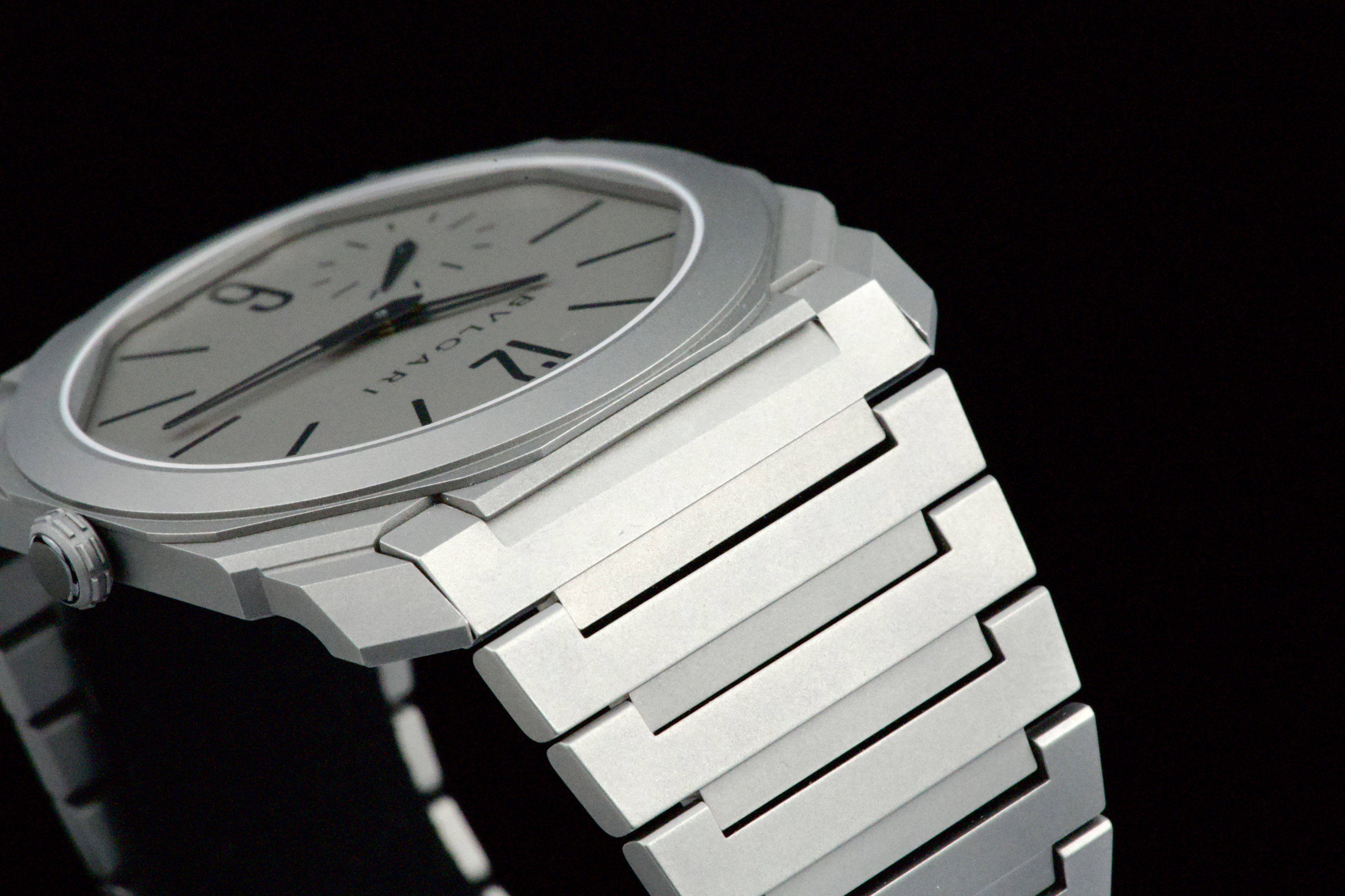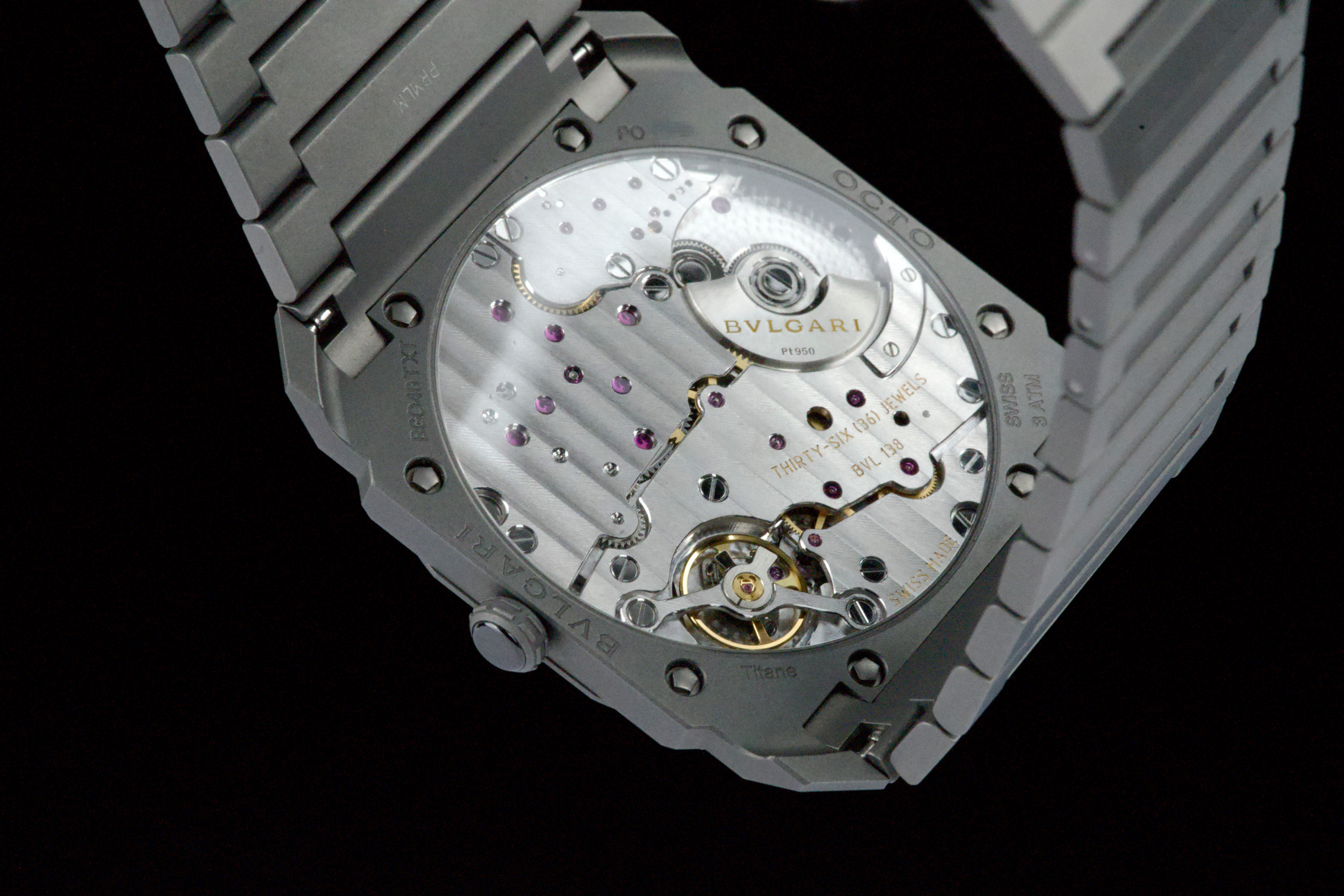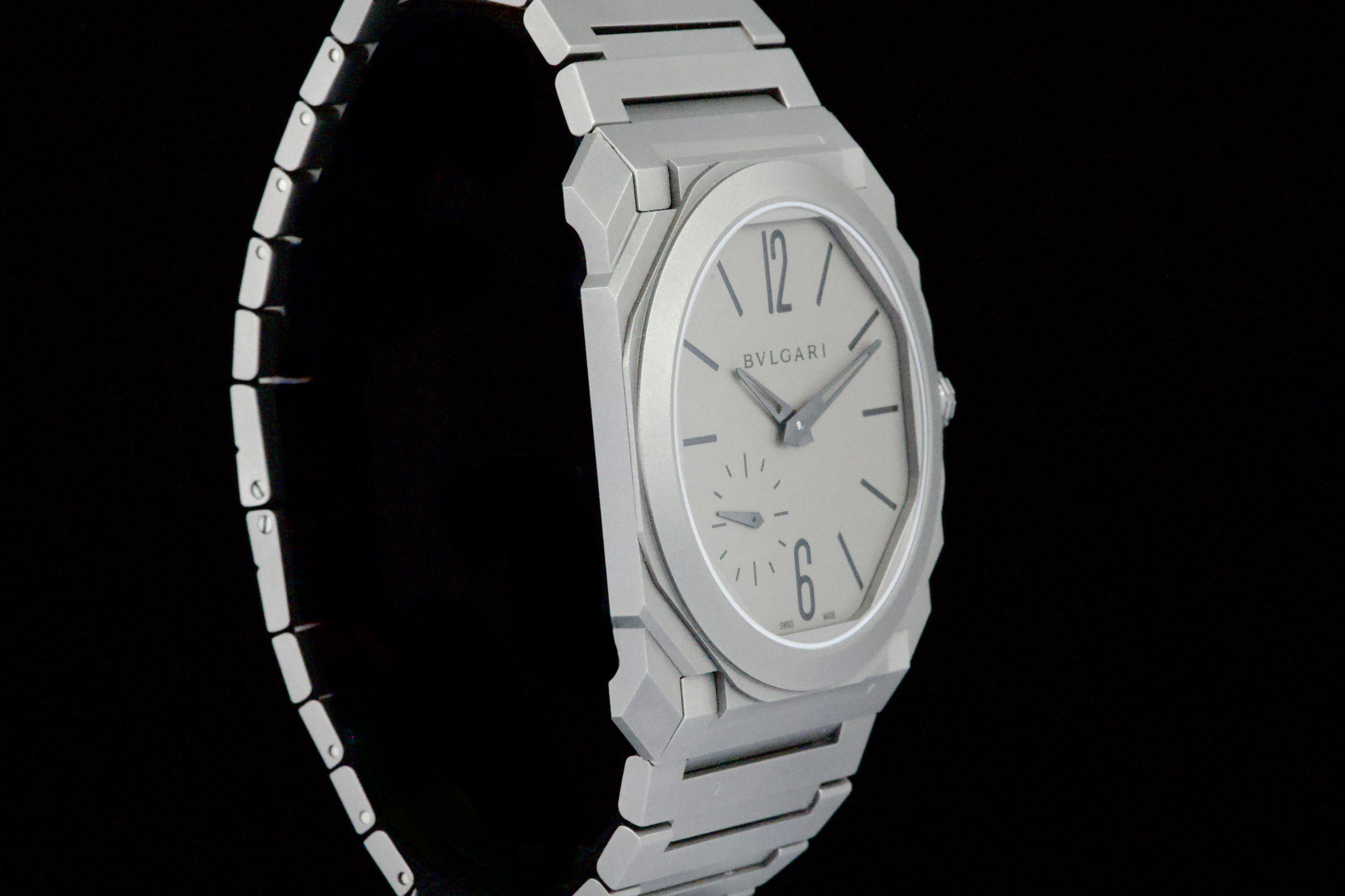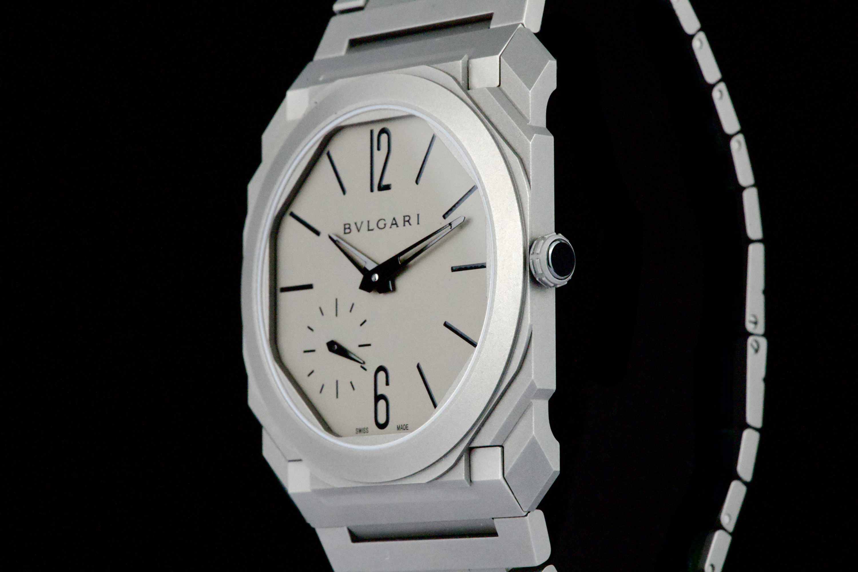 An ultra-thin and contemporary Bulgari Octo Finissimo in titanium, presented in perfect condition. The watch is fitted with the original titanium bracelet, complete with all links, combining lightness and comfort with striking architectural design. Powered by the in-house automatic caliber BVL 138 with micro-rotor, visible through the sapphire caseback, offering a 60-hour power reserve within an exceptionally slim case. Complete with its original box, warranty card dated december 2024, and accessories. A superb opportunity to acquire one of Bulgari’s most celebrated modern creations, blending cutting-edge design, technical achievement, and everyday wearability.