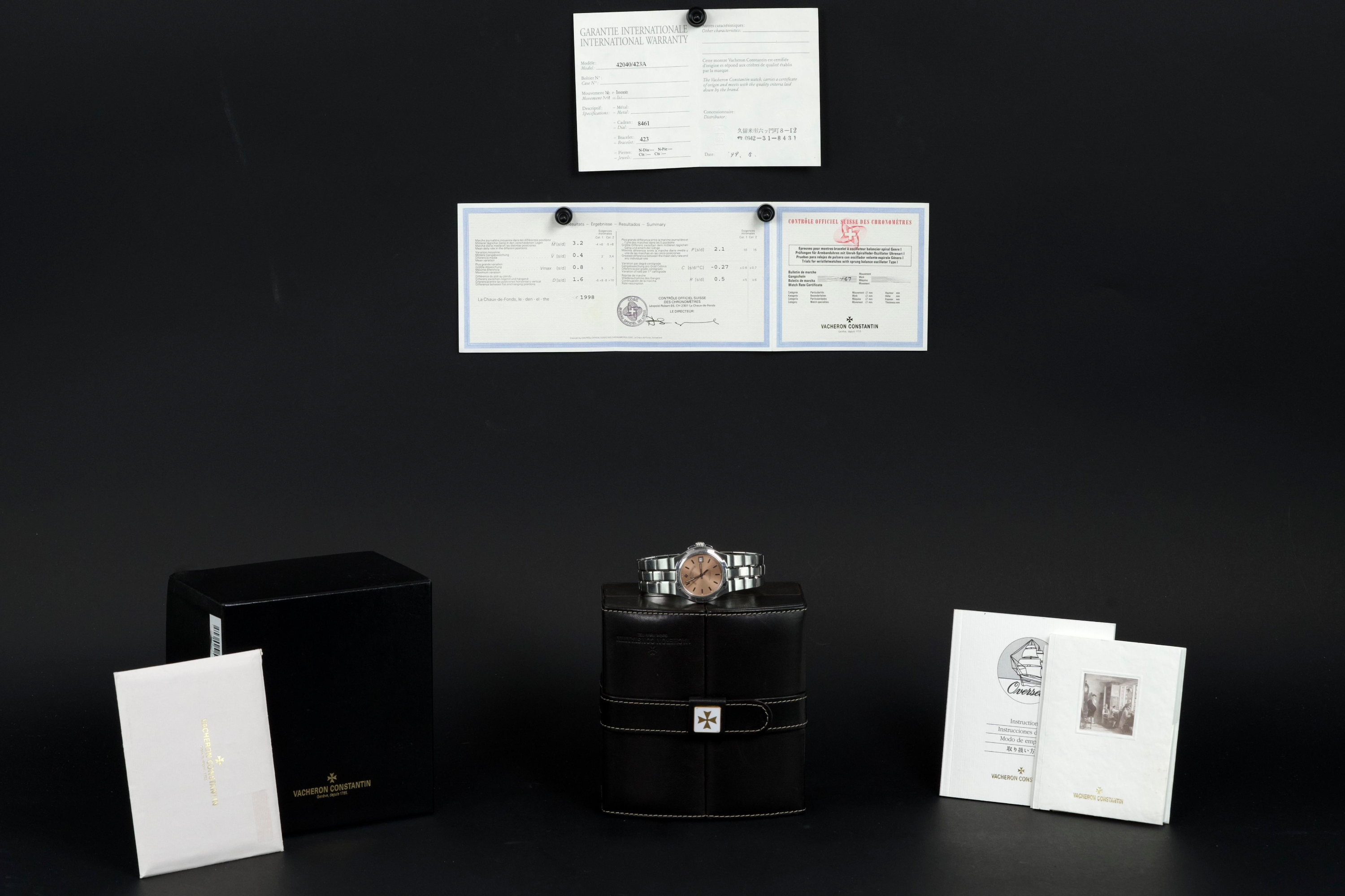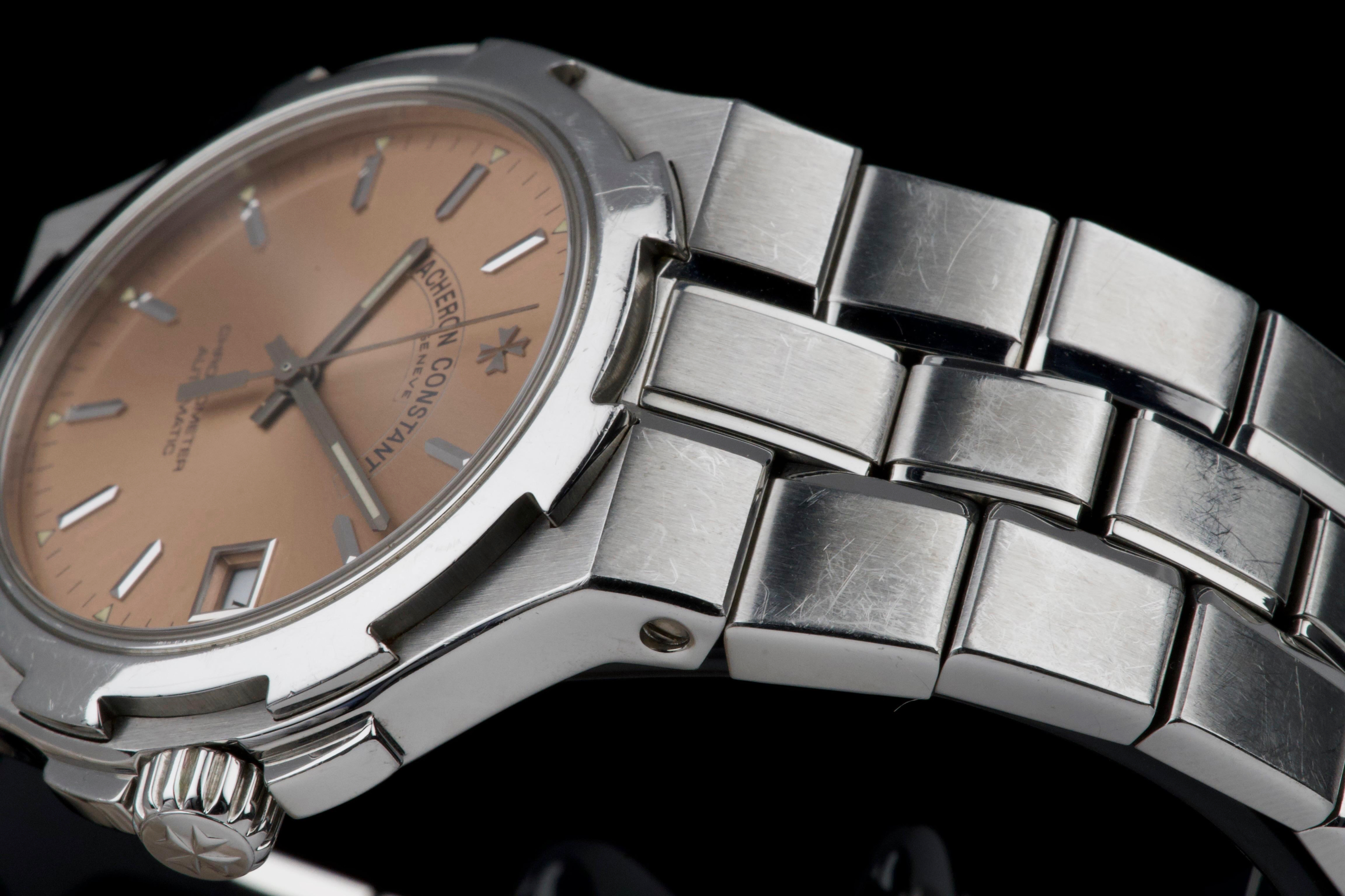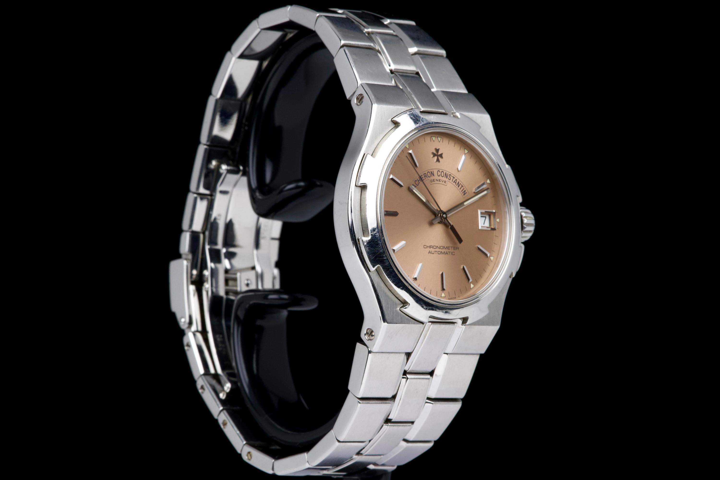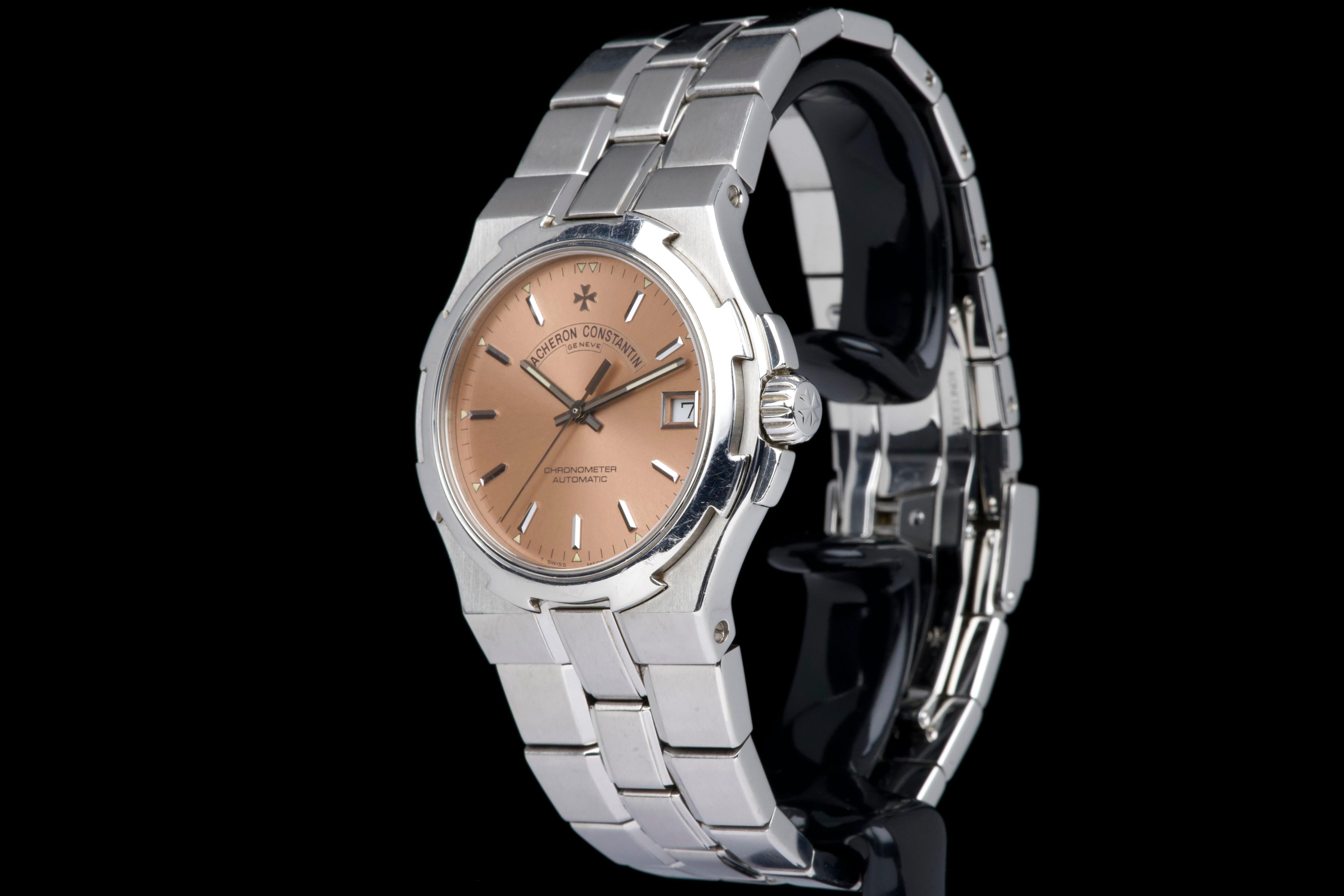Presented here is an elegant and increasingly sought-after example of the Vacheron Constantin Overseas reference 42040, featuring the rare and original salmon tritium dial. Produced in 1999 and originally sold in Japan, this automatic Overseas represents an early and highly collectible iteration of the model. The 36mm stainless steel case remains unpolished and shows wear consistent with age, preserving its original factory lines; polishing can be arranged upon request. The salmon dial is flawless and retains its original tritium hour markers, perfectly matched by the tritium hands, offering a cohesive and authentic appearance. The integrated stainless steel bracelet is complete with all factory links. With no recorded service history, the watch is offered in full working order. Accompanied by an exceptionally complete full set, including the original box, outer packaging, COSC certificate, original papers, and booklets, this is a correct and highly attractive example of the early Overseas, combining originality, rarity, and strong overall presentation, appealing to discerning collectors of fine modern classics.