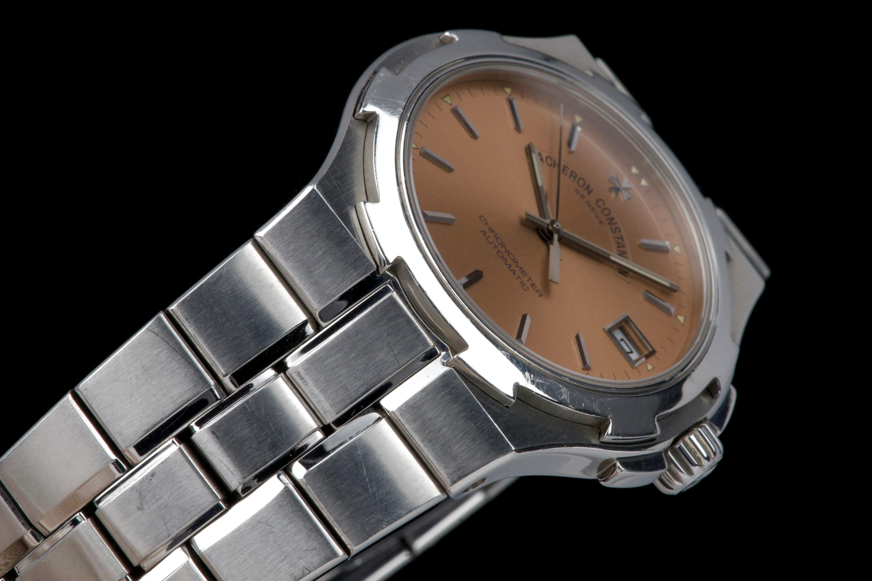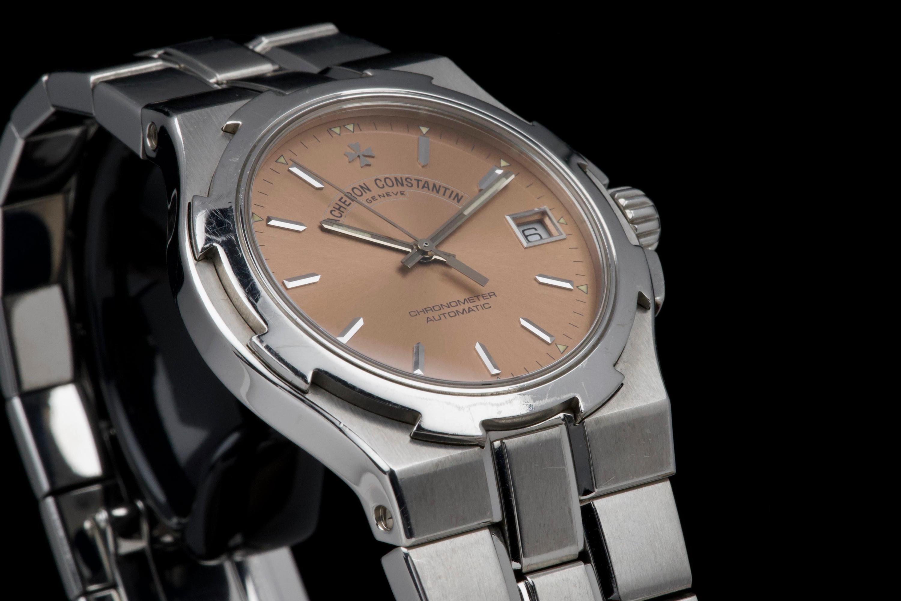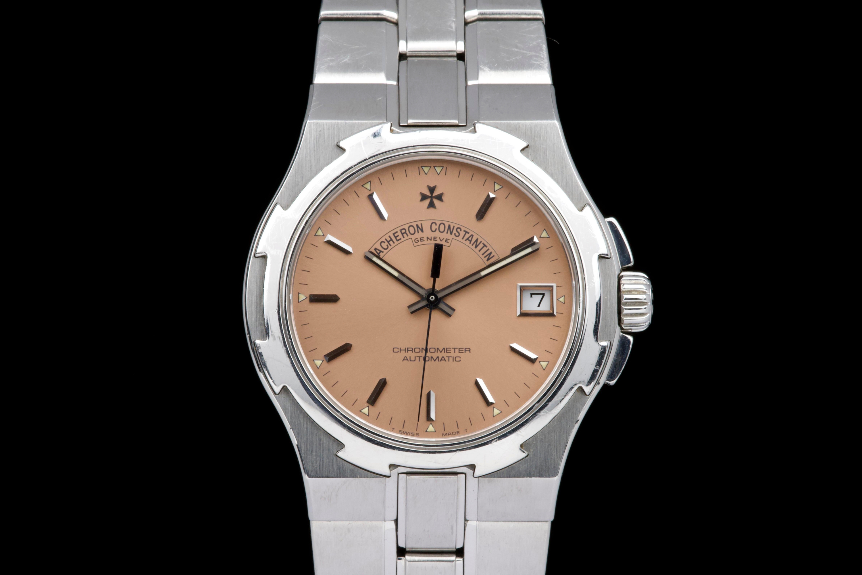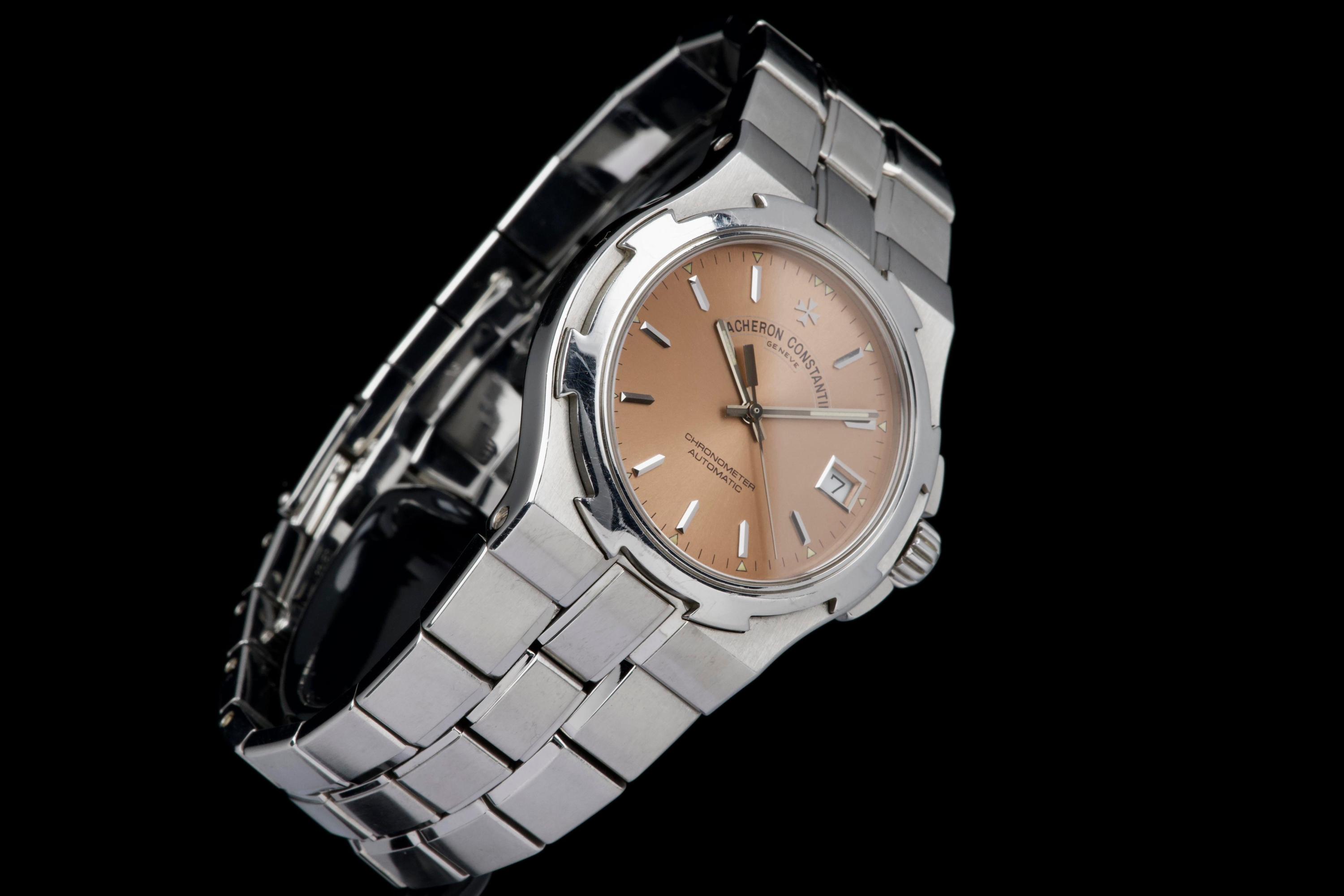Presented here is an elegant and increasingly sought-after example of the Vacheron Constantin Overseas reference 42040, featuring the rare and original salmon tritium dial. Produced in 1999 and originally sold in Japan, this automatic Overseas represents an early and highly collectible iteration of the model. The 36mm stainless steel case remains unpolished and shows wear consistent with age, preserving its original factory lines; polishing can be arranged upon request. The salmon dial is flawless and retains its original tritium hour markers, perfectly matched by the tritium hands, offering a cohesive and authentic appearance. The integrated stainless steel bracelet is complete with all factory links. With no recorded service history, the watch is offered in full working order. Accompanied by an exceptionally complete full set, including the original box, outer packaging, COSC certificate, original papers, and booklets, this is a correct and highly attractive example of the early Overseas, combining originality, rarity, and strong overall presentation, appealing to discerning collectors of fine modern classics.