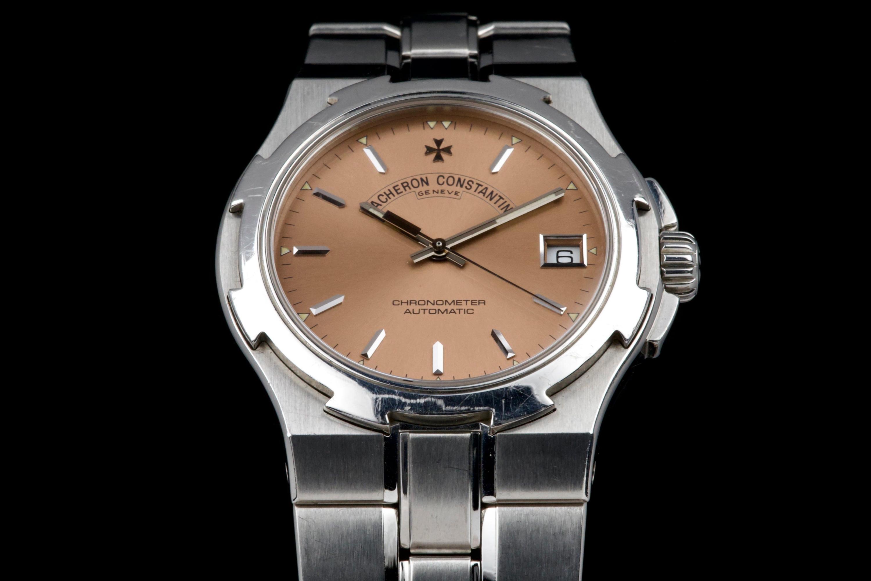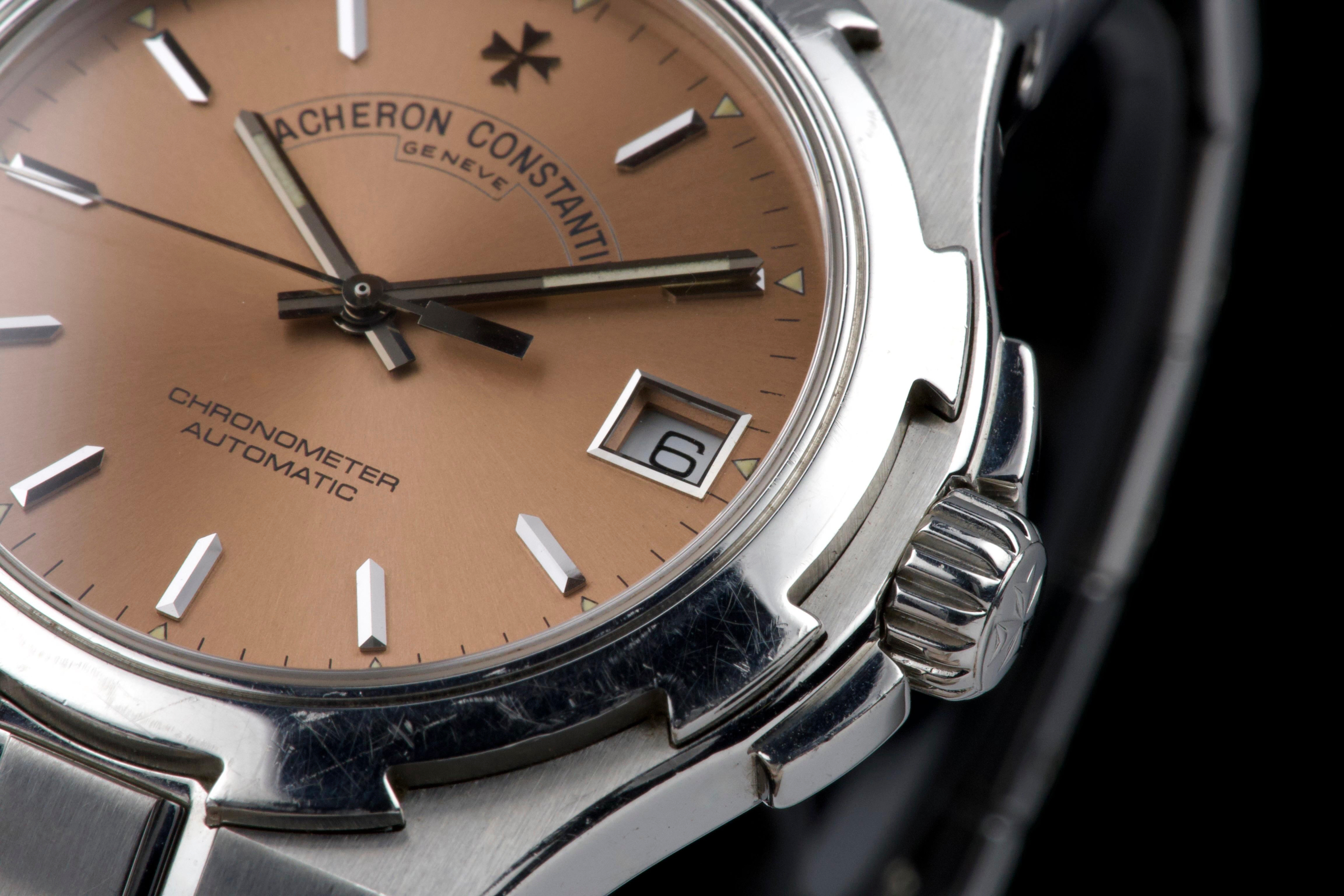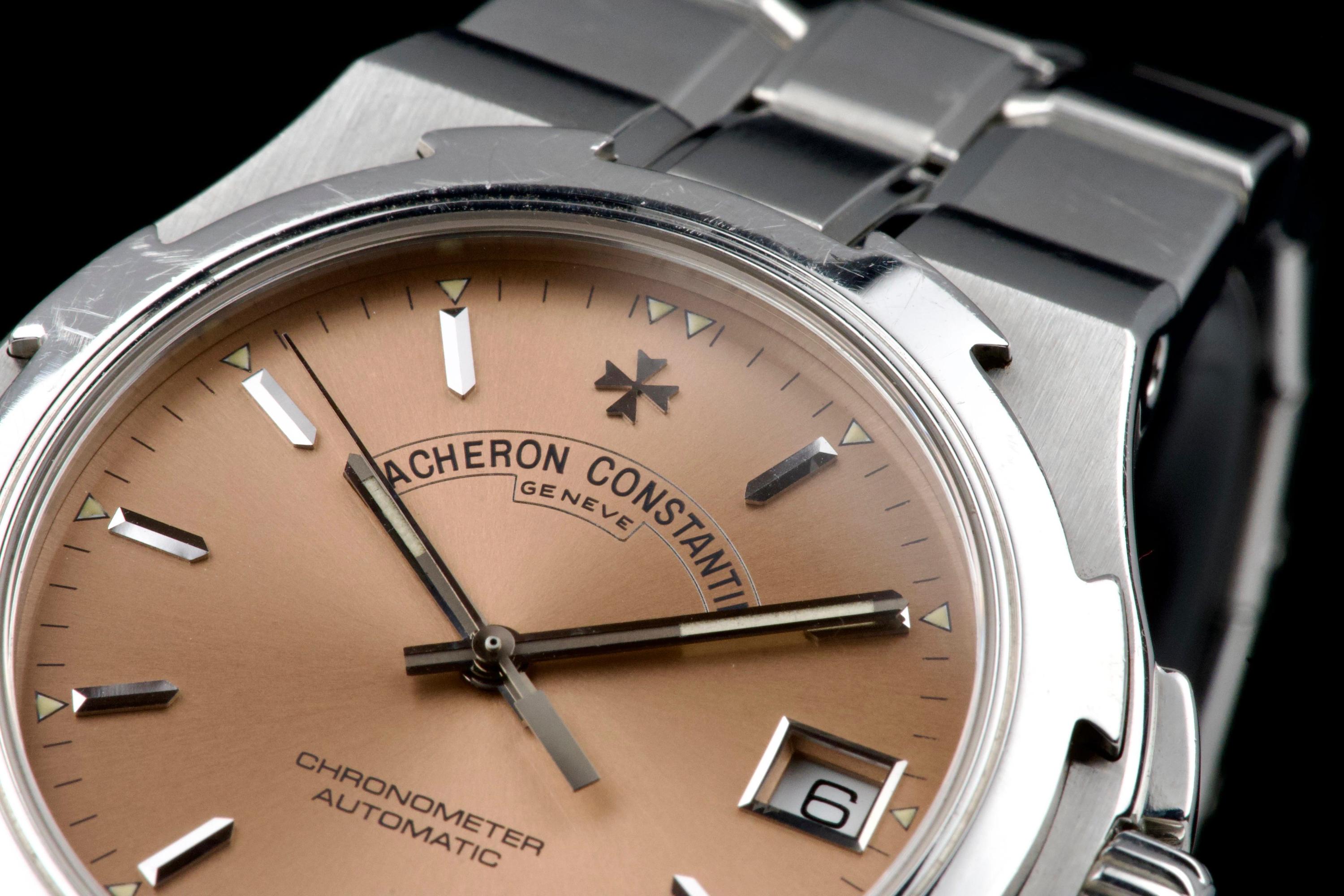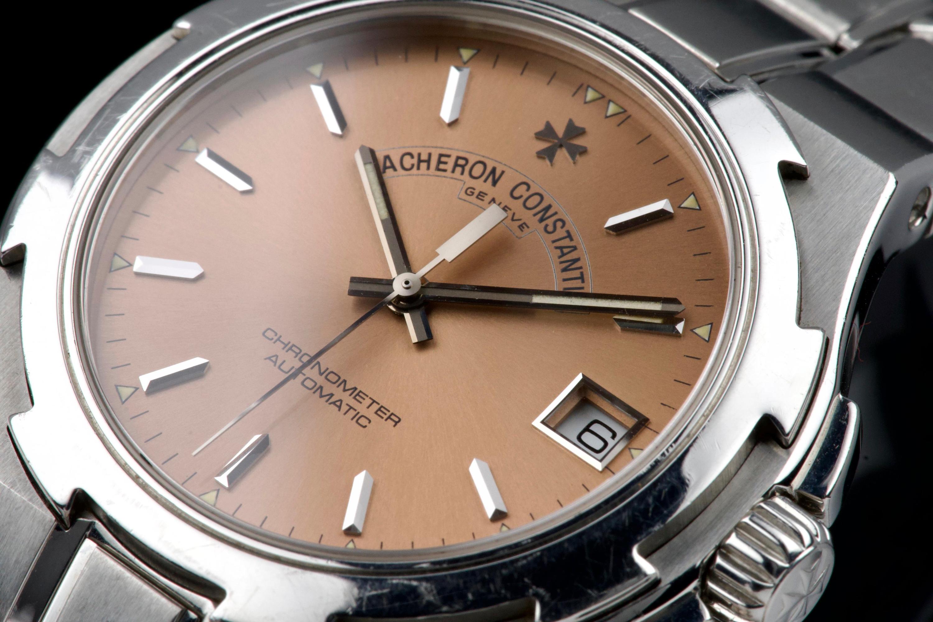 Presented here is an elegant and increasingly sought-after example of the Vacheron Constantin Overseas reference 42040, featuring the rare and original salmon tritium dial. Produced in 1999 and originally sold in Japan, this automatic Overseas represents an early and highly collectible iteration of the model. The 36mm stainless steel case remains unpolished and shows wear consistent with age, preserving its original factory lines; polishing can be arranged upon request. The salmon dial is flawless and retains its original tritium hour markers, perfectly matched by the tritium hands, offering a cohesive and authentic appearance. The integrated stainless steel bracelet is complete with all factory links. With no recorded service history, the watch is offered in full working order. Accompanied by an exceptionally complete full set, including the original box, outer packaging, COSC certificate, original papers, and booklets, this is a correct and highly attractive example of the early Overseas, combining originality, rarity, and strong overall presentation, appealing to discerning collectors of fine modern classics.