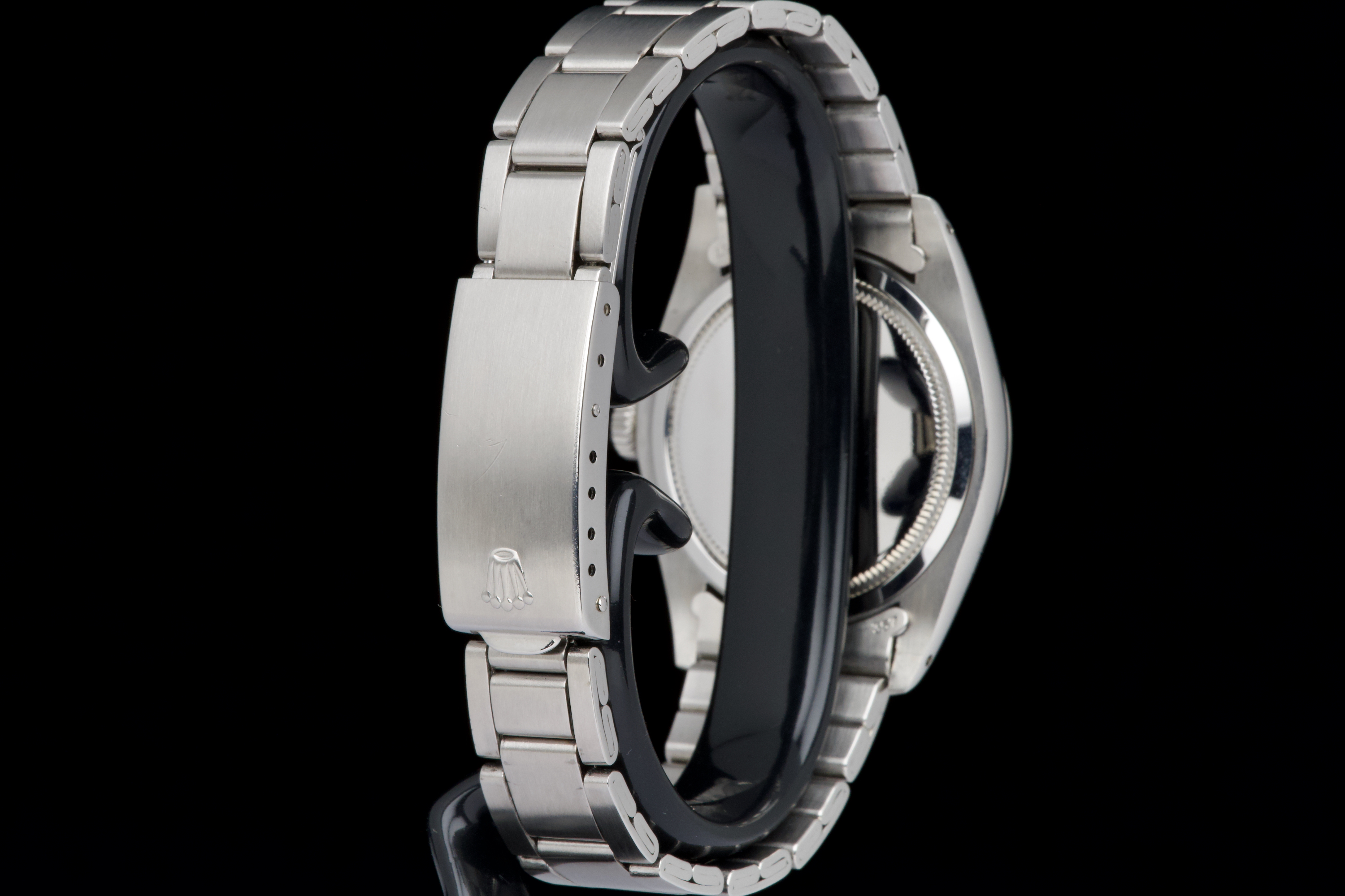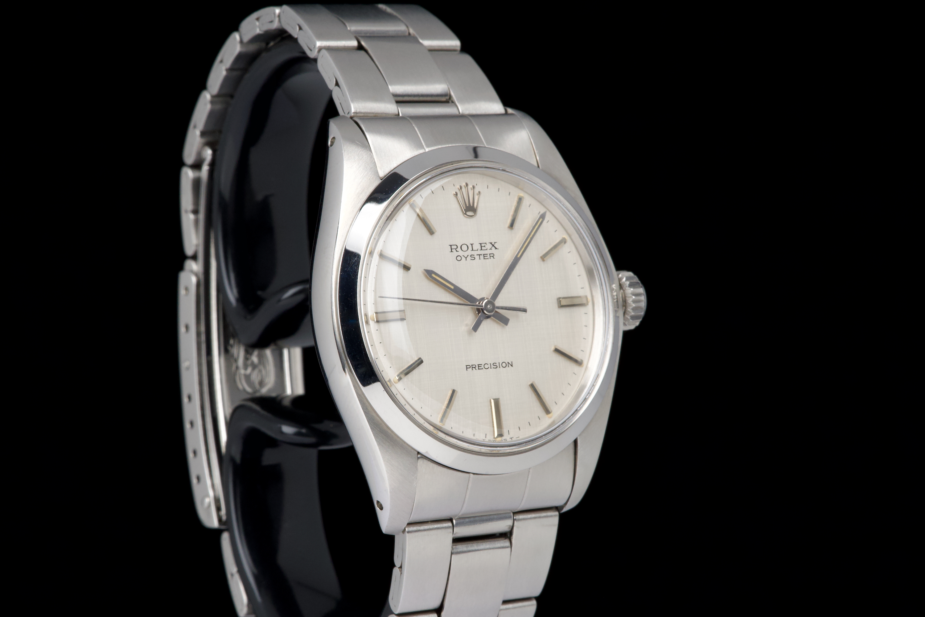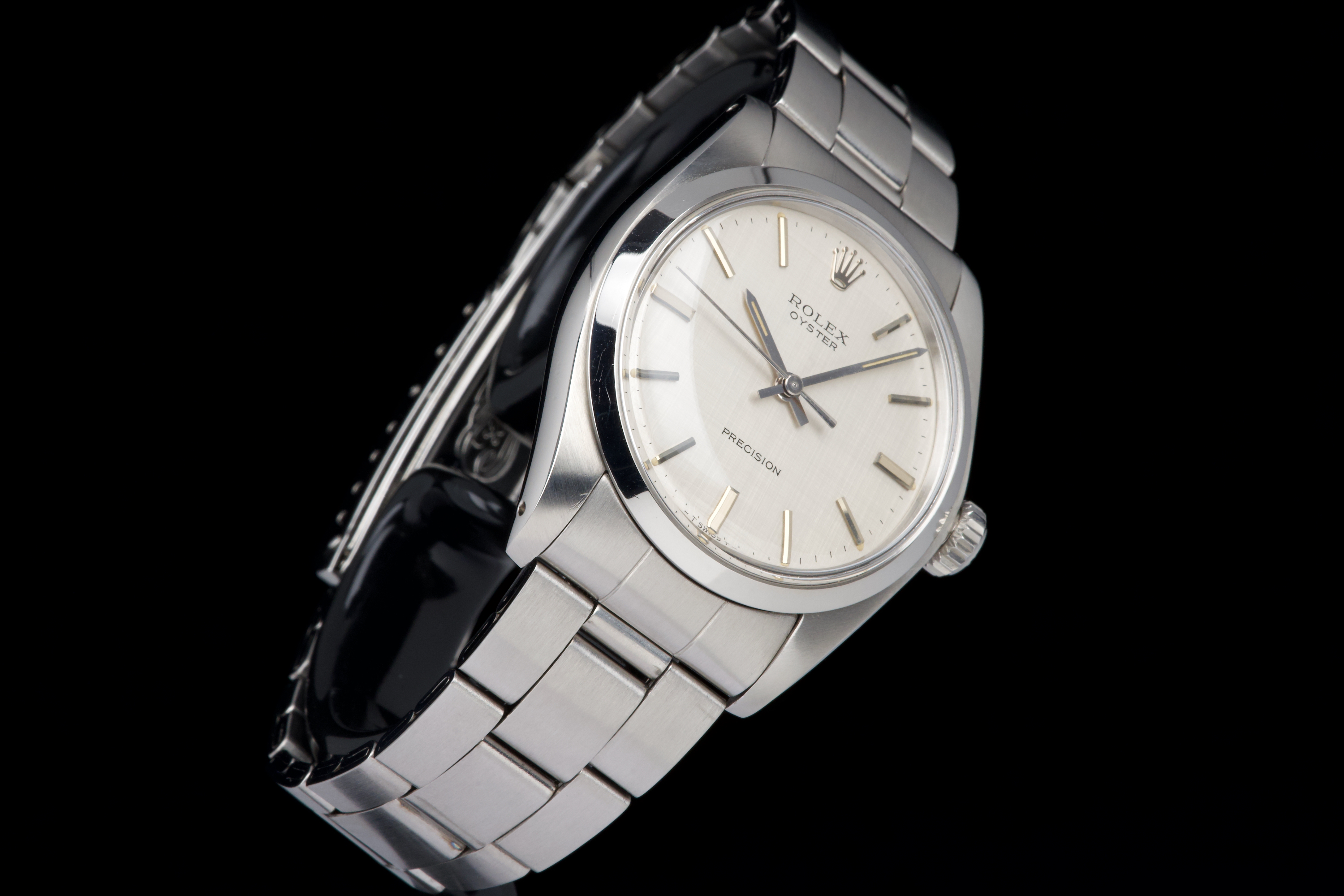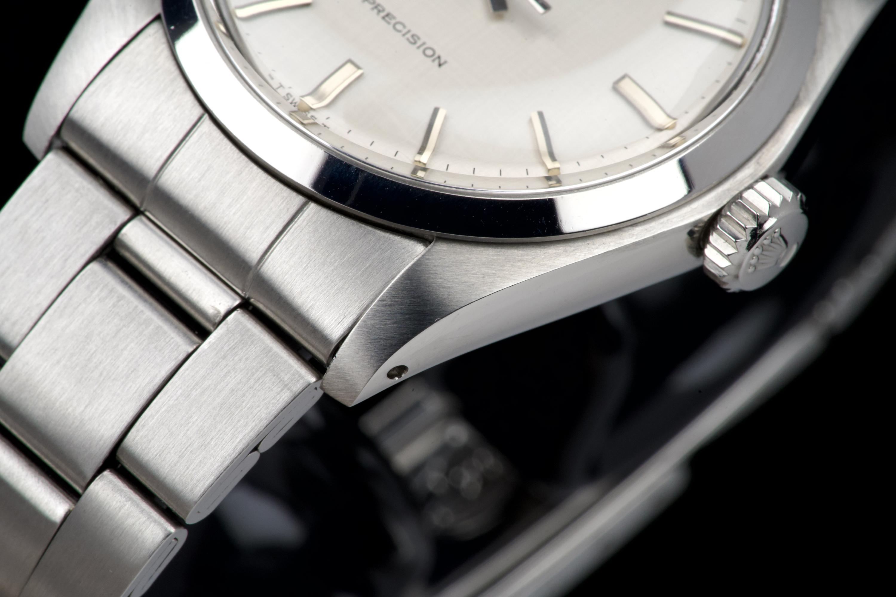 A beautifully preserved example of the 34mm Oyster Precision 6426, featuring the highly desirable silver linen tritium dial, perfectly original and in flawless condition, with matching tritium hands. Sold new in Kobe, Japan in 1975, this piece remains in outstanding and fully original condition. The 36mm stainless steel case has been polished in the past but remains thick, sharp, and symmetrical, with crisp and well-defined serial and reference numbers between the lugs (serial 3389XXX). The watch is powered by a manual-winding movement, freshly serviced by our watchmaker. It comes on its original folded 7835 Oyster bracelet with 357 endlinks, showing almost no stretch — impressive for a bracelet of this era. The clasp is undated, which is completely normal for this production period. Delivered with its original box and papers, this 6426 is a superb and honest vintage Rolex, combining rarity, condition, and timeless elegance.
