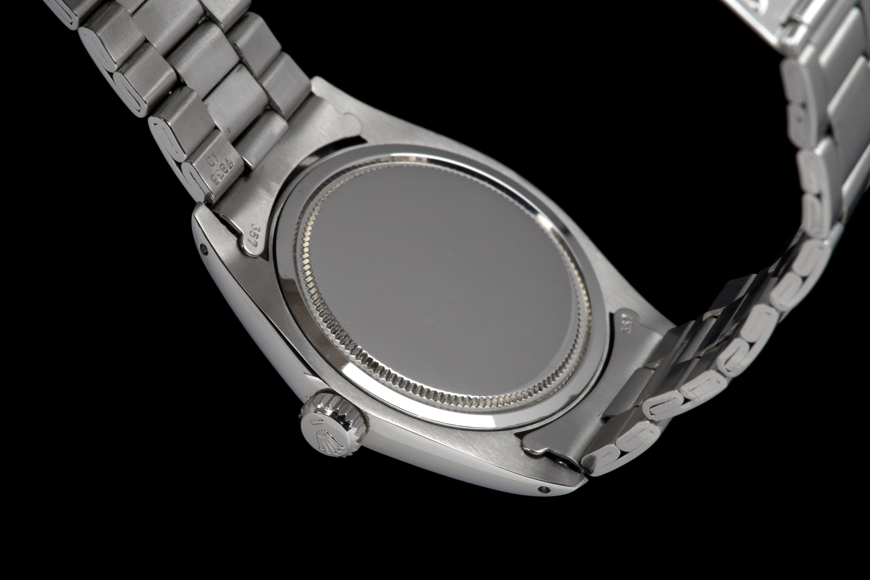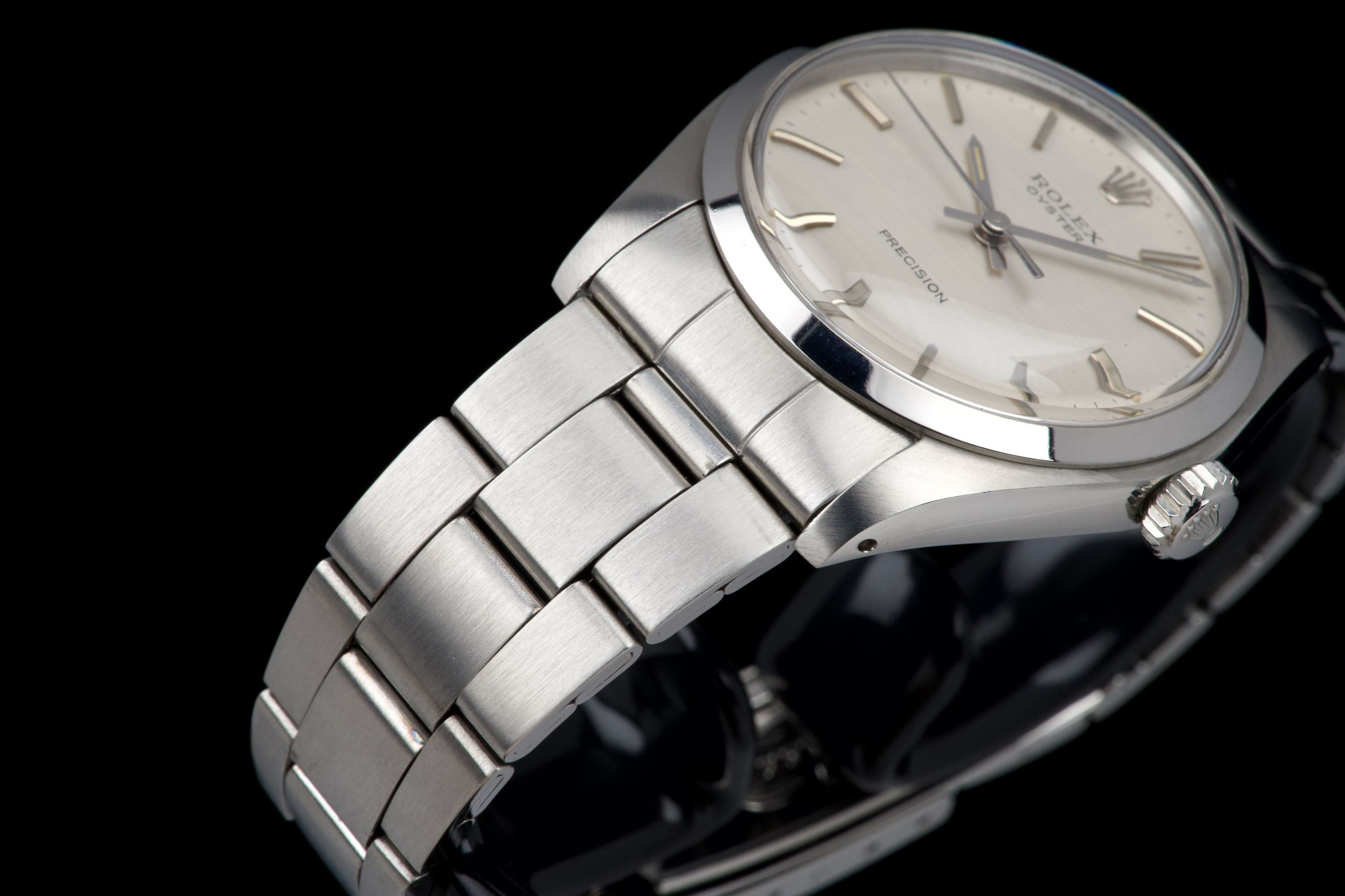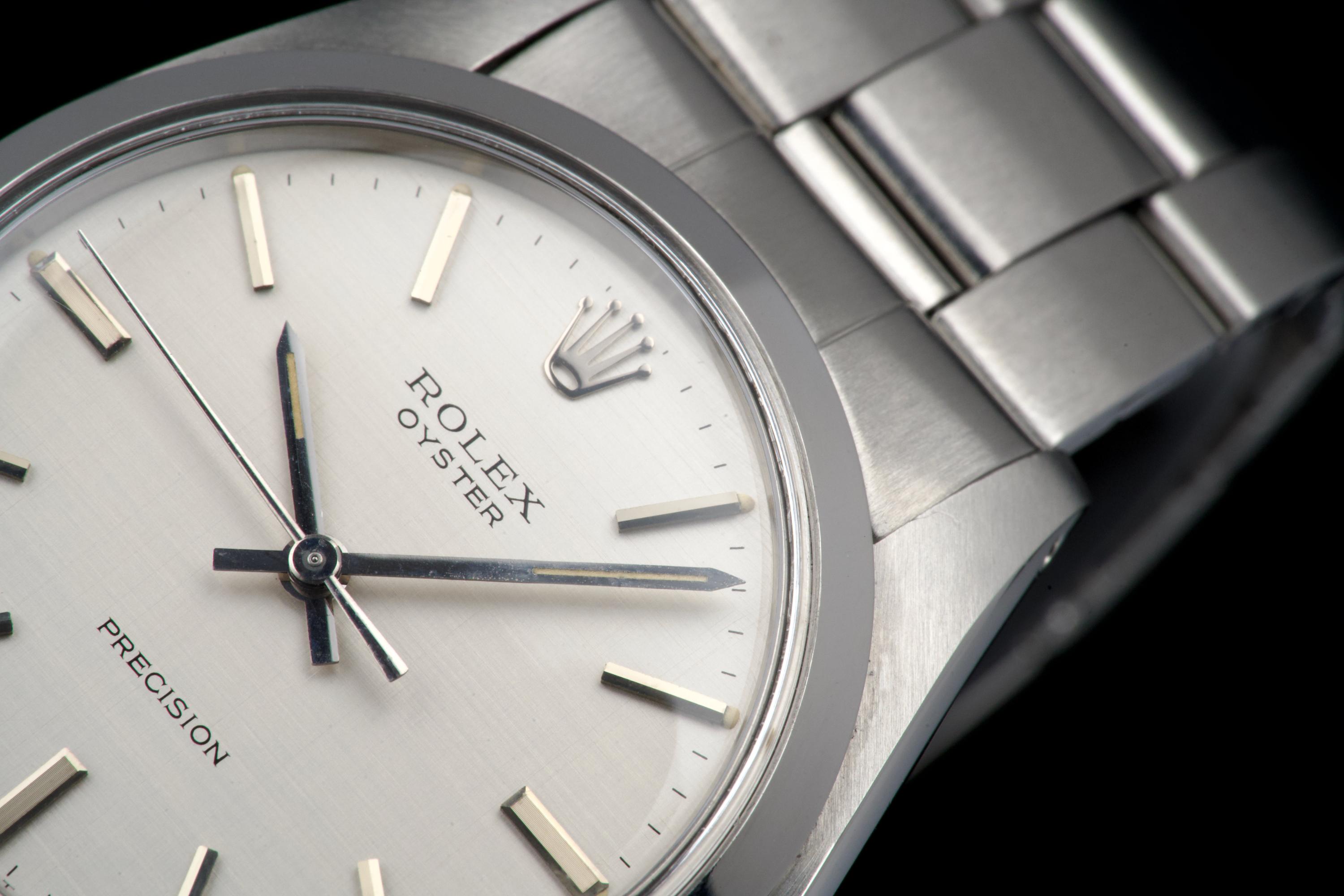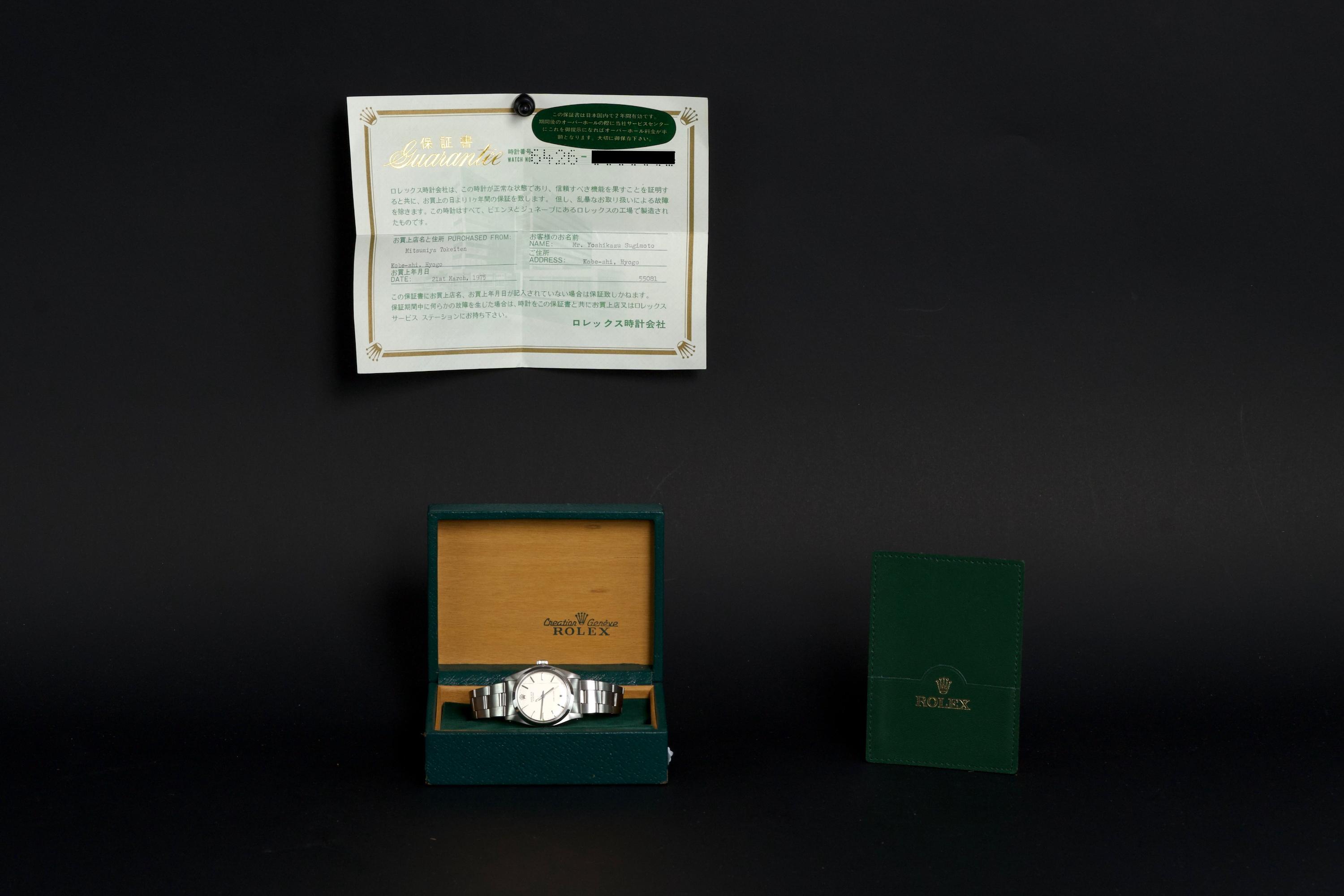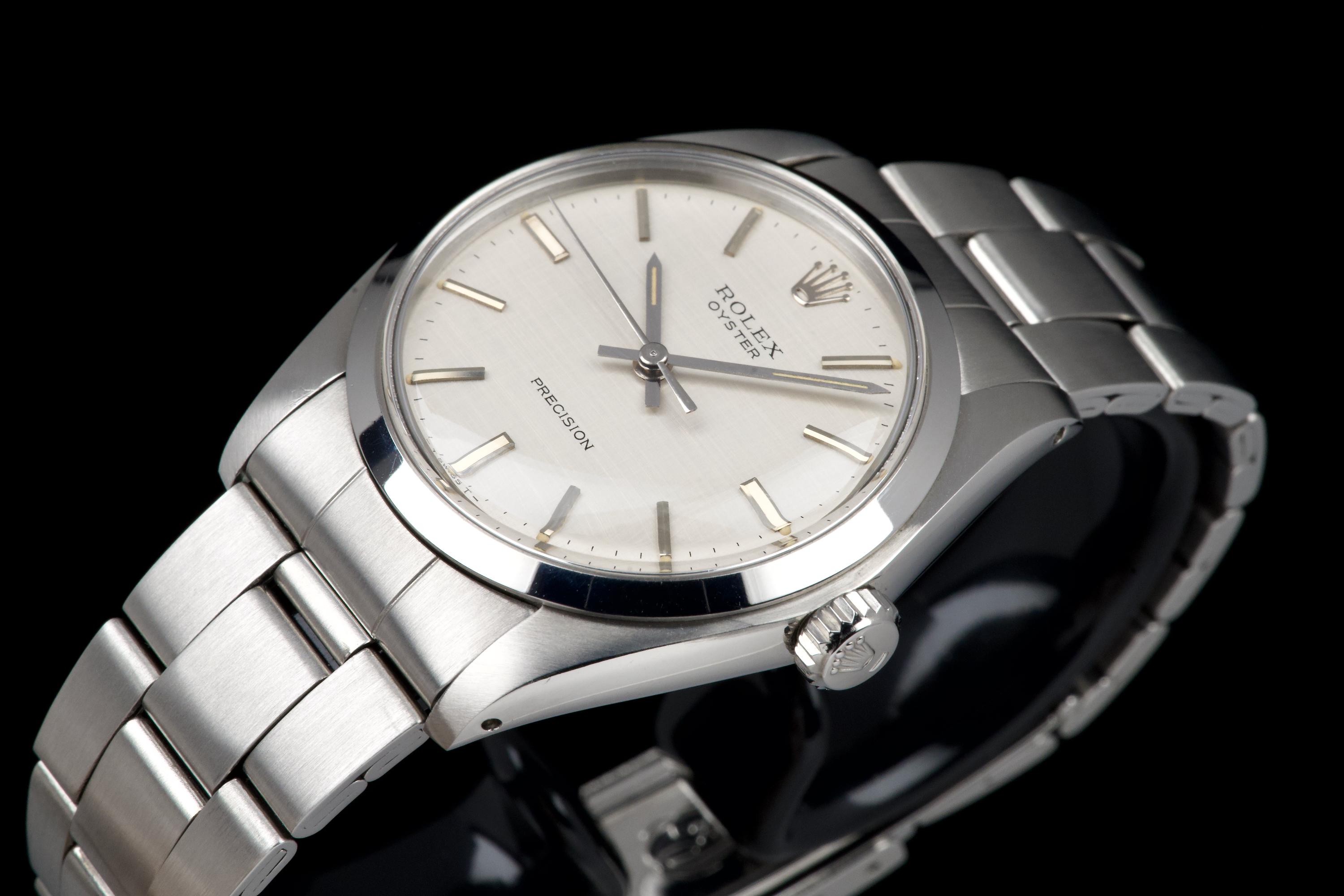 A beautifully preserved example of the 34mm Oyster Precision 6426, featuring the highly desirable silver linen tritium dial, perfectly original and in flawless condition, with matching tritium hands. Sold new in Kobe, Japan in 1975, this piece remains in outstanding and fully original condition. The 36mm stainless steel case has been polished in the past but remains thick, sharp, and symmetrical, with crisp and well-defined serial and reference numbers between the lugs (serial 3389XXX). The watch is powered by a manual-winding movement, freshly serviced by our watchmaker. It comes on its original folded 7835 Oyster bracelet with 357 endlinks, showing almost no stretch — impressive for a bracelet of this era. The clasp is undated, which is completely normal for this production period. Delivered with its original box and papers, this 6426 is a superb and honest vintage Rolex, combining rarity, condition, and timeless elegance.