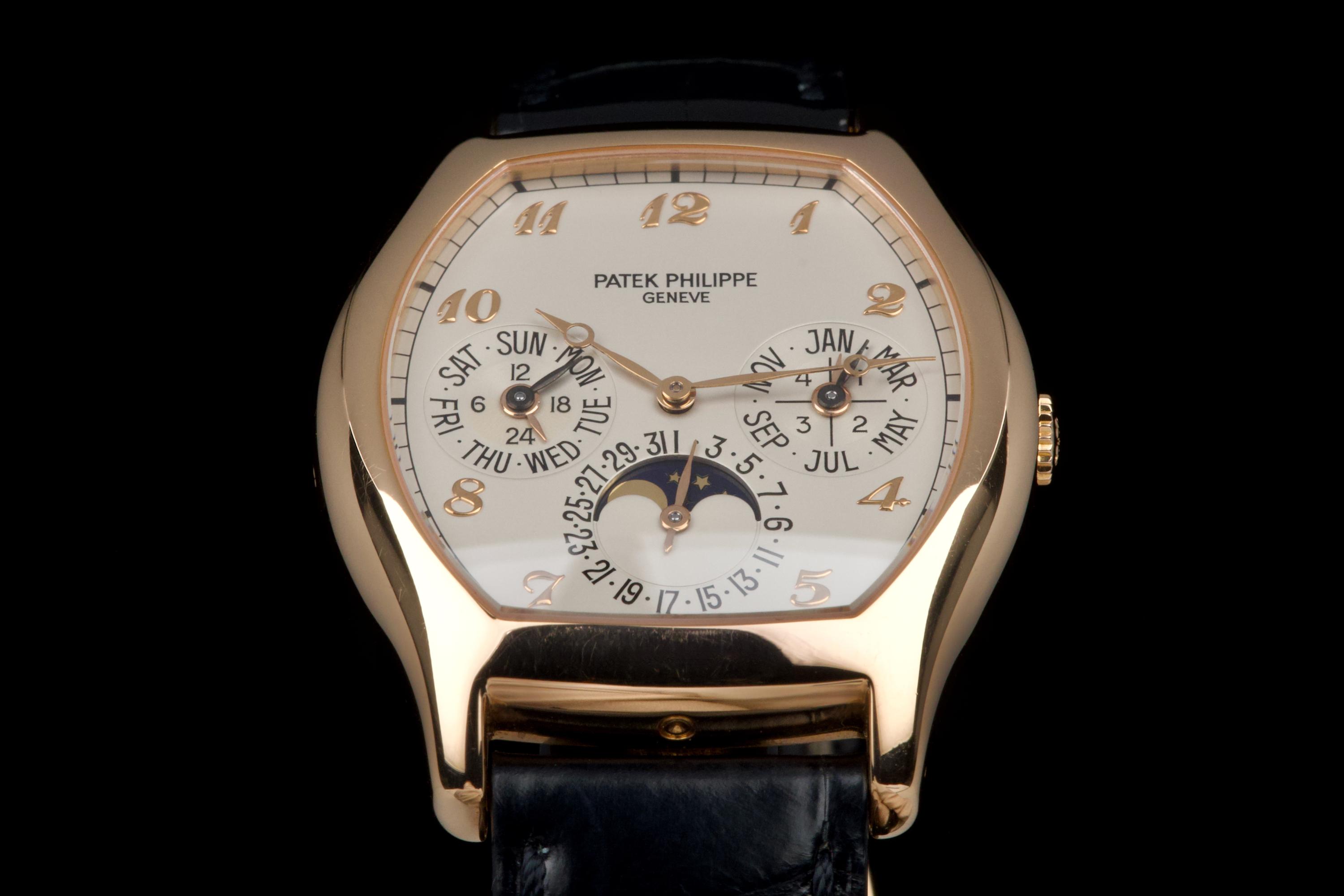 An exceptional and beautifully preserved example of the Patek Philippe Perpetual Calendar reference 5040R in 18k rose gold, sold new in Germany in 1995 and accompanied by an outstanding and historically rich full set. The watch appears to be completely unpolished, with the hallmarks on the left case flank remaining as crisp and deep as the day they left the atelier — a clear indication that no polishing has ever softened the edges or compromised the original geometry. The rose-gold tonneau case retains its perfect definition and elegant proportions. This 5040R comes with a complete full set, including the original box, rotating stand, second solid caseback, stylus, and all documents. Importantly, the watch is accompanied by two Patek Philippe Japan service papers, dated 2012 and 2019, confirming that the watch has been impeccably maintained over the years. Adding to its provenance, the set includes a signed congratulatory letter from Henri Stern, addressed to the original buyer — a rare and meaningful historical detail. The black Patek Philippe crocodile strap is in excellent condition, fitted with a Patek Philippe rose-gold buckle. The iconic silver dial with applied Breguet numerals is flawless, and the hands match perfectly, completing the elegant aesthetic of this perpetual calendar. Considering its rarity, condition, and completeness, the 5040R represents remarkable value in the world of Patek Philippe perpetual calendars — especially when compared to the more traditional 3940R, which today commands roughly double the price. A truly exceptional and collector-grade example of the 5040R — unpolished, fully documented, perfectly maintained, and accompanied by an extraordinary provenance.