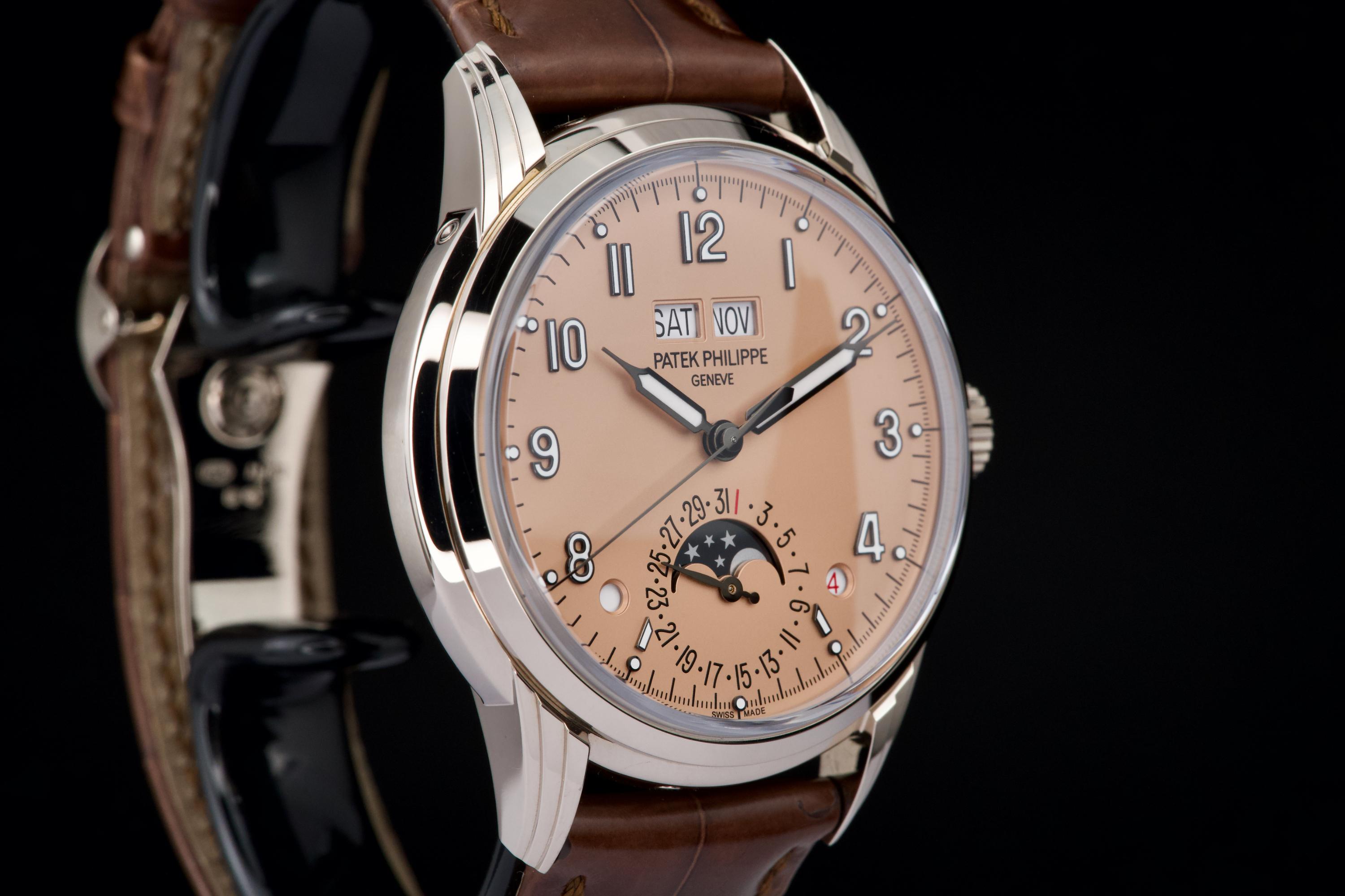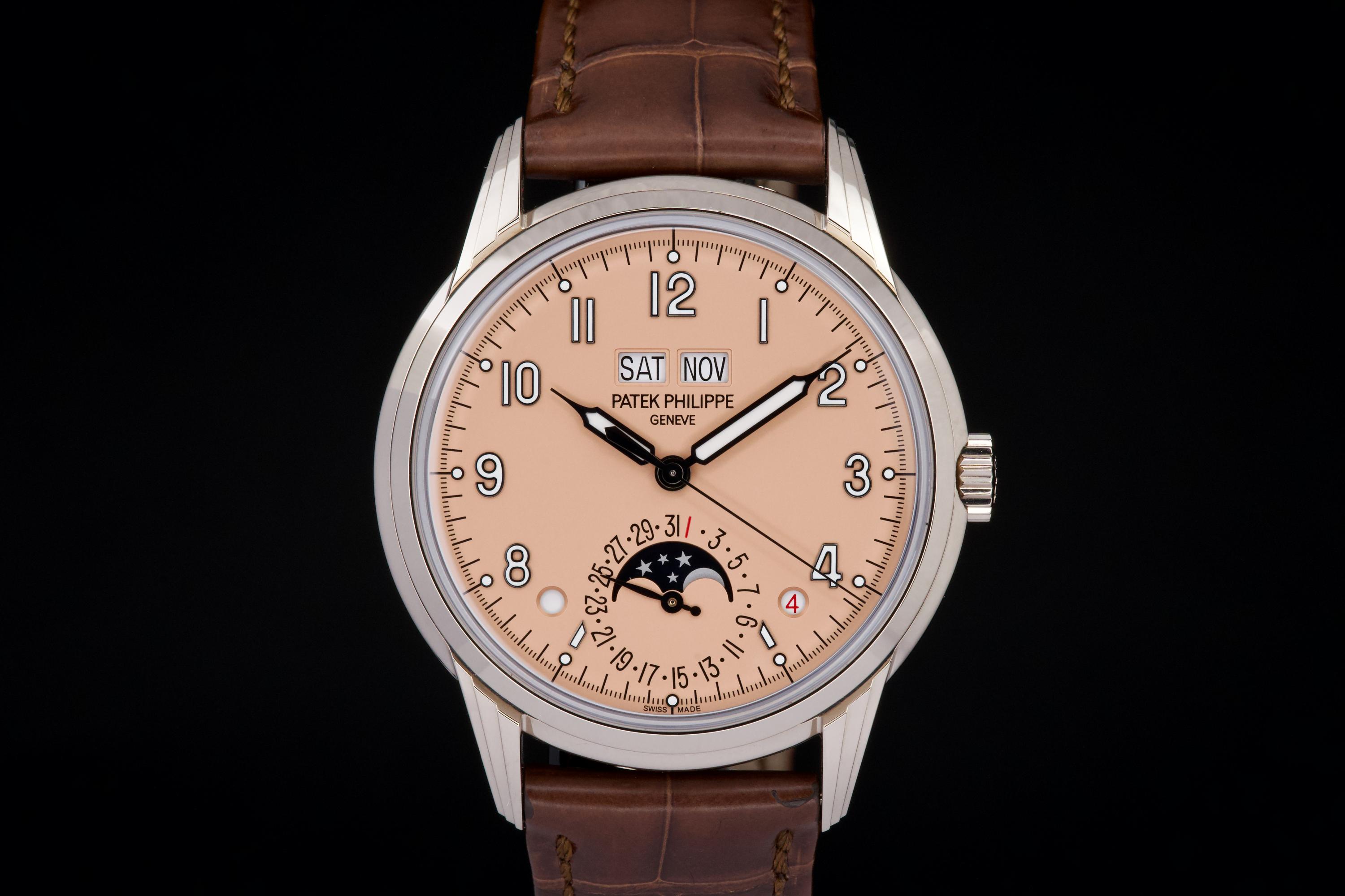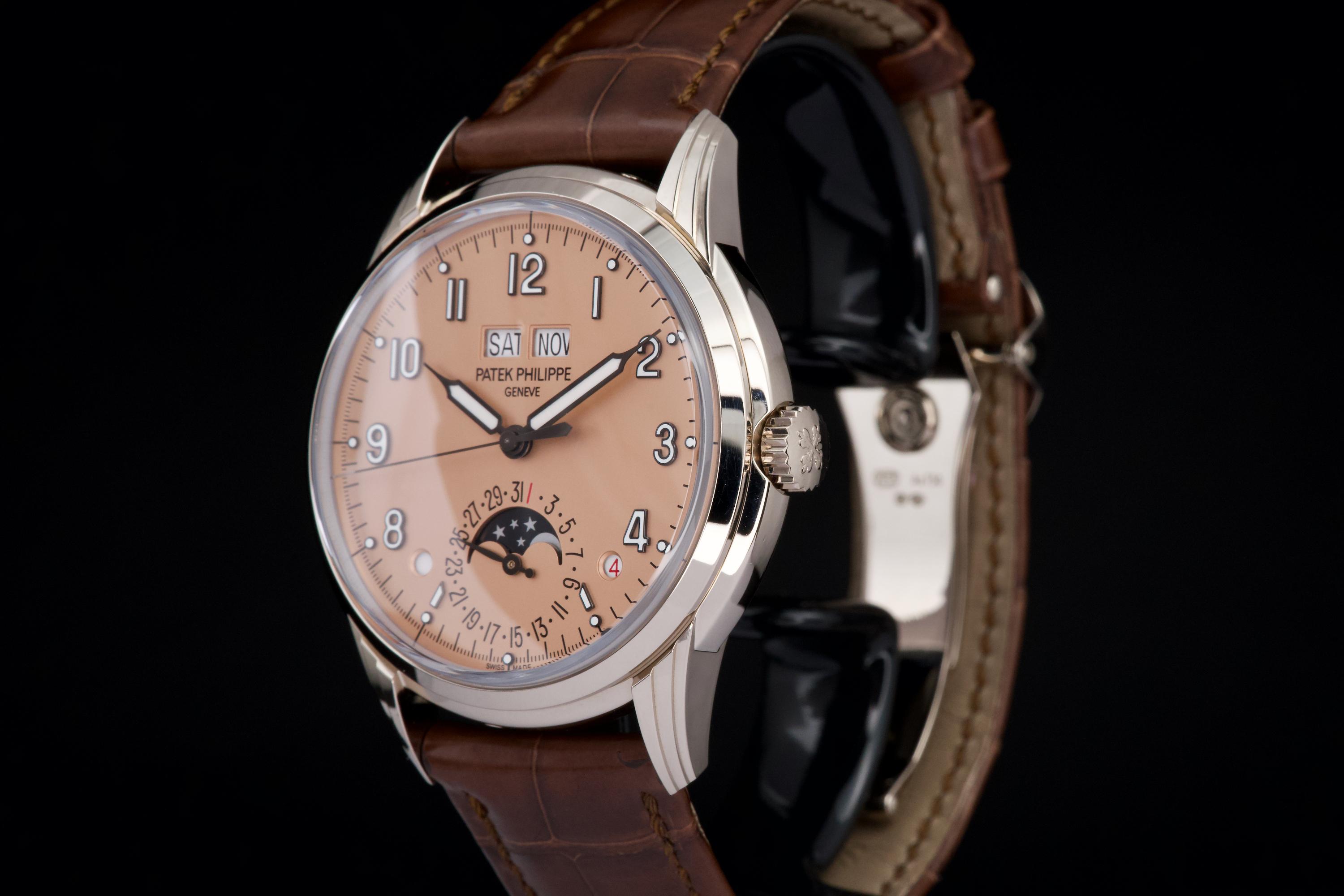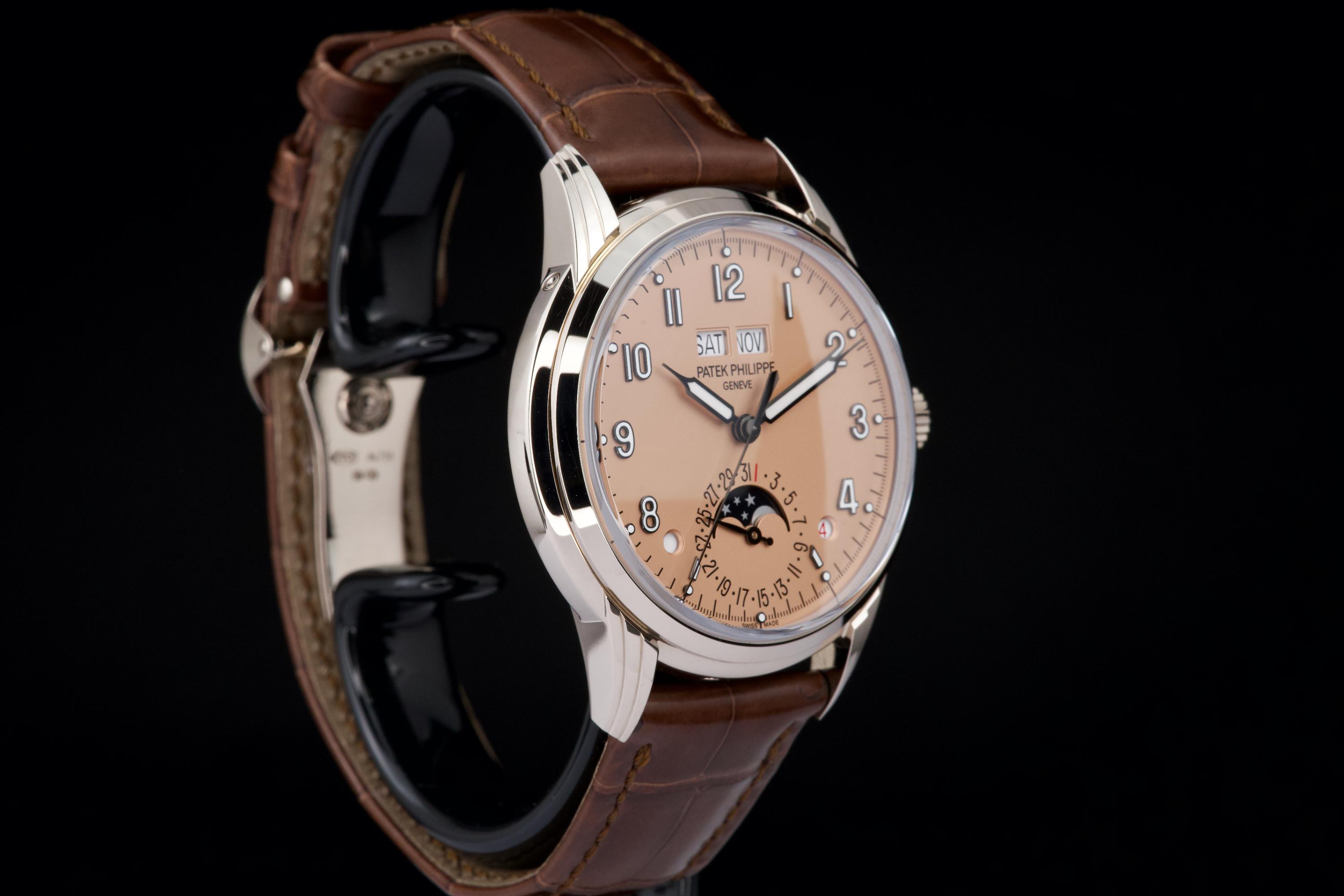A superb example of the Patek Philippe 5320G-011 Perpetual Calendar in white gold, featuring the elegant and highly sought-after salmon dial. The watch is unpolished and shows only very light wear from careful use. Powered by the automatic caliber 324 S Q, this reference combines classic perpetual calendar functionality with Patek Philippe’s signature Art Deco–inspired design. It comes as a full set, including the second solid caseback, display caseback, and original pin pusher. A refined and collectible modern Patek Philippe, offered in excellent condition with full accessories.