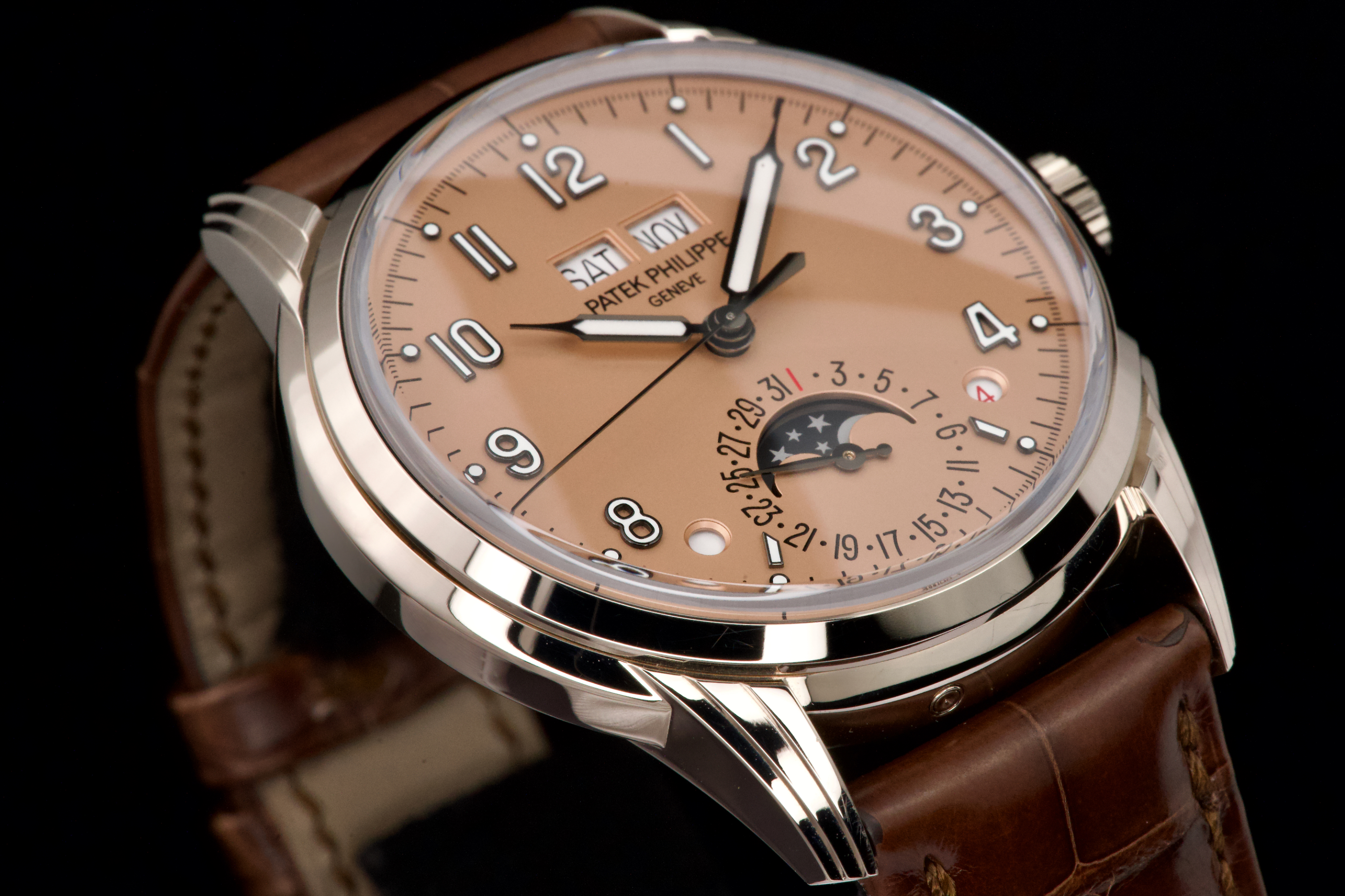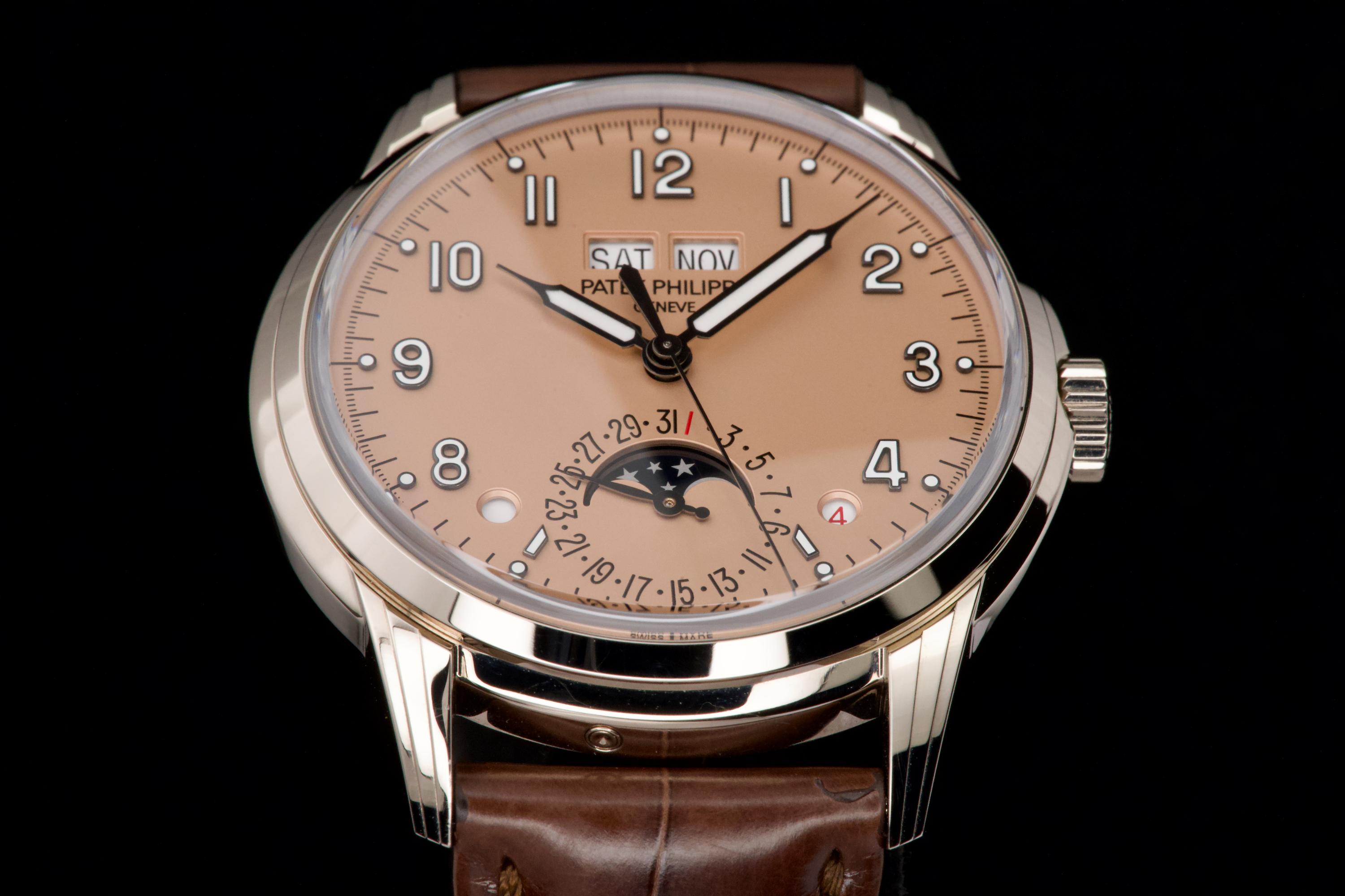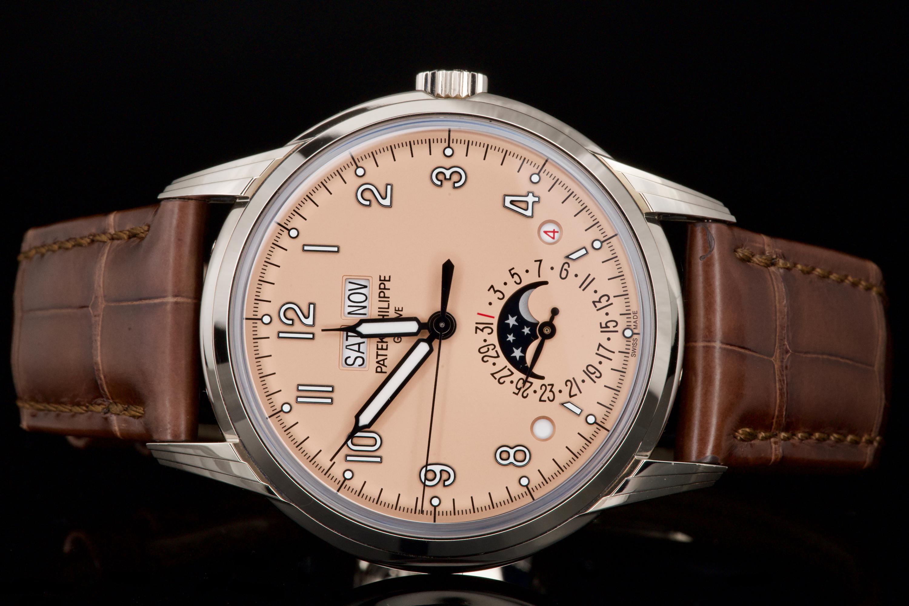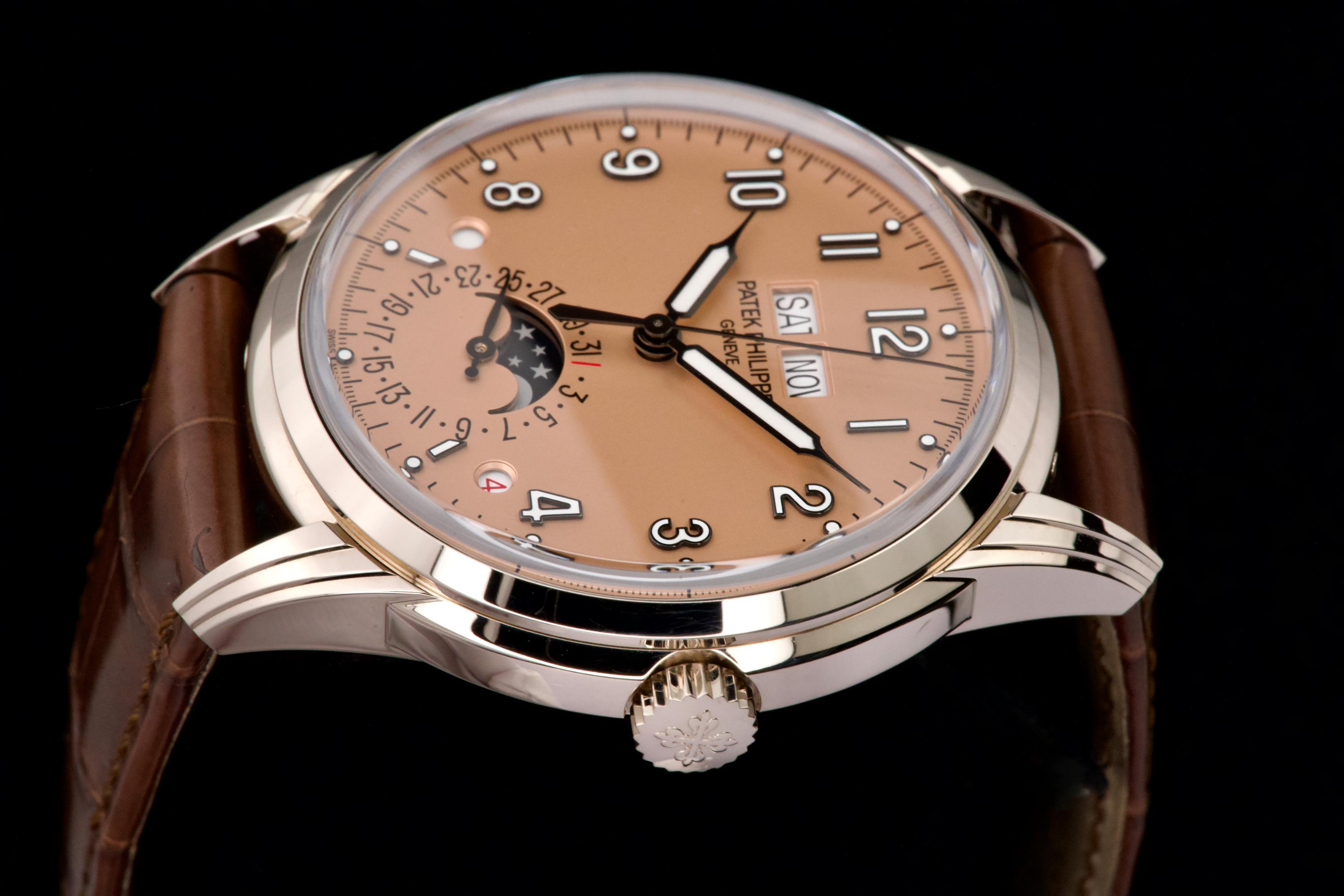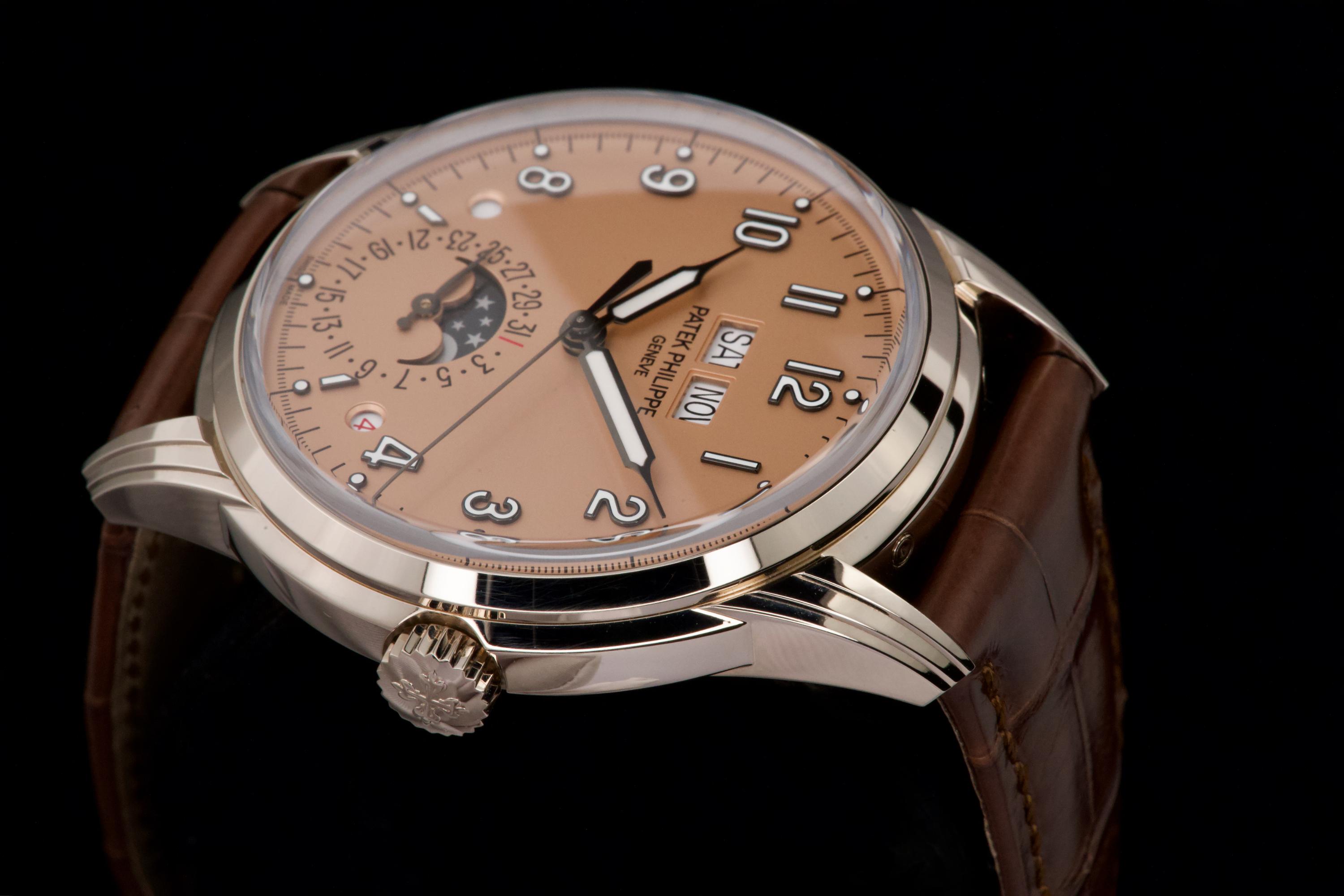 A superb example of the Patek Philippe 5320G-011 Perpetual Calendar in white gold, featuring the elegant and highly sought-after salmon dial. The watch is unpolished and shows only very light wear from careful use. Powered by the automatic caliber 324 S Q, this reference combines classic perpetual calendar functionality with Patek Philippe’s signature Art Deco–inspired design. It comes as a full set, including the second solid caseback, display caseback, and original pin pusher. A refined and collectible modern Patek Philippe, offered in excellent condition with full accessories.