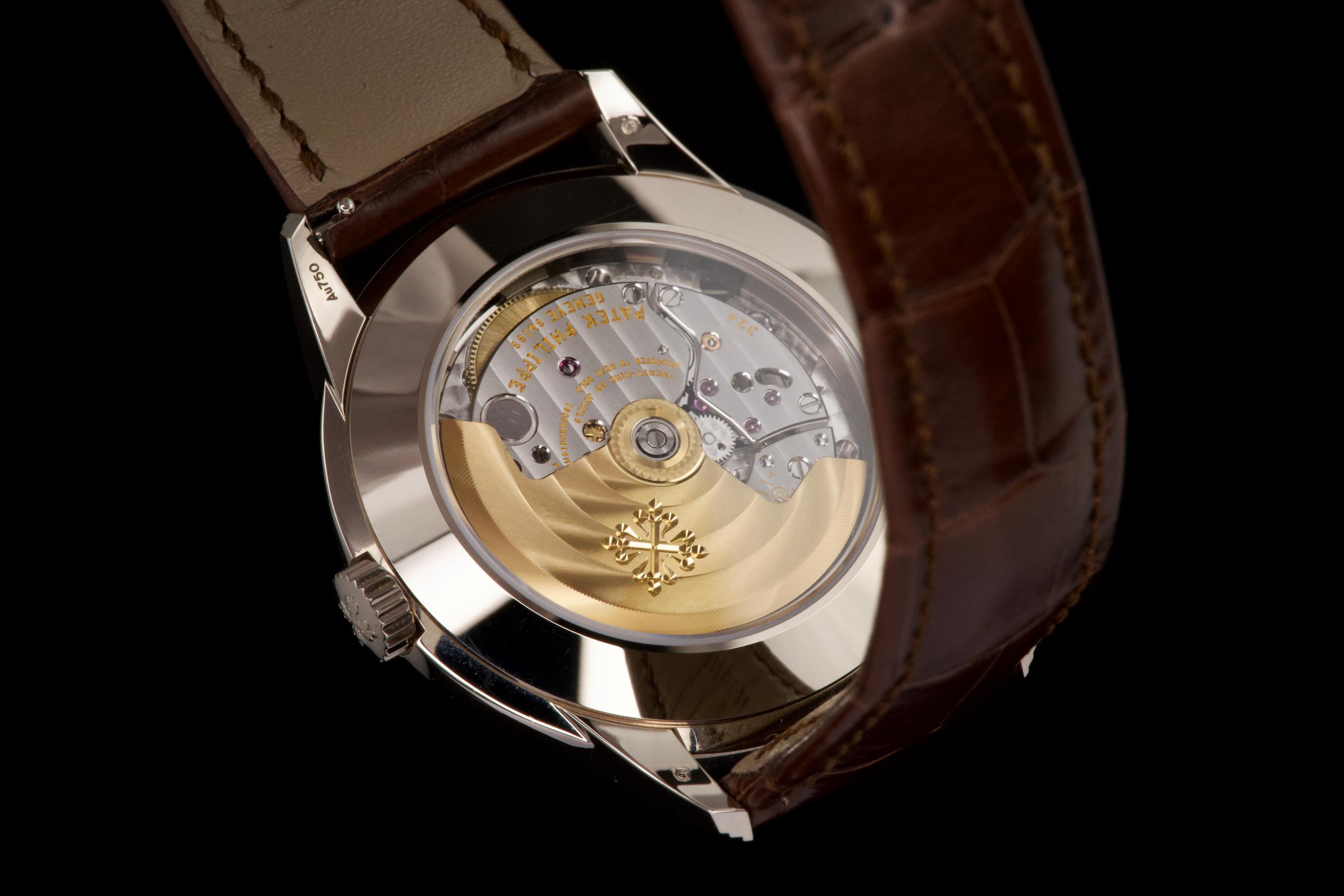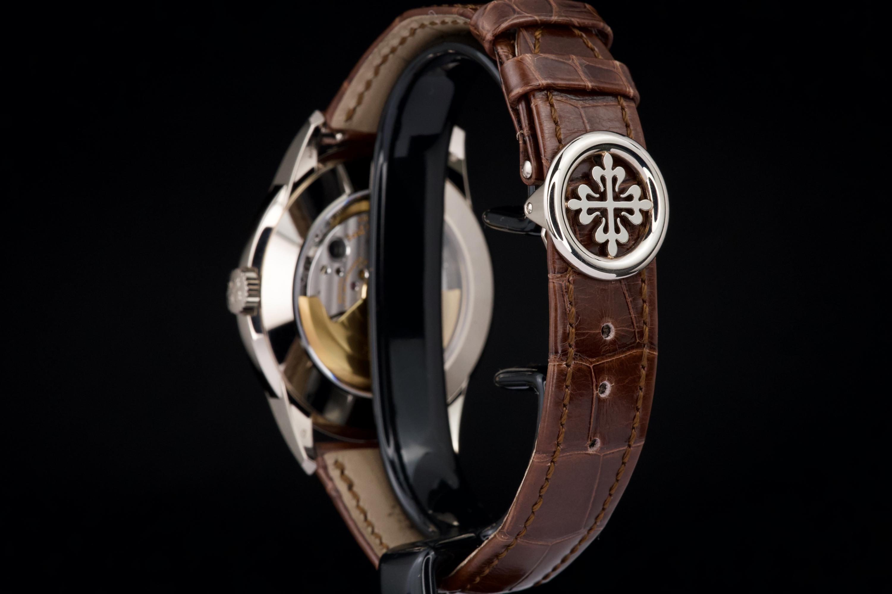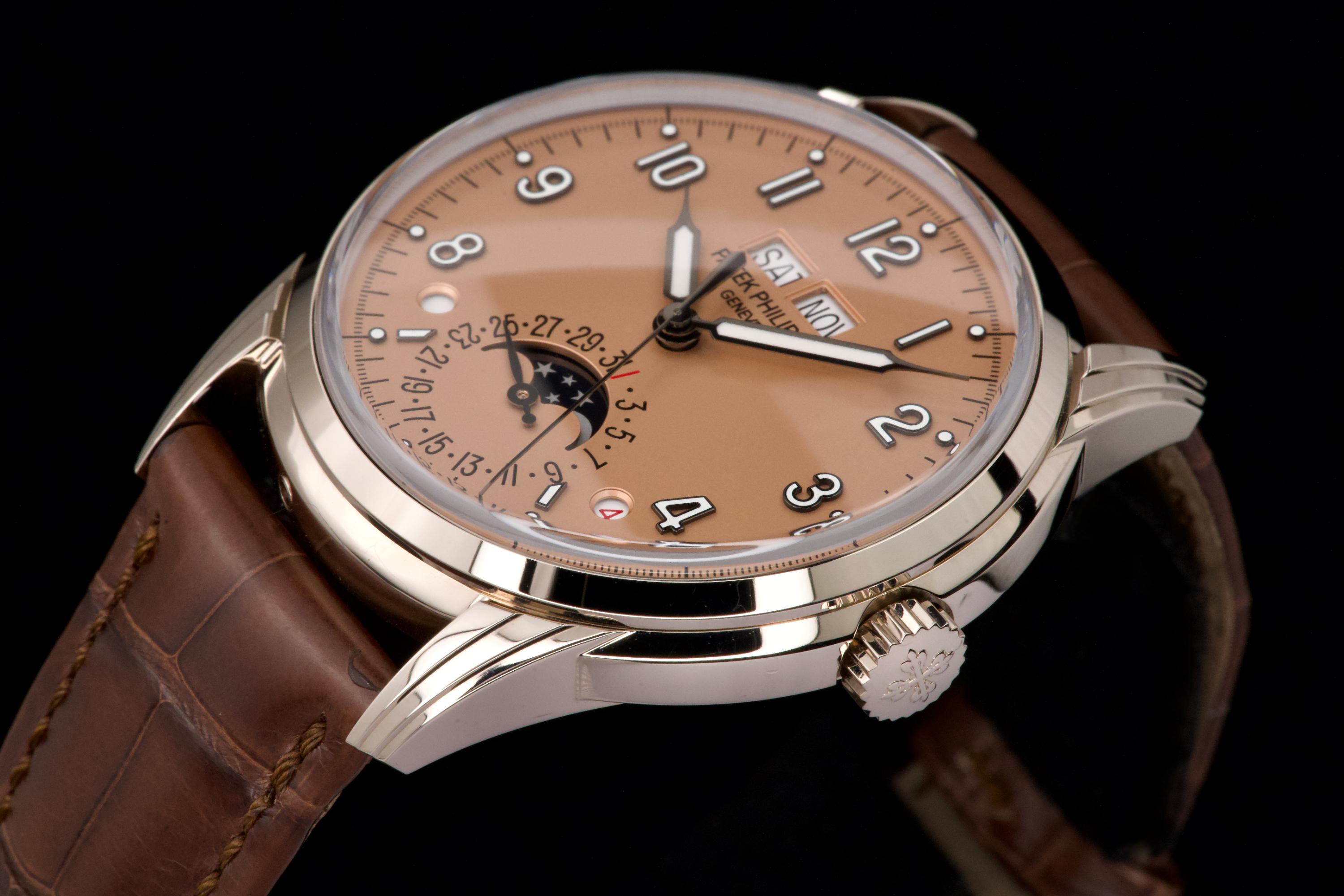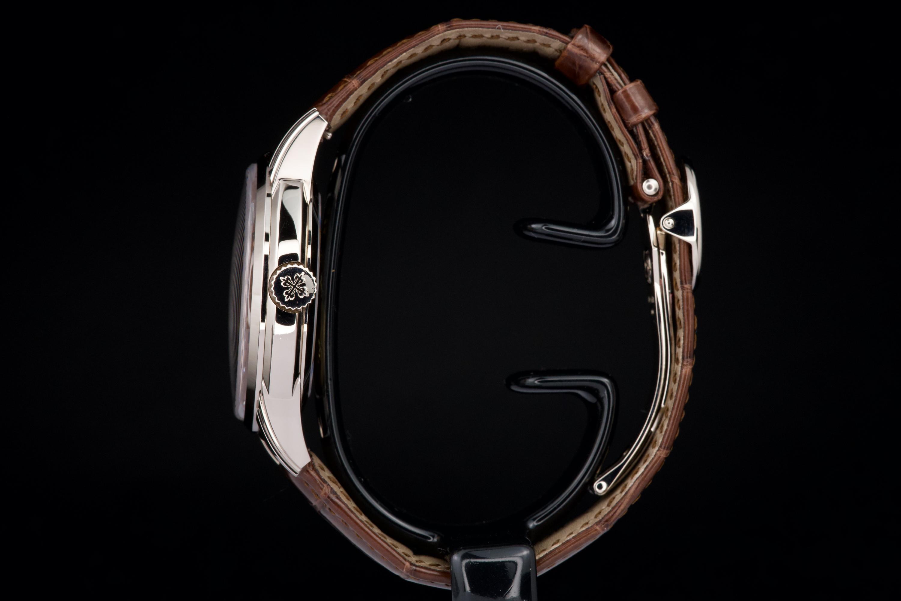 A superb example of the Patek Philippe 5320G-011 Perpetual Calendar in white gold, featuring the elegant and highly sought-after salmon dial. The watch is unpolished and shows only very light wear from careful use. Powered by the automatic caliber 324 S Q, this reference combines classic perpetual calendar functionality with Patek Philippe’s signature Art Deco–inspired design. It comes as a full set, including the second solid caseback, display caseback, and original pin pusher. A refined and collectible modern Patek Philippe, offered in excellent condition with full accessories.