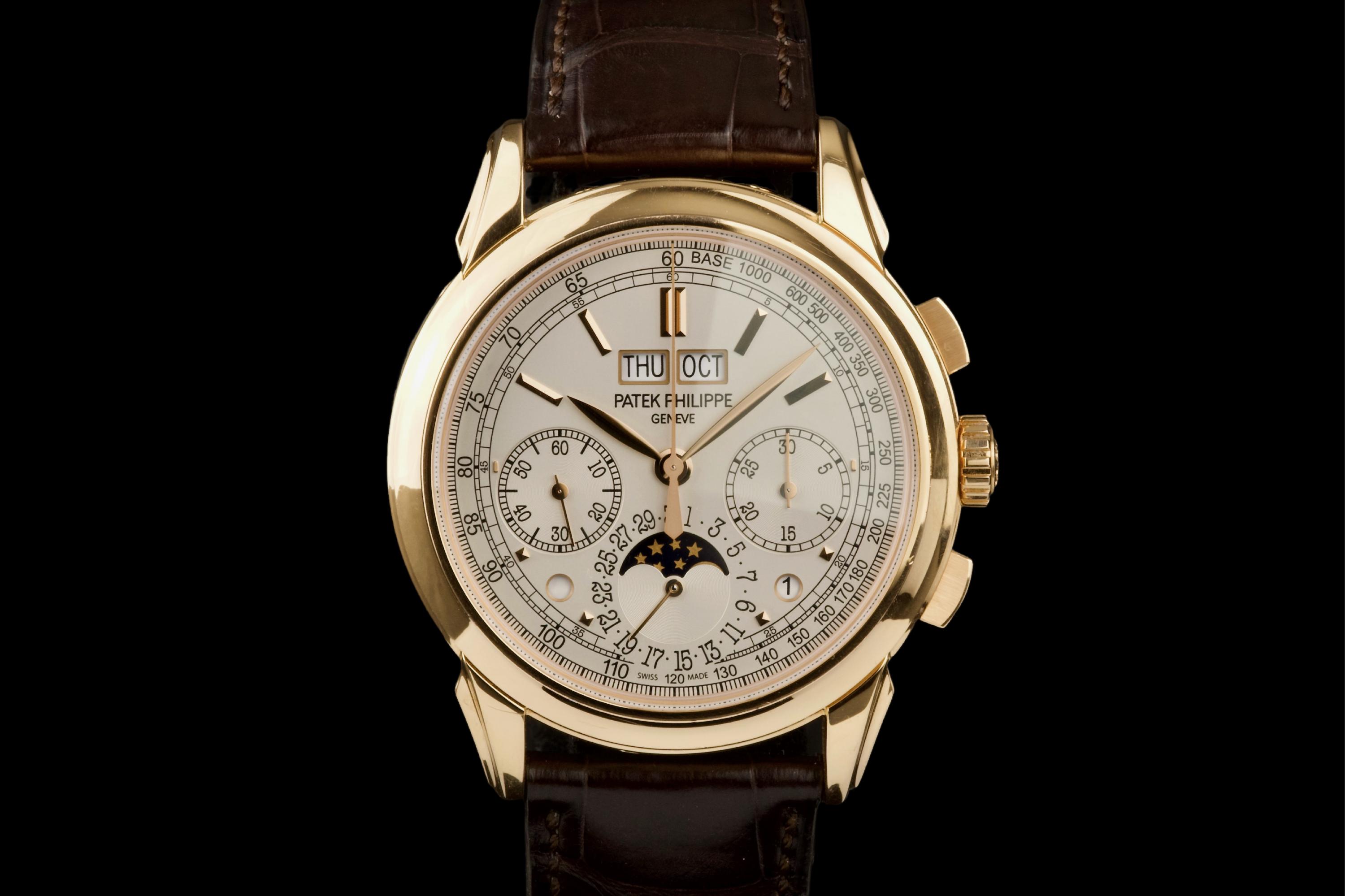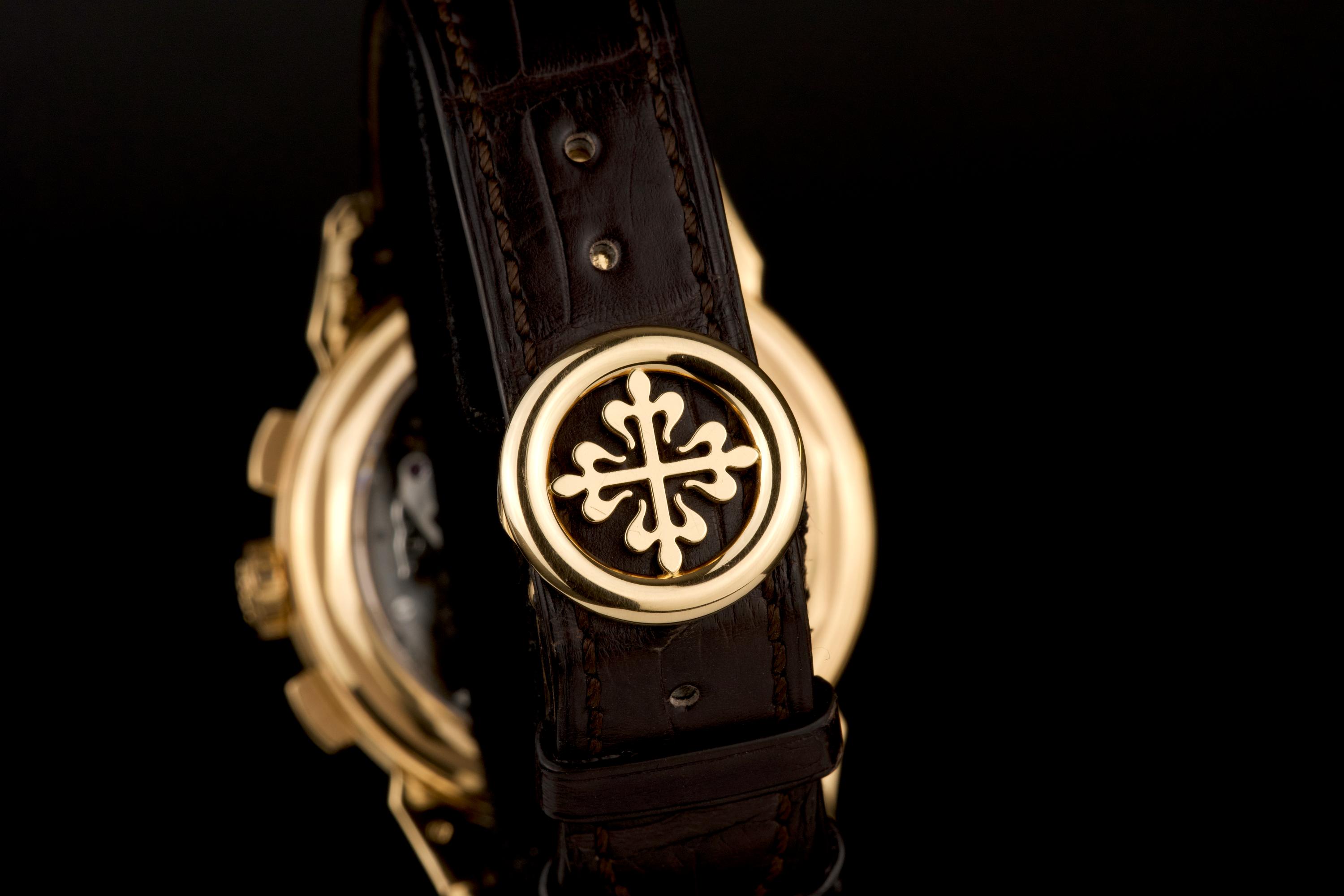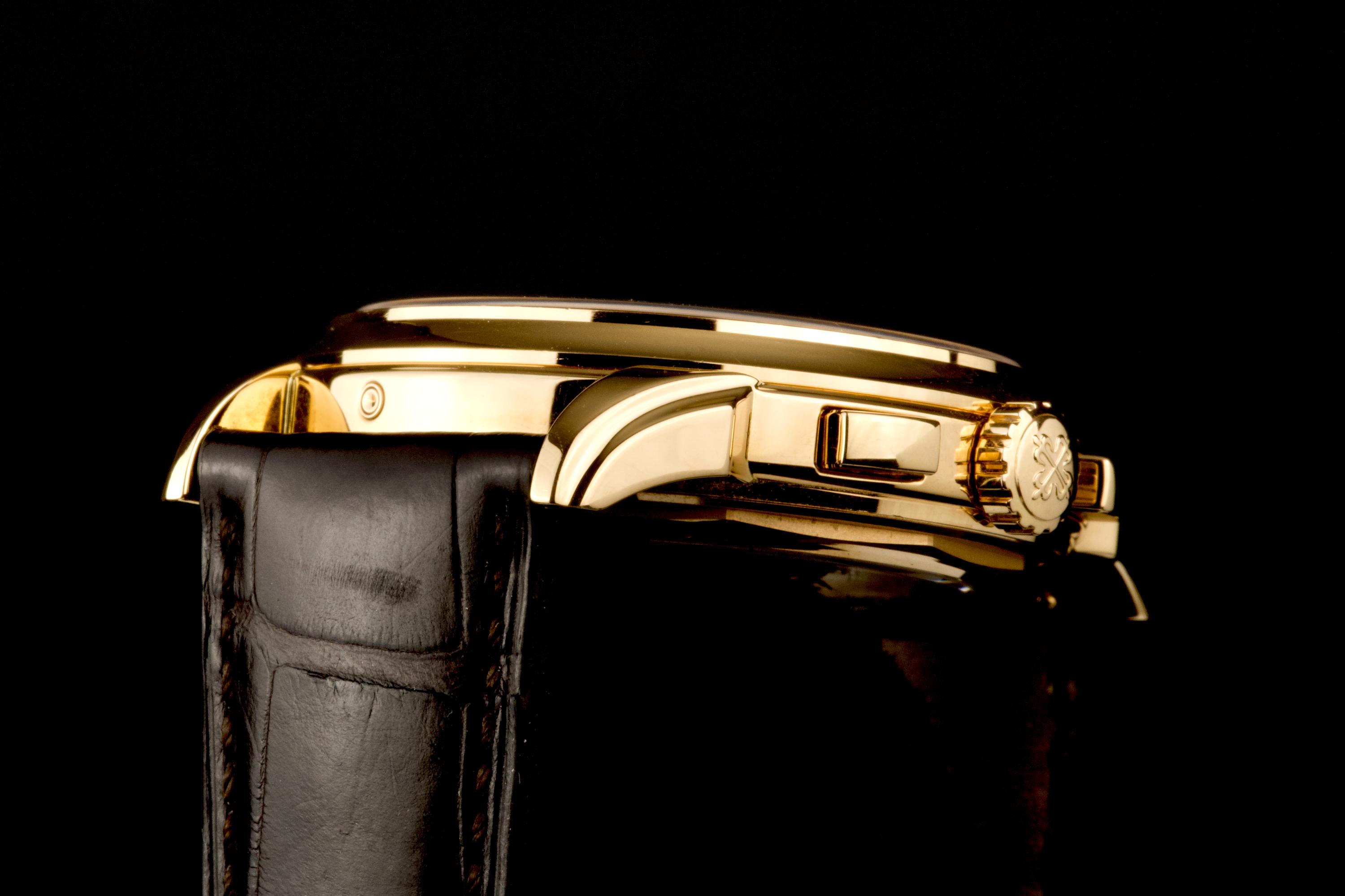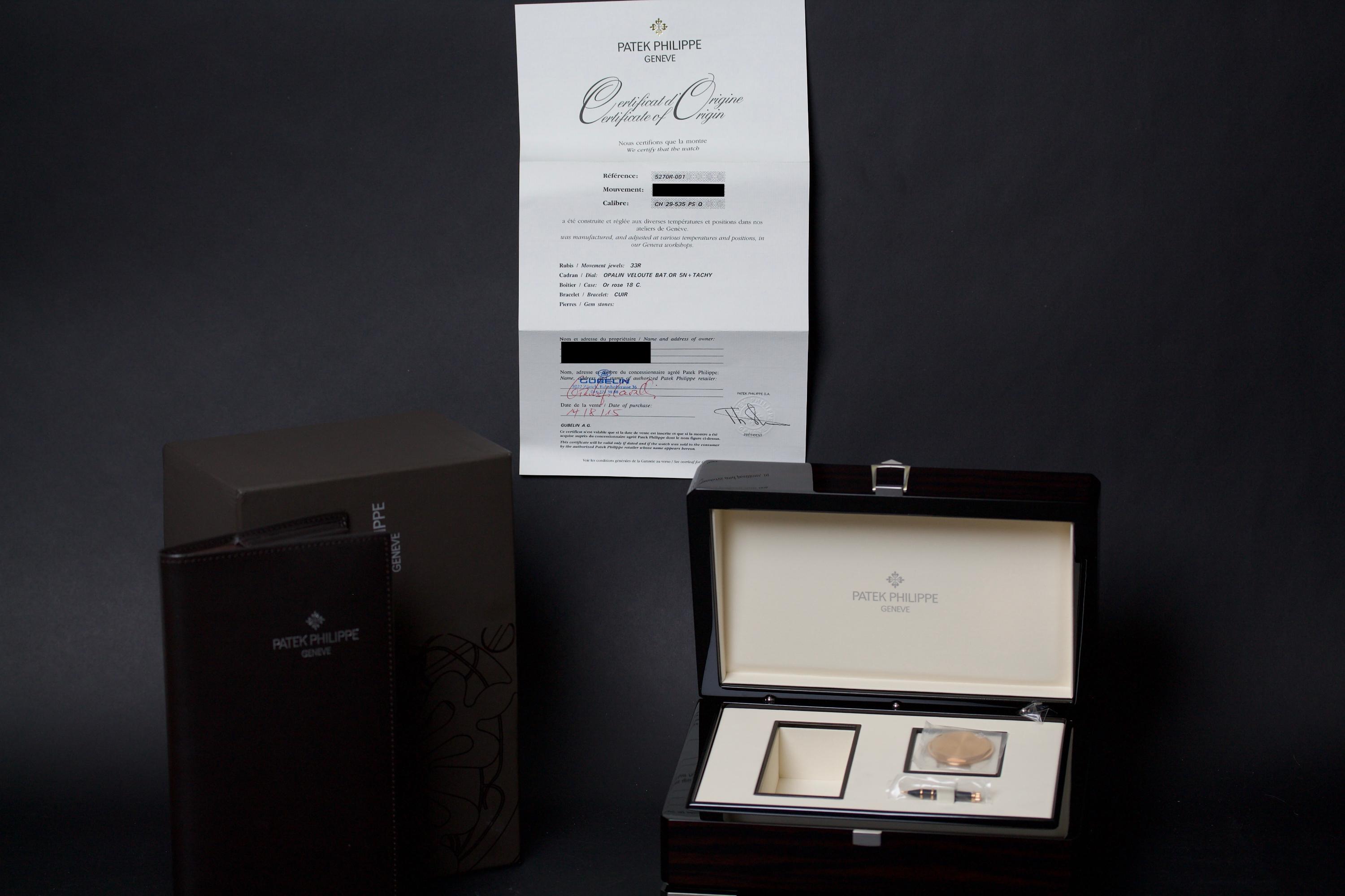 This Patek Philippe 5270R combines two of the brand’s most iconic complications in an elegant 41mm rose gold case: the perpetual calendar and the chronograph. Sold in 2015 and offered as a full set with box and papers (as shown in the photos), the watch is in excellent overall condition, showing only very light signs of wear. A cornerstone reference in modern Patek Philippe grand complication collecting.