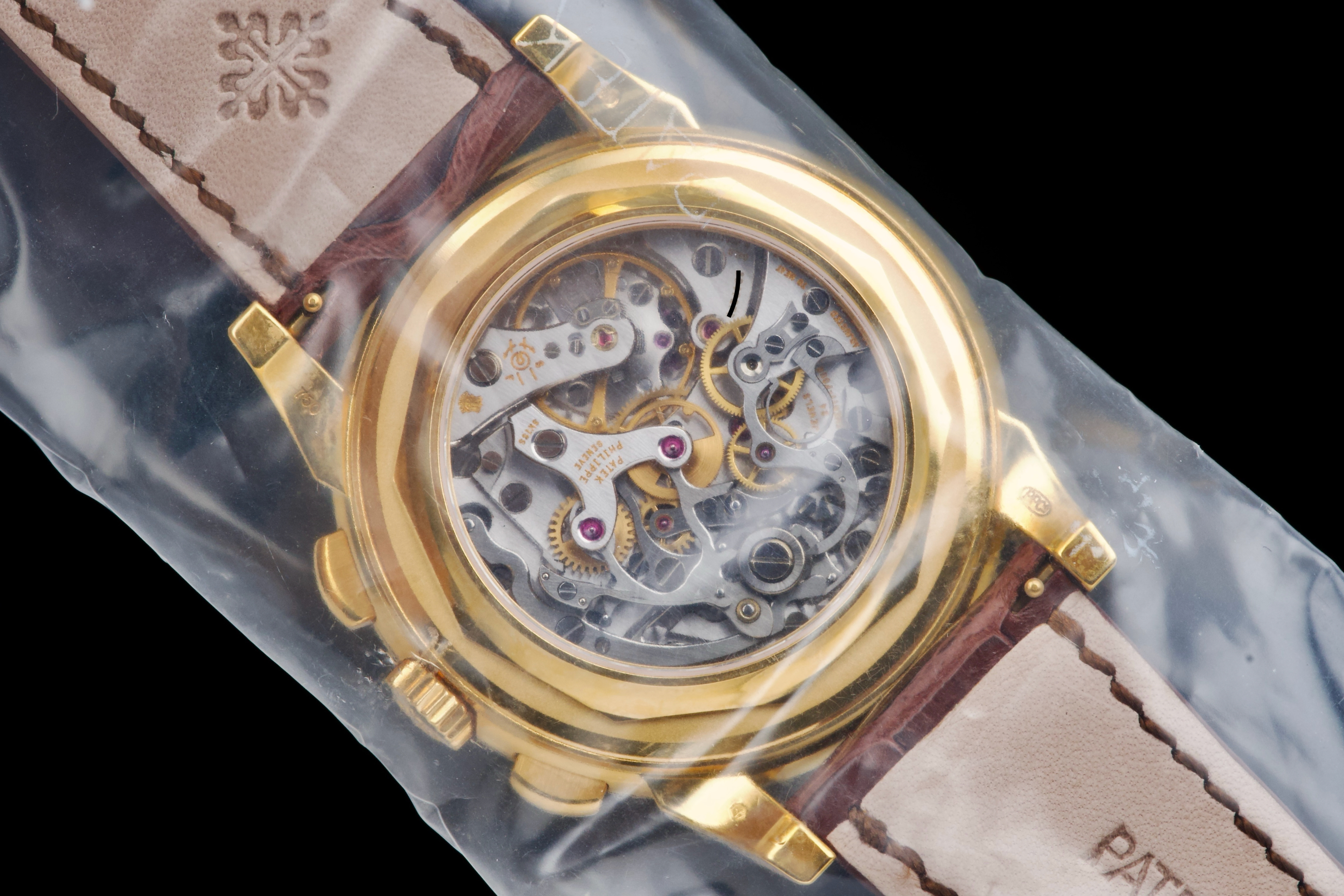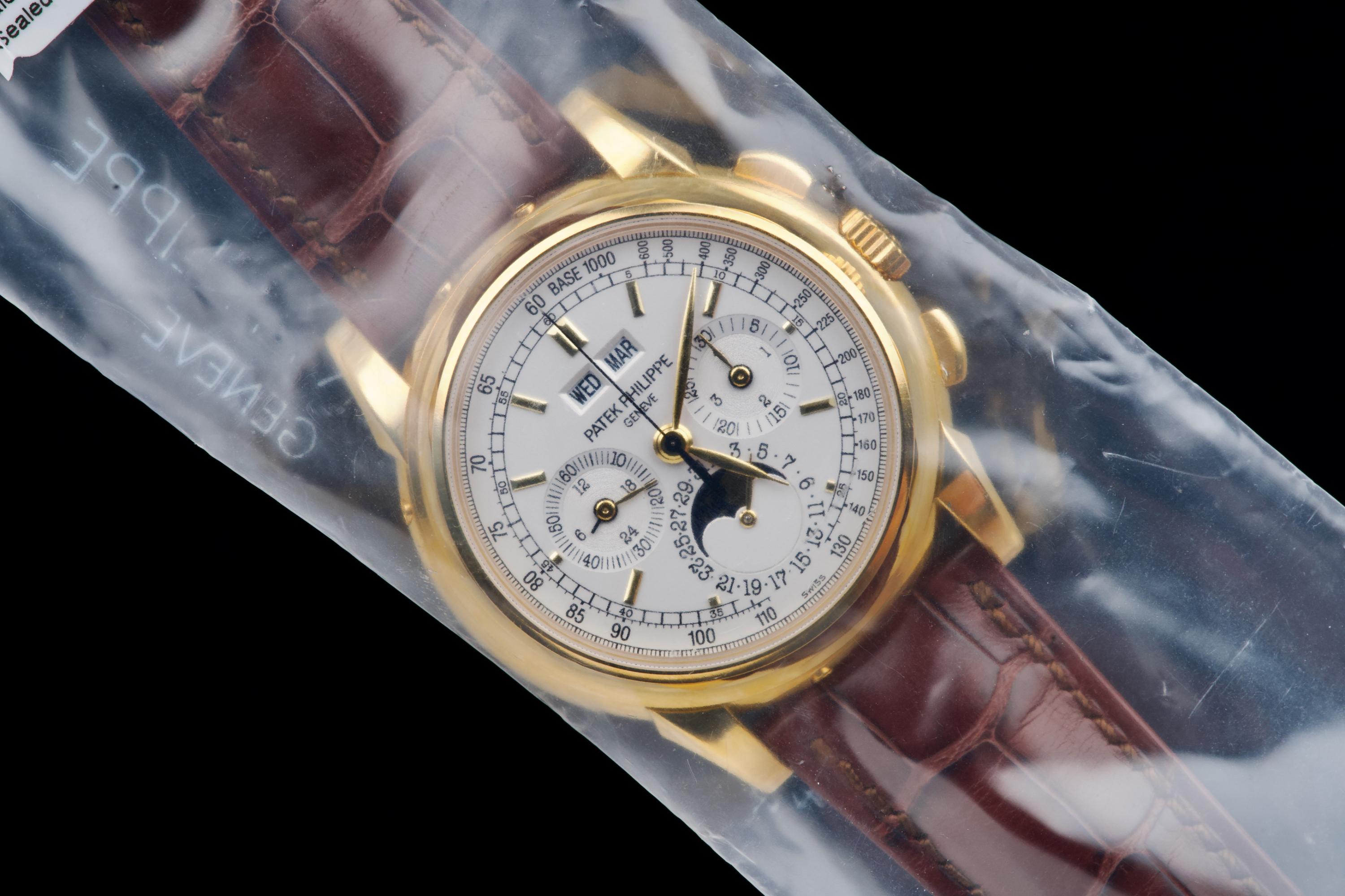 An extraordinary and highly collectible example of the Patek Philippe Perpetual Calendar Chronograph reference 5970J, presented in single-sealed condition. Crafted in 18K yellow gold, this 40 mm masterpiece remains factory sealed, with the solid caseback and pin pushers attached to the original Patek Philippe plastic seal — a true time capsule and a grail for collectors. Powered by the manual-winding caliber CH 27-70 Q, the 5970 is celebrated as one of the most perfectly proportioned perpetual calendar chronographs ever produced by Patek Philippe. Accompanied by its full 2008 set, including box, original certificate, booklets, and accessories. An extremely rare opportunity to acquire a single-sealed 5970J — one of the most iconic and sought-after modern Patek Philippe complications, preserved in untouched condition.